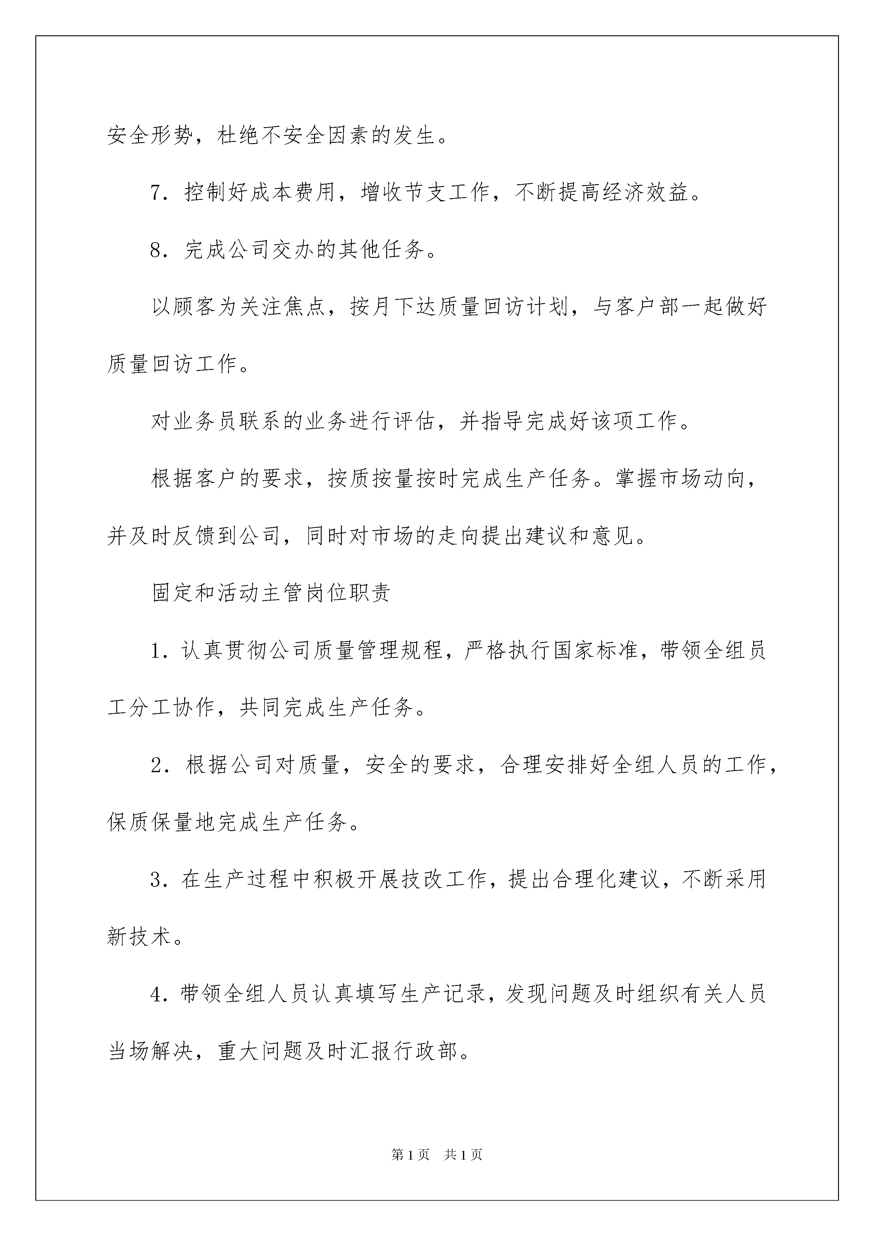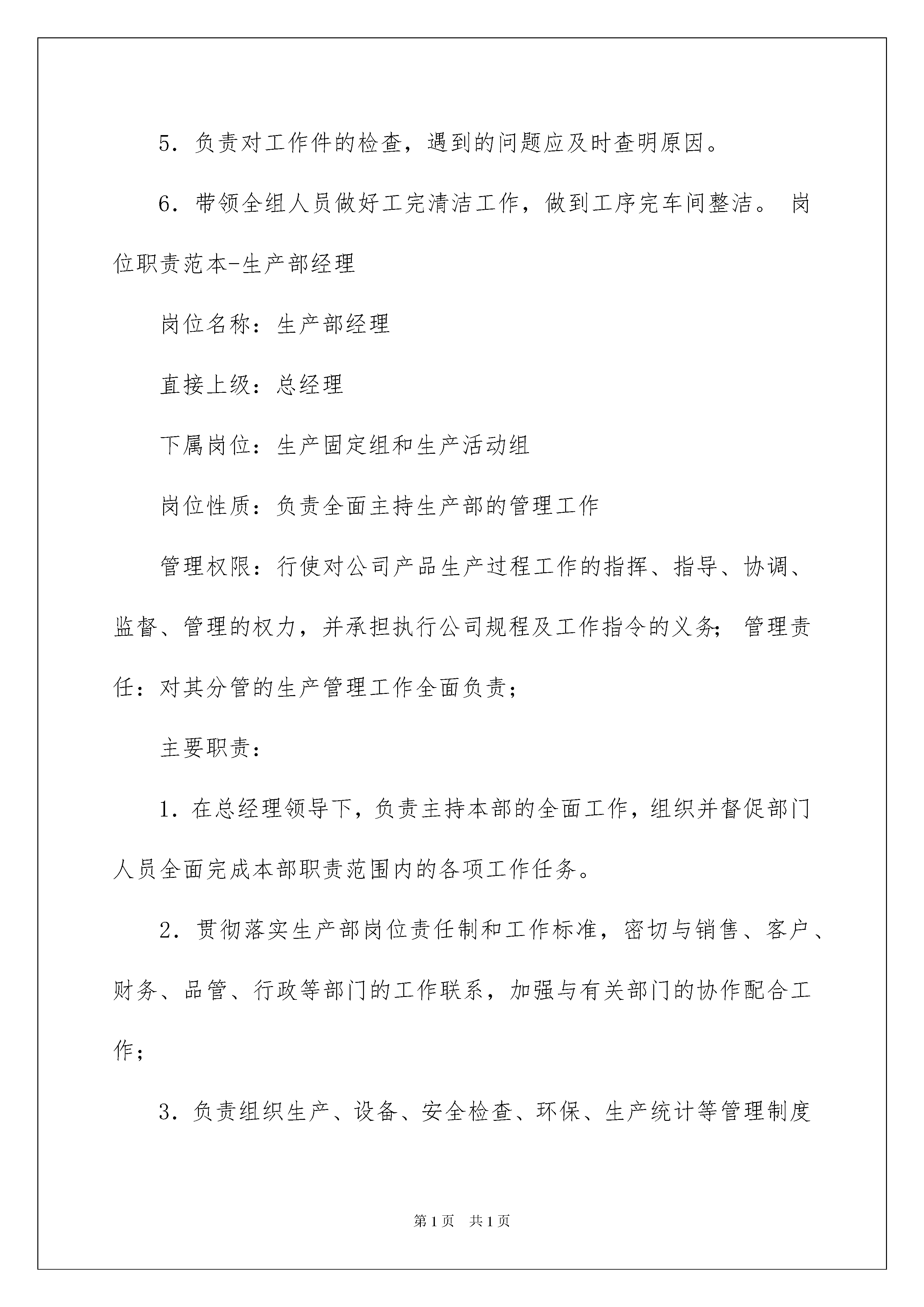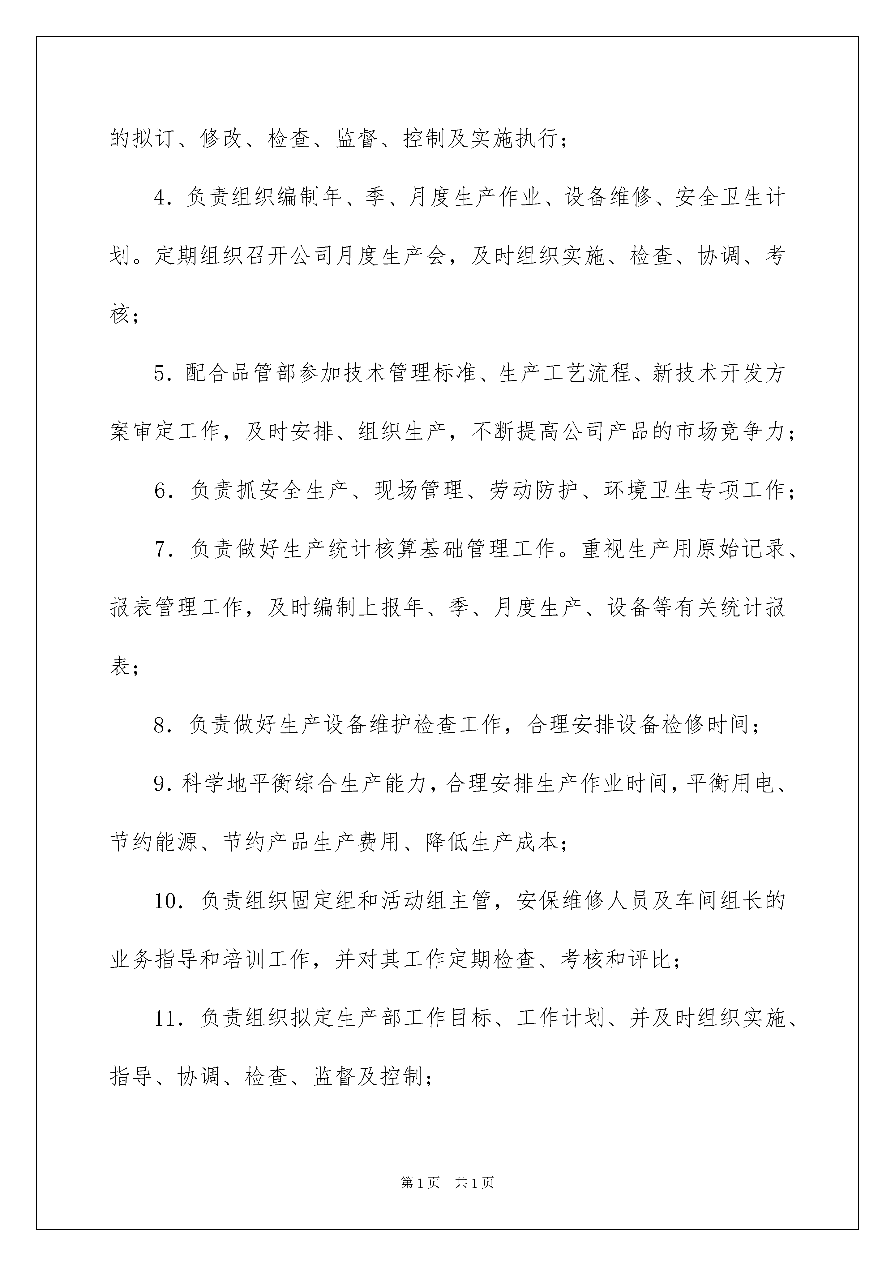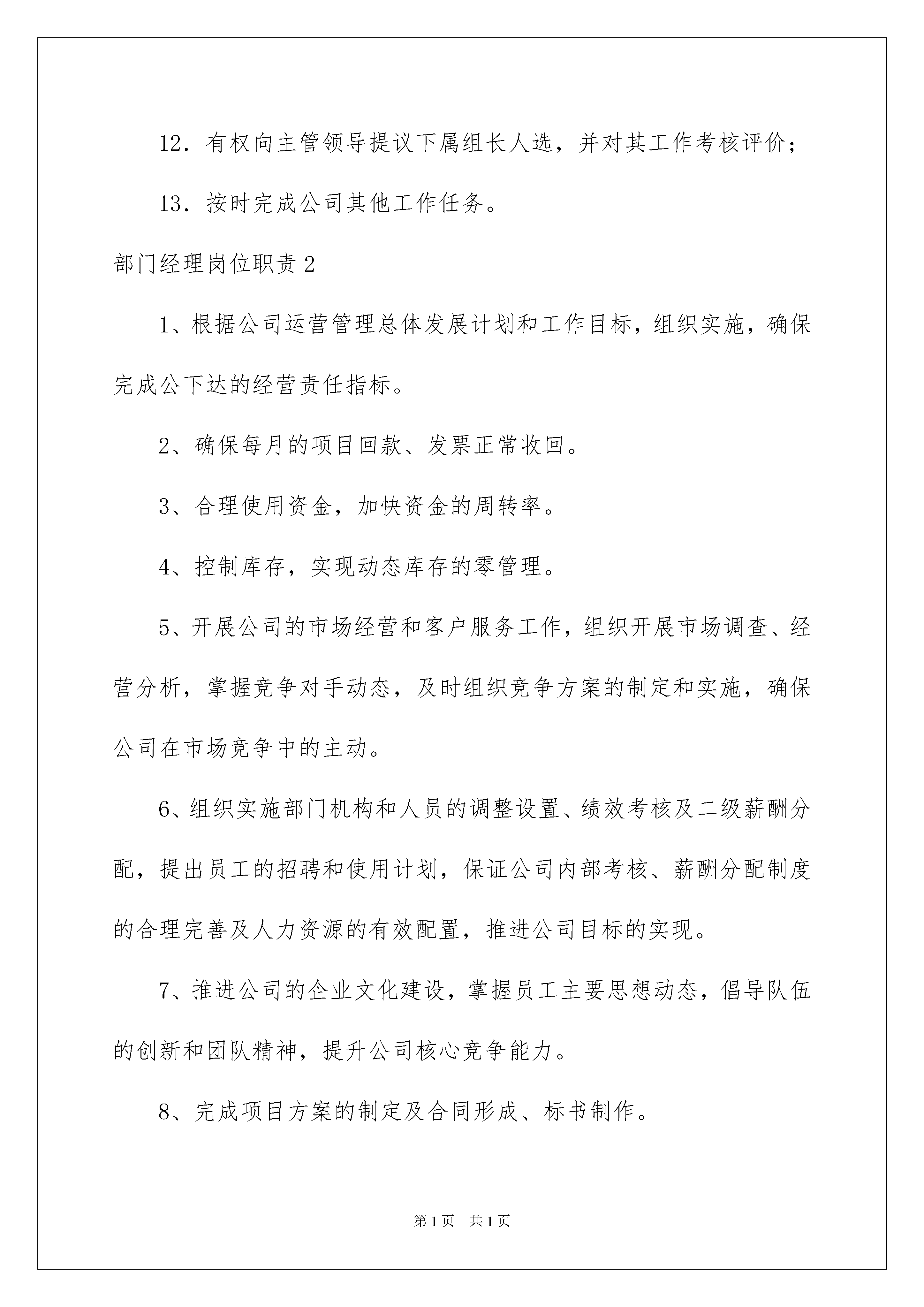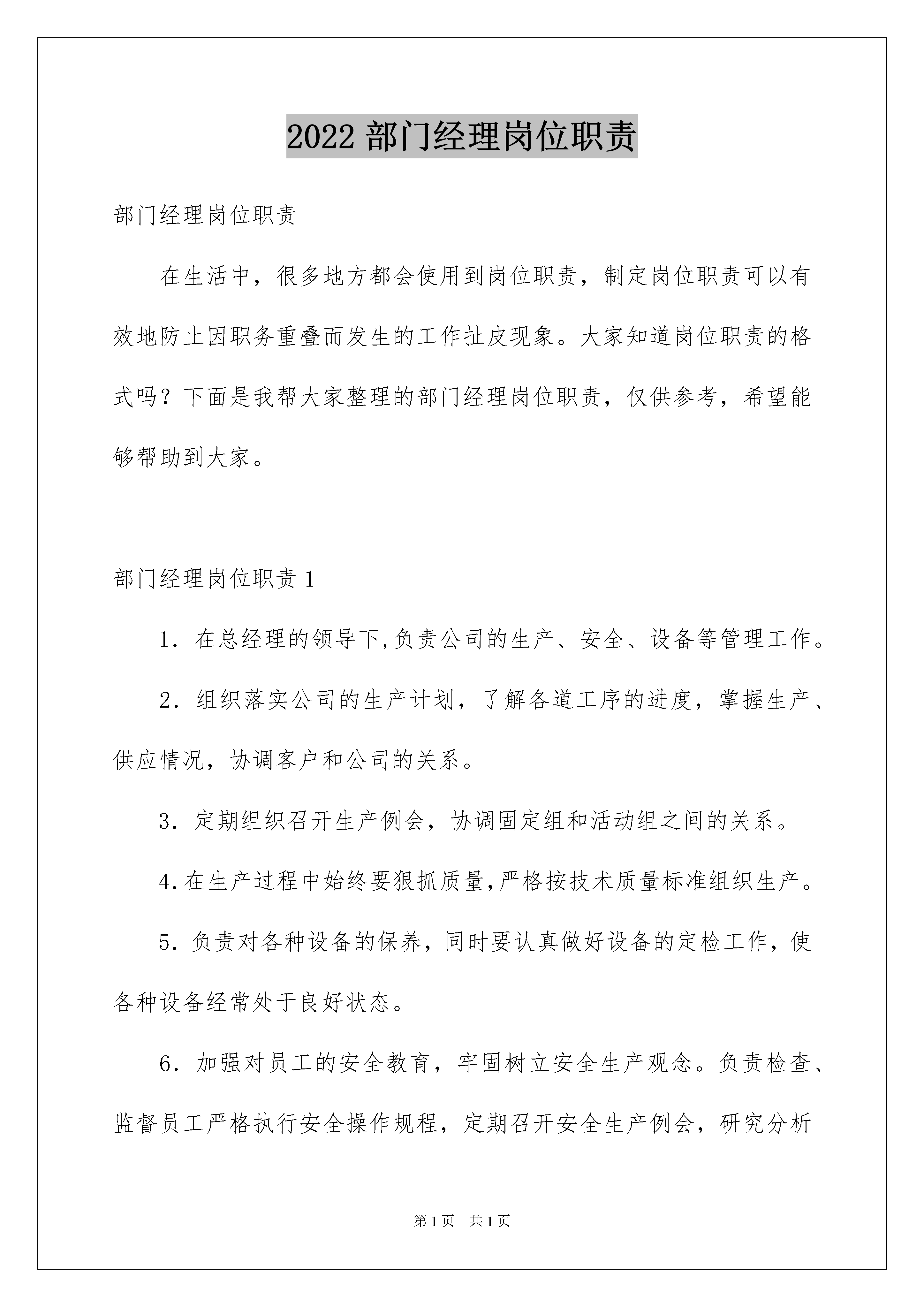 2022部门经理岗位职责部门经理岗位职责在生活中,很多地方都会使用到岗位职责,制定岗位职责可以有效地防止因职务重叠而发生的工作扯皮现象。大家知道岗位职责的格式吗?下面是我帮大家整理的部门经理岗位职责,仅供参考,希望能够帮助到大家。部门经理岗位职责11.在总经理的领导下,负责公司的生产、安全、设备等管理工作。2.组织落实公司的生产计划,了解各道工序的进度,掌握生产、供应情况,协调客户和公司的关系。3.定期组织召开生产例会,协调固定组和活动组之间的关系。4.在生产过程中始终要狠抓质量,严格按技术质量标准组织生产。5.负责对各种设备的保养,同时要认真做好设备的定检工作,使各种设备经常处于良好状态。6.加强对员工的安全教育,牢固树立安全生产观念。负责检查、监督员工严格执行安全操作规程,定期召开安全生产例会,研究分析安全形势,杜绝不安全因素的发生。7.控制好成本费用,增收节支工作,不断提高经济效益。8.完成公司交办的其他任务。以顾客为关注焦点,按月下达质量回访计划,与客户部一起做好质量回访工作。对业务员联系的业务进行评估,并指导完成好该项工作。根据客户的要求,按质按量按时完成生产任务。掌握市场动向,并及时反馈到公司,同时对市场的走向提出建议和意见。固定和活动主管岗位职责1.认真贯彻公司质量管理规程,严格执行国家标准,带领全组员工分工协作,共同完成生产任务。2.根据公司对质量,安全的要求,合理安排好全组人员的工作,保质保量地完成生产任务。3.在生产过程中积极开展技改工作,提出合理化建议,不断采用新技术。4.带领全组人员认真填写生产记录,发现问题及时组织有关人员当场解决,重大问题及时汇报行政部。5.负责对工作件的检查,遇到的问题应及时查明原因。6.带领全组人员做好工完清洁工作,做到工序完车间整洁。岗位职责范本-生产部经理岗位名称:生产部经理直接上级:总经理下属岗位:生产固定组和生产活动组岗位性质:负责全面主持生产部的管理工作管理权限:行使对公司产品生产过程工作的指挥、指导、协调、监督、管理的权力,并承担执行公司规程及工作指令的义务;管理责任:对其分管的生产管理工作全面负责;主要职责:1.在总经理领导下,负责主持本部的全面工作,组织并督促部门人员全面完成本部职责范围内的各项工作任务。2.贯彻落实生产部岗位责任制和工作标准,密切与销售、客户、财务、品管、行政等部门的工作联系,加强与有关部门的协作配合工作;3.负责组织生产、设备、安全检查、环保、生产统计等管理制度的拟订、修改、检查、监督、控制及实施执行;4.负责组织编制年、季、月度生产作业、设备维修、安全卫生计划。定期组织召开公司月度生产会,及时组织实施、检查、协调、考核;5.配合品管部参加技术管理标准、生产工艺流程、新技术开发方案审定工作,及时安排、组织生产,不断提高公司产品的市场竞争力;6.负责抓安全生产、现场管理、劳动防护、环境卫生专项工作;7.负责做好生产统计核算基础管理工作。重视生产用原始记录、报表管理工作,及时编制上报年、季、月度生产、设备等有关统计报表;8.负责做好生产设备维护检查工作,合理安排设备检修时间;9.科学地平衡综合生产能力,合理安排生产作业时间,平衡用电、节约能源、节约产品生产费用、降低生产成本;10.负责组织固定组和活动组主管,安保维修人员及车间组长的业务指导和培训工作,并对其工作定期检查、考核和评比;11.负责组织拟定生产部工作目标、工作计划、并及时组织实施、指导、协调、检查、监督及控制;12.有权向主管领导提议下属组长人选,并对其工作考核评价;13.按时完成公司其他工作任务。部门经理岗位职责21、根据公司运营管理总体发展计划和工作目标,组织实施,确保完成公下达的经营责任指标。2、确保每月的项目回款、发票正常收回。3、合理使用资金,加快资金的周转率。4、控制库存,实现动态库存的零管理。5、开展公司的市场经营和客户服务工作,组织开展市场调查、经营分析,掌握竞争对手动态,及时组织竞争方案的制定和实施,确保公司在市场竞争中的主动。6、组织实施部门机构和人员的调整设置、绩效考核及二级薪酬分配,提出员工的招聘和使用计划,保证公司内部考核、薪酬分配制度的合理完善及人力资源的有效配置,推进公司目标的实现。7、推进公司的企业文化建设,掌握员工主要思想动态,倡导队伍的创新和团队精神,提升公司核心竞争能力。8、完成项目方案的制定及合同形成、标书制作。9、密切与客户及供应商的工作合作关系。10、每周定期将所负责区域信息反馈至公司,了解用户需求及市场动态。11、对于重点项目、重点用户应及时申报公司,并动用公司人力、财力、技术等资源来保