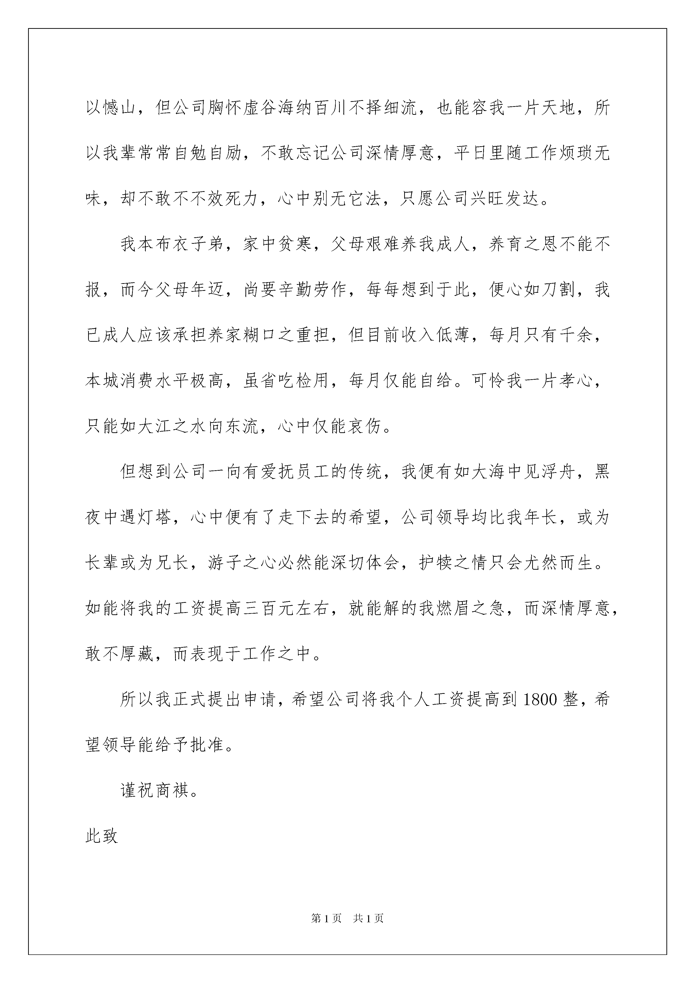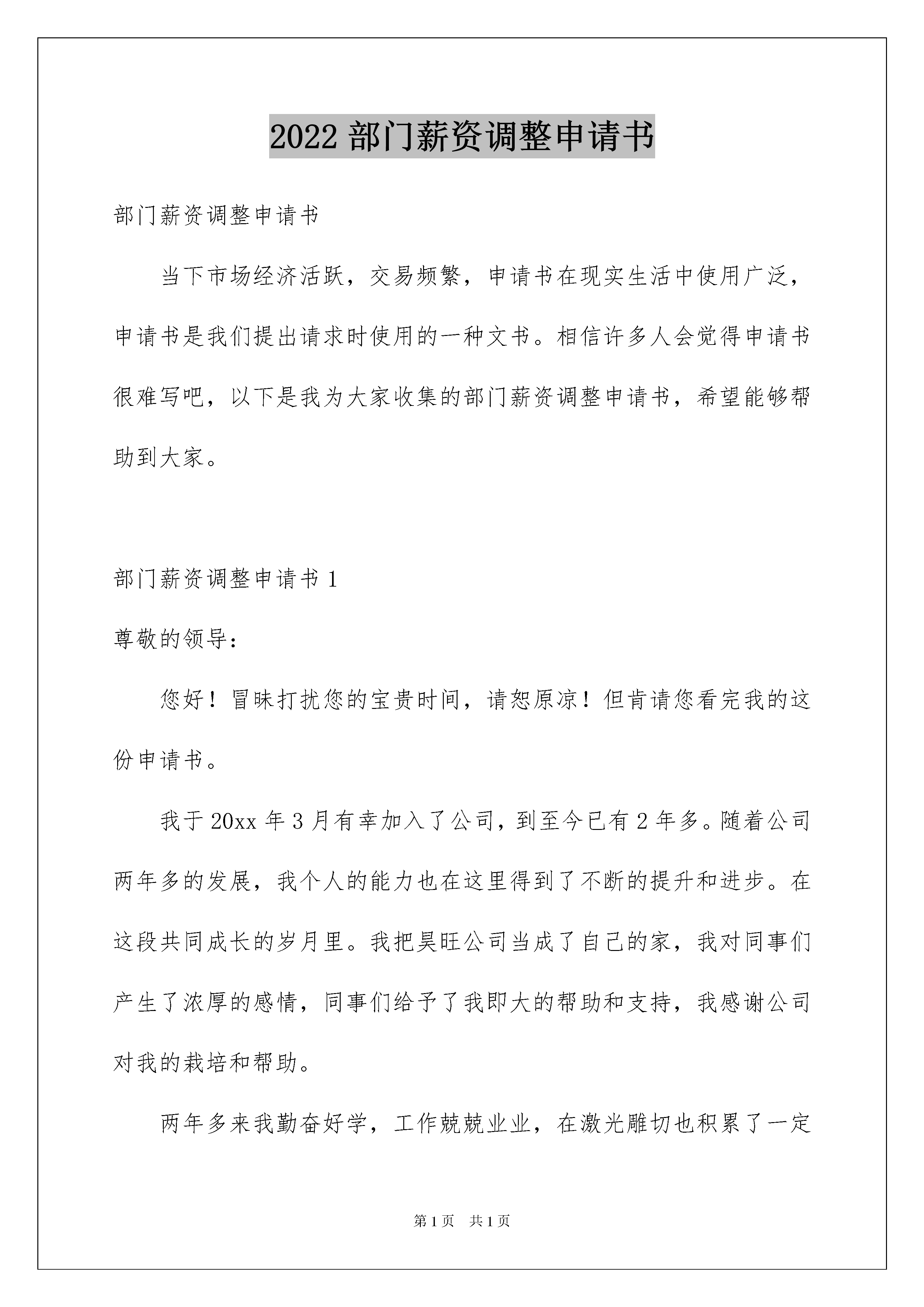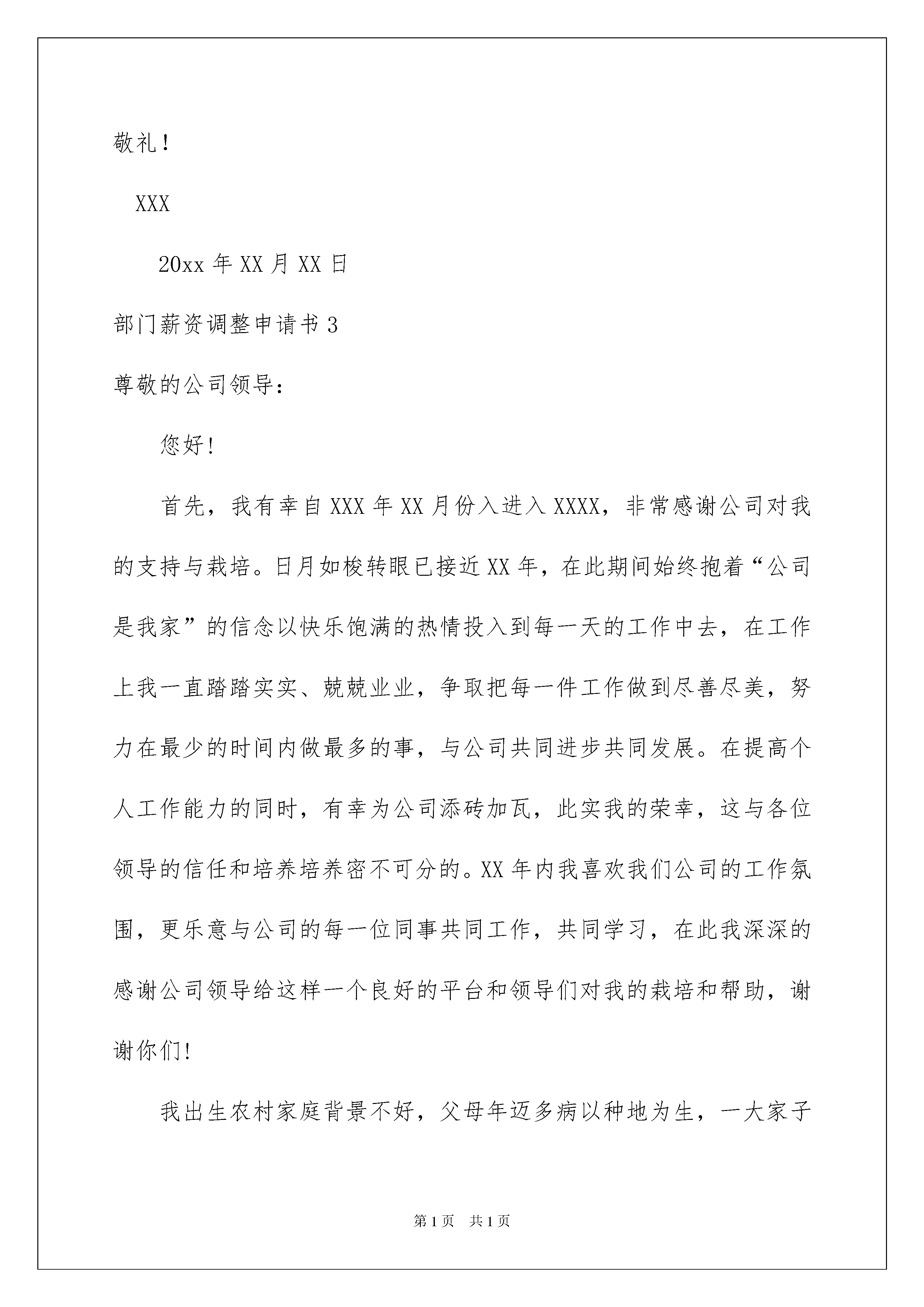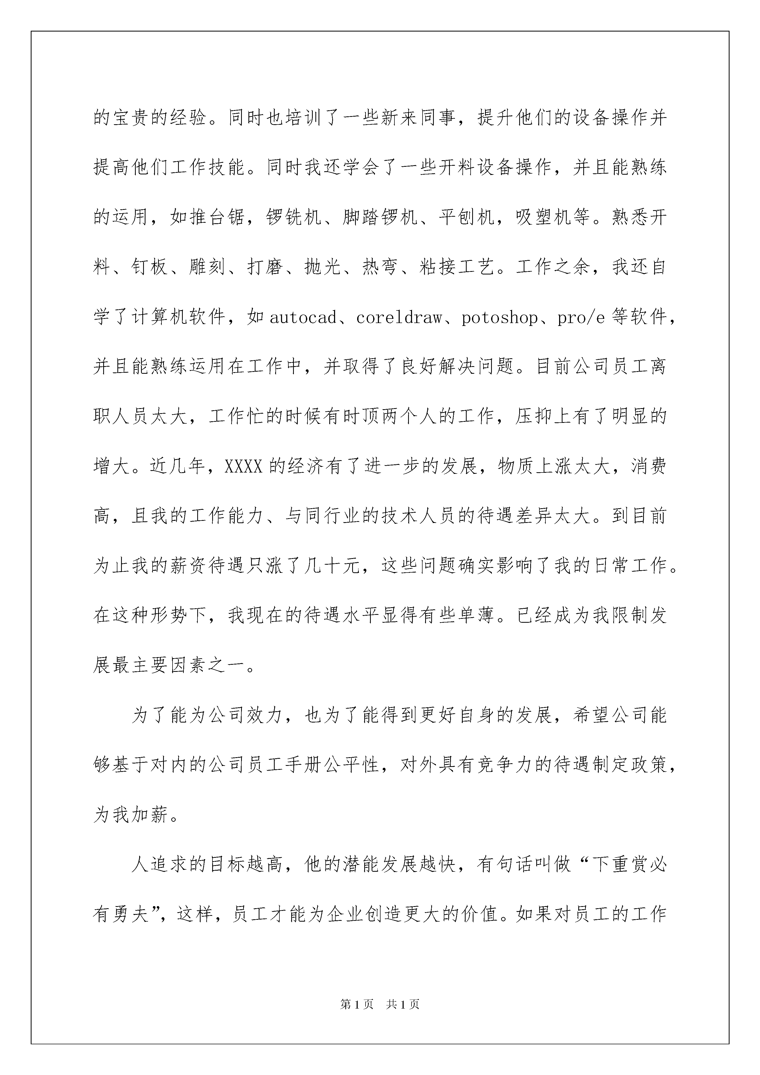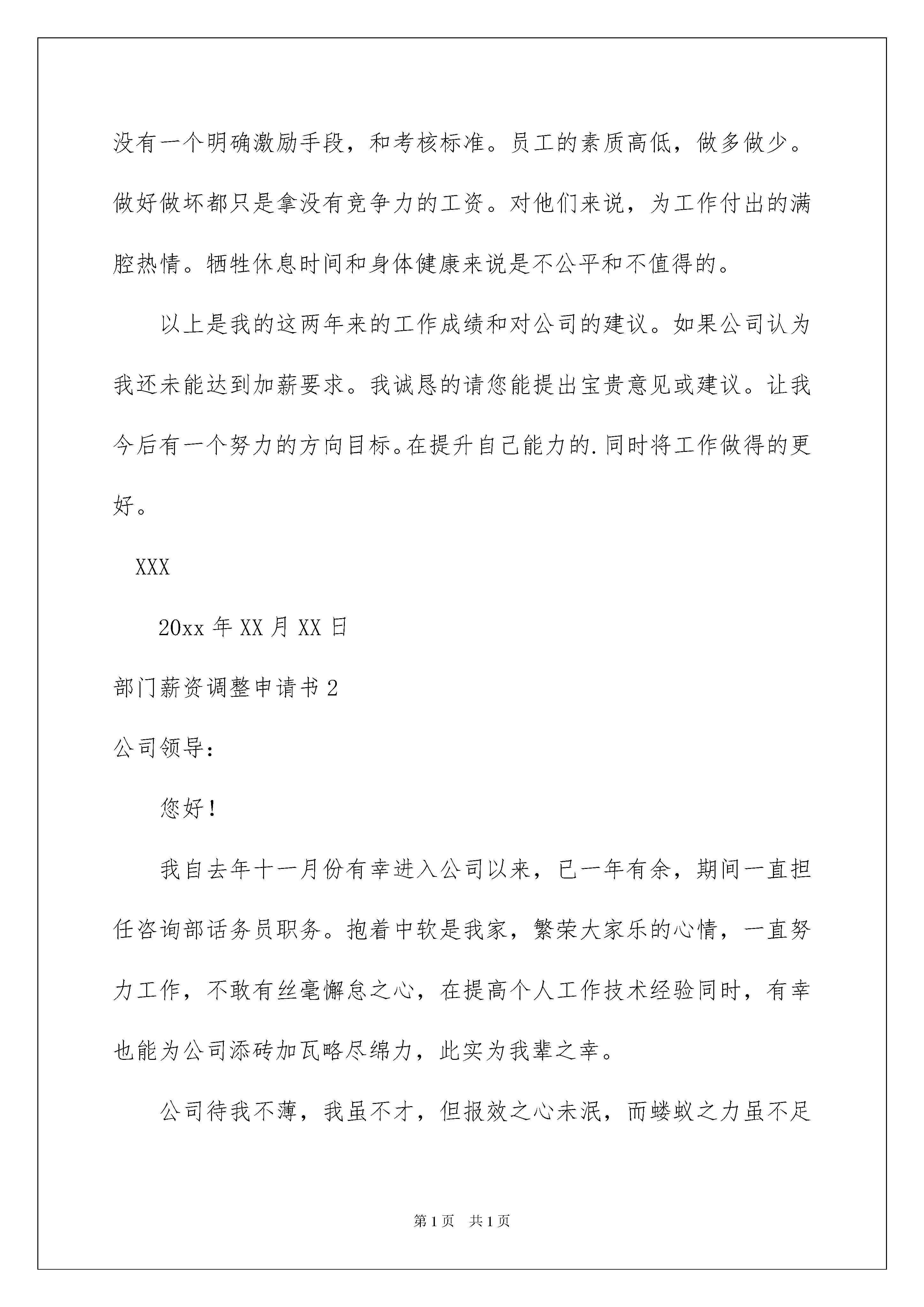 2022部门薪资调整申请书部门薪资调整申请书当下市场经济活跃,交易频繁,申请书在现实生活中使用广泛,申请书是我们提出请求时使用的一种文书。相信许多人会觉得申请书很难写吧,以下是我为大家收集的部门薪资调整申请书,希望能够帮助到大家。部门薪资调整申请书1尊敬的领导:您好!冒昧打扰您的宝贵时间,请恕原凉!但肯请您看完我的这份申请书。我于20xx年3月有幸加入了公司,到至今已有2年多。随着公司两年多的发展,我个人的能力也在这里得到了不断的提升和进步。在这段共同成长的岁月里。我把昊旺公司当成了自己的家,我对同事们产生了浓厚的感情,同事们给予了我即大的帮助和支持,我感谢公司对我的栽培和帮助。两年多来我勤奋好学,工作兢兢业业,在激光雕切也积累了一定的宝贵的经验。同时也培训了一些新来同事,提升他们的设备操作并提高他们工作技能。同时我还学会了一些开料设备操作,并且能熟练的运用,如推台锯,锣铣机、脚踏锣机、平刨机,吸塑机等。熟悉开料、钉板、雕刻、打磨、抛光、热弯、粘接工艺。工作之余,我还自学了计算机软件,如autocad、coreldraw、potoshop、pro/e等软件,并且能熟练运用在工作中,并取得了良好解决问题。目前公司员工离职人员太大,工作忙的时候有时顶两个人的工作,压抑上有了明显的增大。近几年,XXXX的经济有了进一步的发展,物质上涨太大,消费高,且我的工作能力、与同行业的技术人员的待遇差异太大。到目前为止我的薪资待遇只涨了几十元,这些问题确实影响了我的日常工作。在这种形势下,我现在的待遇水平显得有些单薄。已经成为我限制发展最主要因素之一。为了能为公司效力,也为了能得到更好自身的发展,希望公司能够基于对内的公司员工手册公平性,对外具有竞争力的待遇制定政策,为我加薪。人追求的目标越高,他的潜能发展越快,有句话叫做“下重赏必有勇夫”,这样,员工才能为企业创造更大的价值。如果对员工的工作没有一个明确激励手段,和考核标准。员工的素质高低,做多做少。做好做坏都只是拿没有竞争力的工资。对他们来说,为工作付出的满腔热情。牺牲休息时间和身体健康来说是不公平和不值得的。以上是我的这两年来的工作成绩和对公司的建议。如果公司认为我还未能达到加薪要求。我诚恳的请您能提出宝贵意见或建议。让我今后有一个努力的方向目标。在提升自己能力的.同时将工作做得的更好。XXX20xx年XX月XX日部门薪资调整申请书2公司领导:您好!我自去年十一月份有幸进入公司以来,已一年有余,期间一直担任咨询部话务员职务。抱着中软是我家,繁荣大家乐的心情,一直努力工作,不敢有丝毫懈怠之心,在提高个人工作技术经验同时,有幸也能为公司添砖加瓦略尽绵力,此实为我辈之幸。公司待我不薄,我虽不才,但报效之心未泯,而蝼蚁之力虽不足以憾山,但公司胸怀虚谷海纳百川不择细流,也能容我一片天地,所以我辈常常自勉自励,不敢忘记公司深情厚意,平日里随工作烦琐无味,却不敢不不效死力,心中别无它法,只愿公司兴旺发达。我本布衣子弟,家中贫寒,父母艰难养我成人,养育之恩不能不报,而今父母年迈,尚要辛勤劳作,每每想到于此,便心如刀割,我已成人应该承担养家糊口之重担,但目前收入低薄,每月只有千余,本城消费水平极高,虽省吃检用,每月仅能自给。可怜我一片孝心,只能如大江之水向东流,心中仅能哀伤。但想到公司一向有爱抚员工的传统,我便有如大海中见浮舟,黑夜中遇灯塔,心中便有了走下去的希望,公司领导均比我年长,或为长辈或为兄长,游子之心必然能深切体会,护犊之情只会尤然而生。如能将我的工资提高三百元左右,就能解的我燃眉之急,而深情厚意,敢不厚藏,而表现于工作之中。所以我正式提出申请,希望公司将我个人工资提高到1800整,希望领导能给予批准。谨祝商褀。此致敬礼!XXX20xx年XX月XX日部门薪资调整申请书3尊敬的公司领导:您好!首先,我有幸自XXX年XX月份入进入XXXX,非常感谢公司对我的支持与栽培。日月如梭转眼已接近XX年,在此期间始终抱着“公司是我家”的信念以快乐饱满的热情投入到每一天的工作中去,在工作上我一直踏踏实实、兢兢业业,争取把每一件工作做到尽善尽美,努力在最少的时间内做最多的事,与公司共同进步共同发展。在提高个人工作能力的同时,有幸为公司添砖加瓦,此实我的荣幸,这与各位领导的信任和培养培养密不可分的。XX年内我喜欢我们公司的工作氛围,更乐意与公司的每一位同事共同工作,共同学习,在此我深深的感谢公司领导给这样一个良好的平台和领导们对我的栽培和帮助,谢谢你们!我出生农村家庭背景不好,父母年迈多病以种地为生,一大家子的重担几乎全落在我一人身上。平时我省吃简用,与同事朋友