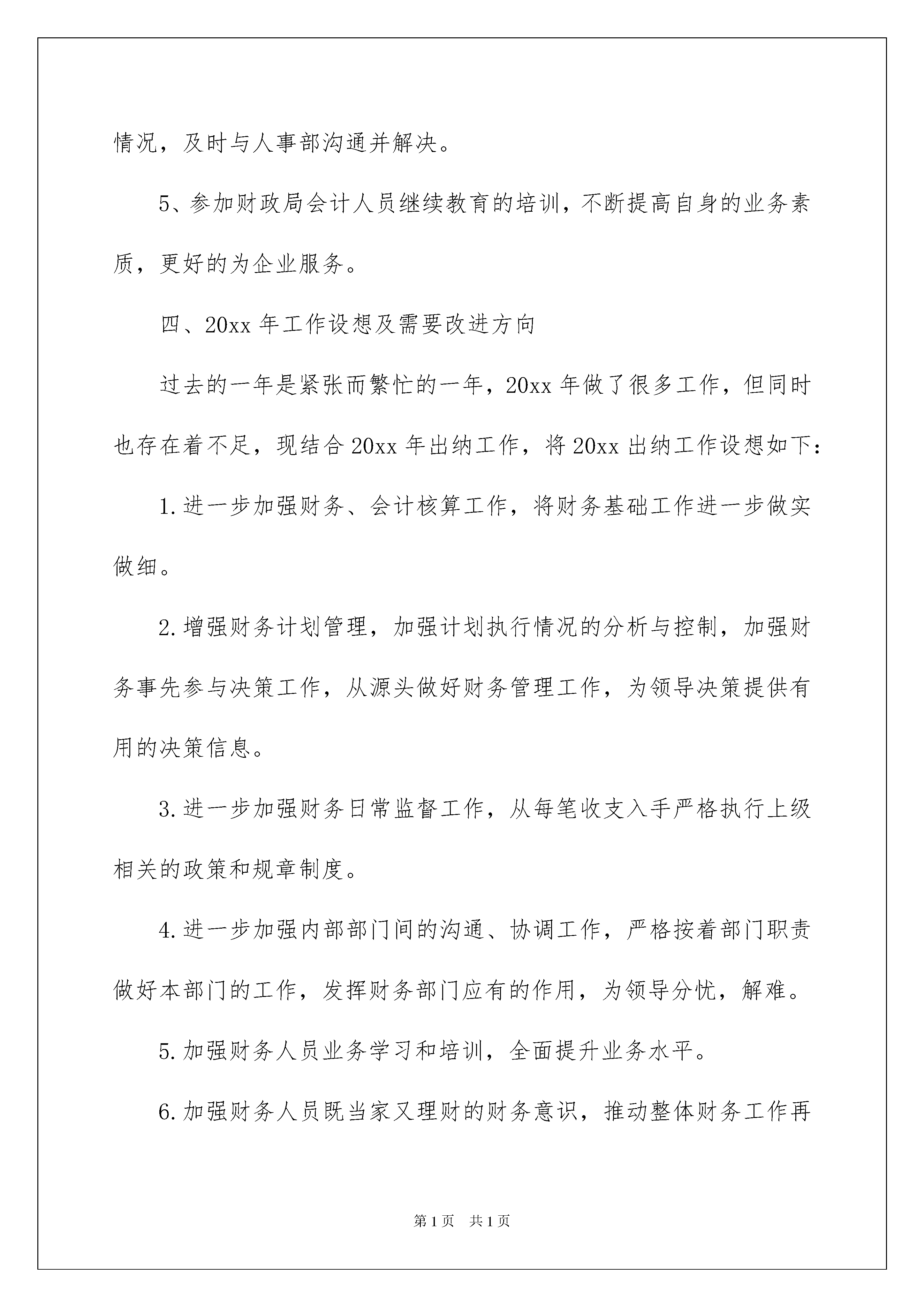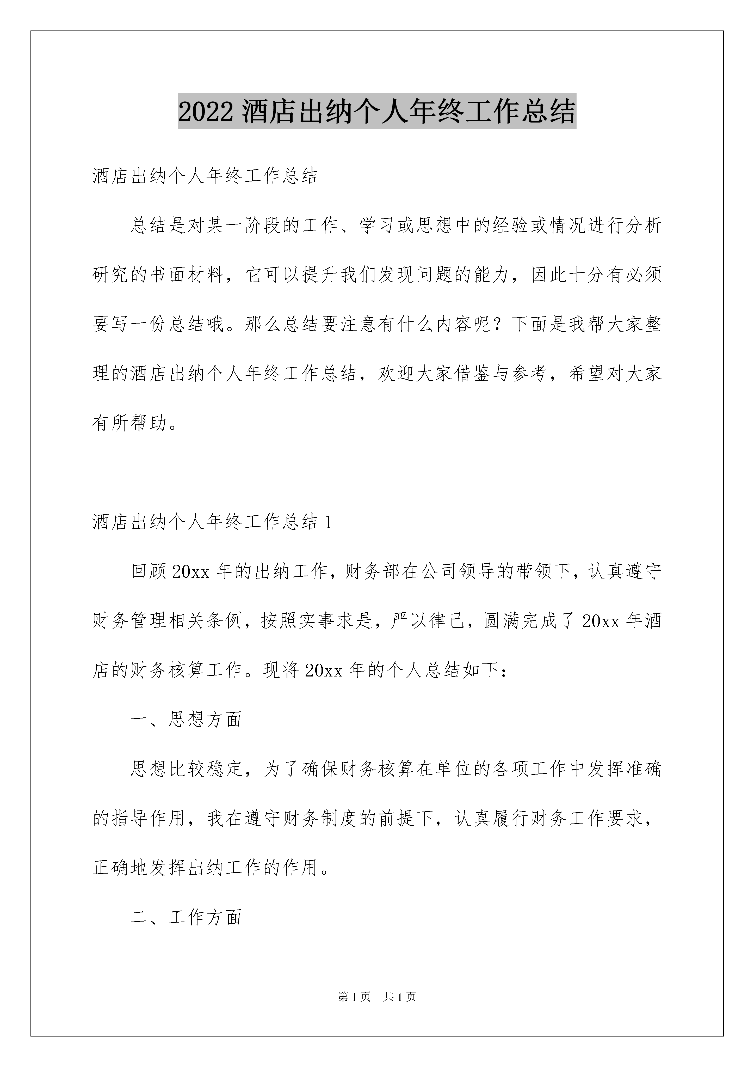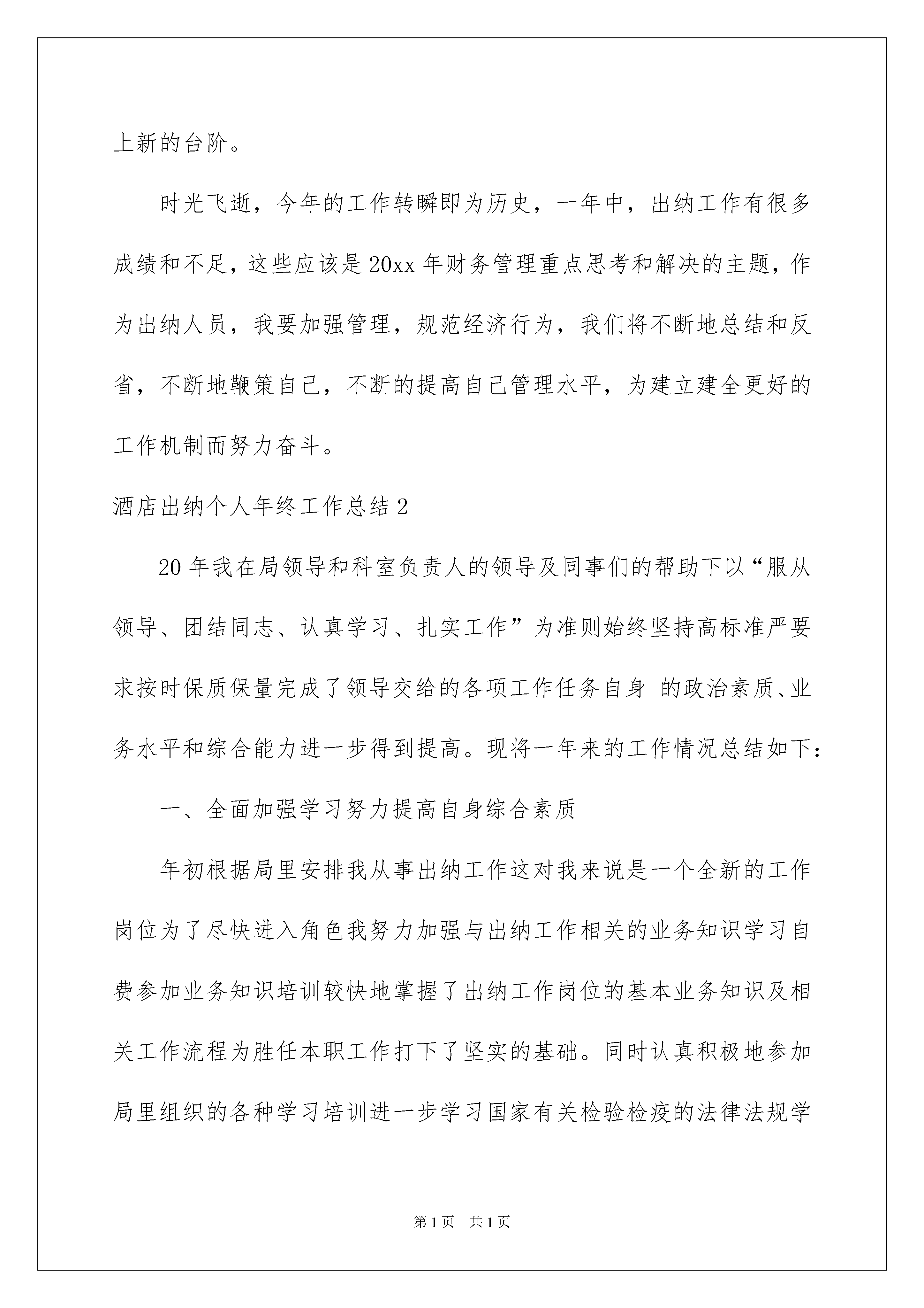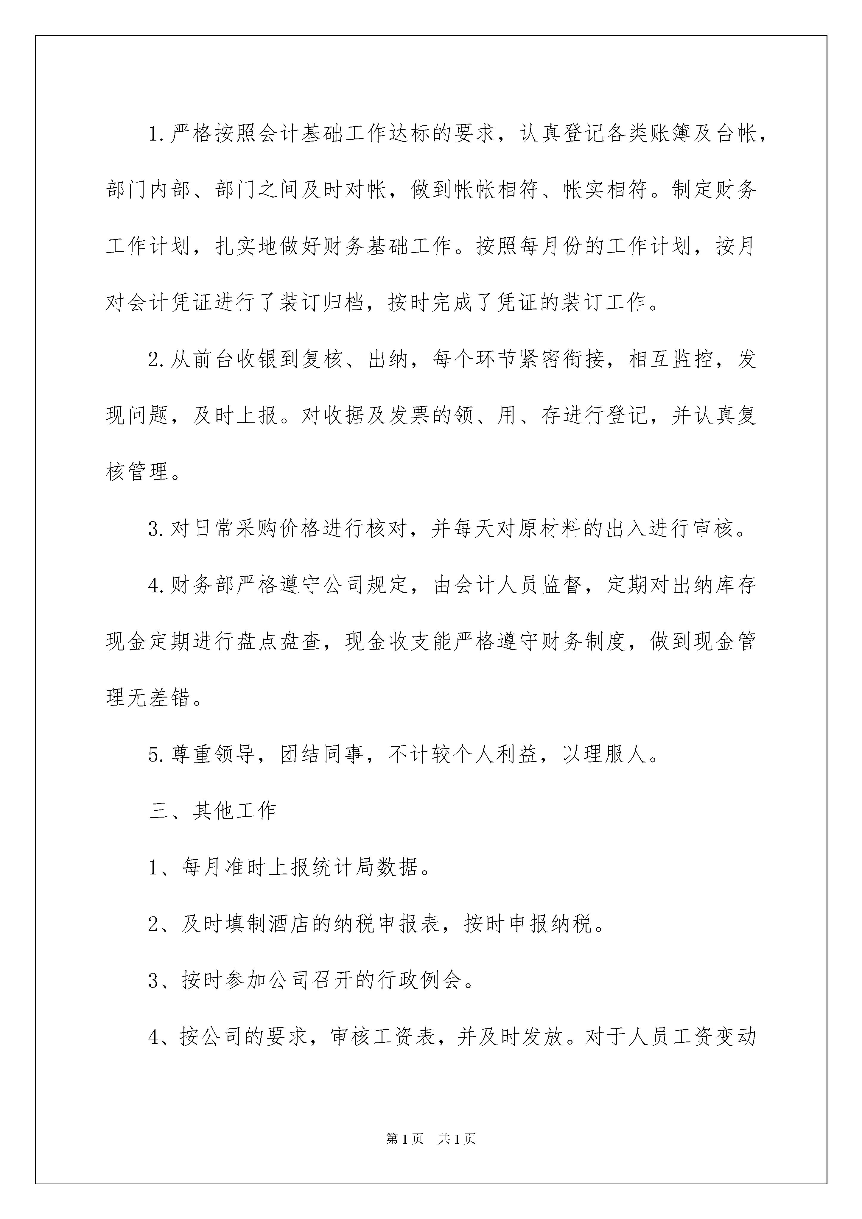 2022酒店出纳个人年终工作总结酒店出纳个人年终工作总结总结是对某一阶段的工作、学习或思想中的经验或情况进行分析研究的书面材料,它可以提升我们发现问题的能力,因此十分有必须要写一份总结哦。那么总结要注意有什么内容呢?下面是我帮大家整理的酒店出纳个人年终工作总结,欢迎大家借鉴与参考,希望对大家有所帮助。酒店出纳个人年终工作总结1回顾20xx年的出纳工作,财务部在公司领导的带领下,认真遵守财务管理相关条例,按照实事求是,严以律己,圆满完成了20xx年酒店的财务核算工作。现将20xx年的个人总结如下:一、思想方面思想比较稳定,为了确保财务核算在单位的各项工作中发挥准确的指导作用,我在遵守财务制度的前提下,认真履行财务工作要求,正确地发挥出纳工作的作用。二、工作方面1.严格按照会计基础工作达标的要求,认真登记各类账簿及台帐,部门内部、部门之间及时对帐,做到帐帐相符、帐实相符。制定财务工作计划,扎实地做好财务基础工作。按照每月份的工作计划,按月对会计凭证进行了装订归档,按时完成了凭证的装订工作。2.从前台收银到复核、出纳,每个环节紧密衔接,相互监控,发现问题,及时上报。对收据及发票的领、用、存进行登记,并认真复核管理。3.对日常采购价格进行核对,并每天对原材料的出入进行审核。4.财务部严格遵守公司规定,由会计人员监督,定期对出纳库存现金定期进行盘点盘查,现金收支能严格遵守财务制度,做到现金管理无差错。5.尊重领导,团结同事,不计较个人利益,以理服人。三、其他工作1、每月准时上报统计局数据。2、及时填制酒店的纳税申报表,按时申报纳税。3、按时参加公司召开的行政例会。4、按公司的要求,审核工资表,并及时发放。对于人员工资变动情况,及时与人事部沟通并解决。5、参加财政局会计人员继续教育的培训,不断提高自身的业务素质,更好的为企业服务。四、20xx年工作设想及需要改进方向过去的一年是紧张而繁忙的一年,20xx年做了很多工作,但同时也存在着不足,现结合20xx年出纳工作,将20xx出纳工作设想如下:1.进一步加强财务、会计核算工作,将财务基础工作进一步做实做细。2.增强财务计划管理,加强计划执行情况的分析与控制,加强财务事先参与决策工作,从源头做好财务管理工作,为领导决策提供有用的决策信息。3.进一步加强财务日常监督工作,从每笔收支入手严格执行上级相关的政策和规章制度。4.进一步加强内部部门间的沟通、协调工作,严格按着部门职责做好本部门的工作,发挥财务部门应有的作用,为领导分忧,解难。5.加强财务人员业务学习和培训,全面提升业务水平。6.加强财务人员既当家又理财的财务意识,推动整体财务工作再上新的台阶。时光飞逝,今年的工作转瞬即为历史,一年中,出纳工作有很多成绩和不足,这些应该是20xx年财务管理重点思考和解决的主题,作为出纳人员,我要加强管理,规范经济行为,我们将不断地总结和反省,不断地鞭策自己,不断的提高自己管理水平,为建立建全更好的工作机制而努力奋斗。酒店出纳个人年终工作总结220年我在局领导和科室负责人的领导及同事们的帮助下以“服从领导、团结同志、认真学习、扎实工作”为准则始终坚持高标准严要求按时保质保量完成了领导交给的各项工作任务自身的政治素质、业务水平和综合能力进一步得到提高。现将一年来的工作情况总结如下:一、全面加强学习努力提高自身综合素质年初根据局里安排我从事出纳工作这对我来说是一个全新的工作岗位为了尽快进入角色我努力加强与出纳工作相关的业务知识学习自费参加业务知识培训较快地掌握了出纳工作岗位的基本业务知识及相关工作流程为胜任本职工作打下了坚实的基础。同时认真积极地参加局里组织的各种学习培训进一步学习国家有关检验检疫的法律法规学习省局、岳阳局的文件精神和规章制度。及时把握政策动向使自己在思想和行动上与全局保持了高度一致。二、严于律已不断加强作风建设一年来我对自身严格要求始终把“耐得平淡、舍得付出、默默无闻”作为自己的行为准则始终把加强作风建设的重点放在严谨、细致、扎实、求实、脚踏实地埋头苦干上在工作中以制度、纪律规范自己的一言一行严格遵守本局的各项规章制度尊重领导团结同志、谦虚谨慎主动接受来自各方面的意见和建议不断改进工作坚持做到不利于机关形象的事不做、不利于机关形象的话不说积极维护单位的良好形象。三、立足本职全力完成各项工作任务公文收发文办理今年共收文570多个经过清理没有遗漏现象。在公文阅办过程中做到了及时、准确、流向清晰没有出现漏传、误传和延传等现象。及时做好机要件的来文登记。对20xx年机要件进行了清理、上交。1、今年共发文50个发函43个党组发文4个从文种的选择、文