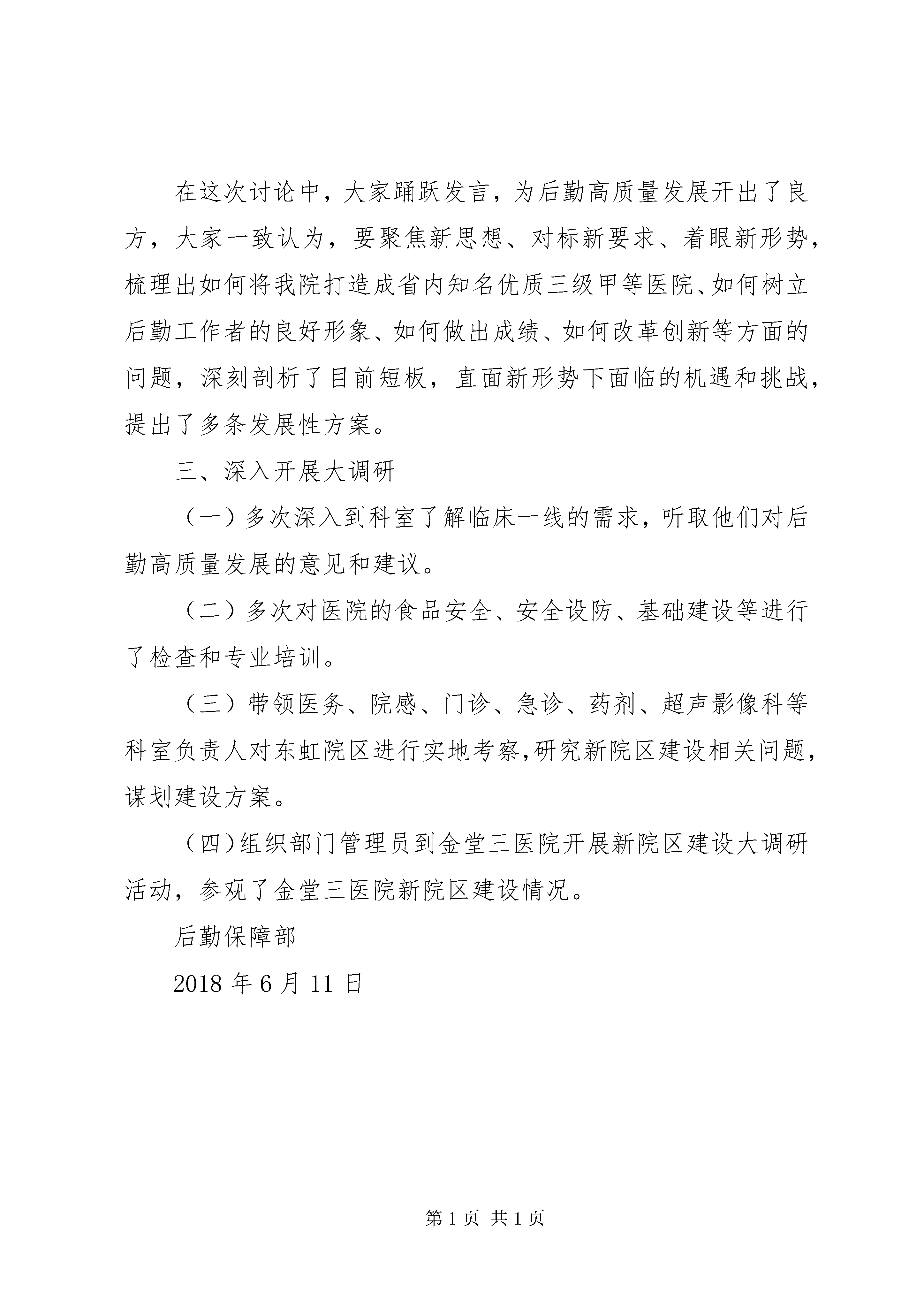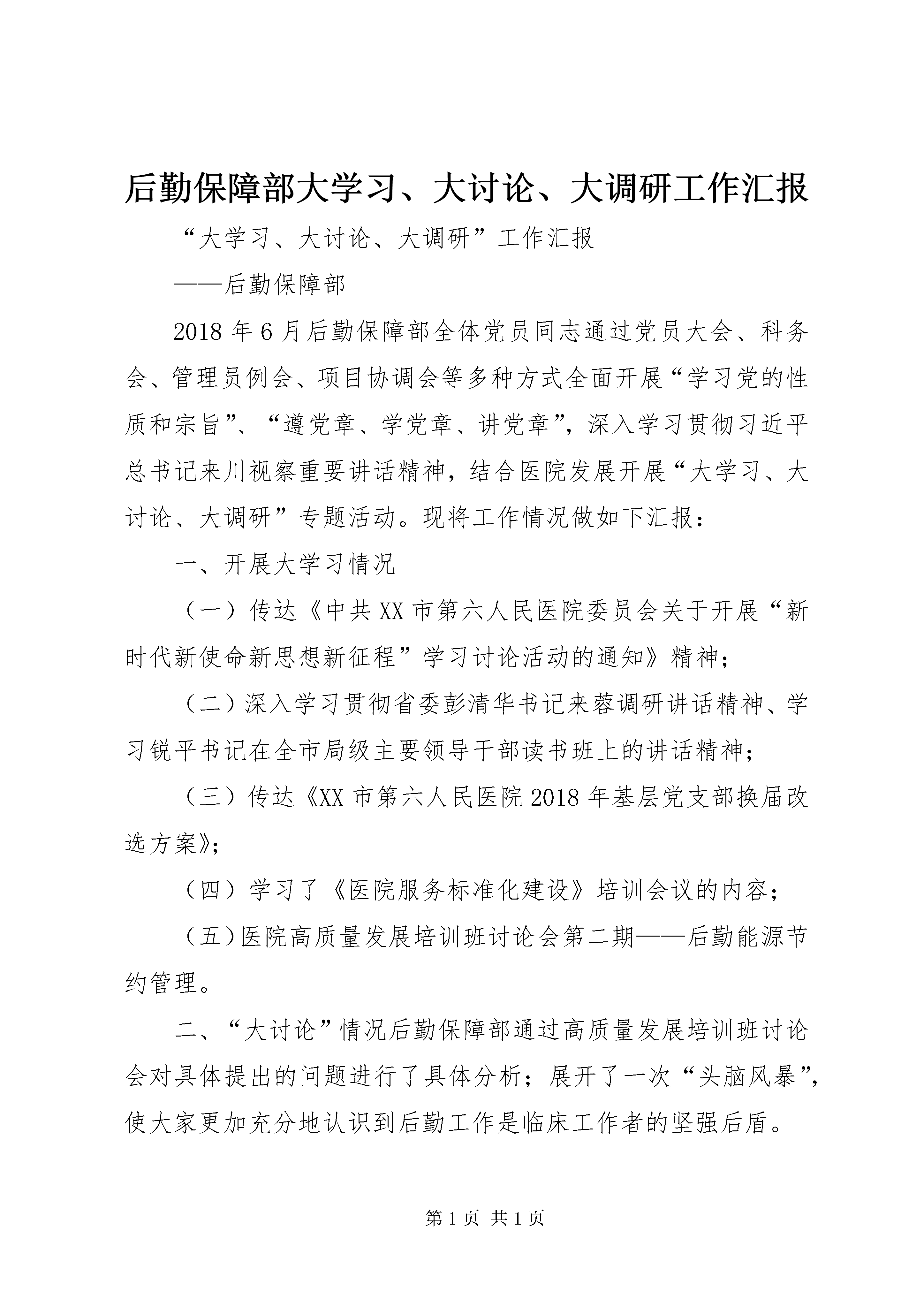后勤保障部大学习、大讨论、大调研工作汇报“大学习、大讨论、大调研”工作汇报——后勤保障部2018年6月后勤保障部全体党员同志通过党员大会、科务会、管理员例会、项目协调会等多种方式全面开展“学习党的性质和宗旨”、“遵党章、学党章、讲党章”,深入学习贯彻习近平总书记来川视察重要讲话精神,结合医院发展开展“大学习、大讨论、大调研”专题活动。现将工作情况做如下汇报:一、开展大学习情况(一)传达《中共XX市第六人民医院委员会关于开展“新时代新使命新思想新征程”学习讨论活动的通知》精神;(二)深入学习贯彻省委彭清华书记来蓉调研讲话精神、学习锐平书记在全市局级主要领导干部读书班上的讲话精神;(三)传达《XX市第六人民医院2018年基层党支部换届改选方案》;(四)学习了《医院服务标准化建设》培训会议的内容;(五)医院高质量发展培训班讨论会第二期——后勤能源节约管理。二、“大讨论”情况后勤保障部通过高质量发展培训班讨论会对具体提出的问题进行了具体分析;展开了一次“头脑风暴”,使大家更加充分地认识到后勤工作是临床工作者的坚强后盾。在这次讨论中,大家踊跃发言,为后勤高质量发展开出了良方,大家一致认为,要聚焦新思想、对标新要求、着眼新形势,梳理出如何将我院打造成省内知名优质三级甲等医院、如何树立后勤工作者的良好形象、如何做出成绩、如何改革创新等方面的问题,深刻剖析了目前短板,直面新形势下面临的机遇和挑战,提出了多条发展性方案。三、深入开展大调研(一)多次深入到科室了解临床一线的需求,听取他们对后勤高质量发展的意见和建议。(二)多次对医院的食品安全、安全设防、基础建设等进行了检查和专业培训。(三)带领医务、院感、门诊、急诊、药剂、超声影像科等科室负责人对东虹院区进行实地考察,研究新院区建设相关问题,谋划建设方案。(四)组织部门管理员到金堂三医院开展新院区建设大调研活动,参观了金堂三医院新院区建设情况。后勤保障部2018年6月11日