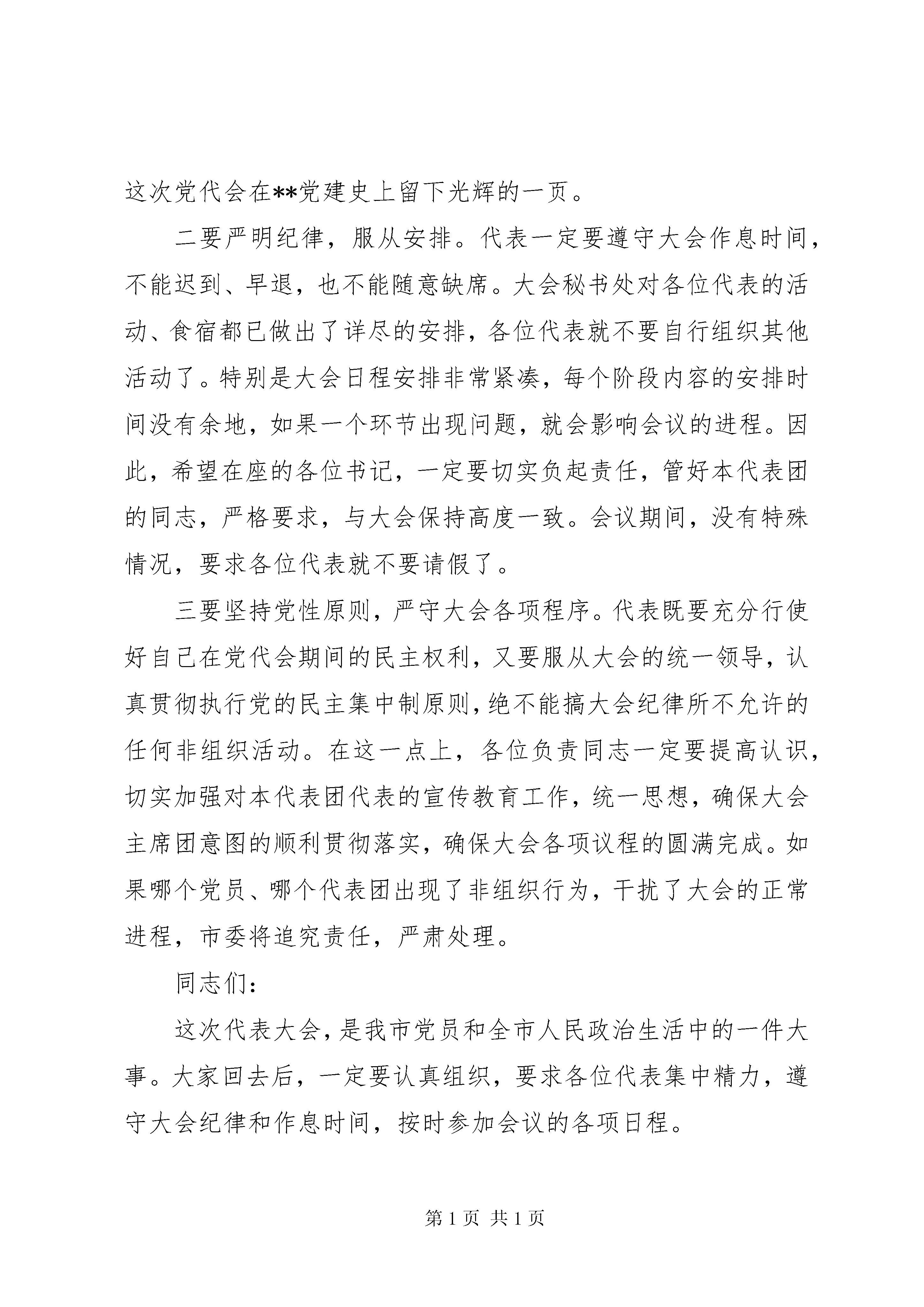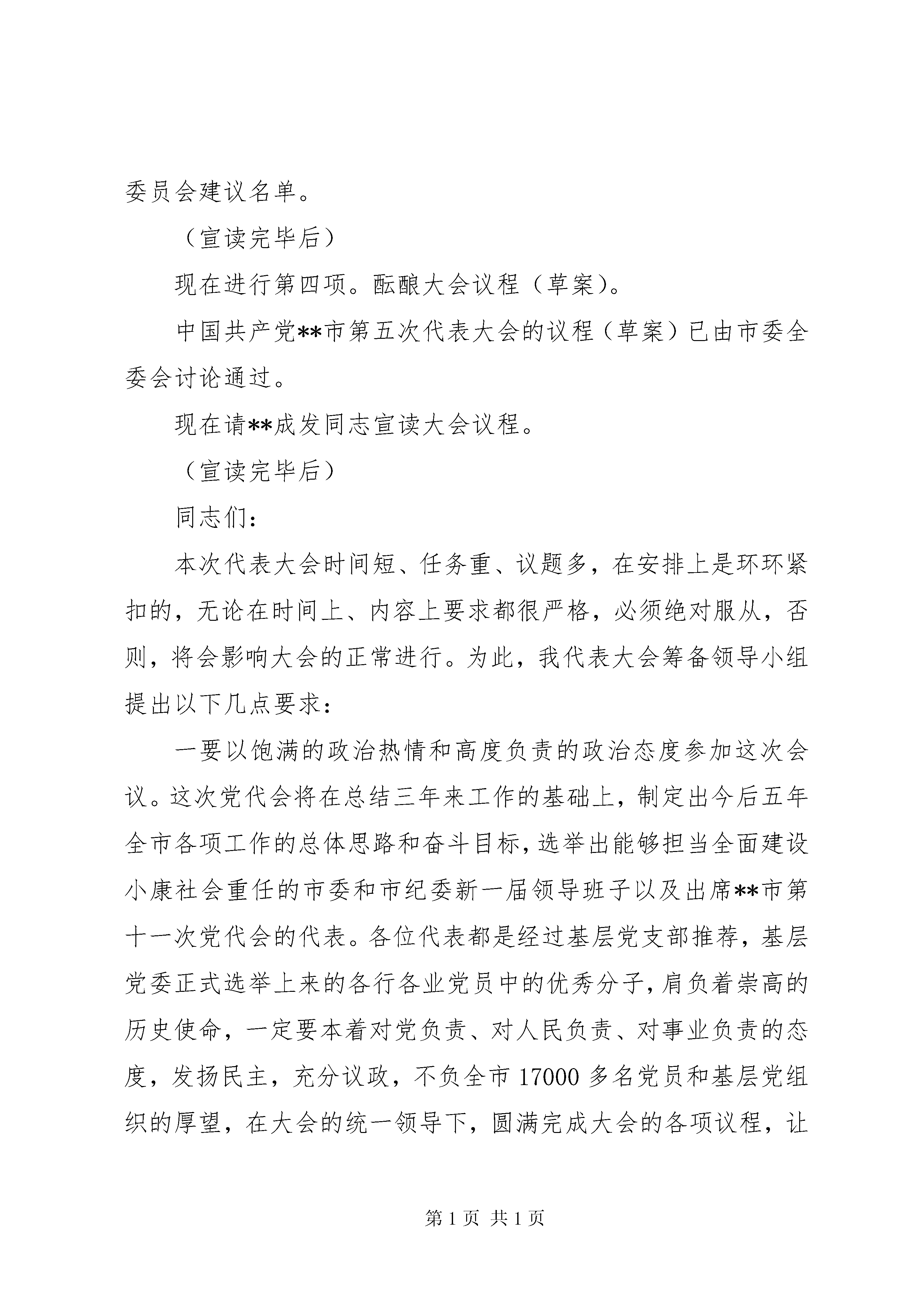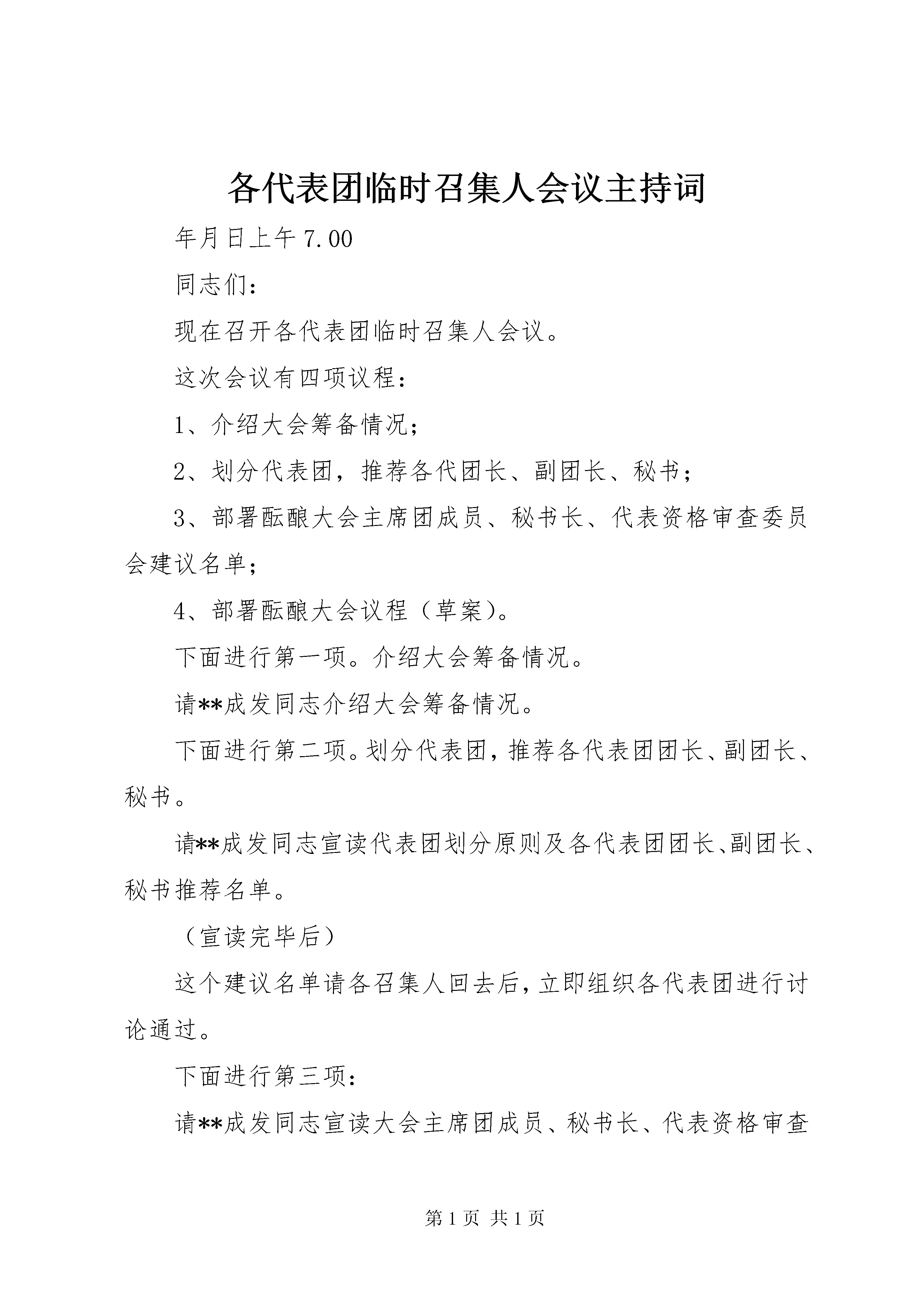 各代表团临时召集人会议主持词年月日上午7.00同志们:现在召开各代表团临时召集人会议。这次会议有四项议程:1、介绍大会筹备情况;2、划分代表团,推荐各代团长、副团长、秘书;3、部署酝酿大会主席团成员、秘书长、代表资格审查委员会建议名单;4、部署酝酿大会议程(草案)。下面进行第一项。介绍大会筹备情况。请**成发同志介绍大会筹备情况。下面进行第二项。划分代表团,推荐各代表团团长、副团长、秘书。请**成发同志宣读代表团划分原则及各代表团团长、副团长、秘书推荐名单。(宣读完毕后)这个建议名单请各召集人回去后,立即组织各代表团进行讨论通过。下面进行第三项:请**成发同志宣读大会主席团成员、秘书长、代表资格审查委员会建议名单。(宣读完毕后)现在进行第四项。酝酿大会议程(草案)。中国共产党**市第五次代表大会的议程(草案)已由市委全委会讨论通过。现在请**成发同志宣读大会议程。(宣读完毕后)同志们:本次代表大会时间短、任务重、议题多,在安排上是环环紧扣的,无论在时间上、内容上要求都很严格,必须绝对服从,否则,将会影响大会的正常进行。为此,我代表大会筹备领导小组提出以下几点要求:一要以饱满的政治热情和高度负责的政治态度参加这次会议。这次党代会将在总结三年来工作的基础上,制定出今后五年全市各项工作的总体思路和奋斗目标,选举出能够担当全面建设小康社会重任的市委和市纪委新一届领导班子以及出席**市第十一次党代会的代表。各位代表都是经过基层党支部推荐,基层党委正式选举上来的各行各业党员中的优秀分子,肩负着崇高的历史使命,一定要本着对党负责、对人民负责、对事业负责的态度,发扬民主,充分议政,不负全市17000多名党员和基层党组织的厚望,在大会的统一领导下,圆满完成大会的各项议程,让这次党代会在**党建史上留下光辉的一页。二要严明纪律,服从安排。代表一定要遵守大会作息时间,不能迟到、早退,也不能随意缺席。大会秘书处对各位代表的活动、食宿都已做出了详尽的安排,各位代表就不要自行组织其他活动了。特别是大会日程安排非常紧凑,每个阶段内容的安排时间没有余地,如果一个环节出现问题,就会影响会议的进程。因此,希望在座的各位书记,一定要切实负起责任,管好本代表团的同志,严格要求,与大会保持高度一致。会议期间,没有特殊情况,要求各位代表就不要请假了。三要坚持党性原则,严守大会各项程序。代表既要充分行使好自己在党代会期间的民主权利,又要服从大会的统一领导,认真贯彻执行党的民主集中制原则,绝不能搞大会纪律所不允许的任何非组织活动。在这一点上,各位负责同志一定要提高认识,切实加强对本代表团代表的宣传教育工作,统一思想,确保大会主席团意图的顺利贯彻落实,确保大会各项议程的圆满完成。如果哪个党员、哪个代表团出现了非组织行为,干扰了大会的正常进程,市委将追究责任,严肃处理。同志们:这次代表大会,是我市党员和全市人民政治生活中的一件大事。大家回去后,一定要认真组织,要求各位代表集中精力,遵守大会纪律和作息时间,按时参加会议的各项日程。各代表团临时召集人会议主持词(全文共有1301个字)可完全免费阅读或下载全文。淘为全国范文类知名网站,复制或下载全文稍作修改便可使用,即刻完成写稿任务。下载全文:下载该doc格式word文档全文(免费)