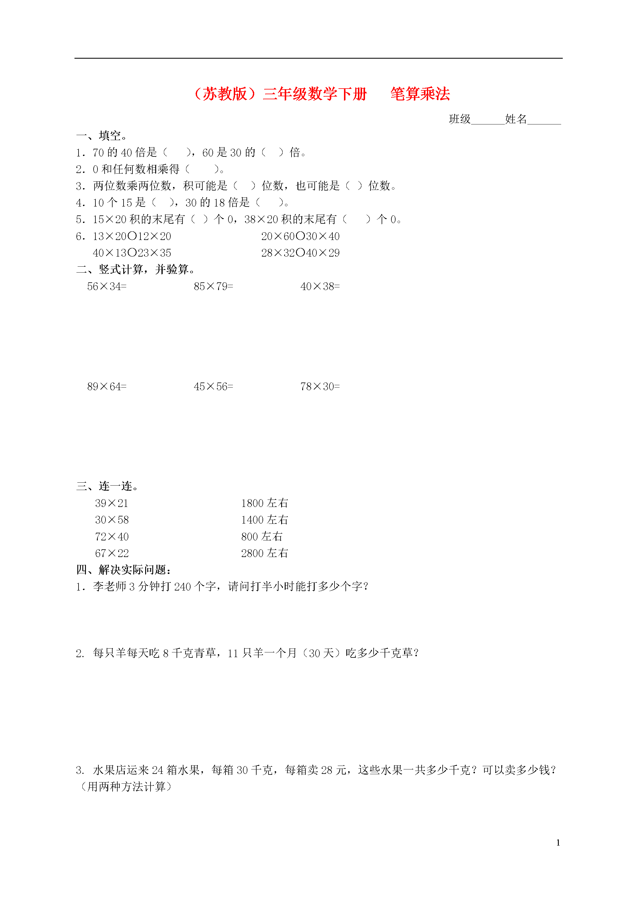2(苏教版)三年级数学下册笔算乘法班级______姓名______一、填空。1.70的40倍是(),60是30的()倍。2.0和任何数相乘得()。3.两位数乘两位数,积可能是()位数,也可能是()位数。4.10个15是(),30的18倍是()。5.15×20积的末尾有()个0,38×20积的末尾有()个0。6.13×20〇12×2020×60〇30×4040×13〇23×3528×32〇40×29二、竖式计算,并验算。56×34=85×79=40×38=89×64=45×56=78×30=三、连一连。39×211800左右30×581400左右72×40800左右67×222800左右四、解决实际问题:1.李老师3分钟打240个字,请问打半小时能打多少个字?2.每只羊每天吃8千克青草,11只羊一个月(30天)吃多少千克草?3.水果店运来24箱水果,每箱30千克,每箱卖28元,这些水果一共多少千克?可以卖多少钱?(用两种方法计算)