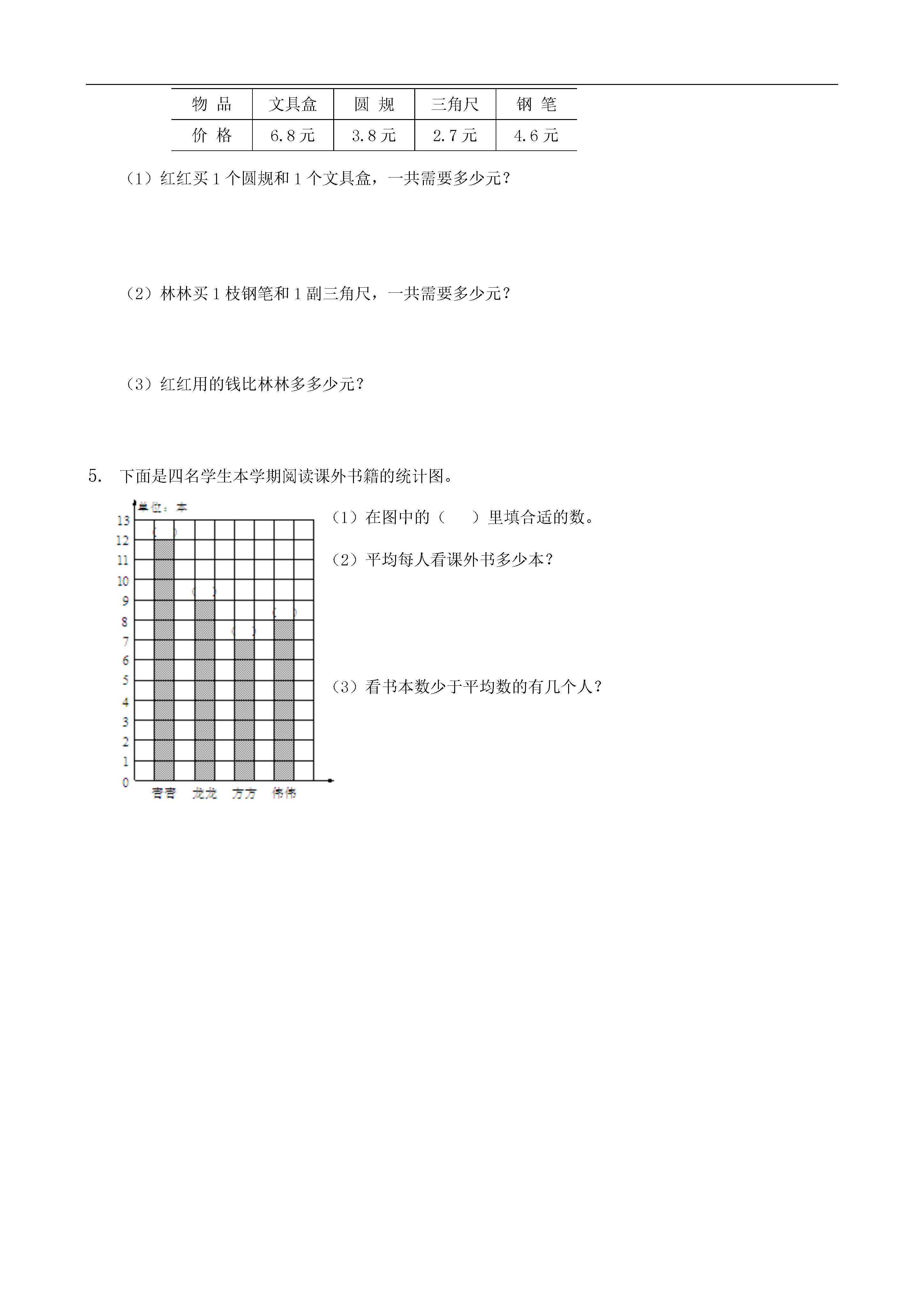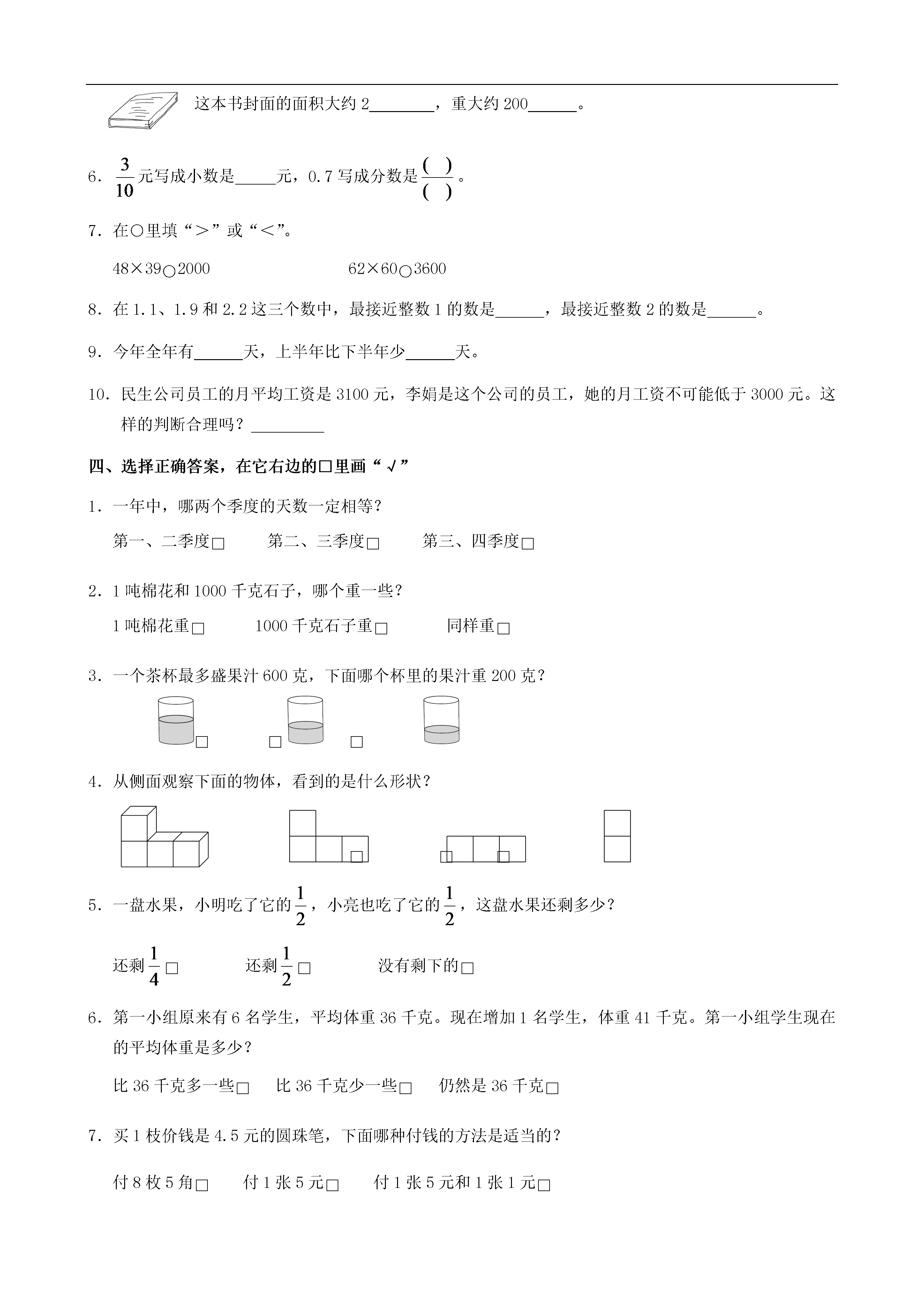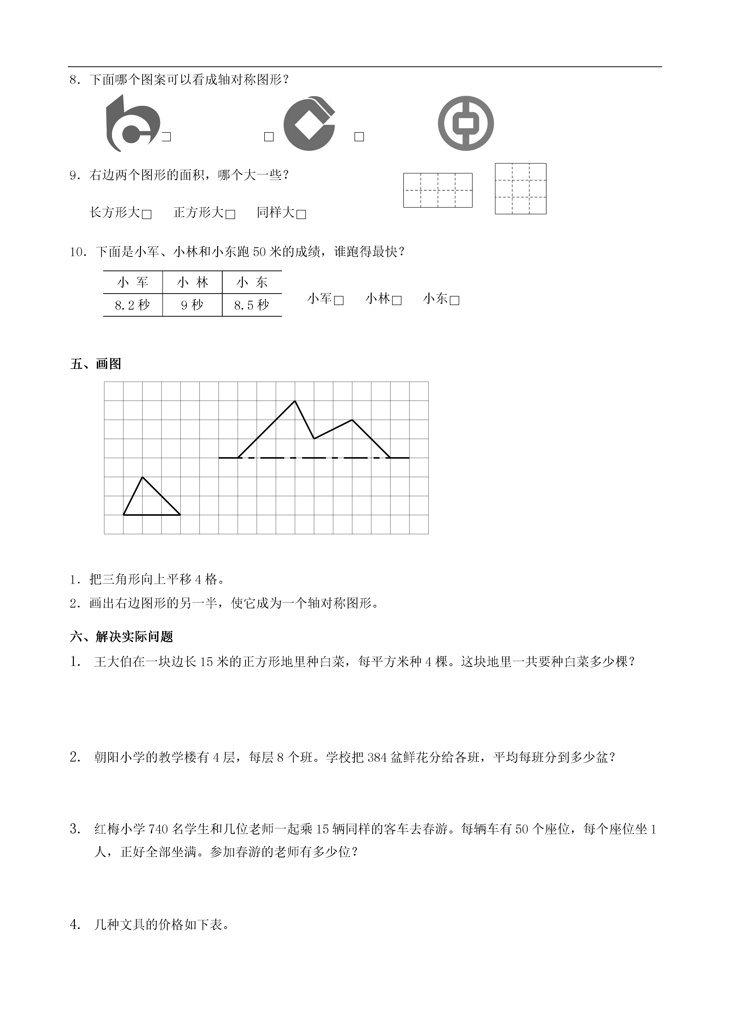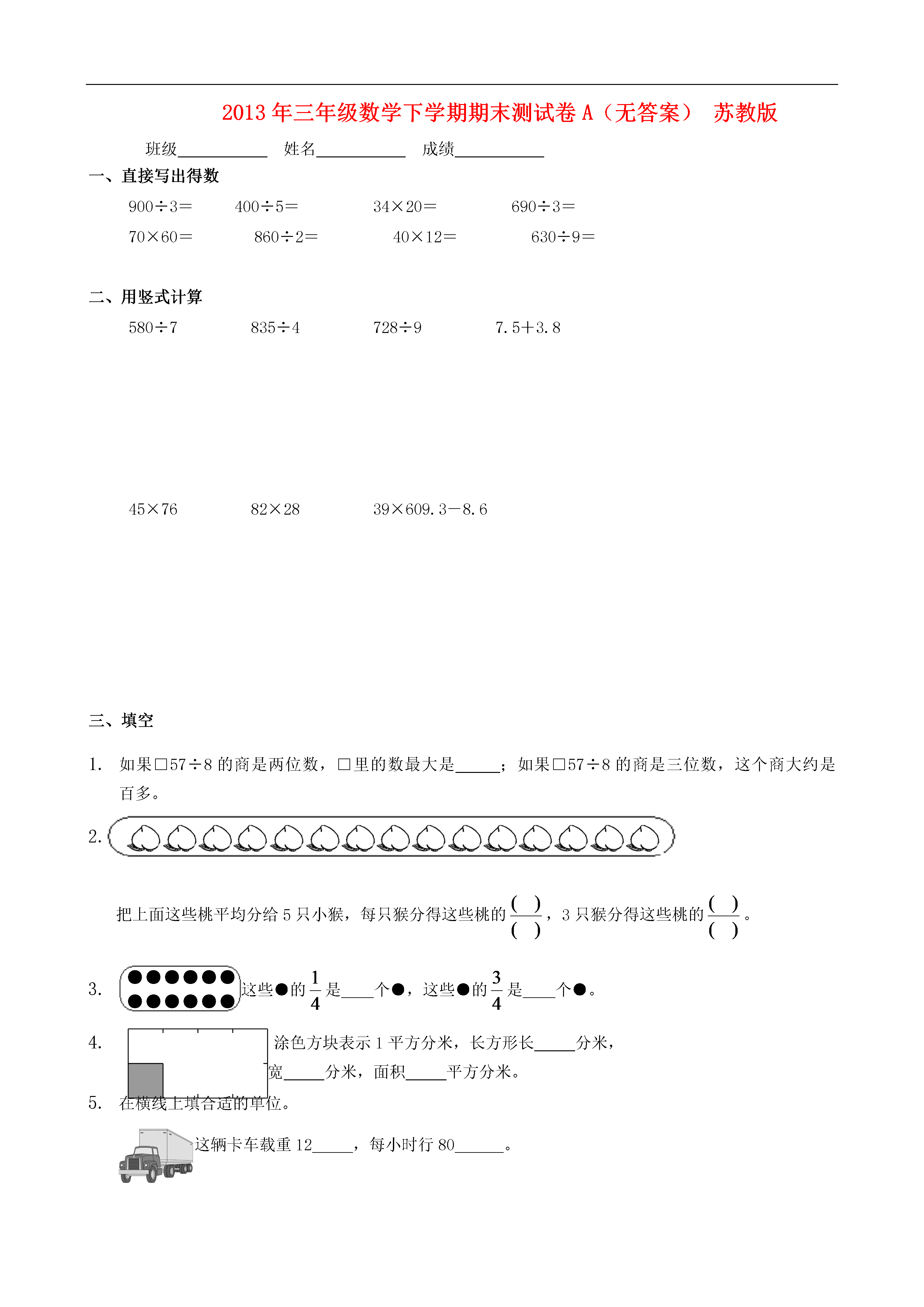 2013年三年级数学下学期期末测试卷A(无答案)苏教版班级姓名成绩一、直接写出得数900÷3=400÷5=34×20=690÷3=70×60=860÷2=40×12=630÷9=二、用竖式计算580÷7835÷4728÷97.5+3.845×7682×2839×609.3-8.6三、填空如果□57÷8的商是两位数,□里的数最大是;如果□57÷8的商是三位数,这个商大约是百多。把上面这些桃平均分给5只小猴,每只猴分得这些桃的,3只猴分得这些桃的。●●●●●●●●●●●●这些●的是个●,这些●的是个●。涂色方块表示1平方分米,长方形长分米,宽分米,面积平方分米。在横线上填合适的单位。这辆卡车载重12,每小时行80。这本书封面的面积大约2,重大约200。6.元写成小数是元,0.7写成分数是。7.在○里填“>”或“<”。48×39○200062×60○36008.在1.1、1.9和2.2这三个数中,最接近整数1的数是,最接近整数2的数是。9.今年全年有天,上半年比下半年少天。10.民生公司员工的月平均工资是3100元,李娟是这个公司的员工,她的月工资不可能低于3000元。这样的判断合理吗?四、选择正确答案,在它右边的□里画“√”1.一年中,哪两个季度的天数一定相等?第一、二季度□第二、三季度□第三、四季度□2.1吨棉花和1000千克石子,哪个重一些?1吨棉花重□1000千克石子重□同样重□3.一个茶杯最多盛果汁600克,下面哪个杯里的果汁重200克?□□□4.从侧面观察下面的物体,看到的是什么形状?□□□5.一盘水果,小明吃了它的,小亮也吃了它的,这盘水果还剩多少?还剩□还剩□没有剩下的□6.第一小组原来有6名学生,平均体重36千克。现在增加1名学生,体重41千克。第一小组学生现在的平均体重是多少?比36千克多一些□比36千克少一些□仍然是36千克□7.买1枝价钱是4.5元的圆珠笔,下面哪种付钱的方法是适当的?付8枚5角□付1张5元□付1张5元和1张1元□8.下面哪个图案可以看成轴对称图形?□□□9.右边两个图形的面积,哪个大一些?长方形大□正方形大□同样大□10.下面是小军、小林和小东跑50米的成绩,谁跑得最快?小军小林小东8.2秒9秒8.5秒小军□小林□小东□五、画图1.把三角形向上平移4格。2.画出右边图形的另一半,使它成为一个轴对称图形。六、解决实际问题王大伯在一块边长15米的正方形地里种白菜,每平方米种4棵。这块地里一共要种白菜多少棵?朝阳小学的教学楼有4层,每层8个班。学校把384盆鲜花分给各班,平均每班分到多少盆?红梅小学740名学生和几位老师一起乘15辆同样的客车去春游。每辆车有50个座位,每个座位坐1人,正好全部坐满。参加春游的老师有多少位?几种文具的价格如下表。物品文具盒圆规三角尺钢笔价格6.8元3.8元2.7元4.6元(1)红红买1个圆规和1个文具盒,一共需要多少元?(2)林林买1枝钢笔和1副三角尺,一共需要多少元?(3)红红用的钱比林林多多少元?下面是四名学生本学期阅读课外书籍的统计图。(1)在图中的()里填合适的数。(2)平均每人看课外书多少本?(3)看书本数少于平均数的有几个人?