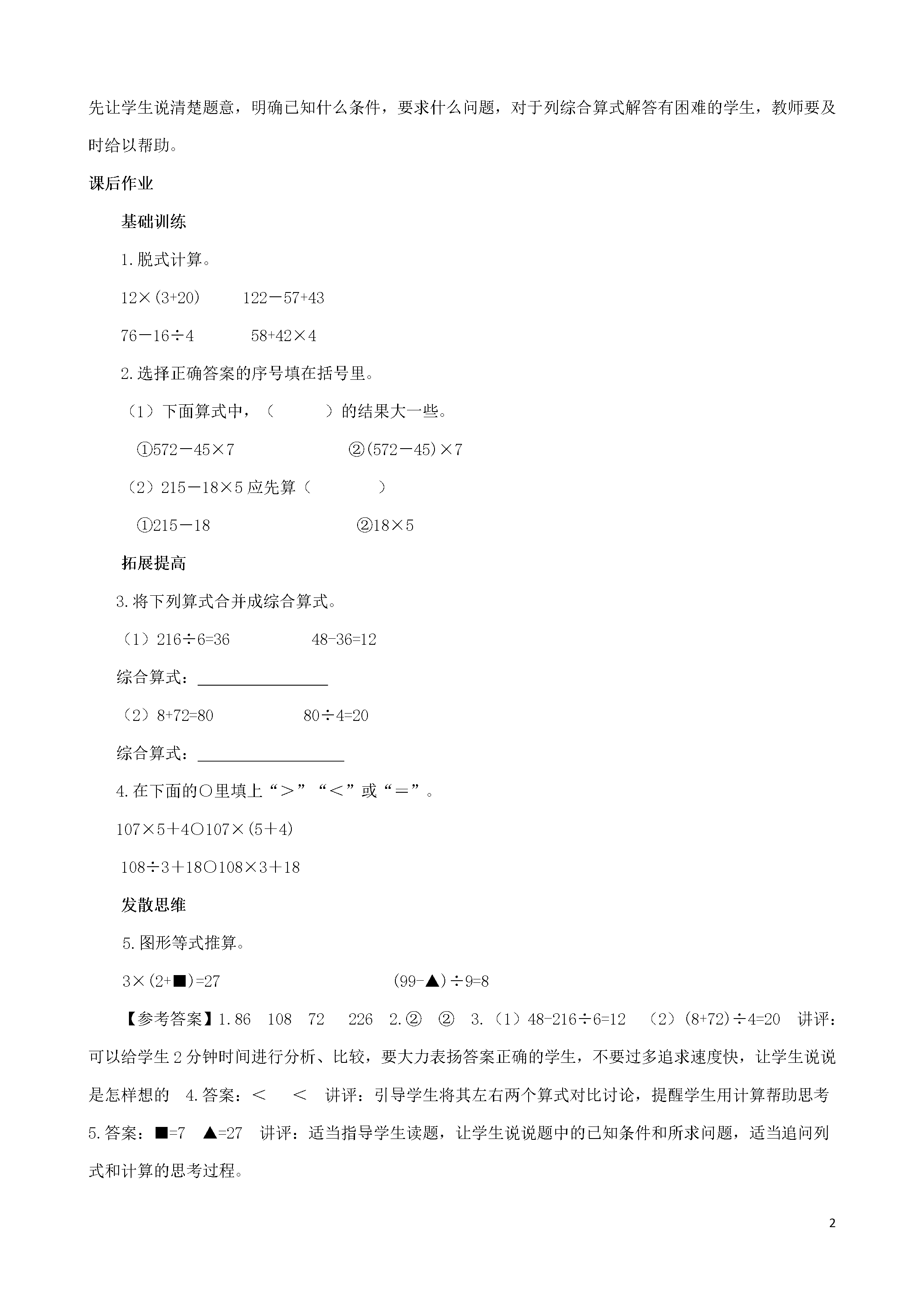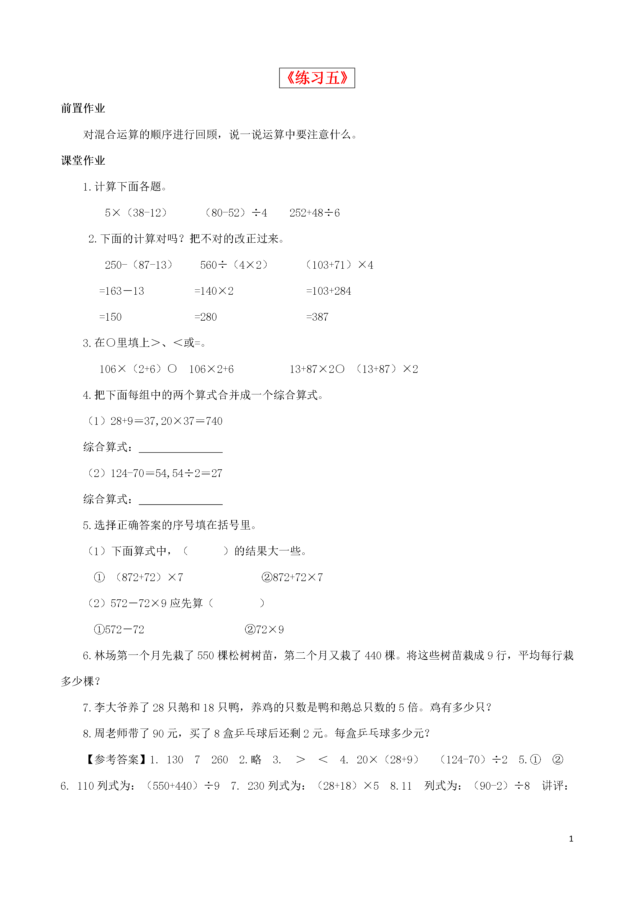 2《练习五》前置作业对混合运算的顺序进行回顾,说一说运算中要注意什么。课堂作业1.计算下面各题。5×(38-12)(80-52)÷4252+48÷62.下面的计算对吗?把不对的改正过来。250-(87-13)560÷(4×2)(103+71)×4=163-13=140×2=103+284=150=280=3873.在○里填上>、<或=。106×(2+6)○106×2+613+87×2○(13+87)×24.把下面每组中的两个算式合并成一个综合算式。(1)28+9=37,20×37=740综合算式:(2)124-70=54,54÷2=27综合算式:5.选择正确答案的序号填在括号里。(1)下面算式中,()的结果大一些。①(872+72)×7②872+72×7(2)572-72×9应先算()①572-72②72×96.林场第一个月先栽了550棵松树树苗,第二个月又栽了440棵。将这些树苗栽成9行,平均每行栽多少棵?7.李大爷养了28只鹅和18只鸭,养鸡的只数是鸭和鹅总只数的5倍。鸡有多少只?8.周老师带了90元,买了8盒乒乓球后还剩2元。每盒乒乓球多少元?【参考答案】1.13072602.略3.><4.20×(28+9)(124-70)÷25.①②6.110列式为:(550+440)÷97.230列式为:(28+18)×58.11列式为:(90-2)÷8讲评:先让学生说清楚题意,明确已知什么条件,要求什么问题,对于列综合算式解答有困难的学生,教师要及时给以帮助。课后作业基础训练1.脱式计算。12×(3+20)122-57+4376-16÷458+42×42.选择正确答案的序号填在括号里。(1)下面算式中,()的结果大一些。①572-45×7②(572-45)×7(2)215-18×5应先算()①215-18②18×5拓展提高3.将下列算式合并成综合算式。(1)216÷6=3648-36=12综合算式:(2)8+72=8080÷4=20综合算式:4.在下面的○里填上“>”“<”或“=”。107×5+4○107×(5+4)108÷3+18○108×3+18发散思维5.图形等式推算。3×(2+■)=27(99-▲)÷9=8【参考答案】1.86108722262.②②3.(1)48-216÷6=12(2)(8+72)÷4=20讲评:可以给学生2分钟时间进行分析、比较,要大力表扬答案正确的学生,不要过多追求速度快,让学生说说是怎样想的4.答案:<<讲评:引导学生将其左右两个算式对比讨论,提醒学生用计算帮助思考5.答案:■=7▲=27讲评:适当指导学生读题,让学生说说题中的已知条件和所求问题,适当追问列式和计算的思考过程。