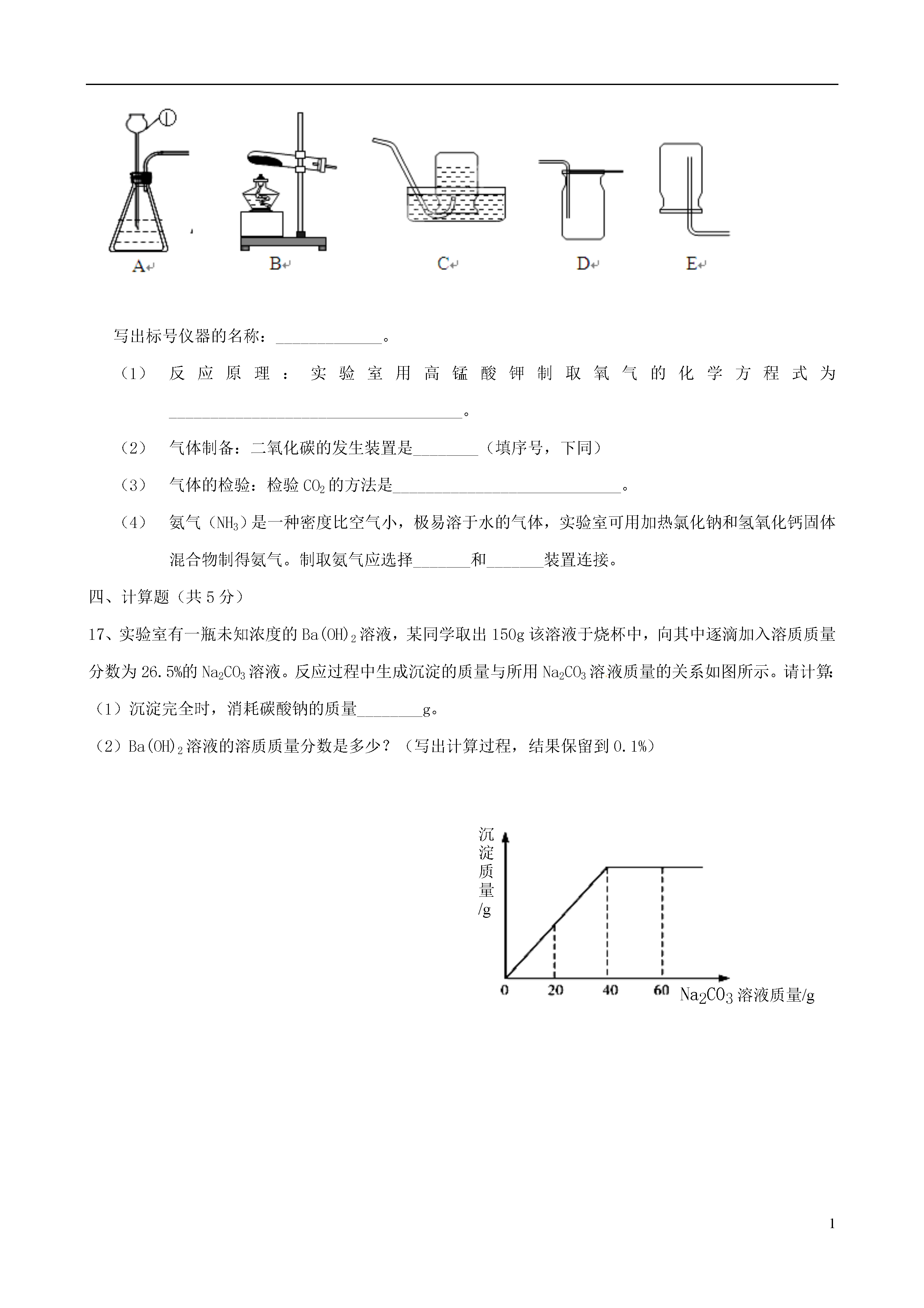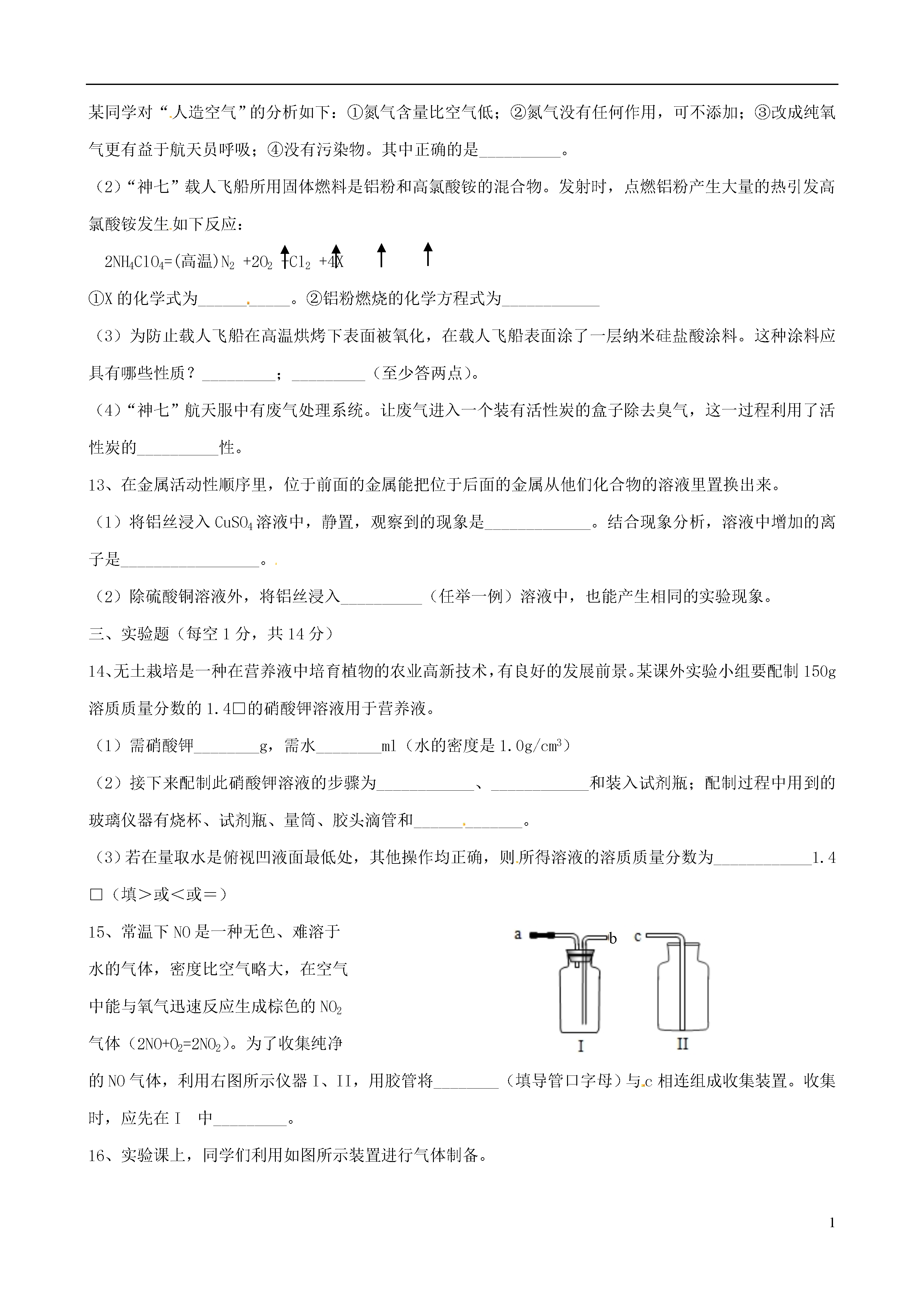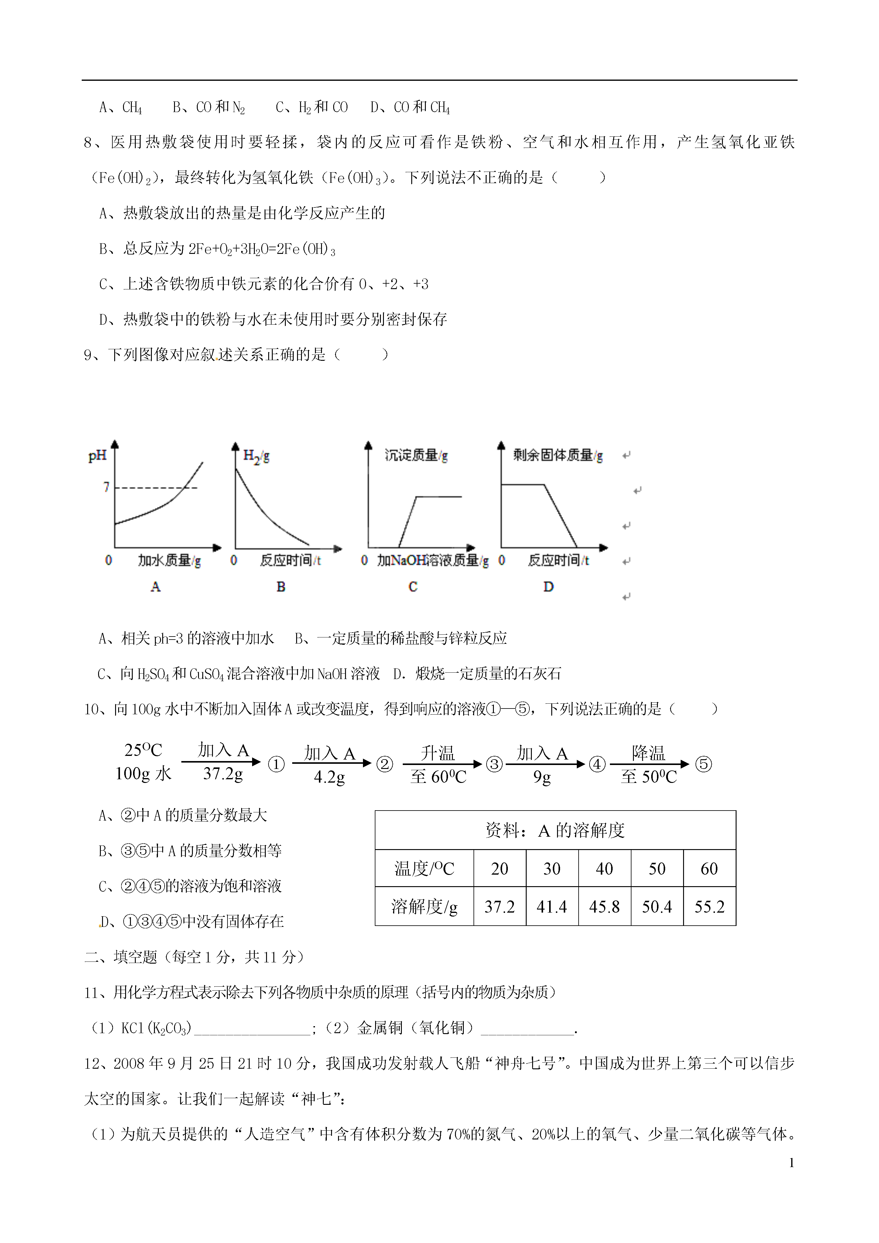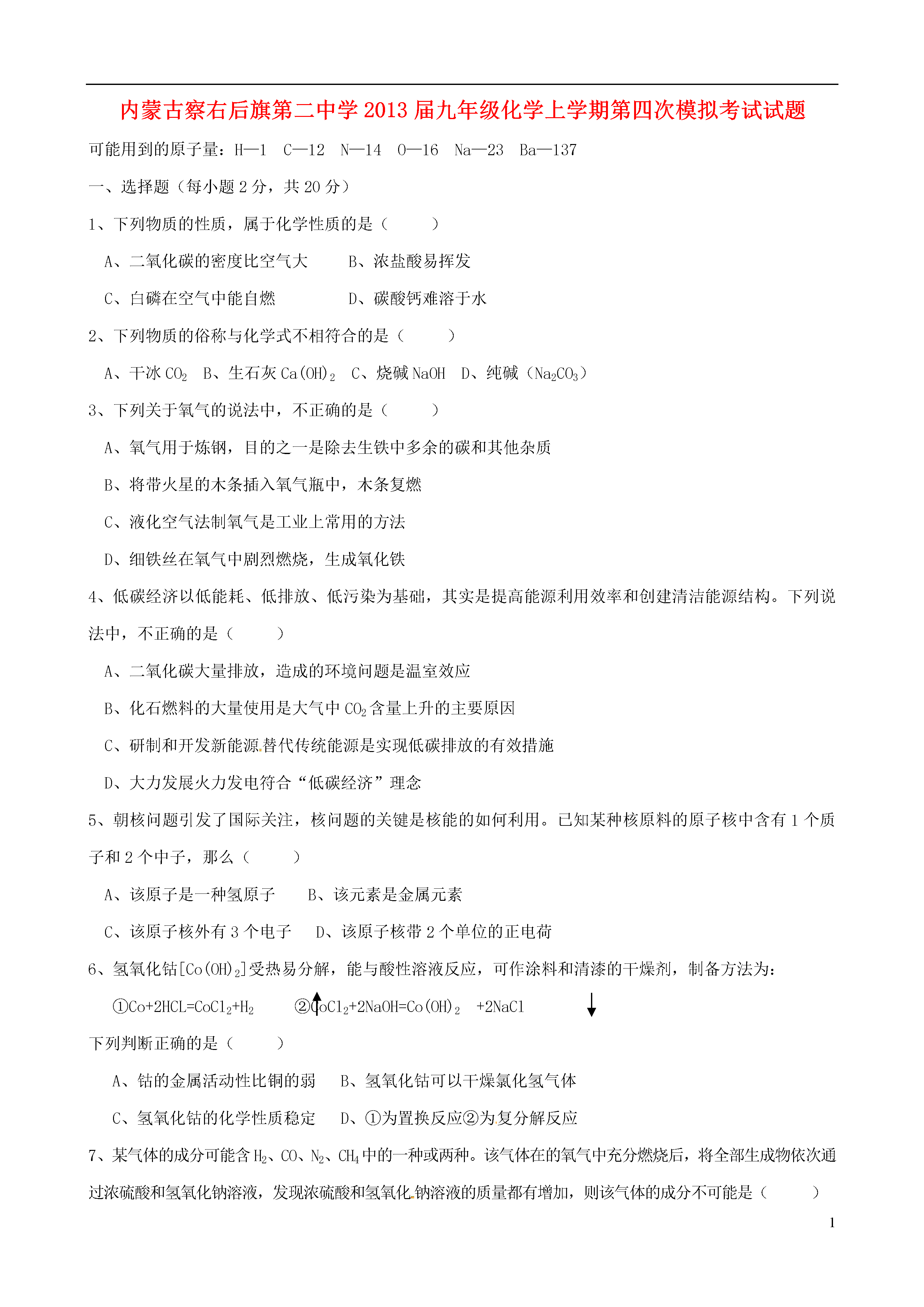 1内蒙古察右后旗第二中学2013届九年级化学上学期第四次模拟考试试题可能用到的原子量:H—1C—12N—14O—16Na—23Ba—137一、选择题(每小题2分,共20分)1、下列物质的性质,属于化学性质的是()A、二氧化碳的密度比空气大B、浓盐酸易挥发C、白磷在空气中能自燃D、碳酸钙难溶于水2、下列物质的俗称与化学式不相符合的是()A、干冰CO2B、生石灰Ca(OH)2C、烧碱NaOHD、纯碱(Na2CO3)3、下列关于氧气的说法中,不正确的是()A、氧气用于炼钢,目的之一是除去生铁中多余的碳和其他杂质B、将带火星的木条插入氧气瓶中,木条复燃C、液化空气法制氧气是工业上常用的方法D、细铁丝在氧气中剧烈燃烧,生成氧化铁4、低碳经济以低能耗、低排放、低污染为基础,其实是提高能源利用效率和创建清洁能源结构。下列说法中,不正确的是()A、二氧化碳大量排放,造成的环境问题是温室效应B、化石燃料的大量使用是大气中CO2含量上升的主要原因C、研制和开发新能源替代传统能源是实现低碳排放的有效措施D、大力发展火力发电符合“低碳经济”理念5、朝核问题引发了国际关注,核问题的关键是核能的如何利用。已知某种核原料的原子核中含有1个质子和2个中子,那么()A、该原子是一种氢原子B、该元素是金属元素C、该原子核外有3个电子D、该原子核带2个单位的正电荷6、氢氧化钴[Co(OH)2]受热易分解,能与酸性溶液反应,可作涂料和清漆的干燥剂,制备方法为:①Co+2HCL=CoCl2+H2②CoCl2+2NaOH=Co(OH)2+2NaCl下列判断正确的是()A、钴的金属活动性比铜的弱B、氢氧化钴可以干燥氯化氢气体C、氢氧化钴的化学性质稳定D、①为置换反应②为复分解反应7、某气体的成分可能含H2、CO、N2、CH4中的一种或两种。该气体在的氧气中充分燃烧后,将全部生成物依次通过浓硫酸和氢氧化钠溶液,发现浓硫酸和氢氧化钠溶液的质量都有增加,则该气体的成分不可能是()A、CH4B、CO和N2C、H2和COD、CO和CH48、医用热敷袋使用时要轻揉,袋内的反应可看作是铁粉、空气和水相互作用,产生氢氧化亚铁(Fe(OH)2),最终转化为氢氧化铁(Fe(OH)3)。下列说法不正确的是()A、热敷袋放出的热量是由化学反应产生的B、总反应为2Fe+O2+3H2O=2Fe(OH)3C、上述含铁物质中铁元素的化合价有0、+2、+3D、热敷袋中的铁粉与水在未使用时要分别密封保存9、下列图像对应叙述关系正确的是()A、相关ph=3的溶液中加水B、一定质量的稀盐酸与锌粒反应C、向H2SO4和CuSO4混合溶液中加NaOH溶液D.煅烧一定质量的石灰石10、向100g水中不断加入固体A或改变温度,得到响应的溶液①—⑤,下列说法正确的是()25OC100g水加入A37.2g①加入A4.2g升温至600C②③加入A9g④降温至500C⑤资料:A的溶解度温度/OC2030405060溶解度/g37.241.445.850.455.2A、②中A的质量分数最大B、③⑤中A的质量分数相等C、②④⑤的溶液为饱和溶液D、①③④⑤中没有固体存在二、填空题(每空1分,共11分)11、用化学方程式表示除去下列各物质中杂质的原理(括号内的物质为杂质)(1)KCl(K2CO3)_______________;(2)金属铜(氧化铜)____________.12、2008年9月25日21时10分,我国成功发射载人飞船“神舟七号”。中国成为世界上第三个可以信步太空的国家。让我们一起解读“神七”:(1)为航天员提供的“人造空气”中含有体积分数为70%的氮气、20%以上的氧气、少量二氧化碳等气体。某同学对“人造空气”的分析如下:①氮气含量比空气低;②氮气没有任何作用,可不添加;③改成纯氧气更有益于航天员呼吸;④没有污染物。其中正确的是__________。(2)“神七”载人飞船所用固体燃料是铝粉和高氯酸铵的混合物。发射时,点燃铝粉产生大量的热引发高氯酸铵发生如下反应:2NH4ClO4=(高温)N2+2O2+Cl2+4X①X的化学式为___________。②铝粉燃烧的化学方程式为____________(3)为防止载人飞船在高温烘烤下表面被氧化,在载人飞船表面涂了一层纳米硅盐酸涂料。这种涂料应具有哪些性质?_________;_________(至少答两点)。(4)“神七”航天服中有废气处理系统。让废气进入一个装有活性炭的盒子除去臭气,这一过程利用了活性炭的__________性。13、在金属活动性顺序里,位于前面的金属能把位于后面的金属从他们化合物的溶