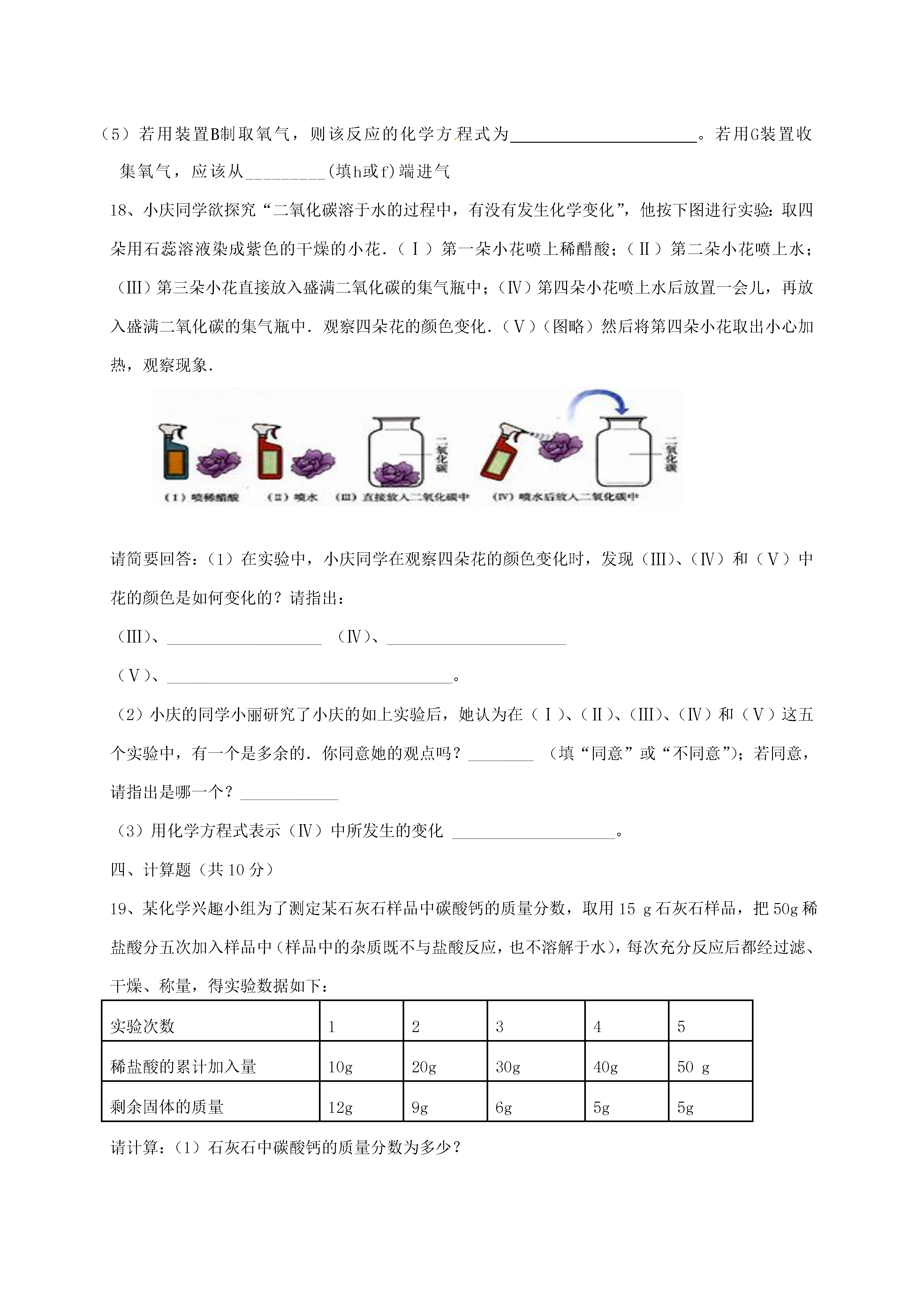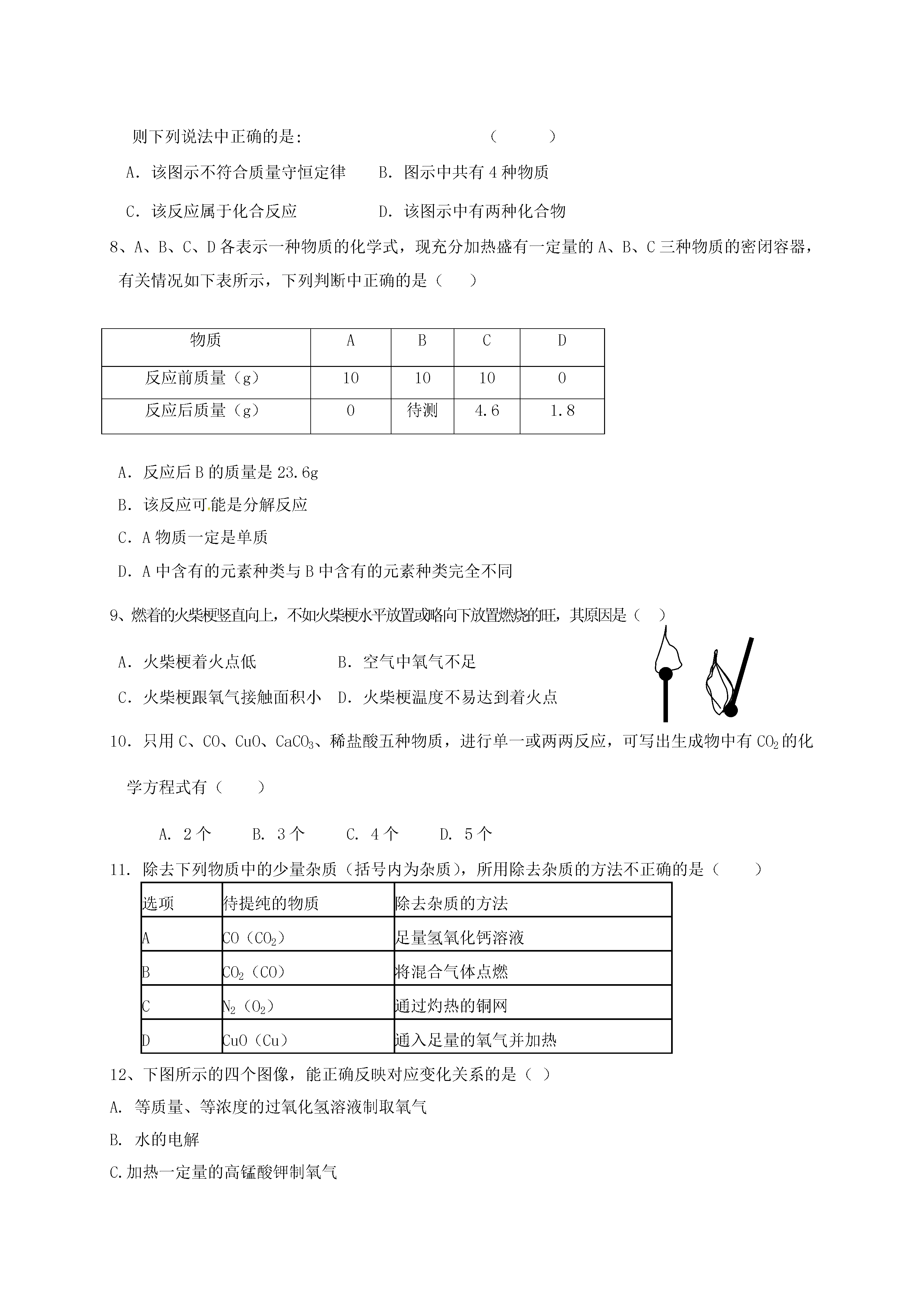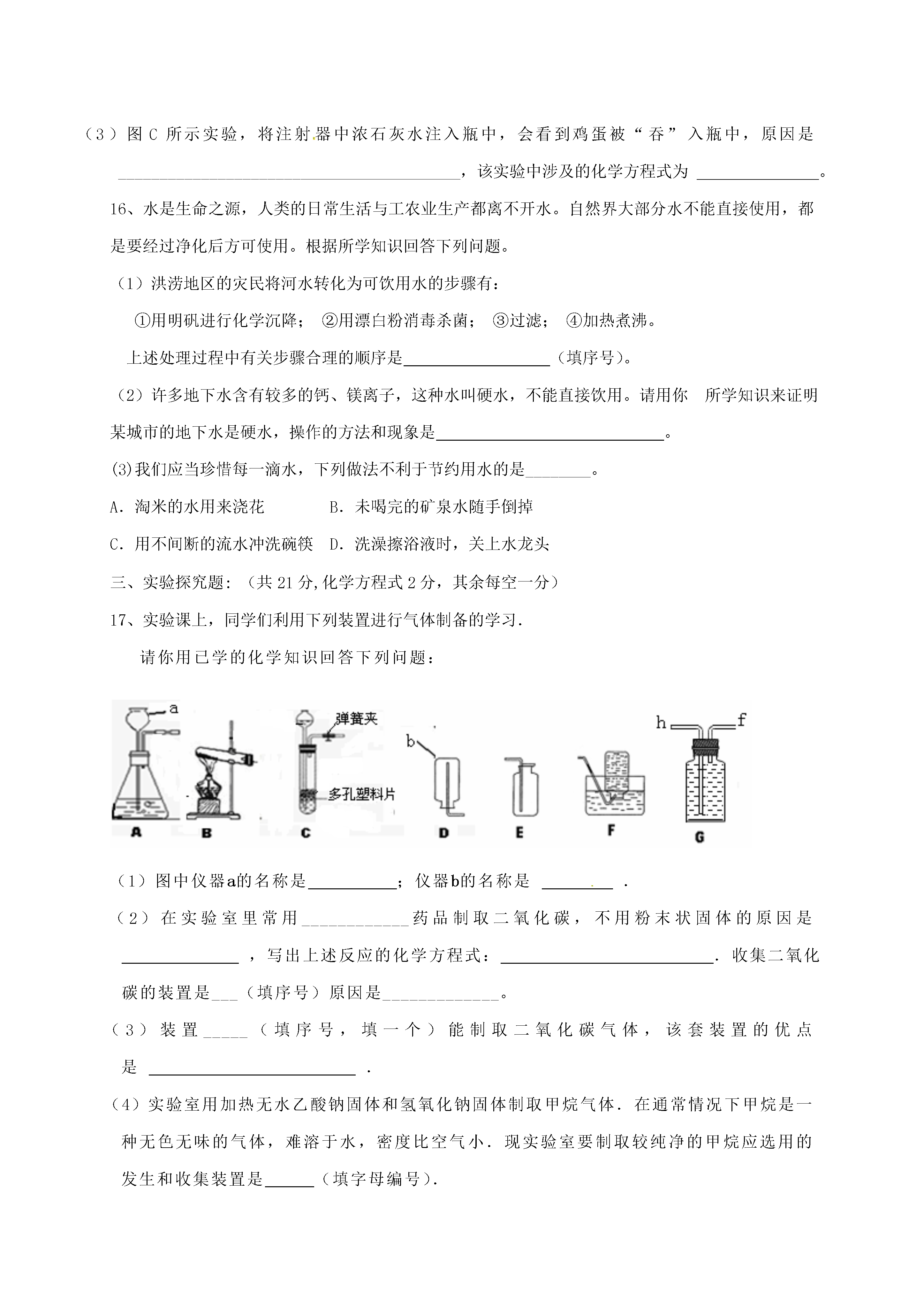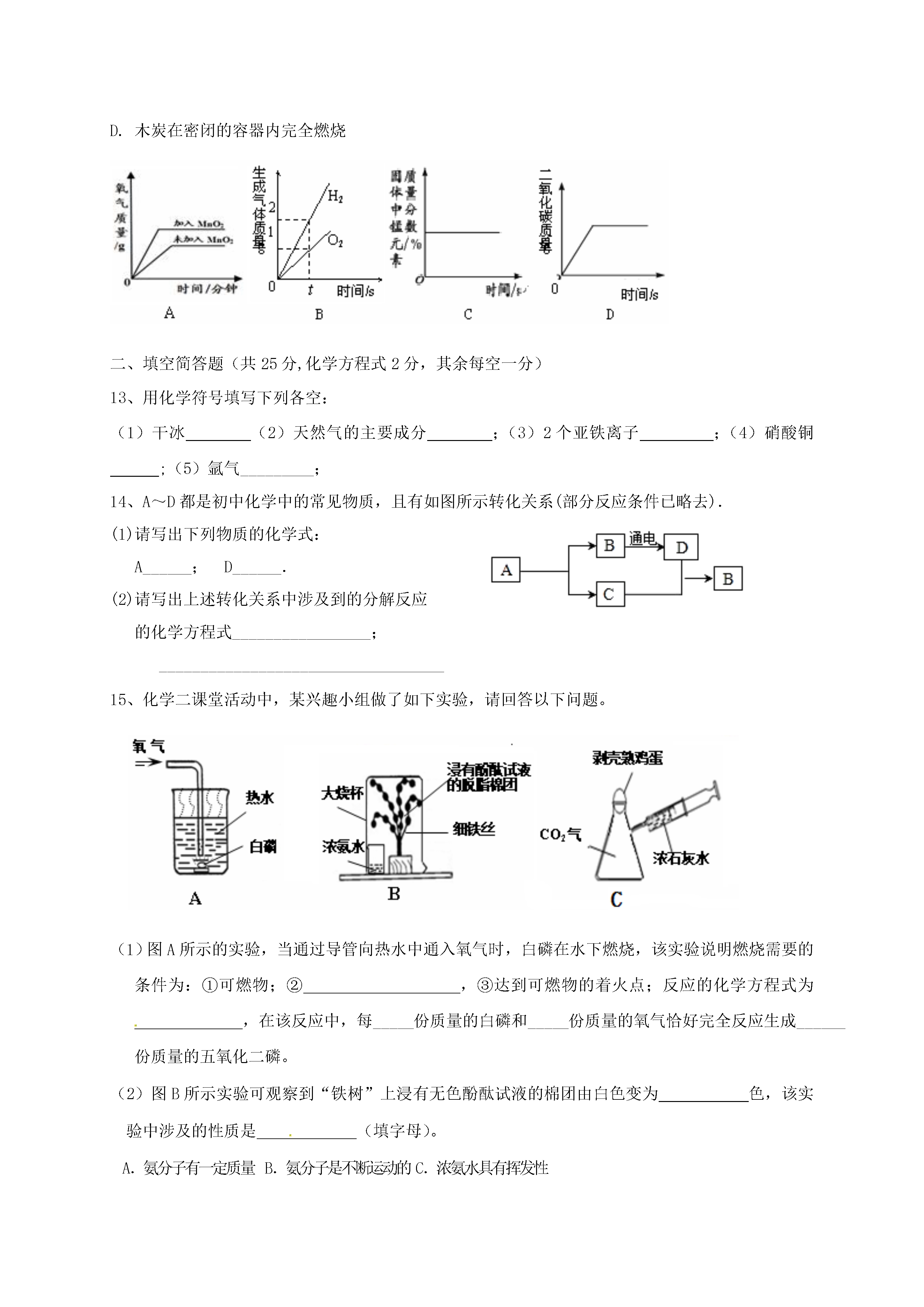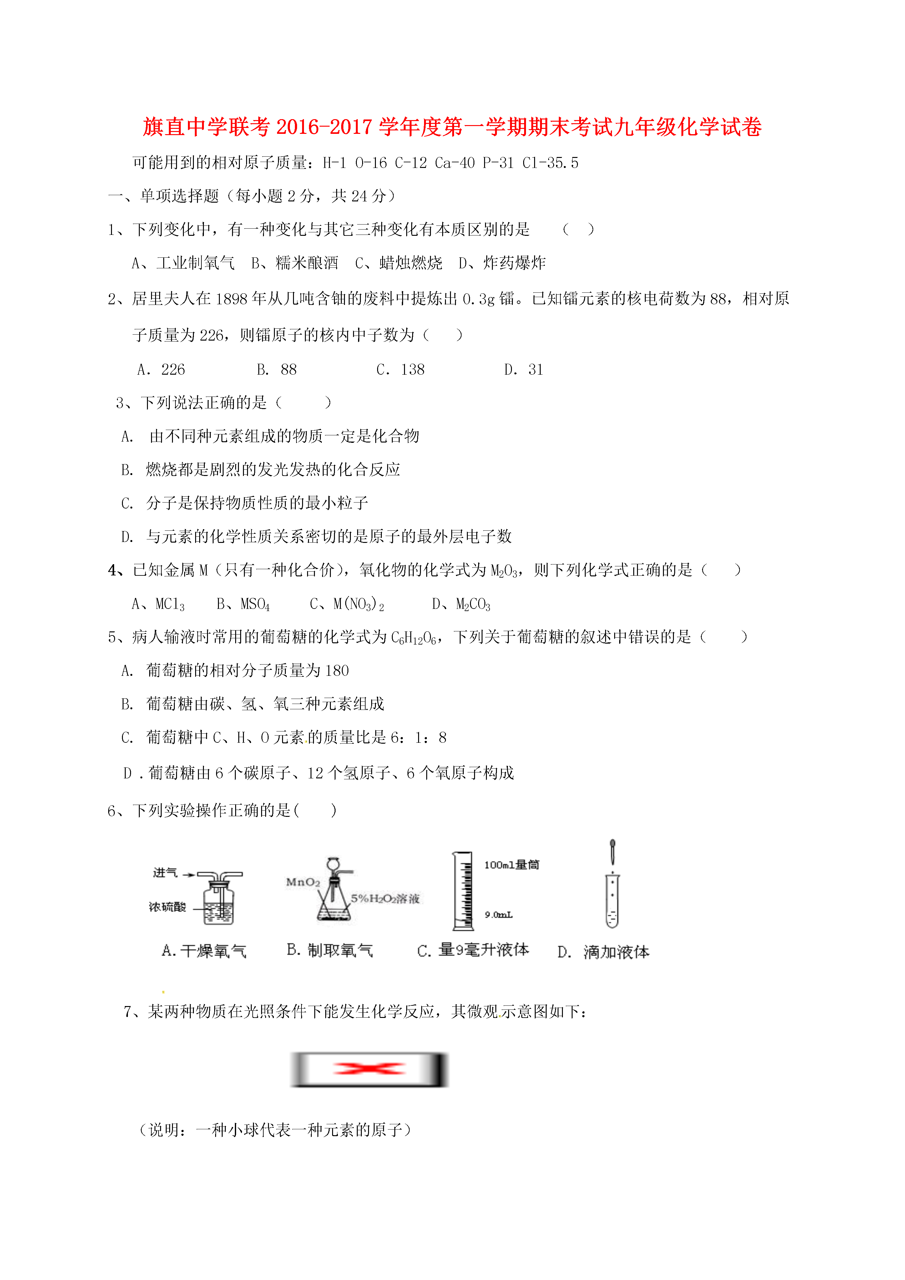 旗直中学联考2016-2017学年度第一学期期末考试九年级化学试卷可能用到的相对原子质量:H-1O-16C-12Ca-40P-31Cl-35.5一、单项选择题(每小题2分,共24分)1、下列变化中,有一种变化与其它三种变化有本质区别的是()A、工业制氧气B、糯米酿酒C、蜡烛燃烧D、炸药爆炸2、居里夫人在1898年从几吨含铀的废料中提炼出0.3g镭。已知镭元素的核电荷数为88,相对原子质量为226,则镭原子的核内中子数为()A.226B.88C.138D.313、下列说法正确的是()由不同种元素组成的物质一定是化合物B.燃烧都是剧烈的发光发热的化合反应C.分子是保持物质性质的最小粒子D.与元素的化学性质关系密切的是原子的最外层电子数4、已知金属M(只有一种化合价),氧化物的化学式为M2O3,则下列化学式正确的是()A、MCl3B、MSO4C、M(NO3)2D、M2CO35、病人输液时常用的葡萄糖的化学式为C6H12O6,下列关于葡萄糖的叙述中错误的是()A.葡萄糖的相对分子质量为180B.葡萄糖由碳、氢、氧三种元素组成C.葡萄糖中C、H、O元素的质量比是6:1:8D.葡萄糖由6个碳原子、12个氢原子、6个氧原子构成6、下列实验操作正确的是()7、某两种物质在光照条件下能发生化学反应,其微观示意图如下:(说明:一种小球代表一种元素的原子)则下列说法中正确的是:()A.该图示不符合质量守恒定律B.图示中共有4种物质C.该反应属于化合反应D.该图示中有两种化合物8、A、B、C、D各表示一种物质的化学式,现充分加热盛有一定量的A、B、C三种物质的密闭容器,有关情况如下表所示,下列判断中正确的是()物质ABCD反应前质量(g)1010100反应后质量(g)0待测4.61.8A.反应后B的质量是23.6gB.该反应可能是分解反应C.A物质一定是单质D.A中含有的元素种类与B中含有的元素种类完全不同9、燃着的火柴梗竖直向上,不如火柴梗水平放置或略向下放置燃烧的旺,其原因是()A.火柴梗着火点低B.空气中氧气不足C.火柴梗跟氧气接触面积小D.火柴梗温度不易达到着火点10.只用C、CO、CuO、CaCO3、稀盐酸五种物质,进行单一或两两反应,可写出生成物中有CO2的化学方程式有()A.2个B.3个C.4个D.5个11.除去下列物质中的少量杂质(括号内为杂质),所用除去杂质的方法不正确的是()选项待提纯的物质除去杂质的方法ACO(CO2)足量氢氧化钙溶液BCO2(CO)将混合气体点燃CN2(O2)通过灼热的铜网DCuO(Cu)通入足量的氧气并加热12、下图所示的四个图像,能正确反映对应变化关系的是()A.等质量、等浓度的过氧化氢溶液制取氧气B.水的电解C.加热一定量的高锰酸钾制氧气D.木炭在密闭的容器内完全燃烧二、填空简答题(共25分,化学方程式2分,其余每空一分)13、用化学符号填写下列各空:(1)干冰(2)天然气的主要成分;(3)2个亚铁离子;(4)硝酸铜;(5)氩气_________;14、A~D都是初中化学中的常见物质,且有如图所示转化关系(部分反应条件已略去).(1)请写出下列物质的化学式:A______;D______.(2)请写出上述转化关系中涉及到的分解反应的化学方程式_________________;___________________________________15、化学二课堂活动中,某兴趣小组做了如下实验,请回答以下问题。(1)图A所示的实验,当通过导管向热水中通入氧气时,白磷在水下燃烧,该实验说明燃烧需要的条件为:①可燃物;②,③达到可燃物的着火点;反应的化学方程式为,在该反应中,每_____份质量的白磷和_____份质量的氧气恰好完全反应生成______份质量的五氧化二磷。(2)图B所示实验可观察到“铁树”上浸有无色酚酞试液的棉团由白色变为______色,该实验中涉及的性质是(填字母)。A.氨分子有一定质量B.氨分子是不断运动的C.浓氨水具有挥发性(3)图C所示实验,将注射器中浓石灰水注入瓶中,会看到鸡蛋被“吞”入瓶中,原因是__________________________________________,该实验中涉及的化学方程式为。16、水是生命之源,人类的日常生活与工农业生产都离不开水。自然界大部分水不能直接使用,都是要经过净化后方可使用。根据所学知识回答下列问题。(1)洪涝地区的灾民将河水转化为可饮用水的步骤有:①用明矾进行化学沉降;②用漂白粉消毒杀菌;③过滤;④加热煮沸。上述处理过程中有关步骤合理的顺序是(