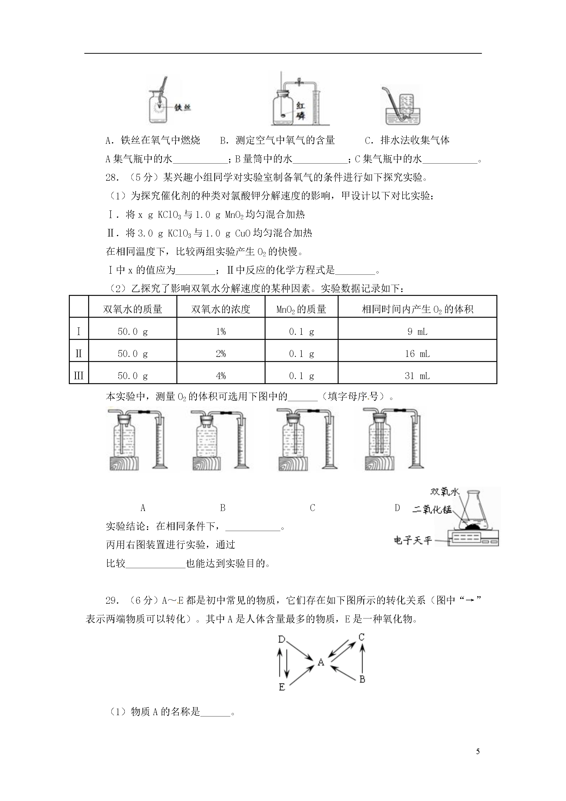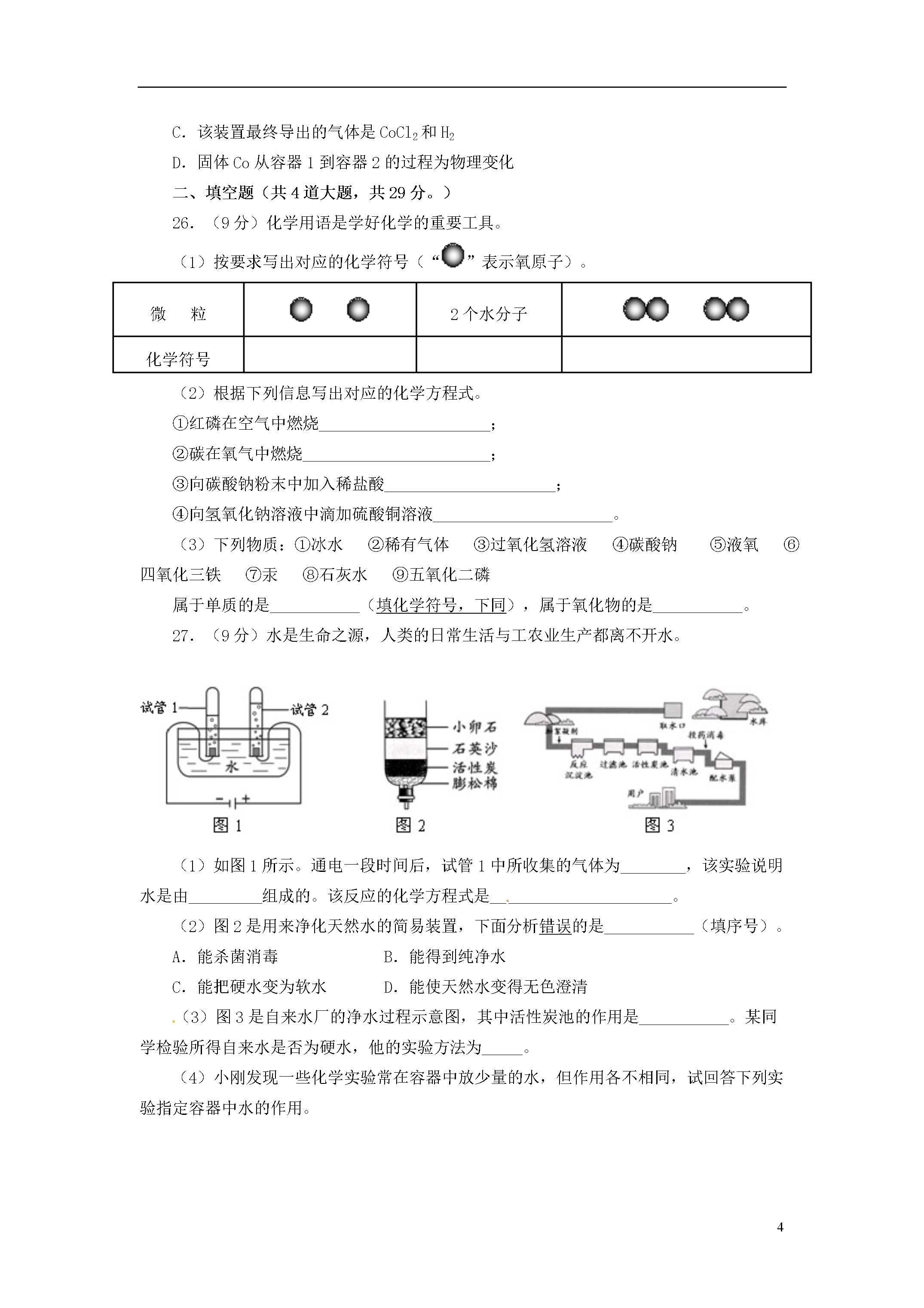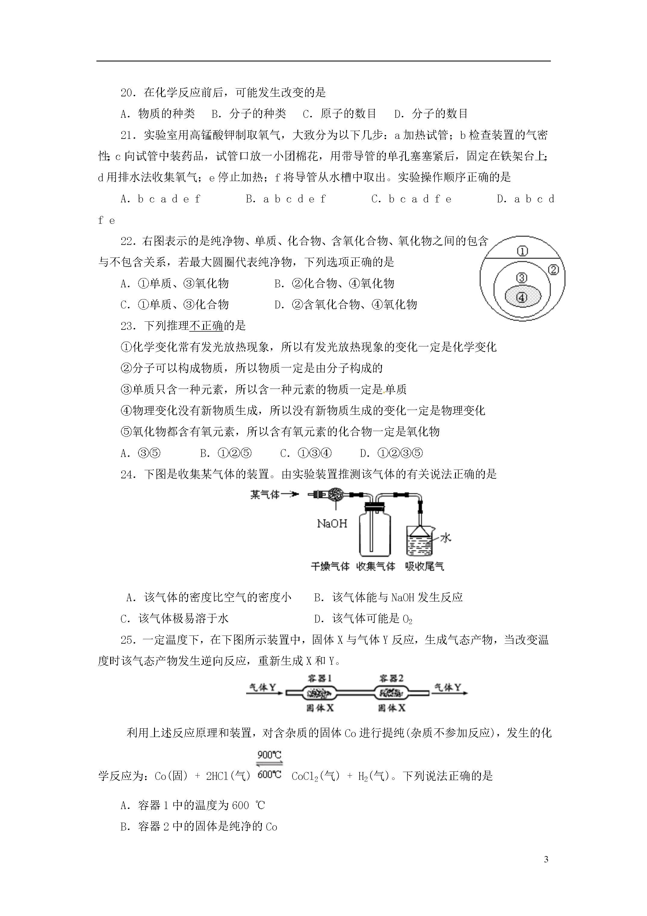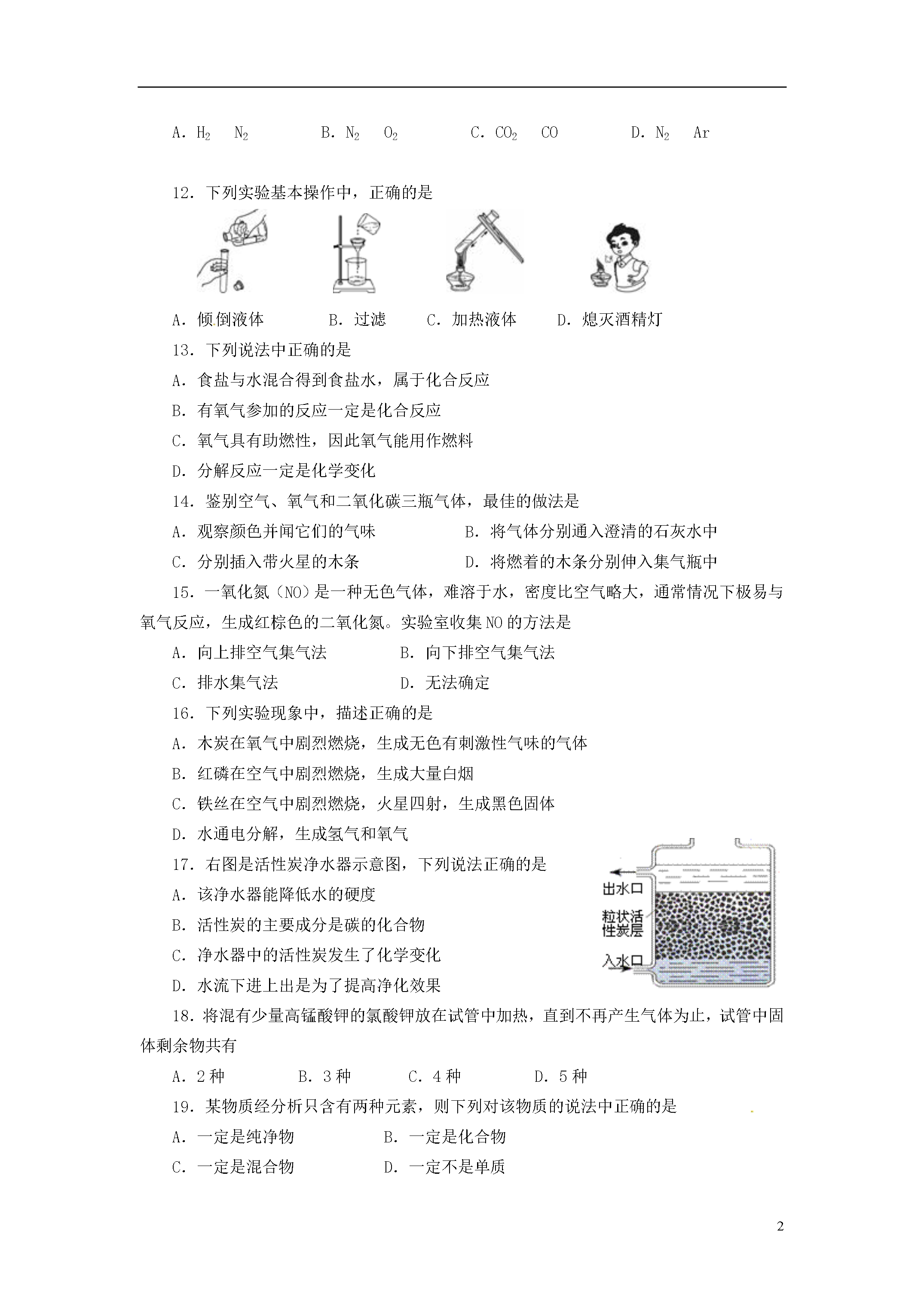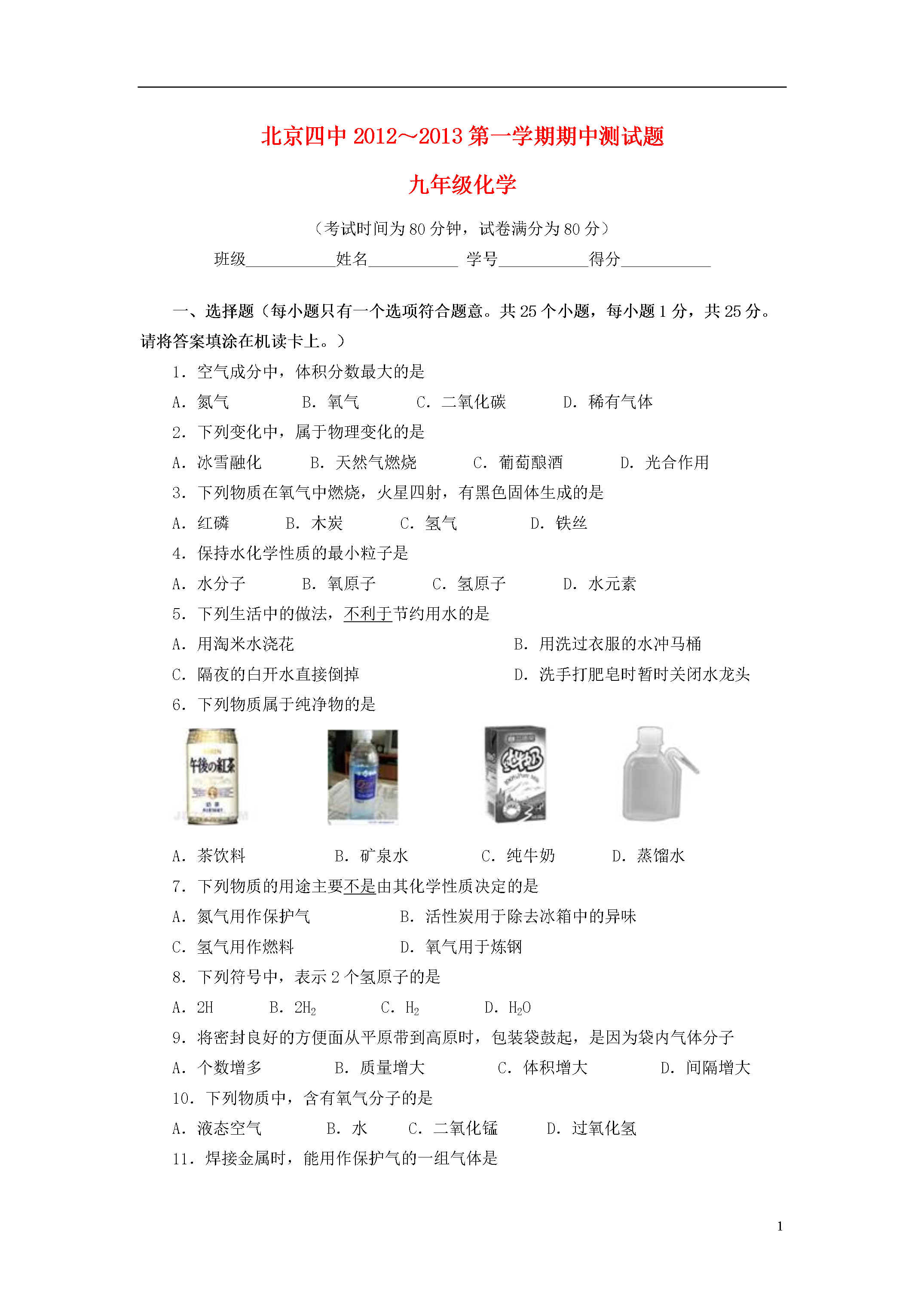 11北京四中2012~2013第一学期期中测试题九年级化学(考试时间为80分钟,试卷满分为80分)班级___________姓名___________学号___________得分___________一、选择题(每小题只有一个选项符合题意。共25个小题,每小题1分,共25分。请将答案填涂在机读卡上。)1.空气成分中,体积分数最大的是A.氮气B.氧气C.二氧化碳D.稀有气体2.下列变化中,属于物理变化的是A.冰雪融化B.天然气燃烧C.葡萄酿酒D.光合作用3.下列物质在氧气中燃烧,火星四射,有黑色固体生成的是A.红磷B.木炭C.氢气D.铁丝4.保持水化学性质的最小粒子是A.水分子B.氧原子C.氢原子D.水元素5.下列生活中的做法,不利于节约用水的是A.用淘米水浇花B.用洗过衣服的水冲马桶C.隔夜的白开水直接倒掉D.洗手打肥皂时暂时关闭水龙头6.下列物质属于纯净物的是A.茶饮料B.矿泉水C.纯牛奶D.蒸馏水7.下列物质的用途主要不是由其化学性质决定的是A.氮气用作保护气B.活性炭用于除去冰箱中的异味C.氢气用作燃料D.氧气用于炼钢8.下列符号中,表示2个氢原子的是A.2HB.2H2C.H2D.H2O9.将密封良好的方便面从平原带到高原时,包装袋鼓起,是因为袋内气体分子A.个数增多B.质量增大C.体积增大D.间隔增大10.下列物质中,含有氧气分子的是A.液态空气B.水C.二氧化锰D.过氧化氢11.焊接金属时,能用作保护气的一组气体是A.H2N2B.N2O2C.CO2COD.N2Ar12.下列实验基本操作中,正确的是A.倾倒液体B.过滤C.加热液体D.熄灭酒精灯13.下列说法中正确的是A.食盐与水混合得到食盐水,属于化合反应B.有氧气参加的反应一定是化合反应C.氧气具有助燃性,因此氧气能用作燃料D.分解反应一定是化学变化14.鉴别空气、氧气和二氧化碳三瓶气体,最佳的做法是A.观察颜色并闻它们的气味B.将气体分别通入澄清的石灰水中C.分别插入带火星的木条D.将燃着的木条分别伸入集气瓶中15.一氧化氮(NO)是一种无色气体,难溶于水,密度比空气略大,通常情况下极易与氧气反应,生成红棕色的二氧化氮。实验室收集NO的方法是A.向上排空气集气法B.向下排空气集气法C.排水集气法D.无法确定16.下列实验现象中,描述正确的是A.木炭在氧气中剧烈燃烧,生成无色有刺激性气味的气体B.红磷在空气中剧烈燃烧,生成大量白烟C.铁丝在空气中剧烈燃烧,火星四射,生成黑色固体D.水通电分解,生成氢气和氧气17.右图是活性炭净水器示意图,下列说法正确的是A.该净水器能降低水的硬度B.活性炭的主要成分是碳的化合物C.净水器中的活性炭发生了化学变化D.水流下进上出是为了提高净化效果18.将混有少量高锰酸钾的氯酸钾放在试管中加热,直到不再产生气体为止,试管中固体剩余物共有A.2种B.3种C.4种D.5种19.某物质经分析只含有两种元素,则下列对该物质的说法中正确的是A.一定是纯净物B.一定是化合物C.一定是混合物D.一定不是单质20.在化学反应前后,可能发生改变的是A.物质的种类B.分子的种类C.原子的数目D.分子的数目21.实验室用高锰酸钾制取氧气,大致分为以下几步:a加热试管;b检查装置的气密性;c向试管中装药品,试管口放一小团棉花,用带导管的单孔塞塞紧后,固定在铁架台上;d用排水法收集氧气;e停止加热;f将导管从水槽中取出。实验操作顺序正确的是A.bcadefB.abcdefC.bcadfeD.abcdfe22.右图表示的是纯净物、单质、化合物、含氧化合物、氧化物之间的包含与不包含关系,若最大圆圈代表纯净物,下列选项正确的是A.①单质、③氧化物B.②化合物、④氧化物C.①单质、③化合物D.②含氧化合物、④氧化物23.下列推理不正确的是①化学变化常有发光放热现象,所以有发光放热现象的变化一定是化学变化②分子可以构成物质,所以物质一定是由分子构成的③单质只含一种元素,所以含一种元素的物质一定是单质④物理变化没有新物质生成,所以没有新物质生成的变化一定是物理变化⑤氧化物都含有氧元素,所以含有氧元素的化合物一定是氧化物A.③⑤B.①②⑤C.①③④D.①②③⑤24.下图是收集某气体的装置。由实验装置推测该气体的有关说法正确的是A.该气体的密度比空气的密度小B.该气体能与NaOH发生反应C.该气体极易溶于水D.该气体可能是O225.一定温度下,在下图所示装置中,固体X与气体Y反应,生成气态产物,当改变温度时该气态产物发生逆向反应,重新生成X和Y。利用上述反应原理和装置,对含杂质的固体Co进行提纯(杂质不参加反应),发生的化学反应为:Co(固)+2HCl(气)CoCl2(气)+H2(气)。下列说法正确的是A.容器1中的温度为600℃B.容器2中的固体是纯净的CoC.该装置最终导