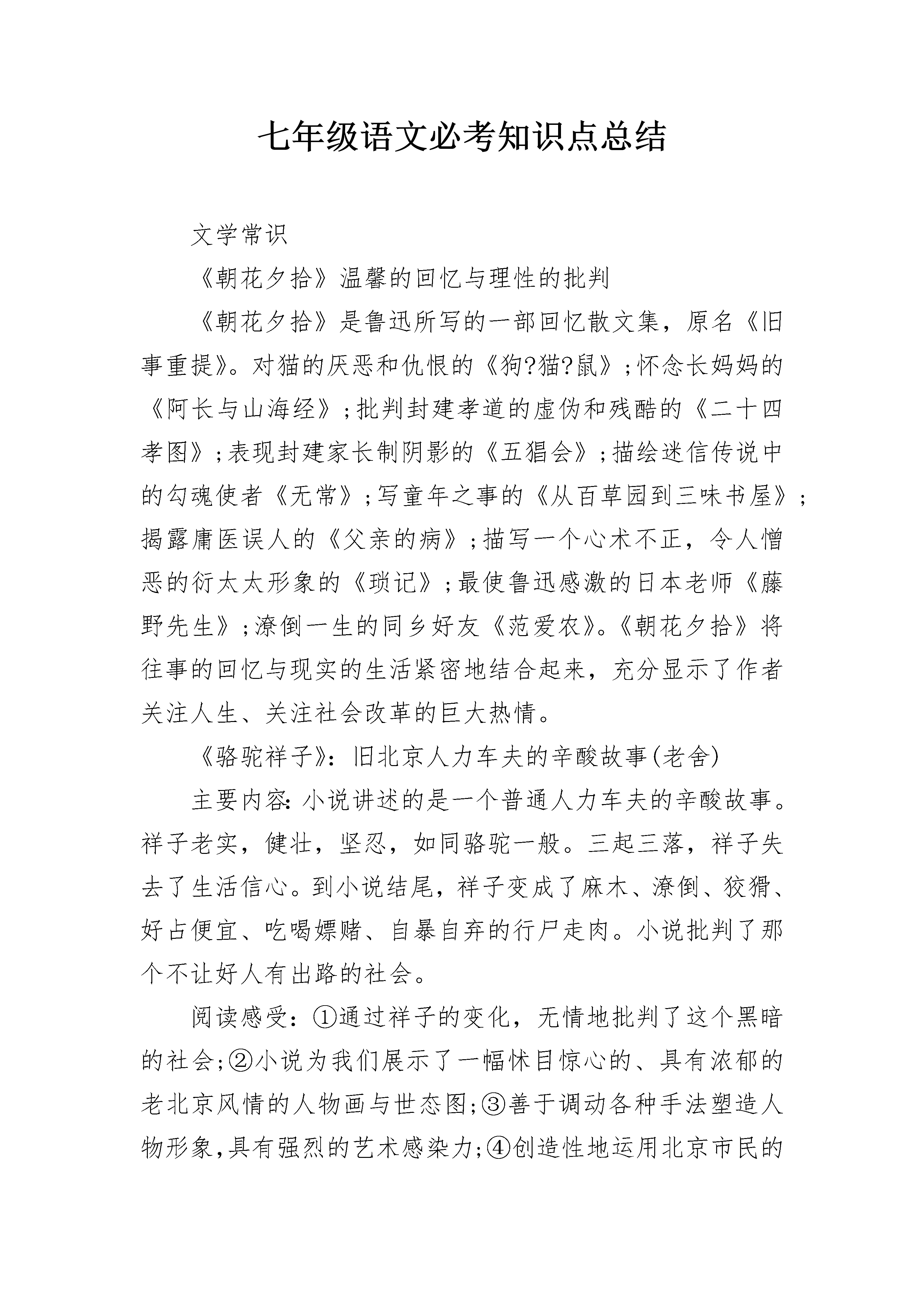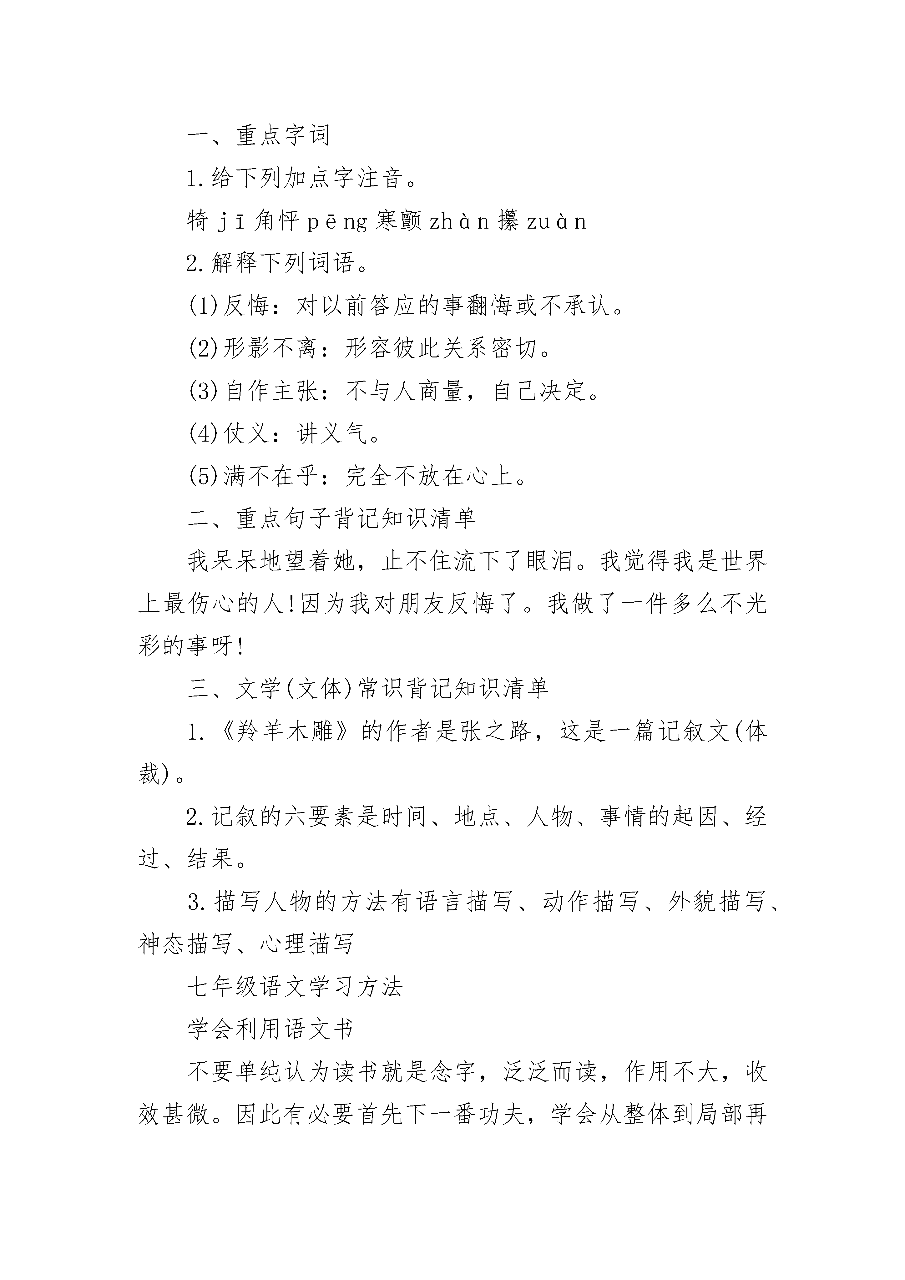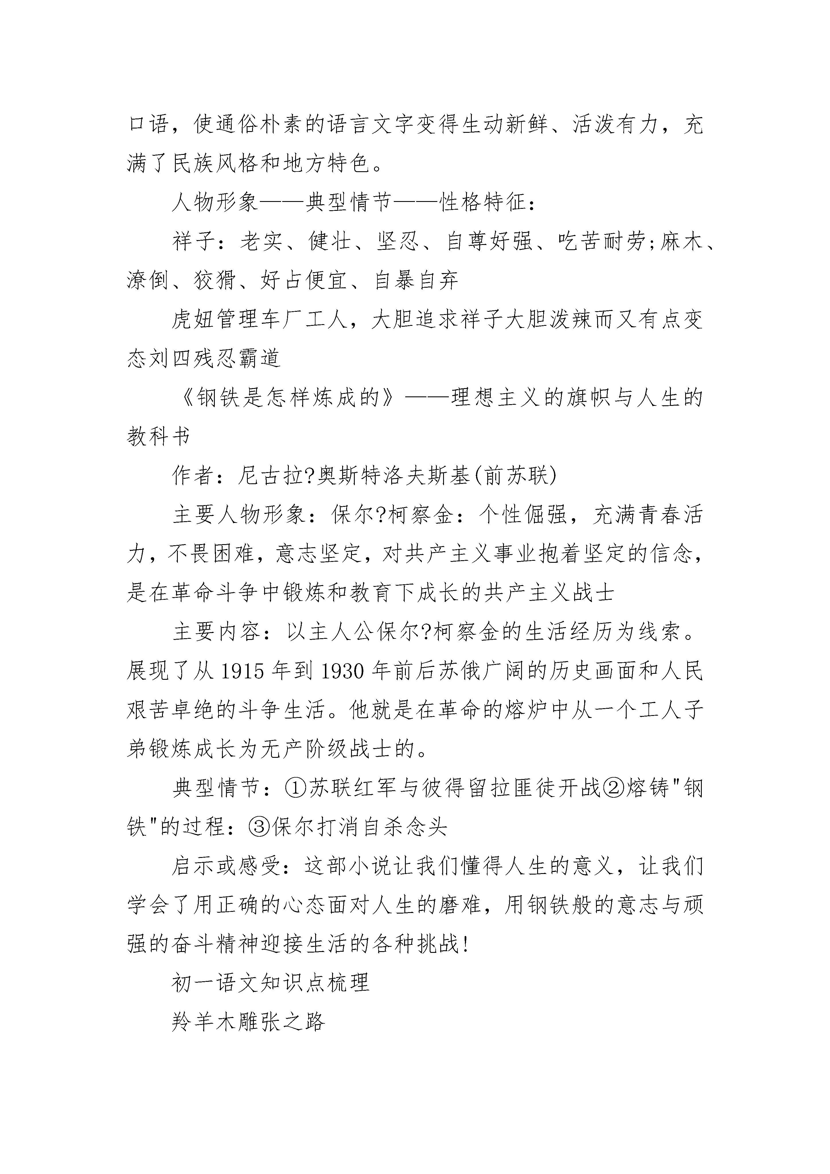 七年级语文必考知识点总结文学常识《朝花夕拾》温馨的回忆与理性的批判《朝花夕拾》是鲁迅所写的一部回忆散文集,原名《旧事重提》。对猫的厌恶和仇恨的《狗?猫?鼠》;怀念长妈妈的《阿长与山海经》;批判封建孝道的虚伪和残酷的《二十四孝图》;表现封建家长制阴影的《五猖会》;描绘迷信传说中的勾魂使者《无常》;写童年之事的《从百草园到三味书屋》;揭露庸医误人的《父亲的病》;描写一个心术不正,令人憎恶的衍太太形象的《琐记》;最使鲁迅感激的日本老师《藤野先生》;潦倒一生的同乡好友《范爱农》。《朝花夕拾》将往事的回忆与现实的生活紧密地结合起来,充分显示了作者关注人生、关注社会改革的巨大热情。《骆驼祥子》:旧北京人力车夫的辛酸故事(老舍)主要内容:小说讲述的是一个普通人力车夫的辛酸故事。祥子老实,健壮,坚忍,如同骆驼一般。三起三落,祥子失去了生活信心。到小说结尾,祥子变成了麻木、潦倒、狡猾、好占便宜、吃喝嫖赌、自暴自弃的行尸走肉。小说批判了那个不让好人有出路的社会。阅读感受:①通过祥子的变化,无情地批判了这个黑暗的社会;②小说为我们展示了一幅怵目惊心的、具有浓郁的老北京风情的人物画与世态图;③善于调动各种手法塑造人物形象,具有强烈的艺术感染力;④创造性地运用北京市民的口语,使通俗朴素的语言文字变得生动新鲜、活泼有力,充满了民族风格和地方特色。人物形象——典型情节——性格特征:祥子:老实、健壮、坚忍、自尊好强、吃苦耐劳;麻木、潦倒、狡猾、好占便宜、自暴自弃虎妞管理车厂工人,大胆追求祥子大胆泼辣而又有点变态刘四残忍霸道《钢铁是怎样炼成的》——理想主义的旗帜与人生的教科书作者:尼古拉?奥斯特洛夫斯基(前苏联)主要人物形象:保尔?柯察金:个性倔强,充满青春活力,不畏困难,意志坚定,对共产主义事业抱着坚定的信念,是在革命斗争中锻炼和教育下成长的共产主义战士主要内容:以主人公保尔?柯察金的生活经历为线索。展现了从1915年到1930年前后苏俄广阔的历史画面和人民艰苦卓绝的斗争生活。他就是在革命的熔炉中从一个工人子弟锻炼成长为无产阶级战士的。典型情节:①苏联红军与彼得留拉匪徒开战②熔铸"钢铁"的过程:③保尔打消自杀念头启示或感受:这部小说让我们懂得人生的意义,让我们学会了用正确的心态面对人生的磨难,用钢铁般的意志与顽强的奋斗精神迎接生活的各种挑战!初一语文知识点梳理羚羊木雕张之路一、重点字词1.给下列加点字注音。犄jī角怦pēng寒颤zhàn攥zuàn2.解释下列词语。(1)反悔:对以前答应的事翻悔或不承认。(2)形影不离:形容彼此关系密切。(3)自作主张:不与人商量,自己决定。(4)仗义:讲义气。(5)满不在乎:完全不放在心上。二、重点句子背记知识清单我呆呆地望着她,止不住流下了眼泪。我觉得我是世界上最伤心的人!因为我对朋友反悔了。我做了一件多么不光彩的事呀!三、文学(文体)常识背记知识清单1.《羚羊木雕》的作者是张之路,这是一篇记叙文(体裁)。2.记叙的六要素是时间、地点、人物、事情的起因、经过、结果。3.描写人物的方法有语言描写、动作描写、外貌描写、神态描写、心理描写七年级语文学习方法学会利用语文书不要单纯认为读书就是念字,泛泛而读,作用不大,收效甚微。因此有必要首先下一番功夫,学会从整体到局部再从局部到整体,认真研读课本。学期初,新书一到手,先要看目录看说明,甚至插图、附录。明确本学期的任务和重点,然后逐单元阅读单元提示,明确各单元的具体任务。还可以摘抄或列表格来加深印象,随时参照。在每一课的课文阅读上学会“读提示——做预习——提问题——解疑难——做练习——写总结”六步读书法。做到读通、读懂、读好。在利用课本的同时还有一个非常重要的方法,具体做法是:在阅读语文书的同时,还要注意勾画出文中的重点句、生字词及疑难问题。鲁迅先生就喜欢边读书边在书上勾画,浓圈密点、脚注眉批,当有人向他借书时,他总是另外买一本借给别人,因为他的书经过勾画批注已变成他的服务工具了。再如老师的教科书,也是如此,这种在课文的字里行间勾画读书法,既可以使我们读书时思想集中,提高效率,养成良好的学习习惯,还有利于我们复习,复习时只要翻翻书,重点难点一目了然。学会利用书,还应做到把文质兼美的课文当作自己学习写作的范文,尤其是初一写作文应从有意识的模仿开始,然后逐渐形成自己的风格。初一语文文言文的学习方法在文言文学习的过程中,首先要做到的就是养成良好的学习文言文的习惯,那么在学习文言文的过程中,我们可以按照“三步走”的学习方法,更快速地提取出文言文中的有效信息。那么,“三步走”究竟怎么走呢?一、学习文言文,最应该下功夫的是文言字词、句式等方面的知识,只有积累了一定的文言知识,才可能顺利地阅读文言文。1重视学习,学会自学课前一定要借助注释自己逐字逐句去翻译,不要坐等老师来讲解。预习时注意找出疑