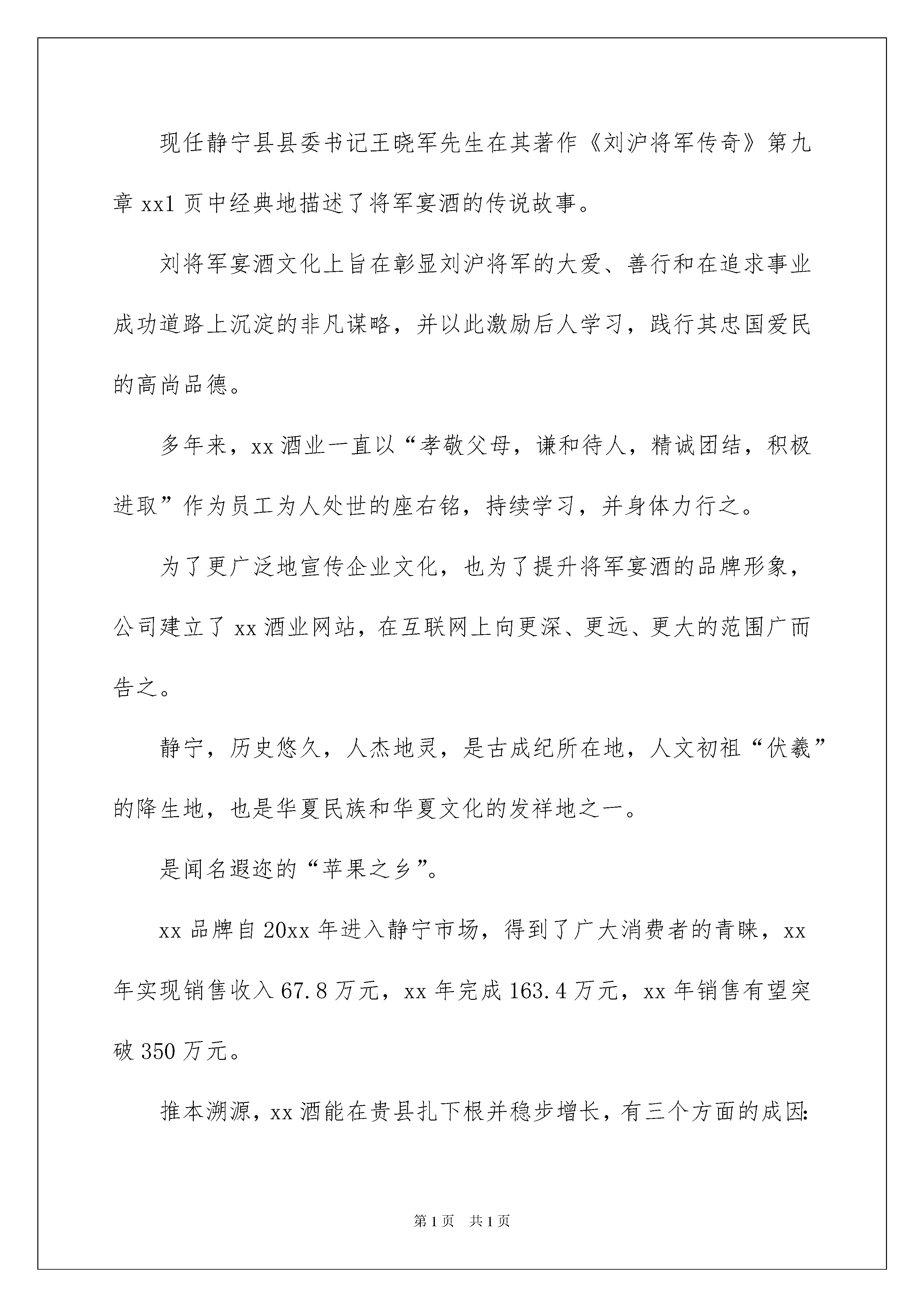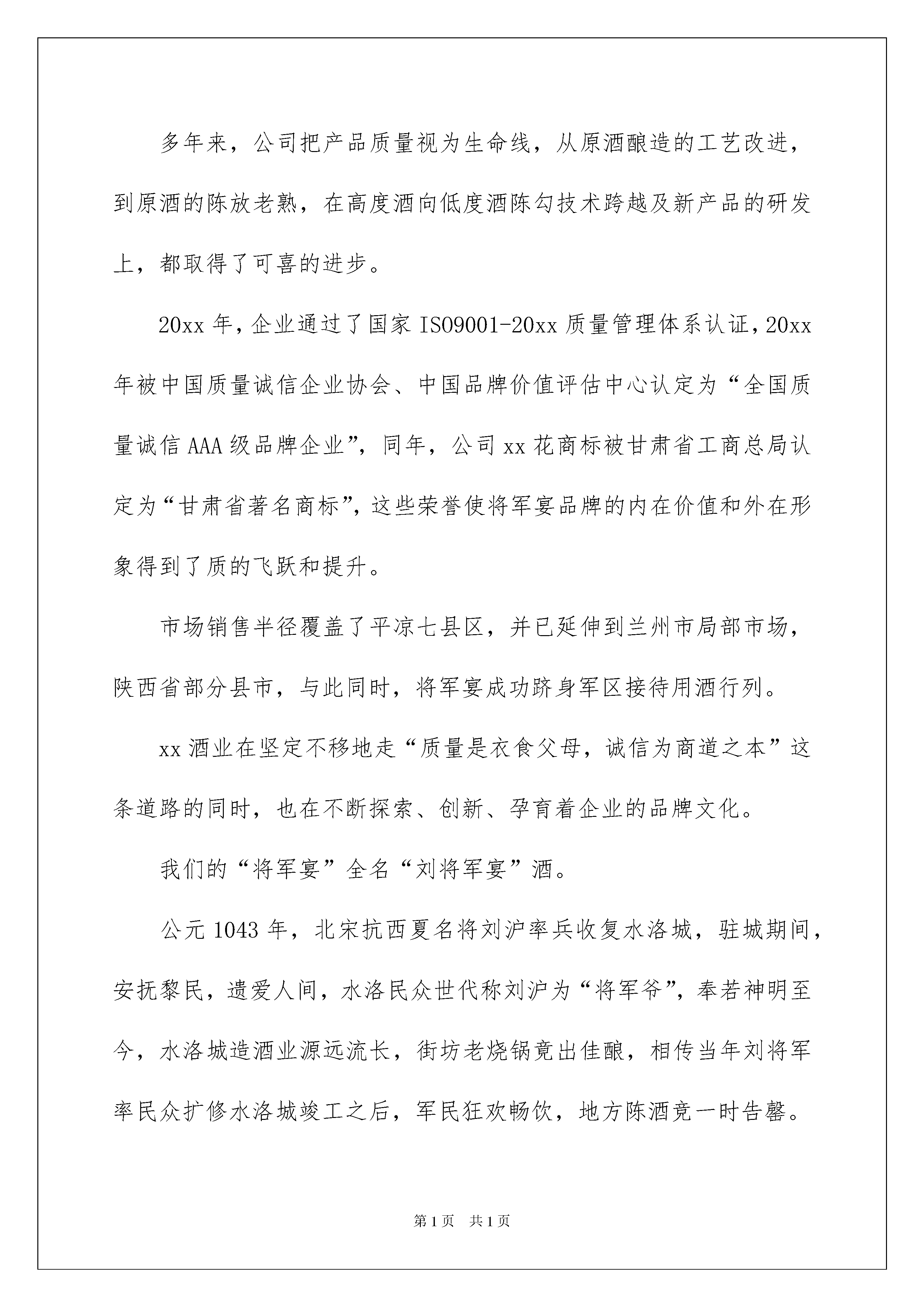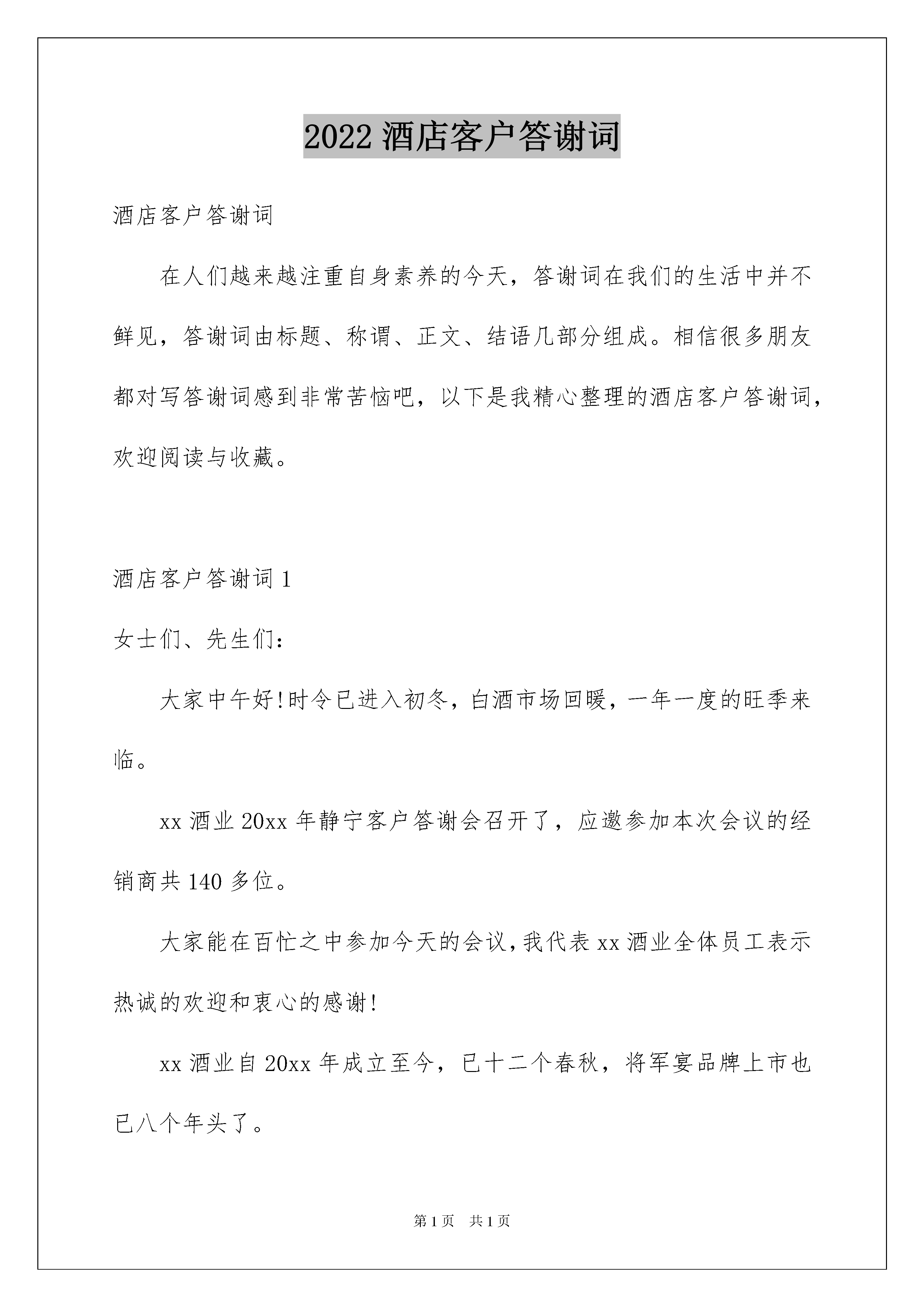 2022酒店客户答谢词酒店客户答谢词在人们越来越注重自身素养的今天,答谢词在我们的生活中并不鲜见,答谢词由标题、称谓、正文、结语几部分组成。相信很多朋友都对写答谢词感到非常苦恼吧,以下是我精心整理的酒店客户答谢词,欢迎阅读与收藏。酒店客户答谢词1女士们、先生们:大家中午好!时令已进入初冬,白酒市场回暖,一年一度的旺季来临。xx酒业20xx年静宁客户答谢会召开了,应邀参加本次会议的经销商共140多位。大家能在百忙之中参加今天的会议,我代表xx酒业全体员工表示热诚的欢迎和衷心的感谢!xx酒业自20xx年成立至今,已十二个春秋,将军宴品牌上市也已八个年头了。多年来,公司把产品质量视为生命线,从原酒酿造的工艺改进,到原酒的陈放老熟,在高度酒向低度酒陈勾技术跨越及新产品的研发上,都取得了可喜的进步。20xx年,企业通过了国家ISO9001-20xx质量管理体系认证,20xx年被中国质量诚信企业协会、中国品牌价值评估中心认定为“全国质量诚信AAA级品牌企业”,同年,公司xx花商标被甘肃省工商总局认定为“甘肃省著名商标”,这些荣誉使将军宴品牌的内在价值和外在形象得到了质的飞跃和提升。市场销售半径覆盖了平凉七县区,并已延伸到兰州市局部市场,陕西省部分县市,与此同时,将军宴成功跻身军区接待用酒行列。xx酒业在坚定不移地走“质量是衣食父母,诚信为商道之本”这条道路的同时,也在不断探索、创新、孕育着企业的品牌文化。我们的“将军宴”全名“刘将军宴”酒。公元1043年,北宋抗西夏名将刘沪率兵收复水洛城,驻城期间,安抚黎民,遗爱人间,水洛民众世代称刘沪为“将军爷”,奉若神明至今,水洛城造酒业源远流长,街坊老烧锅竟出佳酿,相传当年刘将军率民众扩修水洛城竣工之后,军民狂欢畅饮,地方陈酒竞一时告罄。现任静宁县县委书记王晓军先生在其著作《刘沪将军传奇》第九章xx1页中经典地描述了将军宴酒的传说故事。刘将军宴酒文化上旨在彰显刘沪将军的大爱、善行和在追求事业成功道路上沉淀的非凡谋略,并以此激励后人学习,践行其忠国爱民的高尚品德。多年来,xx酒业一直以“孝敬父母,谦和待人,精诚团结,积极进取”作为员工为人处世的座右铭,持续学习,并身体力行之。为了更广泛地宣传企业文化,也为了提升将军宴酒的品牌形象,公司建立了xx酒业网站,在互联网上向更深、更远、更大的范围广而告之。静宁,历史悠久,人杰地灵,是古成纪所在地,人文初祖“伏羲”的降生地,也是华夏民族和华夏文化的发祥地之一。是闻名遐迩的“苹果之乡”。xx品牌自20xx年进入静宁市场,得到了广大消费者的青睐,xx年实现销售收入67.8万元,xx年完成163.4万元,xx年销售有望突破350万元。推本溯源,xx酒能在贵县扎下根并稳步增长,有三个方面的成因:一是静宁人民是白酒品鉴的内行,非常懂酒;二是在座的各位老板,为将军宴品牌铺设了一条营销的绿色通道,是你们的聪明才智说服了广大消费者去接受她,也是你们千方百计为将军宴铸造了坚实宽广的营销网络;三是静宁总代理孙亦学先生,他为人宽厚睿智,在营销上有丰富的实践经验和长远的战略眼光,对将军宴品牌的市场运作投入了大量的人力、物力。在此,我代表xx酒业公司对广大消费者和在座的各位嘉宾表示最真诚的敬意和衷心的感谢!路漫漫其修远兮,吾将上下而求索。挑战与机遇并存,进攻与防守交融,胜利来自于我们对市场不懈地耕耘、开拓和向既定目标坚韧不拔的努力。女士们、先生们,我们共同的事业在明天的道路上已然铺就了绿色的希望,愿我们彼此珍重这相识、相交的缘分,精诚合作,共享经营的丰硕成果,为家人、为朋友、为社会奉献更多的爱心!谢谢大家!酒店客户答谢词2各位领导,各位来宾,各位女士、先生们,朋友们:在这个充满诗情画意的晚上,我们非常荣幸地邀请到在座的各位领导、各位朋友,借此机会,我谨代表宾馆的全体员工,对一年来关心、支持宾馆发展的各位领导、各位朋友表示最诚挚的谢意,并对各位的光临表示热烈的欢迎!xx宾馆在各级领导和在座各位的大力关心支持下,在全体员工的共同努力下,已发展成为集政务接待、住宿餐饮、办公休闲于一体,按照四星级旅游涉外饭店标准投资兴建的新型综合性商务宾馆。她是顺应沂源发展新形势,彰显沂源发展新成就的载体,她的每一步发展,都凝聚着县领导的关心和支持,凝聚着新城人与时俱进的信念,更凝聚着社会各界朋友多年来对我们的关心和帮助,正是因为有各界朋友的厚爱,我们才能一步步走到今天,并满怀信心地走向未来。当前,沂源的现代化建设突飞猛进,人民生活水平蒸蒸日上,我们新城人深知自己肩负的重担和使命。我们xx宾馆全体员工,将坚持求变创新的开拓精神,全力以赴,奋发有为,把我们的