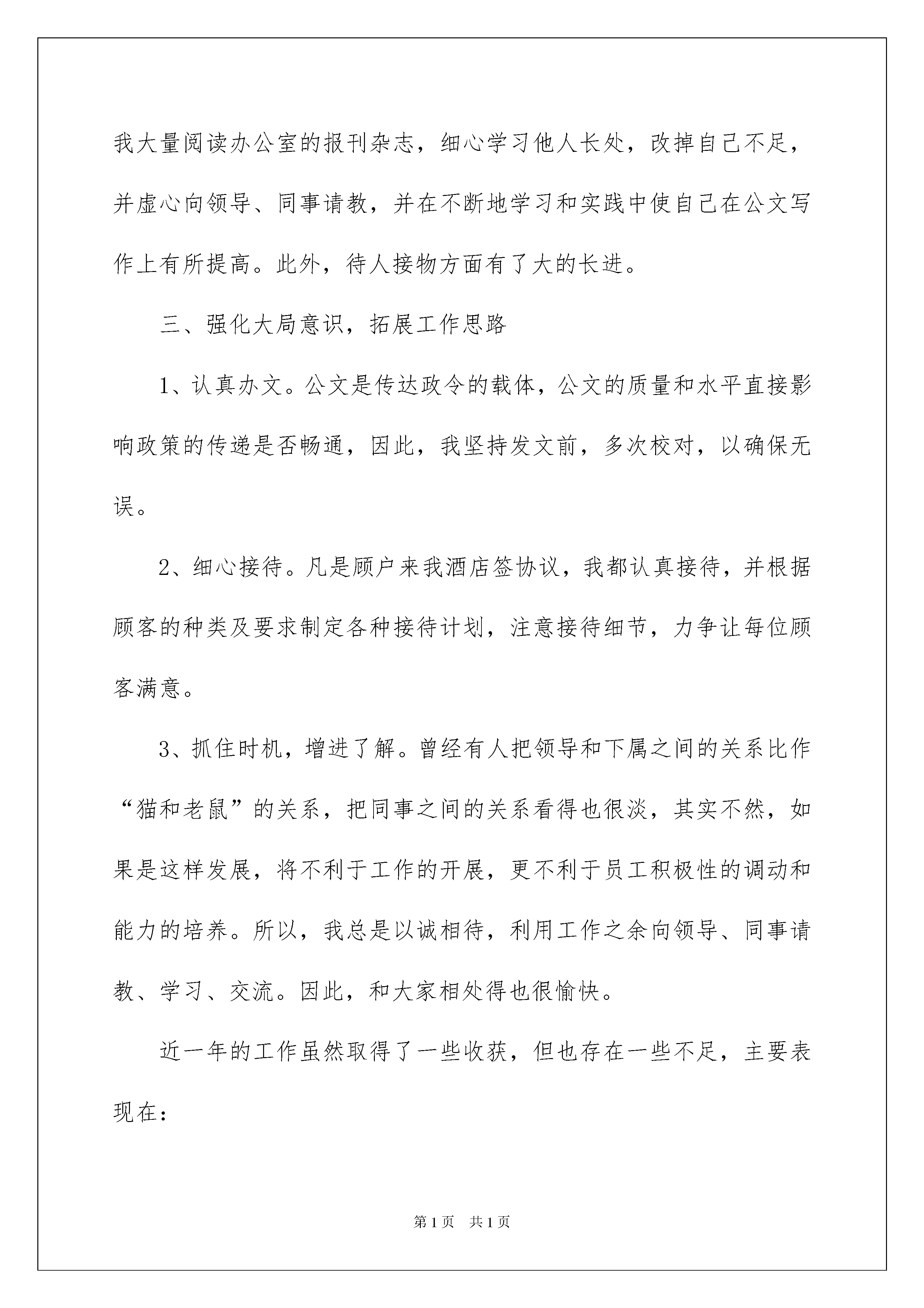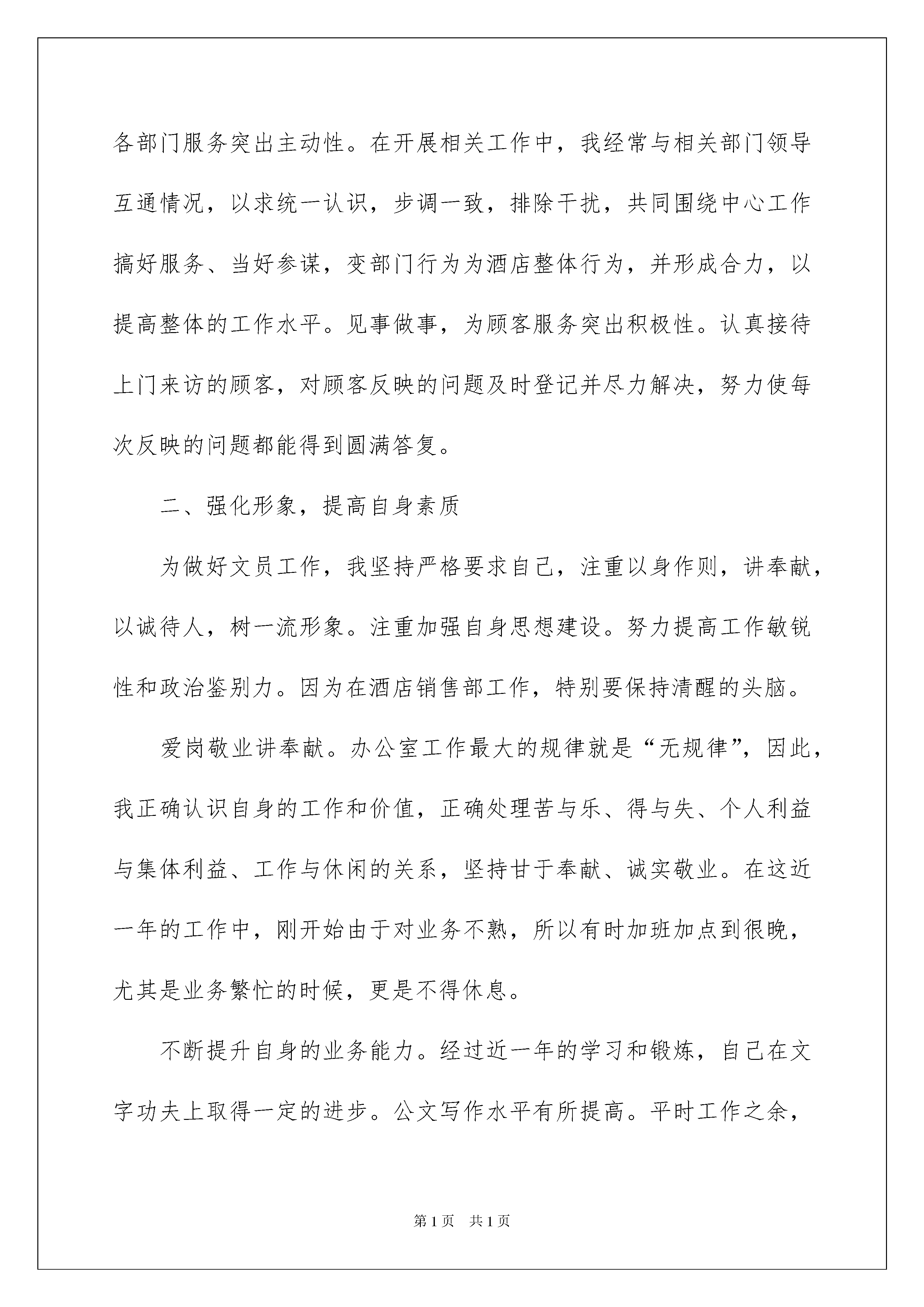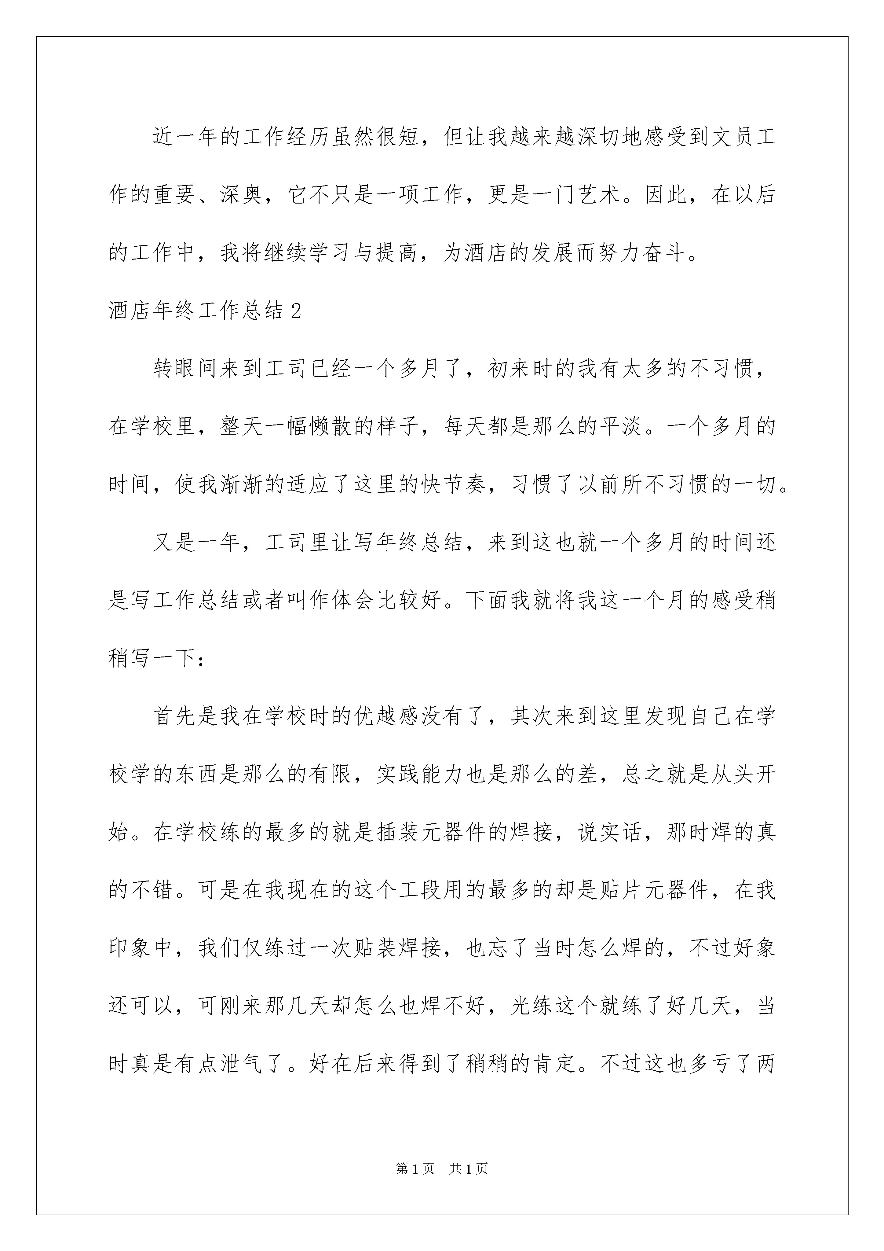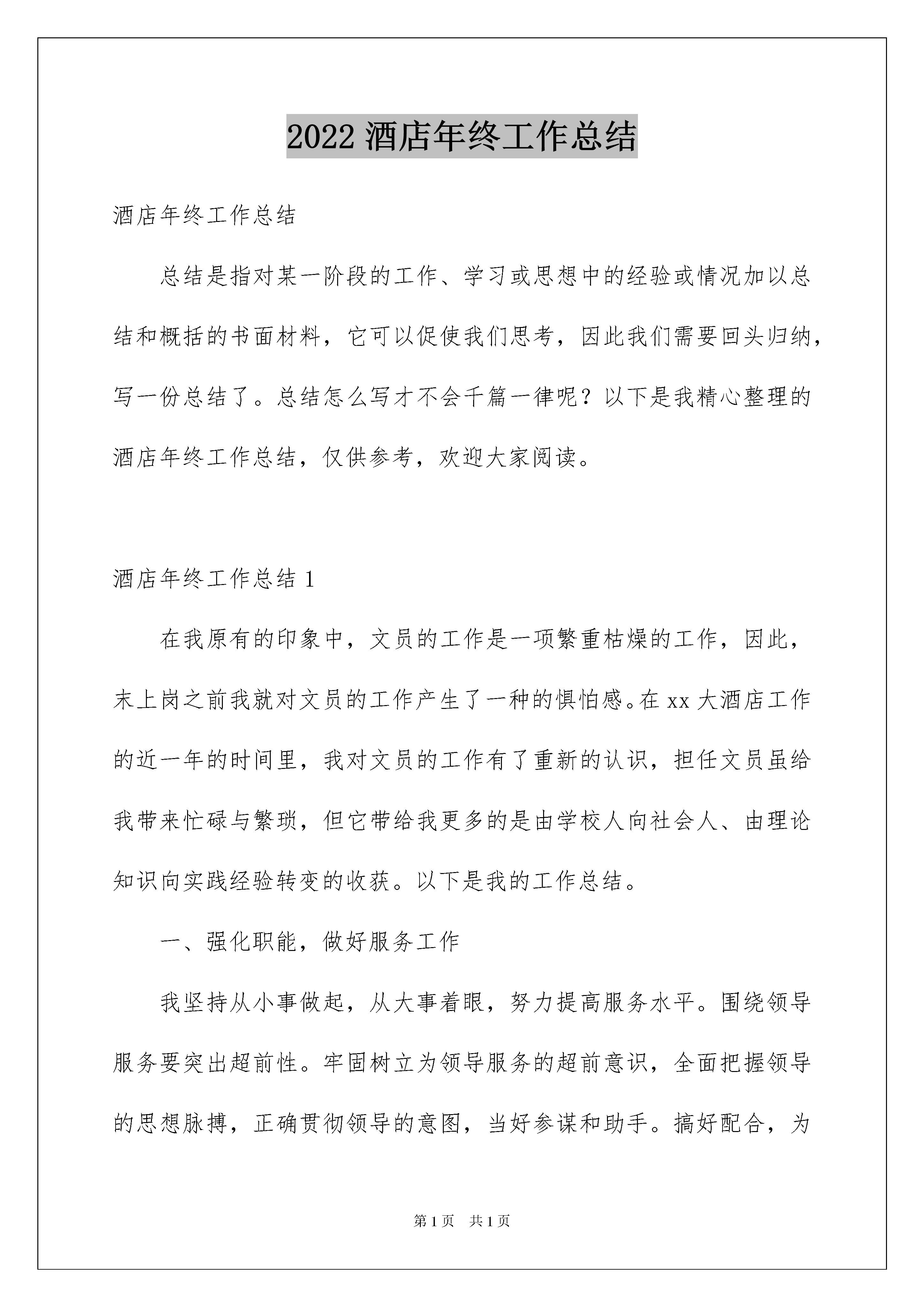 2022酒店年终工作总结酒店年终工作总结总结是指对某一阶段的工作、学习或思想中的经验或情况加以总结和概括的书面材料,它可以促使我们思考,因此我们需要回头归纳,写一份总结了。总结怎么写才不会千篇一律呢?以下是我精心整理的酒店年终工作总结,仅供参考,欢迎大家阅读。酒店年终工作总结1在我原有的印象中,文员的工作是一项繁重枯燥的工作,因此,末上岗之前我就对文员的工作产生了一种的惧怕感。在xx大酒店工作的近一年的时间里,我对文员的工作有了重新的认识,担任文员虽给我带来忙碌与繁琐,但它带给我更多的是由学校人向社会人、由理论知识向实践经验转变的收获。以下是我的工作总结。一、强化职能,做好服务工作我坚持从小事做起,从大事着眼,努力提高服务水平。围绕领导服务要突出超前性。牢固树立为领导服务的超前意识,全面把握领导的思想脉搏,正确贯彻领导的意图,当好参谋和助手。搞好配合,为各部门服务突出主动性。在开展相关工作中,我经常与相关部门领导互通情况,以求统一认识,步调一致,排除干扰,共同围绕中心工作搞好服务、当好参谋,变部门行为为酒店整体行为,并形成合力,以提高整体的工作水平。见事做事,为顾客服务突出积极性。认真接待上门来访的顾客,对顾客反映的问题及时登记并尽力解决,努力使每次反映的问题都能得到圆满答复。二、强化形象,提高自身素质为做好文员工作,我坚持严格要求自己,注重以身作则,讲奉献,以诚待人,树一流形象。注重加强自身思想建设。努力提高工作敏锐性和政治鉴别力。因为在酒店销售部工作,特别要保持清醒的头脑。爱岗敬业讲奉献。办公室工作最大的规律就是“无规律”,因此,我正确认识自身的工作和价值,正确处理苦与乐、得与失、个人利益与集体利益、工作与休闲的关系,坚持甘于奉献、诚实敬业。在这近一年的工作中,刚开始由于对业务不熟,所以有时加班加点到很晚,尤其是业务繁忙的时候,更是不得休息。不断提升自身的业务能力。经过近一年的学习和锻炼,自己在文字功夫上取得一定的进步。公文写作水平有所提高。平时工作之余,我大量阅读办公室的报刊杂志,细心学习他人长处,改掉自己不足,并虚心向领导、同事请教,并在不断地学习和实践中使自己在公文写作上有所提高。此外,待人接物方面有了大的长进。三、强化大局意识,拓展工作思路1、认真办文。公文是传达政令的载体,公文的质量和水平直接影响政策的传递是否畅通,因此,我坚持发文前,多次校对,以确保无误。2、细心接待。凡是顾户来我酒店签协议,我都认真接待,并根据顾客的种类及要求制定各种接待计划,注意接待细节,力争让每位顾客满意。3、抓住时机,增进了解。曾经有人把领导和下属之间的关系比作“猫和老鼠”的关系,把同事之间的关系看得也很淡,其实不然,如果是这样发展,将不利于工作的开展,更不利于员工积极性的调动和能力的培养。所以,我总是以诚相待,利用工作之余向领导、同事请教、学习、交流。因此,和大家相处得也很愉快。近一年的工作虽然取得了一些收获,但也存在一些不足,主要表现在:工作中的角色意识还不够;服务上还不到位;和有经验的同事相比还有一定差距;公文写作的内容上还缺乏完整性,但是我相信在今后的工作中,我一定认真总结经验,克服不足,努力把工作做得更好。发扬吃苦耐劳的精神。面对文员事务杂、任务重的工作性质,要不怕吃苦,勇挑重担,主动找事干,做到“眼勤、嘴勤、手勤、腿勤”,积极适应各种艰苦环境,在繁重的工作中磨炼意志,增长才干。发扬孜孜不倦的进取精神。加强学习,勇于实践,博览群书,不断积累,在向书本学习的同时注意收集各类信息,广泛汲取各种“营养”;同时,讲究学习方法,端正学习态度,提高学习效率,防止和克服浅尝辄止、一知半解的倾向。努力培养自己具有扎实的理论功底、辩正的思维方法、正确的思想观点、踏实的工作作风、周密的组织能力、机智的分析能力、果敢的处事能力、广泛的社交能力、从而逐步达到“张口能讲,提笔能写,下手能干”的境界。发扬超越自我的精神。即要打破长期形成的心理定势和思维定势,勇于发现和纠正自己工作中的缺点、错误,不断调整自己的思维方式和工作方法,分阶段提出较高的学习和工作目标,不断追求,奋发进取,以适应各项工作超常规、跳跃式发展的需要。近一年的工作经历虽然很短,但让我越来越深切地感受到文员工作的重要、深奥,它不只是一项工作,更是一门艺术。因此,在以后的工作中,我将继续学习与提高,为酒店的发展而努力奋斗。酒店年终工作总结2转眼间来到工司已经一个多月了,初来时的我有太多的不习惯,在学校里,整天一幅懒散的样子,每天都是那么的平淡。一个多月的时间,使我渐渐的适应了这里的快节奏,习惯了以前所不习惯的一切。又是一年,工司里让写年