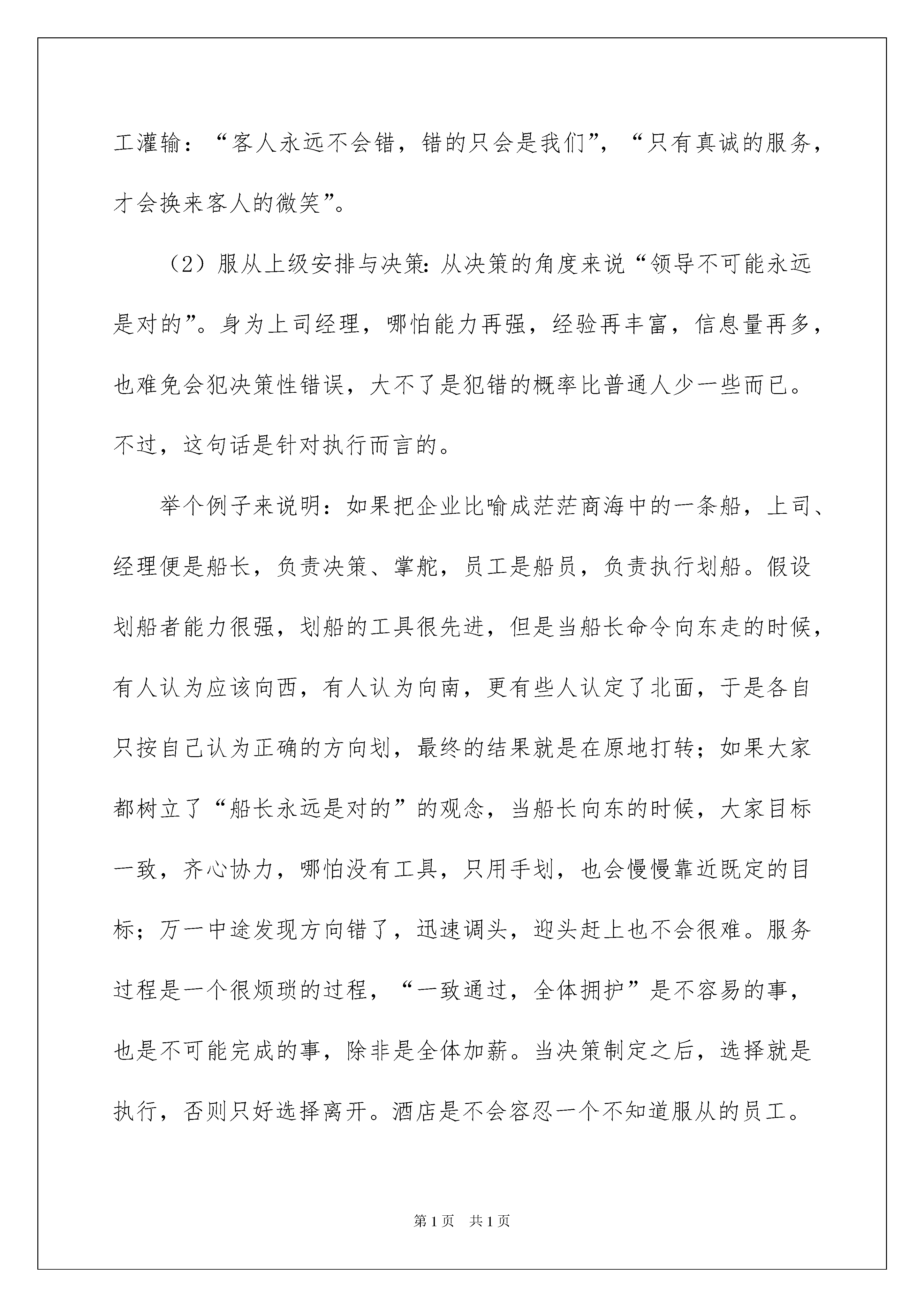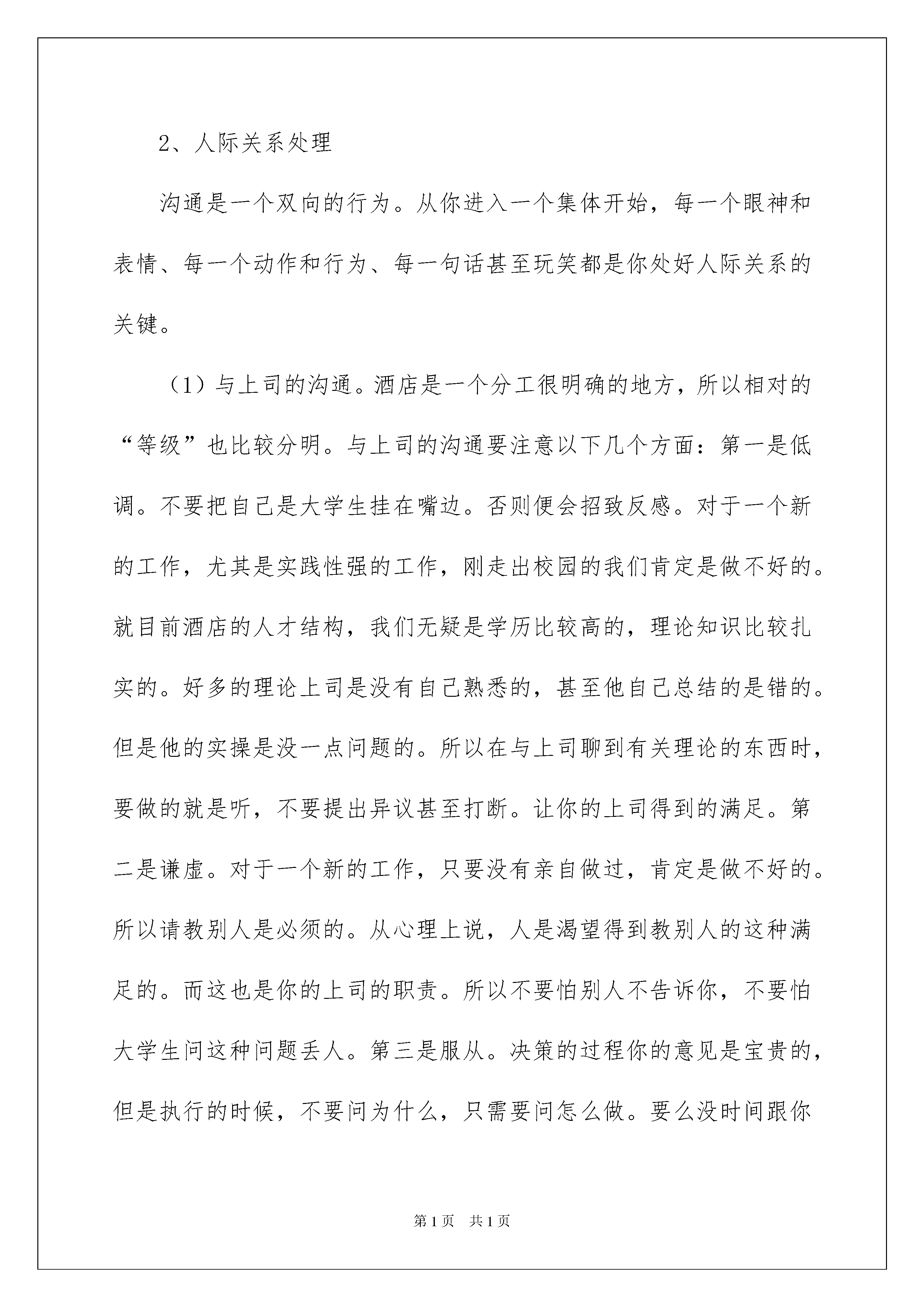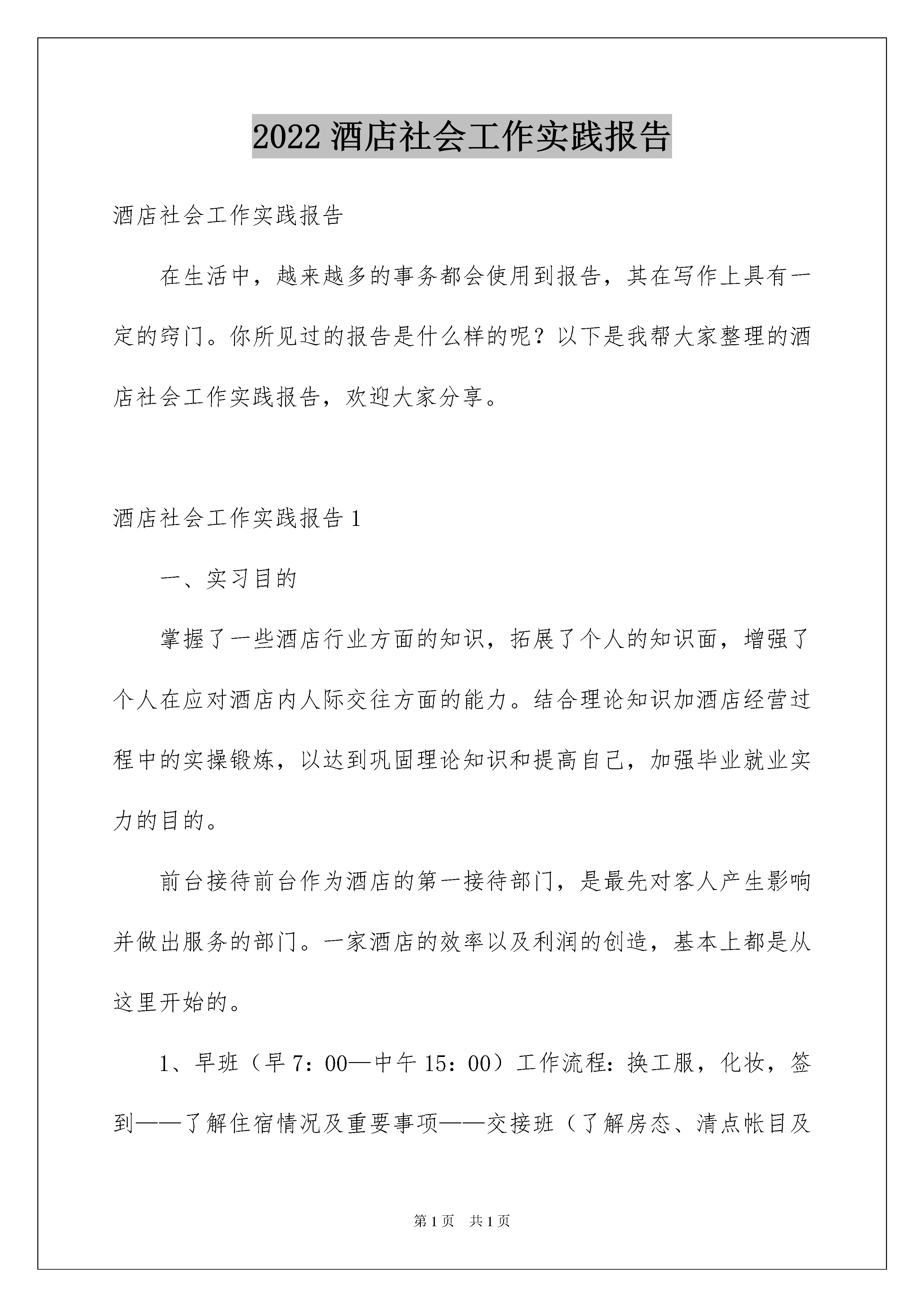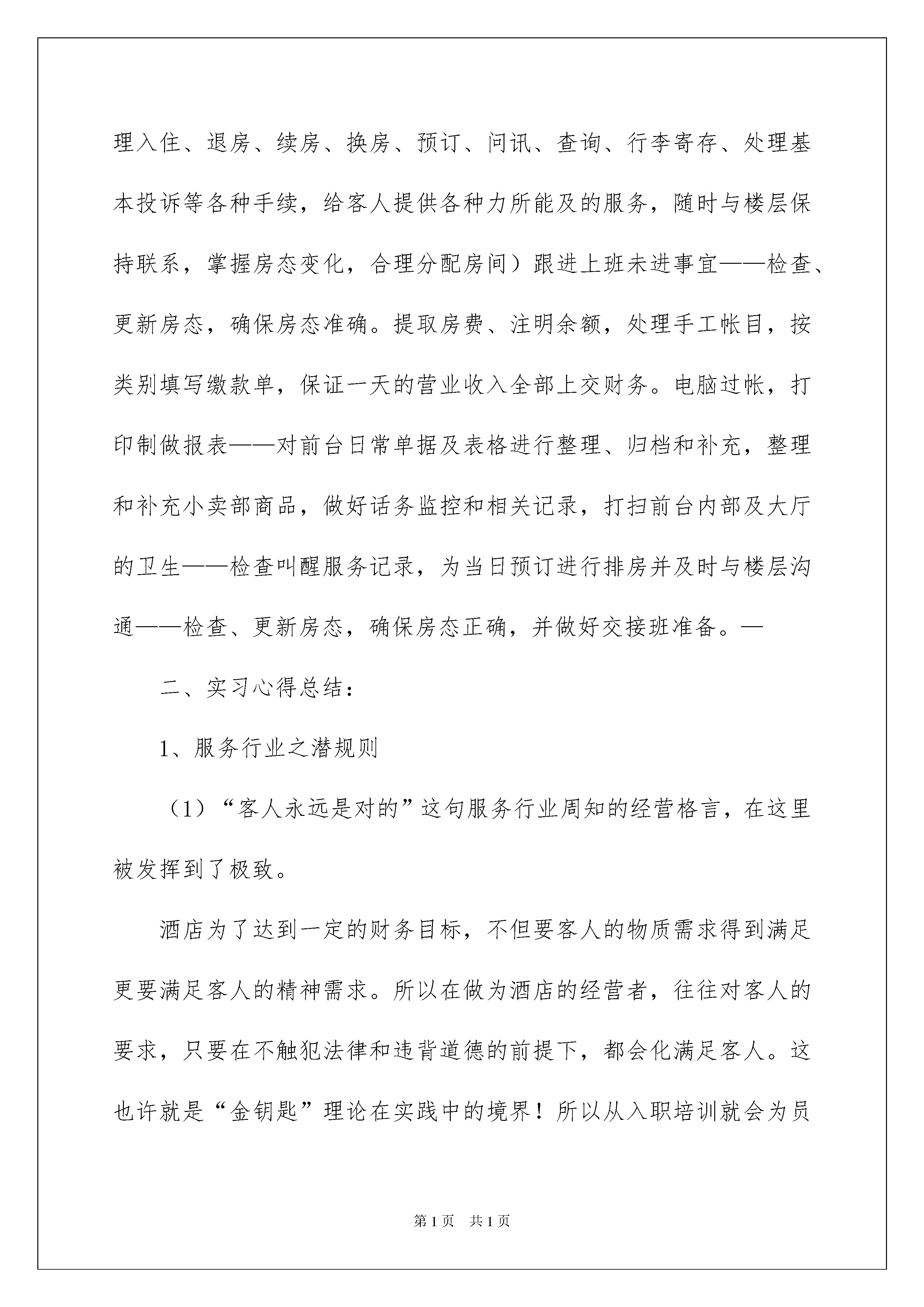 2022酒店社会工作实践报告酒店社会工作实践报告在生活中,越来越多的事务都会使用到报告,其在写作上具有一定的窍门。你所见过的报告是什么样的呢?以下是我帮大家整理的酒店社会工作实践报告,欢迎大家分享。酒店社会工作实践报告1一、实习目的掌握了一些酒店行业方面的知识,拓展了个人的知识面,增强了个人在应对酒店内人际交往方面的能力。结合理论知识加酒店经营过程中的实操锻炼,以达到巩固理论知识和提高自己,加强毕业就业实力的目的。前台接待前台作为酒店的第一接待部门,是最先对客人产生影响并做出服务的部门。一家酒店的效率以及利润的创造,基本上都是从这里开始的。1、早班(早7:00—中午15:00)工作流程:换工服,化妆,签到——了解住宿情况及重要事项——交接班(了解房态、清点帐目及小卖部商品,仔细阅读交班本)——接待宾客(办理入住、退房、续房、换房、预订、问讯、查询、行李寄存、处理基本投诉等各种手续,给客人提供各种力所能及的服务。随时与楼层保持联系,掌握房态变化,合理分配房间)——配合收银向询问客人是否续住,关注客人消费情况,保证房间帐户有足够押金,帮助客人办理续房手续——接待宾客(以退房为主)——工作午餐——检查、更新房态,确保房态准确,接待宾客(重点催收房费)——做交接班准备。2、中班(中午15:00—晚上22:00)工作流程:交接班,清点帐目,了解白天住宿情况以及预订情况,掌握押金余额不足的房间,跟进上班未进事宜——接待宾客(重点催收房费)——工作晚餐——协助前台收银催房费,并跟进餐券发放事宜——检查、更新房态,确保房态准确,整理预订——接待宾客(办理入住、退房、续房、换房、预订、问讯、查询、行李寄存、处理基本投诉等各种手续,给客人提供各种力所能及的服务。随时与楼层保持联系,掌握房态变化,合理分配房间),18:00以前完成押金催收工作——做交接班准备。3、夜班(晚上22:00—次日早7:00)工作流程:交接班,清点帐目,了解白天住宿情况,掌握押金余额不足的房间——接待宾客(办理入住、退房、续房、换房、预订、问讯、查询、行李寄存、处理基本投诉等各种手续,给客人提供各种力所能及的服务,随时与楼层保持联系,掌握房态变化,合理分配房间)跟进上班未进事宜——检查、更新房态,确保房态准确。提取房费、注明余额,处理手工帐目,按类别填写缴款单,保证一天的营业收入全部上交财务。电脑过帐,打印制做报表——对前台日常单据及表格进行整理、归档和补充,整理和补充小卖部商品,做好话务监控和相关记录,打扫前台内部及大厅的卫生——检查叫醒服务记录,为当日预订进行排房并及时与楼层沟通——检查、更新房态,确保房态正确,并做好交接班准备。—二、实习心得总结:1、服务行业之潜规则(1)“客人永远是对的”这句服务行业周知的经营格言,在这里被发挥到了极致。酒店为了达到一定的财务目标,不但要客人的物质需求得到满足更要满足客人的精神需求。所以在做为酒店的经营者,往往对客人的要求,只要在不触犯法律和违背道德的前提下,都会化满足客人。这也许就是“金钥匙”理论在实践中的境界!所以从入职培训就会为员工灌输:“客人永远不会错,错的只会是我们”,“只有真诚的服务,才会换来客人的微笑”。(2)服从上级安排与决策:从决策的角度来说“领导不可能永远是对的”。身为上司经理,哪怕能力再强,经验再丰富,信息量再多,也难免会犯决策性错误,大不了是犯错的概率比普通人少一些而已。不过,这句话是针对执行而言的。举个例子来说明:如果把企业比喻成茫茫商海中的一条船,上司、经理便是船长,负责决策、掌舵,员工是船员,负责执行划船。假设划船者能力很强,划船的工具很先进,但是当船长命令向东走的时候,有人认为应该向西,有人认为向南,更有些人认定了北面,于是各自只按自己认为正确的方向划,最终的结果就是在原地打转;如果大家都树立了“船长永远是对的”的观念,当船长向东的时候,大家目标一致,齐心协力,哪怕没有工具,只用手划,也会慢慢靠近既定的目标;万一中途发现方向错了,迅速调头,迎头赶上也不会很难。服务过程是一个很烦琐的过程,“一致通过,全体拥护”是不容易的事,也是不可能完成的事,除非是全体加薪。当决策制定之后,选择就是执行,否则只好选择离开。酒店是不会容忍一个不知道服从的员工。2、人际关系处理沟通是一个双向的行为。从你进入一个集体开始,每一个眼神和表情、每一个动作和行为、每一句话甚至玩笑都是你处好人际关系的关键。(1)与上司的沟通。酒店是一个分工很明确的地方,所以相对的“等级”也比较分明。与上司的沟通要注意以下几个方面:第一是低调。不要把自己是大学生挂在嘴边。否则便会招致反感。对于一