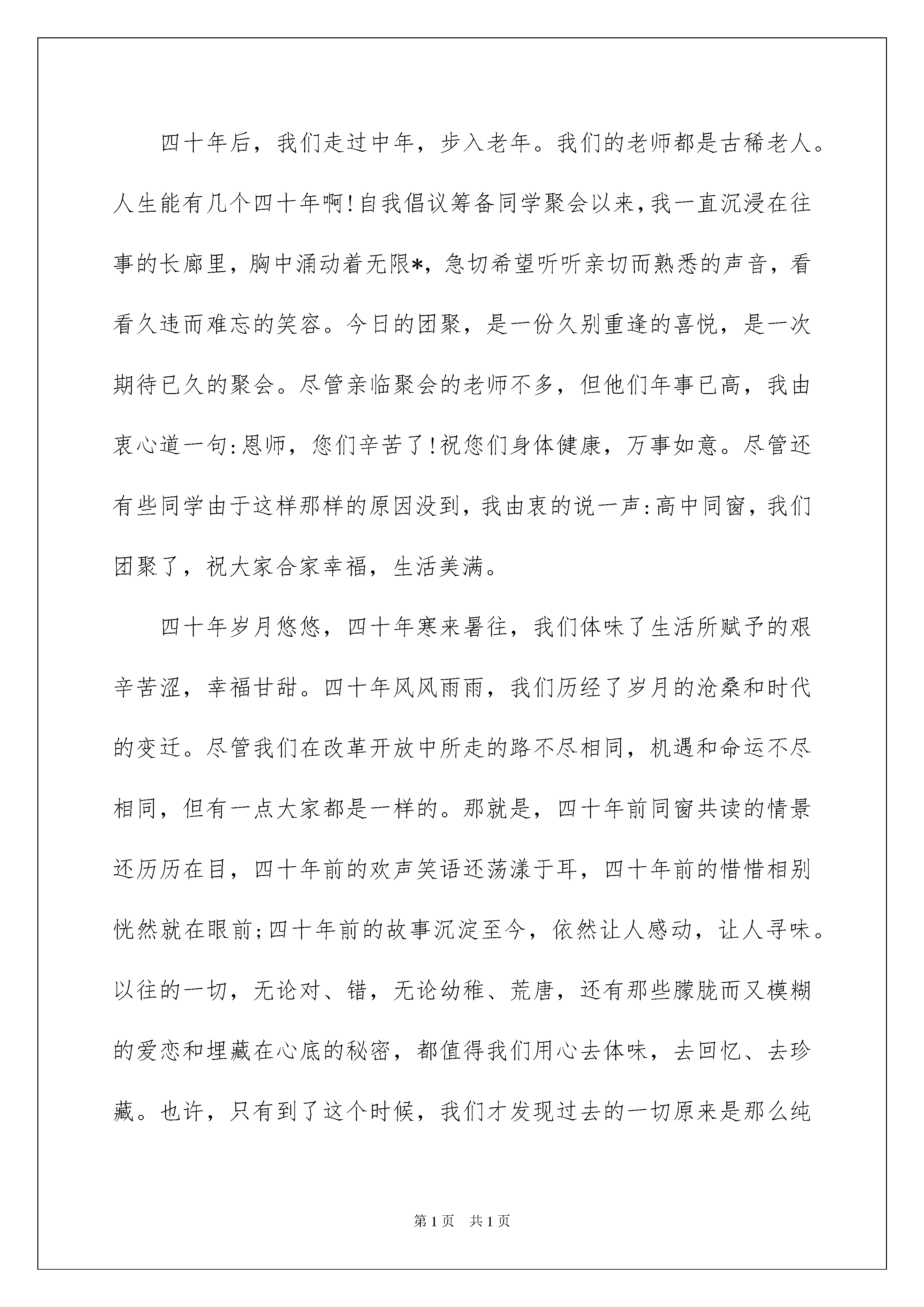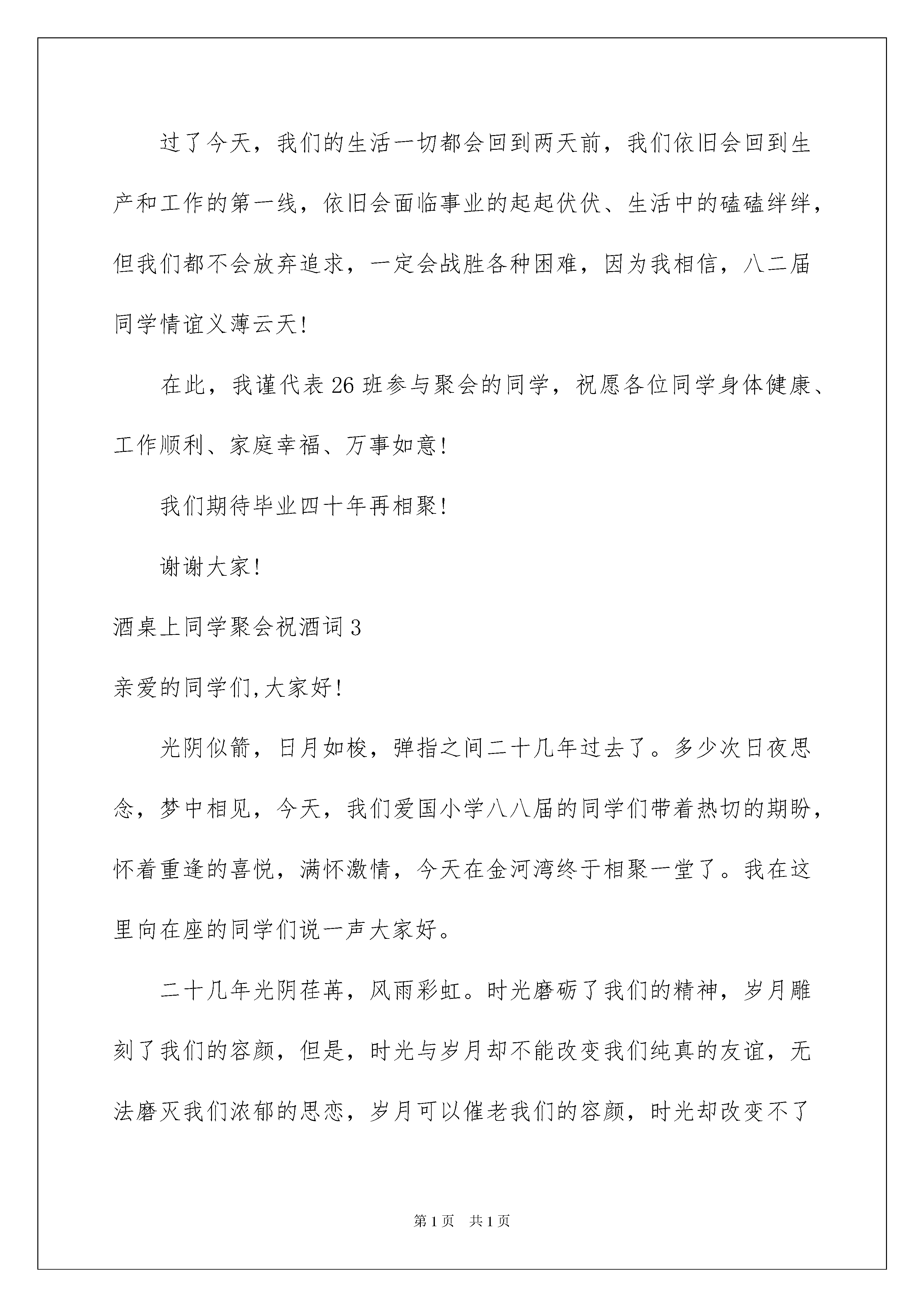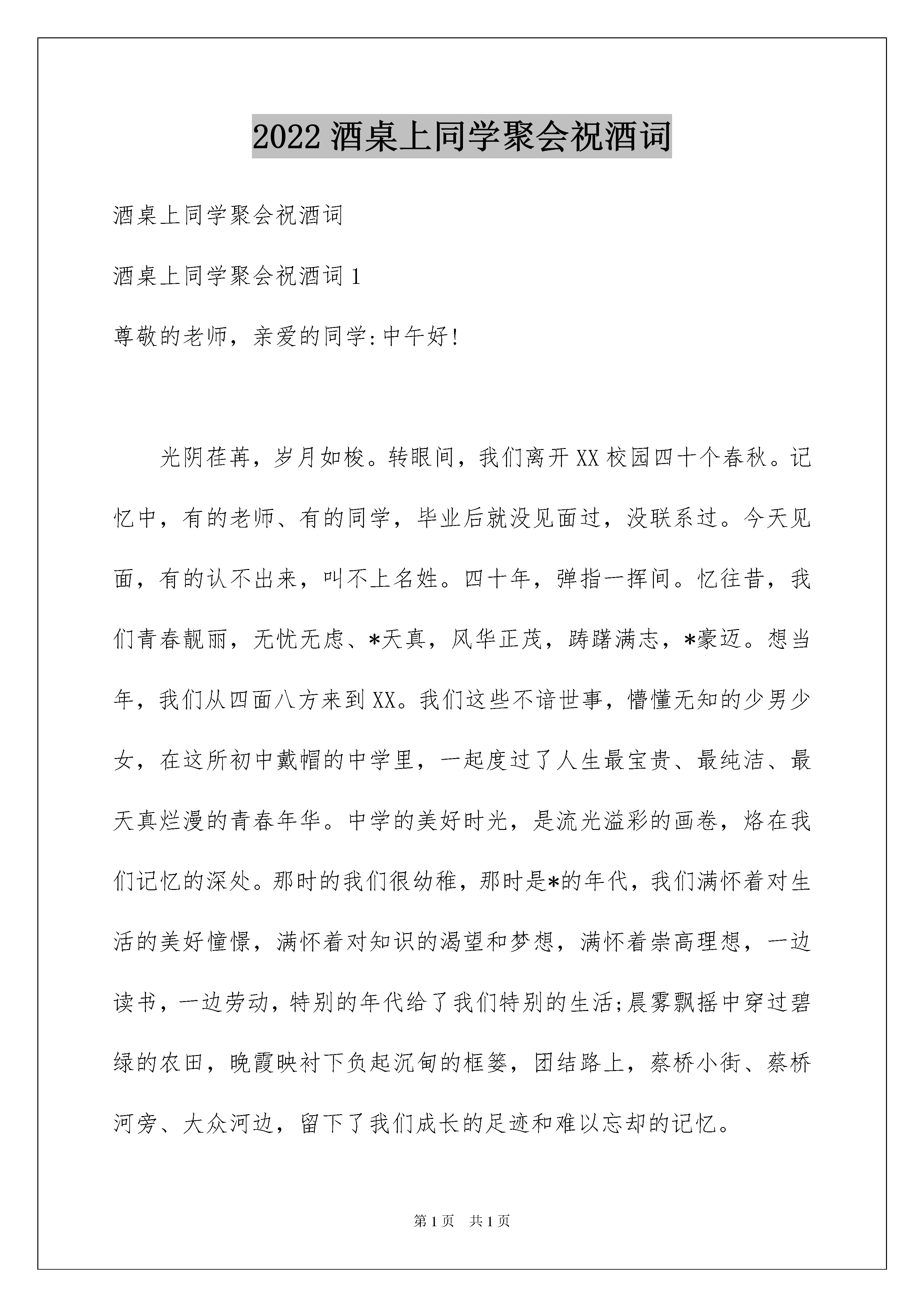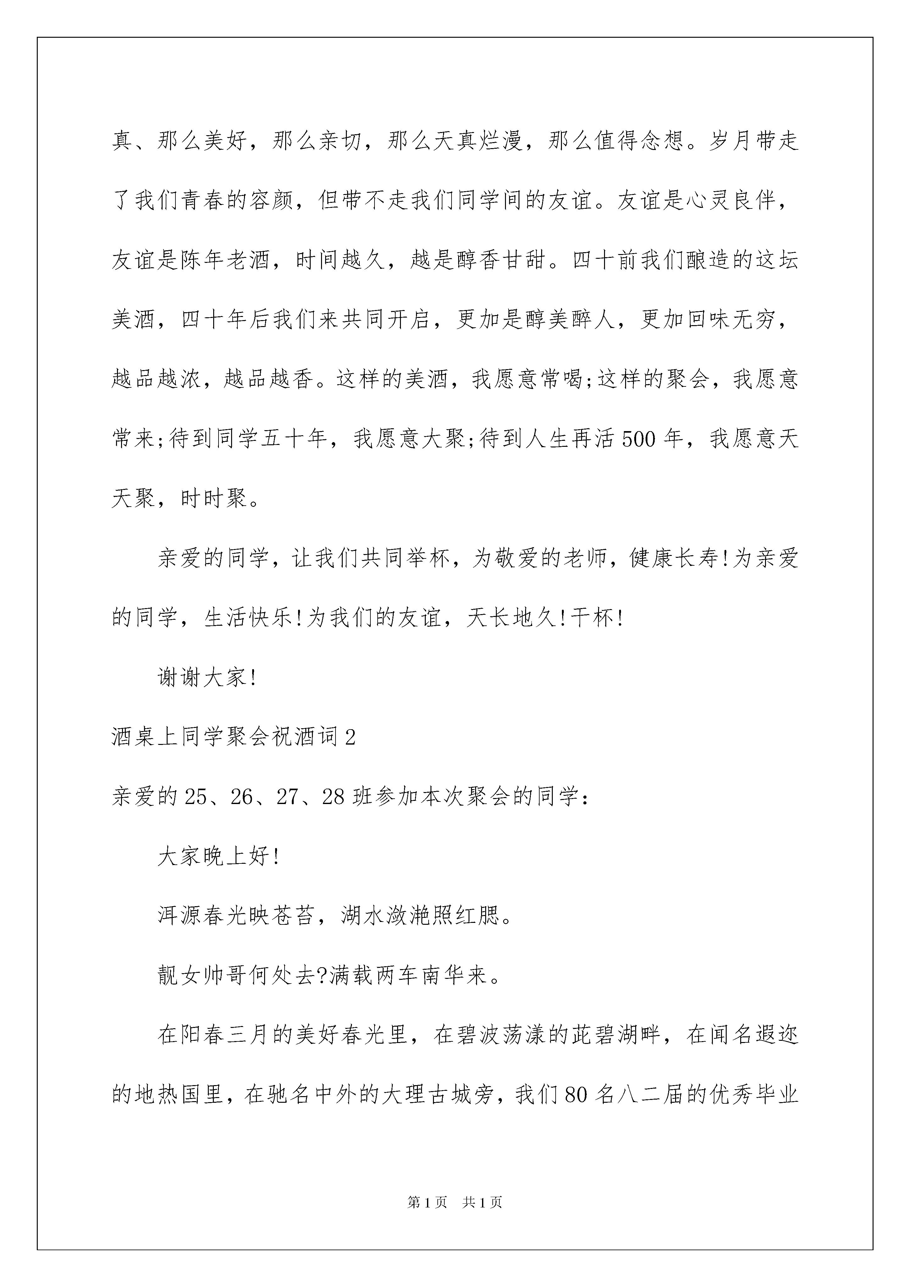 2022酒桌上同学聚会祝酒词酒桌上同学聚会祝酒词酒桌上同学聚会祝酒词1尊敬的老师,亲爱的同学:中午好!光阴荏苒,岁月如梭。转眼间,我们离开XX校园四十个春秋。记忆中,有的老师、有的同学,毕业后就没见面过,没联系过。今天见面,有的认不出来,叫不上名姓。四十年,弹指一挥间。忆往昔,我们青春靓丽,无忧无虑、*天真,风华正茂,踌躇满志,*豪迈。想当年,我们从四面八方来到XX。我们这些不谙世事,懵懂无知的少男少女,在这所初中戴帽的中学里,一起度过了人生最宝贵、最纯洁、最天真烂漫的青春年华。中学的美好时光,是流光溢彩的画卷,烙在我们记忆的深处。那时的我们很幼稚,那时是*的年代,我们满怀着对生活的美好憧憬,满怀着对知识的渴望和梦想,满怀着崇高理想,一边读书,一边劳动,特别的年代给了我们特别的生活;晨雾飘摇中穿过碧绿的农田,晚霞映衬下负起沉甸的框篓,团结路上,蔡桥小街、蔡桥河旁、大众河边,留下了我们成长的足迹和难以忘却的记忆。四十年后,我们走过中年,步入老年。我们的老师都是古稀老人。人生能有几个四十年啊!自我倡议筹备同学聚会以来,我一直沉浸在往事的长廊里,胸中涌动着无限*,急切希望听听亲切而熟悉的声音,看看久违而难忘的笑容。今日的团聚,是一份久别重逢的喜悦,是一次期待已久的聚会。尽管亲临聚会的老师不多,但他们年事已高,我由衷心道一句:恩师,您们辛苦了!祝您们身体健康,万事如意。尽管还有些同学由于这样那样的原因没到,我由衷的说一声:高中同窗,我们团聚了,祝大家合家幸福,生活美满。四十年岁月悠悠,四十年寒来暑往,我们体味了生活所赋予的艰辛苦涩,幸福甘甜。四十年风风雨雨,我们历经了岁月的沧桑和时代的变迁。尽管我们在改革开放中所走的路不尽相同,机遇和命运不尽相同,但有一点大家都是一样的。那就是,四十年前同窗共读的情景还历历在目,四十年前的欢声笑语还荡漾于耳,四十年前的惜惜相别恍然就在眼前;四十年前的故事沉淀至今,依然让人感动,让人寻味。以往的一切,无论对、错,无论幼稚、荒唐,还有那些朦胧而又模糊的爱恋和埋藏在心底的秘密,都值得我们用心去体味,去回忆、去珍藏。也许,只有到了这个时候,我们才发现过去的一切原来是那么纯真、那么美好,那么亲切,那么天真烂漫,那么值得念想。岁月带走了我们青春的容颜,但带不走我们同学间的友谊。友谊是心灵良伴,友谊是陈年老酒,时间越久,越是醇香甘甜。四十前我们酿造的这坛美酒,四十年后我们来共同开启,更加是醇美醉人,更加回味无穷,越品越浓,越品越香。这样的美酒,我愿意常喝;这样的聚会,我愿意常来;待到同学五十年,我愿意大聚;待到人生再活500年,我愿意天天聚,时时聚。亲爱的同学,让我们共同举杯,为敬爱的老师,健康长寿!为亲爱的同学,生活快乐!为我们的友谊,天长地久!干杯!谢谢大家!酒桌上同学聚会祝酒词2亲爱的25、26、27、28班参加本次聚会的同学:大家晚上好!洱源春光映苍苔,湖水潋滟照红腮。靓女帅哥何处去?满载两车南华来。在阳春三月的美好春光里,在碧波荡漾的茈碧湖畔,在闻名遐迩的地热国里,在驰名中外的大理古城旁,我们80名八二届的优秀毕业生,80名南华城乡的才干精英,在学友情、亲友爱的召唤下,我们一路豪歌向洱源,意气风发地热国。我们放下手中的农活,放下手中的工作,放下手中的生意,放下手中的蹉跎,追寻那逝去的青春,追寻那年轻的梦想,追寻那青春的萌动,追寻那岁月的激情。只因为:同学友情清澈纯真,同学友情深厚至诚,同学友情与日俱增,同学友情难舍难分。我们真情倾诉三十年的风风雨雨,三十年的痴痴迷迷,三十年的翘首企盼,三十年的恋恋依依。在暖呼呼的温泉里,我们舒展泳姿,展示我们的笑颜如花;在绿茵茵的芦苇荡,我们并肩漫步,传递我们的真情无暇;在喜洋洋的宴会上,我们举杯交错,表达我们的友情热辣。地热国的云淡风清,比不过我们三十年同学情的一片冰心;地热国的并排芦苇,比不过我们三十年同学情的柔情似水;地热国的风景如画,比不过我们三十年同学情的热情似夏;地热国的云蒸雾绕,比不过我们三十年同学情的激情拥抱。两天的时间并不长,我们彼此调侃你我的容颜,彼此感悟你我的事业观,彼此祝福你我的另一半,彼此憧憬你我的幸福间。我们共同感谢学长的组织,感谢同学的参与,感谢天气的帮忙,感谢运气的眷顾。过了今天,我们的生活一切都会回到两天前,我们依旧会回到生产和工作的第一线,依旧会面临事业的起起伏伏、生活中的磕磕绊绊,但我们都不会放弃追求,一定会战胜各种困难,因为我相信,八二届同学情谊义薄云天!在此,我谨代表26班参与聚会的同学,祝愿各位同学身体健康、工作顺利、家庭幸福、万事如意!我们期待毕业四十年再相聚!谢谢大家!