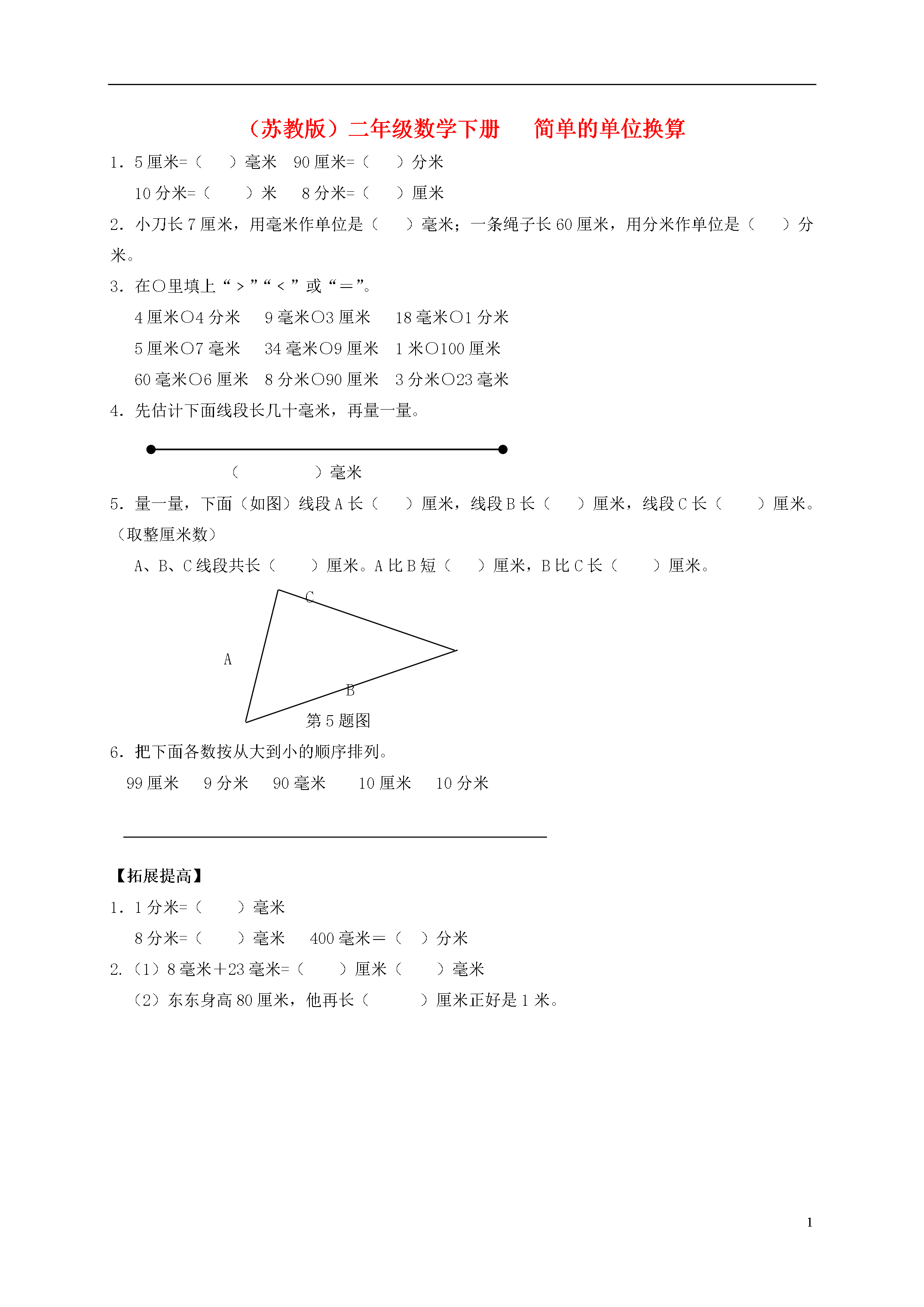 1(苏教版)二年级数学下册简单的单位换算1.5厘米=()毫米90厘米=()分米10分米=()米8分米=()厘米2.小刀长7厘米,用毫米作单位是()毫米;一条绳子长60厘米,用分米作单位是()分米。3.在○里填上“﹥”“﹤”或“=”。4厘米○4分米9毫米○3厘米18毫米○1分米5厘米○7毫米34毫米○9厘米1米○100厘米60毫米○6厘米8分米○90厘米3分米○23毫米4.先估计下面线段长几十毫米,再量一量。()毫米5.量一量,下面(如图)线段A长()厘米,线段B长()厘米,线段C长()厘米。(取整厘米数)A、B、C线段共长()厘米。A比B短()厘米,B比C长()厘米。CAB第5题图6.把下面各数按从大到小的顺序排列。99厘米9分米90毫米10厘米10分米【拓展提高】1.1分米=()毫米8分米=()毫米400毫米=()分米2.(1)8毫米+23毫米=()厘米()毫米(2)东东身高80厘米,他再长()厘米正好是1米。