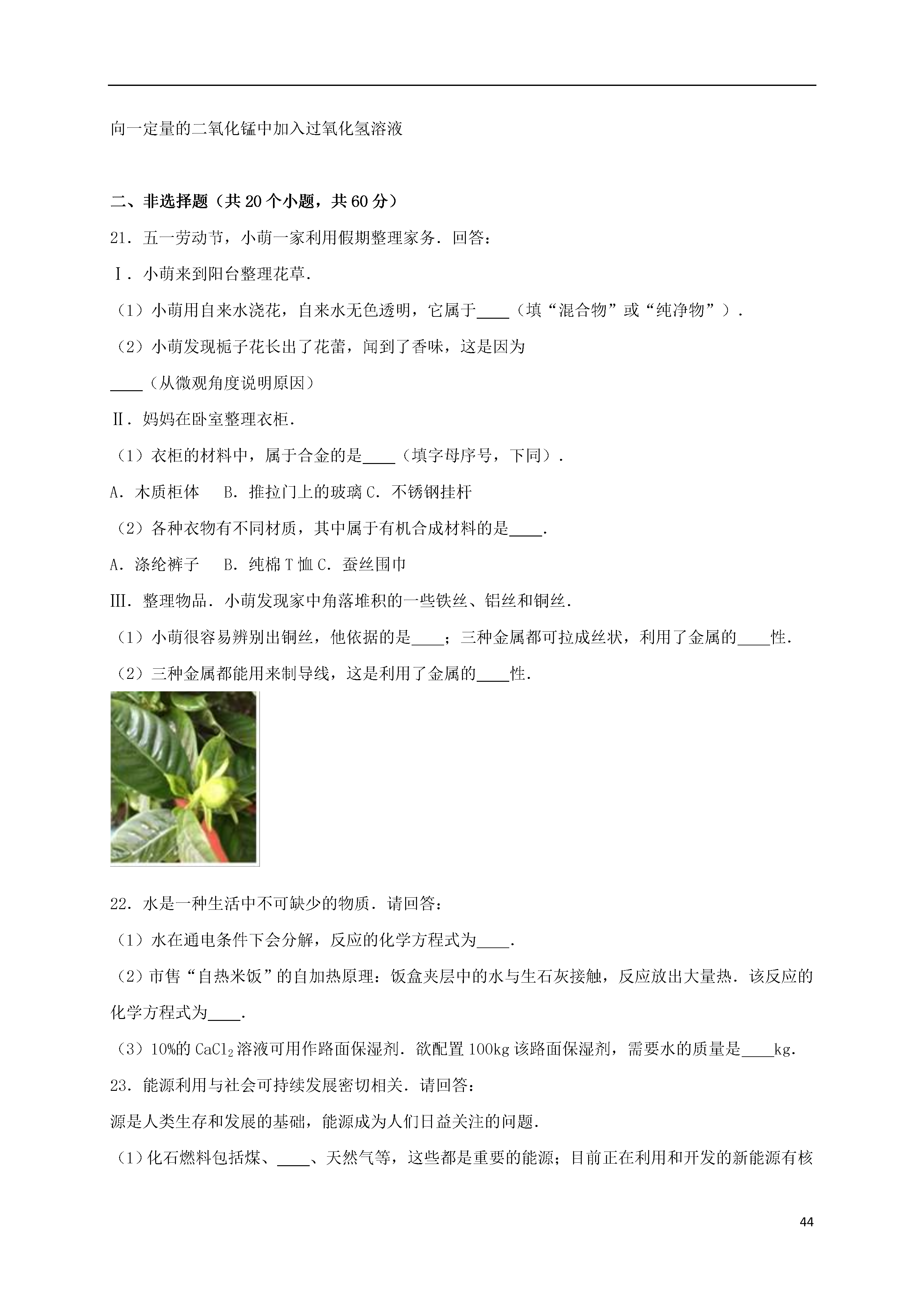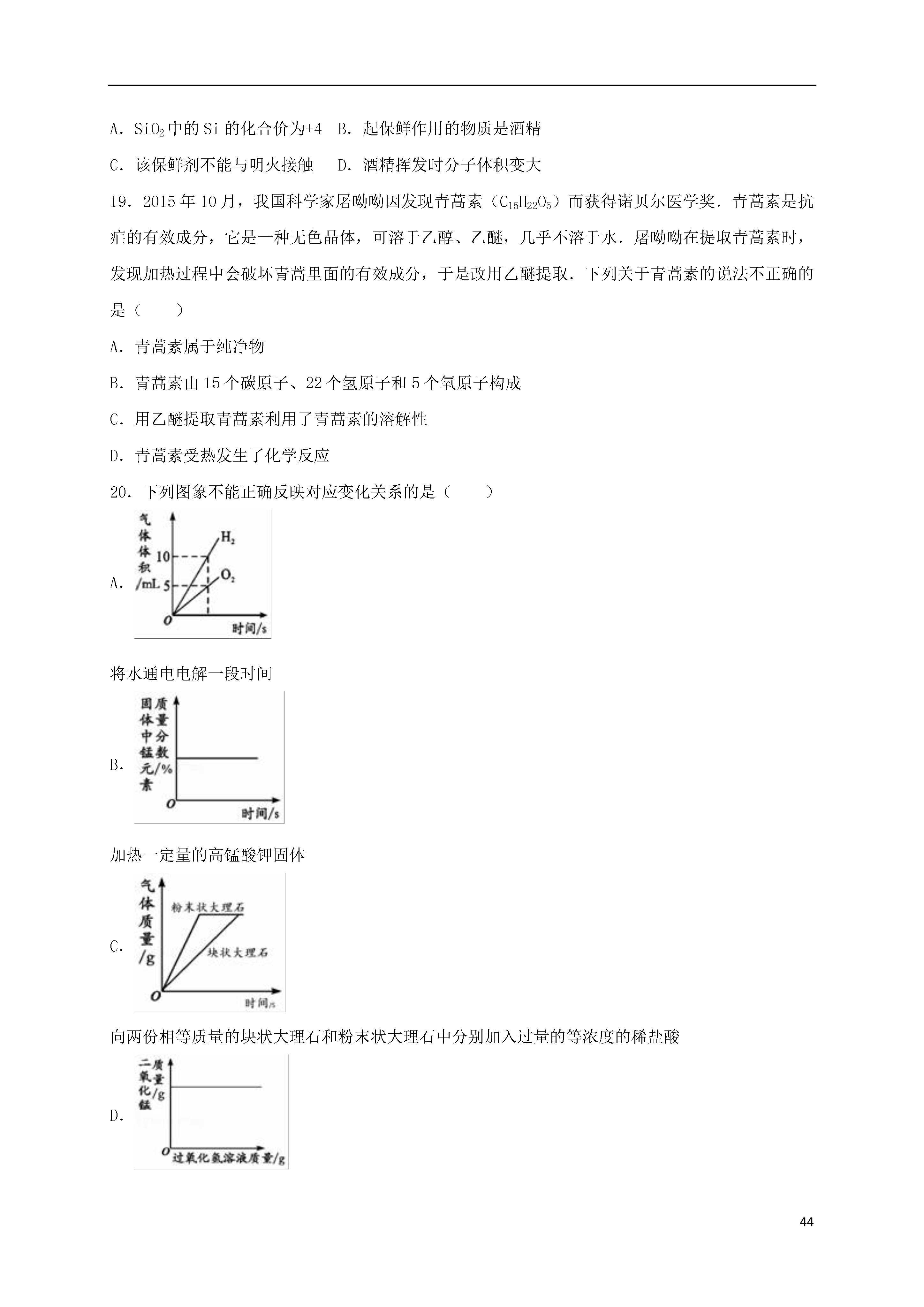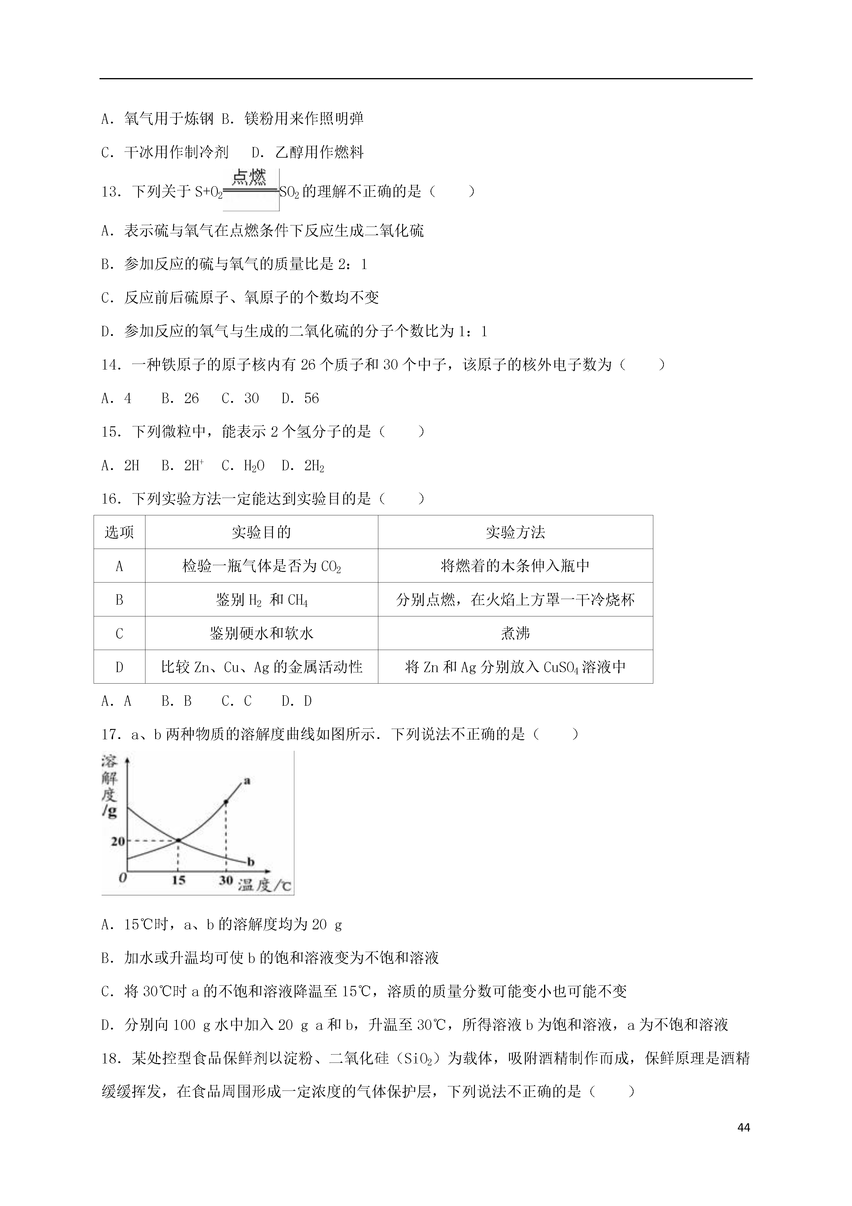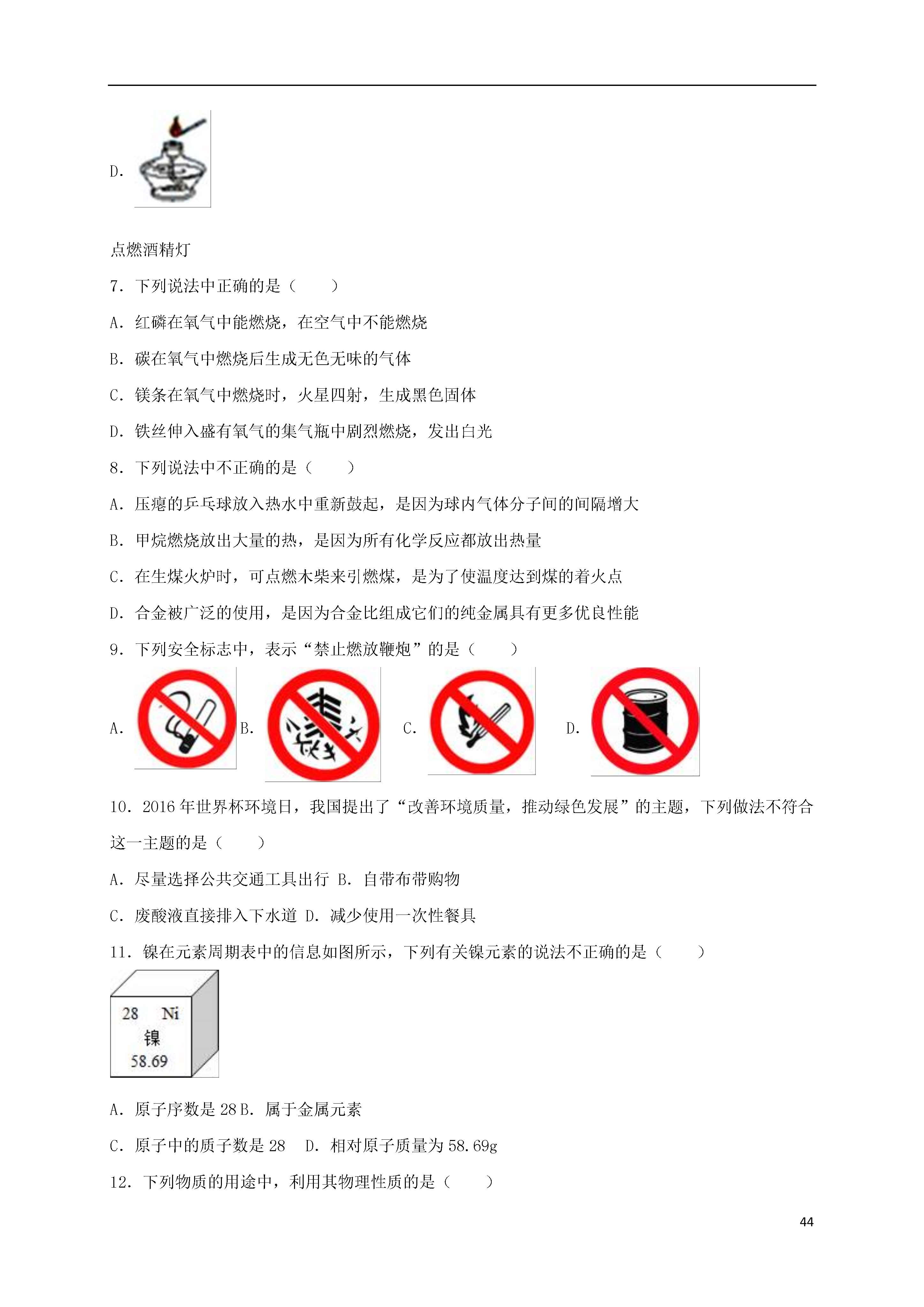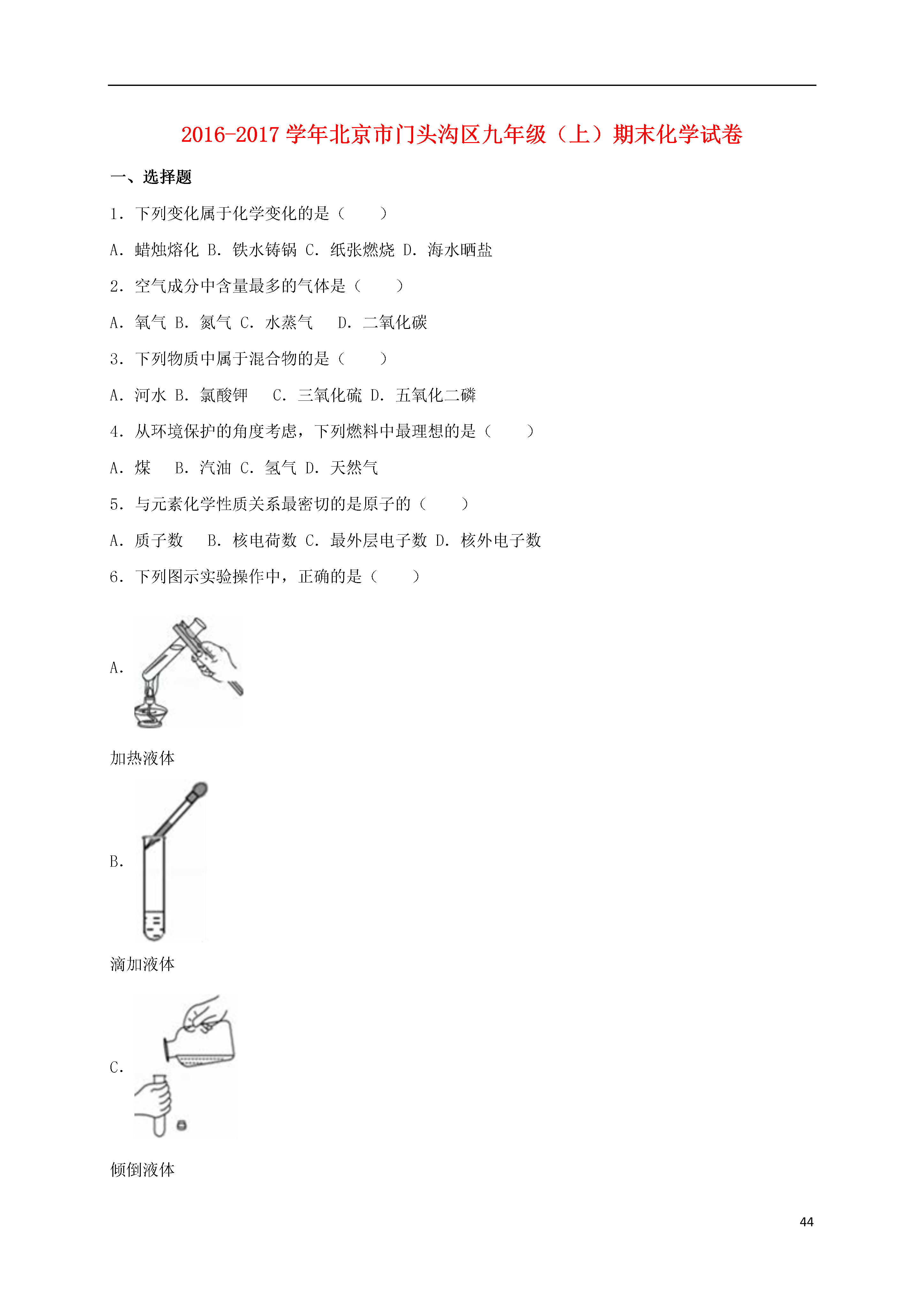 442016-2017学年北京市门头沟区九年级(上)期末化学试卷一、选择题1.下列变化属于化学变化的是()A.蜡烛熔化B.铁水铸锅C.纸张燃烧D.海水晒盐2.空气成分中含量最多的气体是()A.氧气B.氮气C.水蒸气D.二氧化碳3.下列物质中属于混合物的是()A.河水B.氯酸钾C.三氧化硫D.五氧化二磷4.从环境保护的角度考虑,下列燃料中最理想的是()A.煤B.汽油C.氢气D.天然气5.与元素化学性质关系最密切的是原子的()A.质子数B.核电荷数C.最外层电子数D.核外电子数6.下列图示实验操作中,正确的是()A.加热液体B.滴加液体C.倾倒液体D.点燃酒精灯7.下列说法中正确的是()A.红磷在氧气中能燃烧,在空气中不能燃烧B.碳在氧气中燃烧后生成无色无味的气体C.镁条在氧气中燃烧时,火星四射,生成黑色固体D.铁丝伸入盛有氧气的集气瓶中剧烈燃烧,发出白光8.下列说法中不正确的是()A.压瘪的乒乓球放入热水中重新鼓起,是因为球内气体分子间的间隔增大B.甲烷燃烧放出大量的热,是因为所有化学反应都放出热量C.在生煤火炉时,可点燃木柴来引燃煤,是为了使温度达到煤的着火点D.合金被广泛的使用,是因为合金比组成它们的纯金属具有更多优良性能9.下列安全标志中,表示“禁止燃放鞭炮”的是()A.B.C.D.10.2016年世界杯环境日,我国提出了“改善环境质量,推动绿色发展”的主题,下列做法不符合这一主题的是()A.尽量选择公共交通工具出行B.自带布带购物C.废酸液直接排入下水道D.减少使用一次性餐具11.镍在元素周期表中的信息如图所示,下列有关镍元素的说法不正确的是()A.原子序数是28B.属于金属元素C.原子中的质子数是28D.相对原子质量为58.69g12.下列物质的用途中,利用其物理性质的是()A.氧气用于炼钢B.镁粉用来作照明弹C.干冰用作制冷剂D.乙醇用作燃料13.下列关于S+O2SO2的理解不正确的是()A.表示硫与氧气在点燃条件下反应生成二氧化硫B.参加反应的硫与氧气的质量比是2:1C.反应前后硫原子、氧原子的个数均不变D.参加反应的氧气与生成的二氧化硫的分子个数比为1:114.一种铁原子的原子核内有26个质子和30个中子,该原子的核外电子数为()A.4B.26C.30D.5615.下列微粒中,能表示2个氢分子的是()A.2HB.2H+C.H2OD.2H216.下列实验方法一定能达到实验目的是()选项实验目的实验方法A检验一瓶气体是否为CO2将燃着的木条伸入瓶中B鉴别H2和CH4分别点燃,在火焰上方罩一干冷烧杯C鉴别硬水和软水煮沸D比较Zn、Cu、Ag的金属活动性将Zn和Ag分别放入CuSO4溶液中A.AB.BC.CD.D17.a、b两种物质的溶解度曲线如图所示.下列说法不正确的是()A.15℃时,a、b的溶解度均为20gB.加水或升温均可使b的饱和溶液变为不饱和溶液C.将30℃时a的不饱和溶液降温至15℃,溶质的质量分数可能变小也可能不变D.分别向100g水中加入20ga和b,升温至30℃,所得溶液b为饱和溶液,a为不饱和溶液18.某处控型食品保鲜剂以淀粉、二氧化硅(SiO2)为载体,吸附酒精制作而成,保鲜原理是酒精缓缓挥发,在食品周围形成一定浓度的气体保护层,下列说法不正确的是()A.SiO2中的Si的化合价为+4B.起保鲜作用的物质是酒精C.该保鲜剂不能与明火接触D.酒精挥发时分子体积变大19.2015年10月,我国科学家屠呦呦因发现青蒿素(C15H22O5)而获得诺贝尔医学奖.青蒿素是抗疟的有效成分,它是一种无色晶体,可溶于乙醇、乙醚,几乎不溶于水.屠呦呦在提取青蒿素时,发现加热过程中会破坏青蒿里面的有效成分,于是改用乙醚提取.下列关于青蒿素的说法不正确的是()A.青蒿素属于纯净物B.青蒿素由15个碳原子、22个氢原子和5个氧原子构成C.用乙醚提取青蒿素利用了青蒿素的溶解性D.青蒿素受热发生了化学反应20.下列图象不能正确反映对应变化关系的是()A.将水通电电解一段时间B.加热一定量的高锰酸钾固体C.向两份相等质量的块状大理石和粉末状大理石中分别加入过量的等浓度的稀盐酸D.向一定量的二氧化锰中加入过氧化氢溶液二、非选择题(共20个小题,共60分)21.五一劳动节,小萌一家利用假期整理家务.回答:Ⅰ.小萌来到阳台整理花草.(1)小萌用自来水浇花,自来水无色透明,它属于(填“混合物”或“纯净物”).(2)小萌发现栀子花长出了花蕾,闻到了香味,这是因为(从微观角度说明原因)Ⅱ.妈妈在卧室整理衣柜.(1)衣柜的材料中,属于合金的是(填字母序号,下同