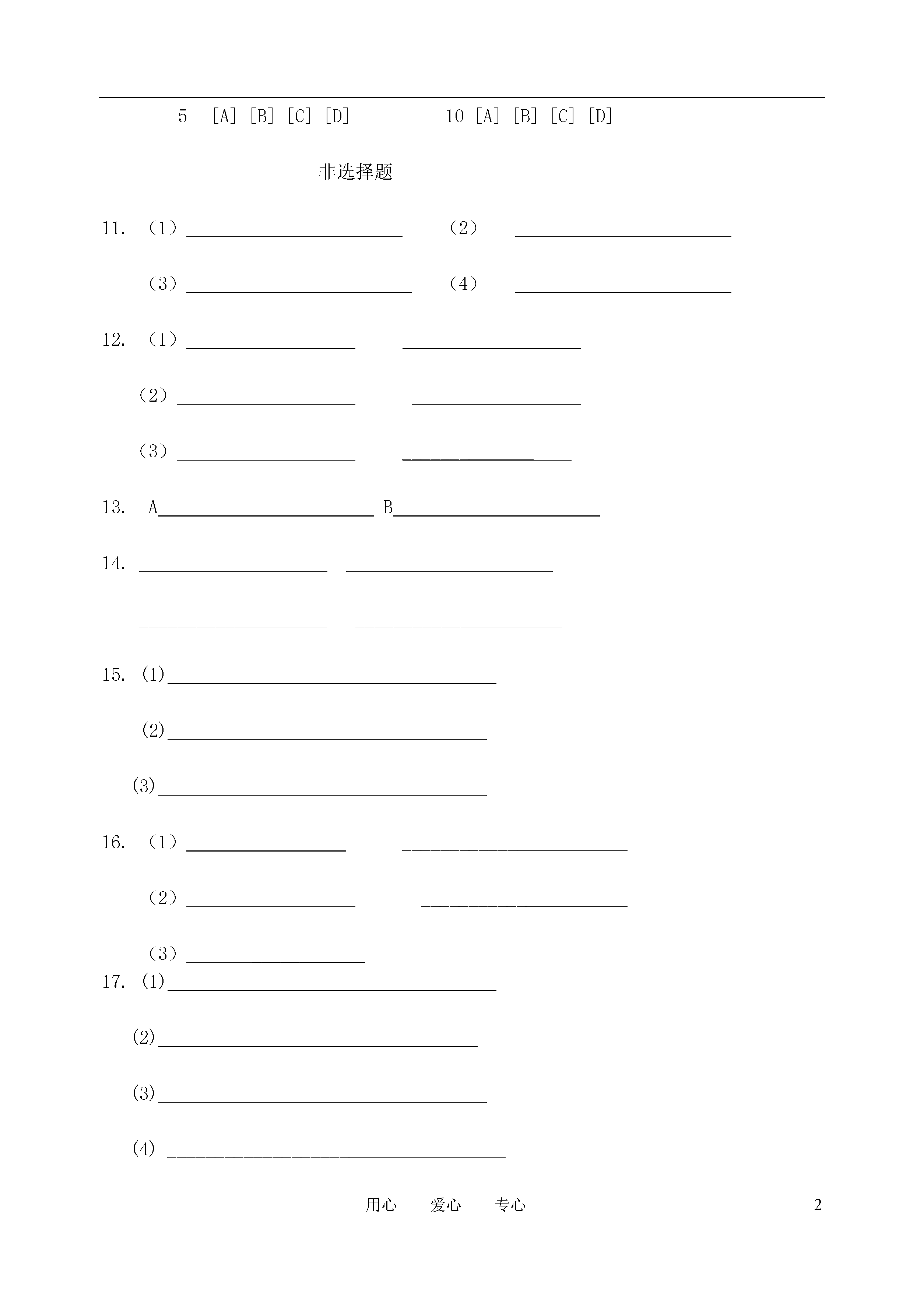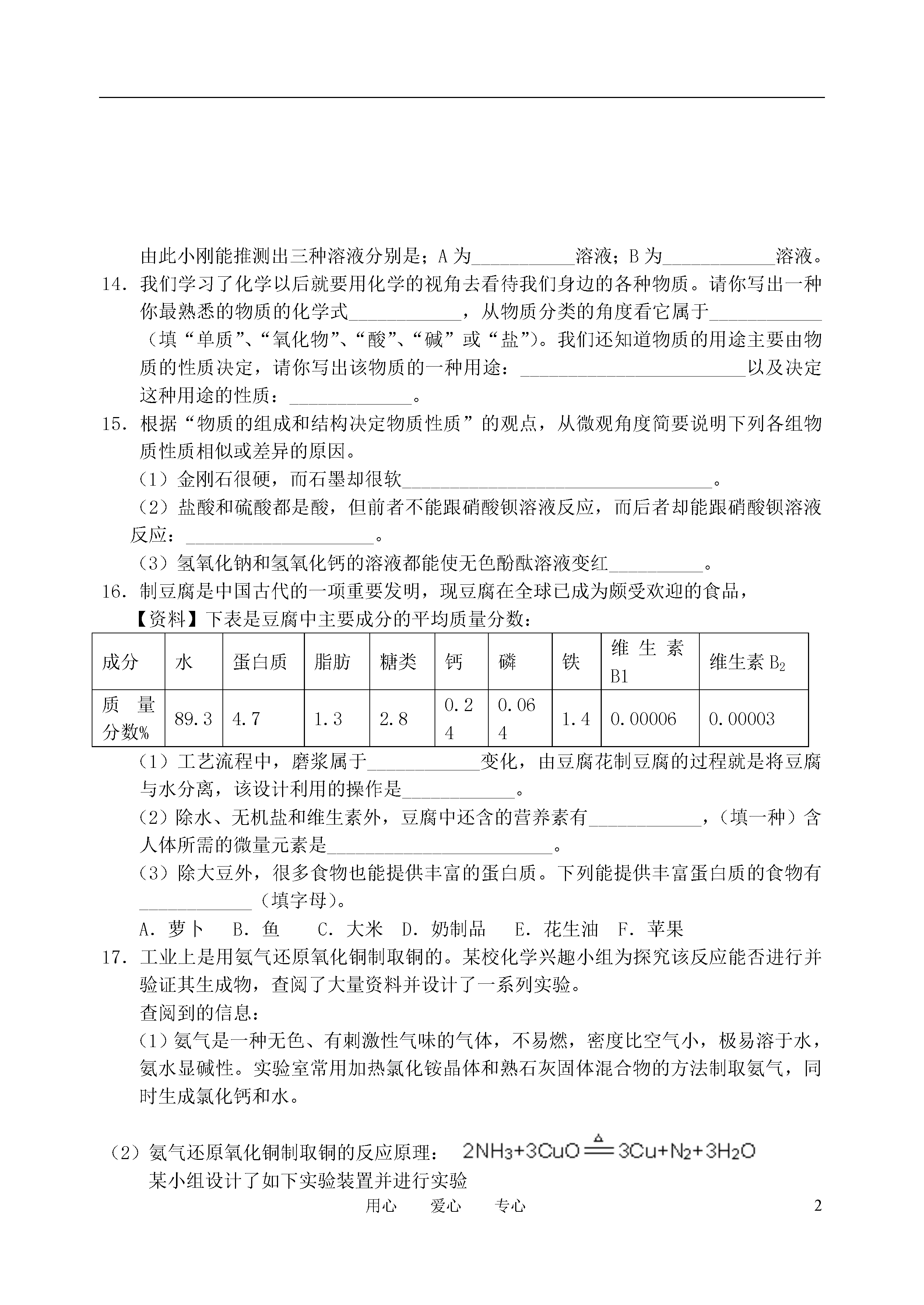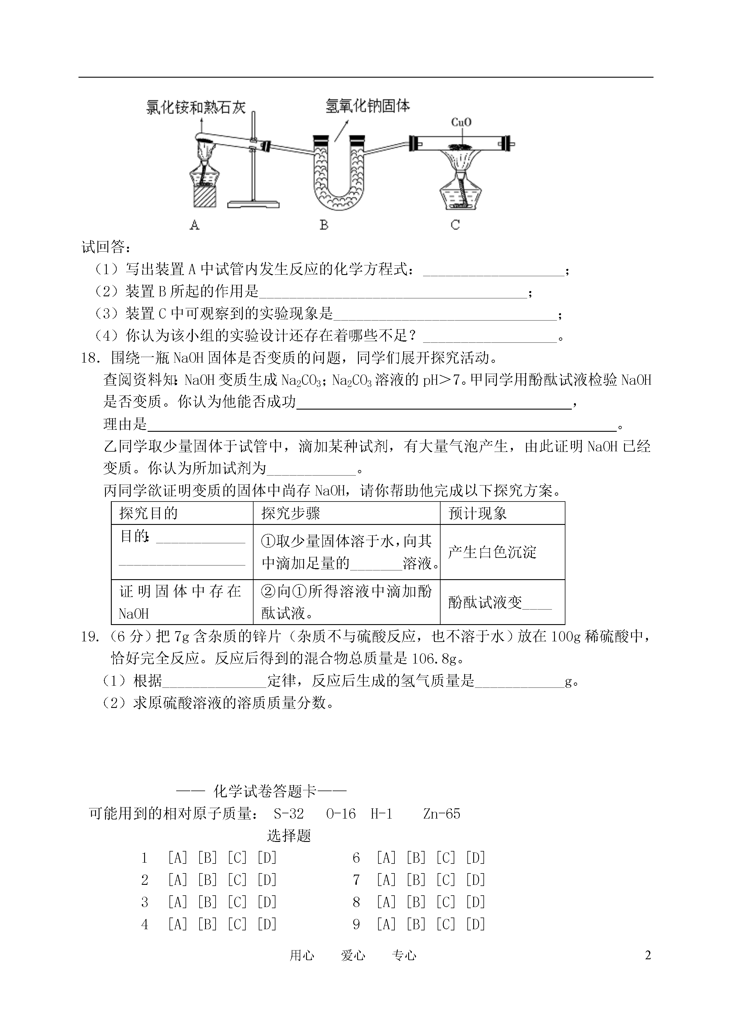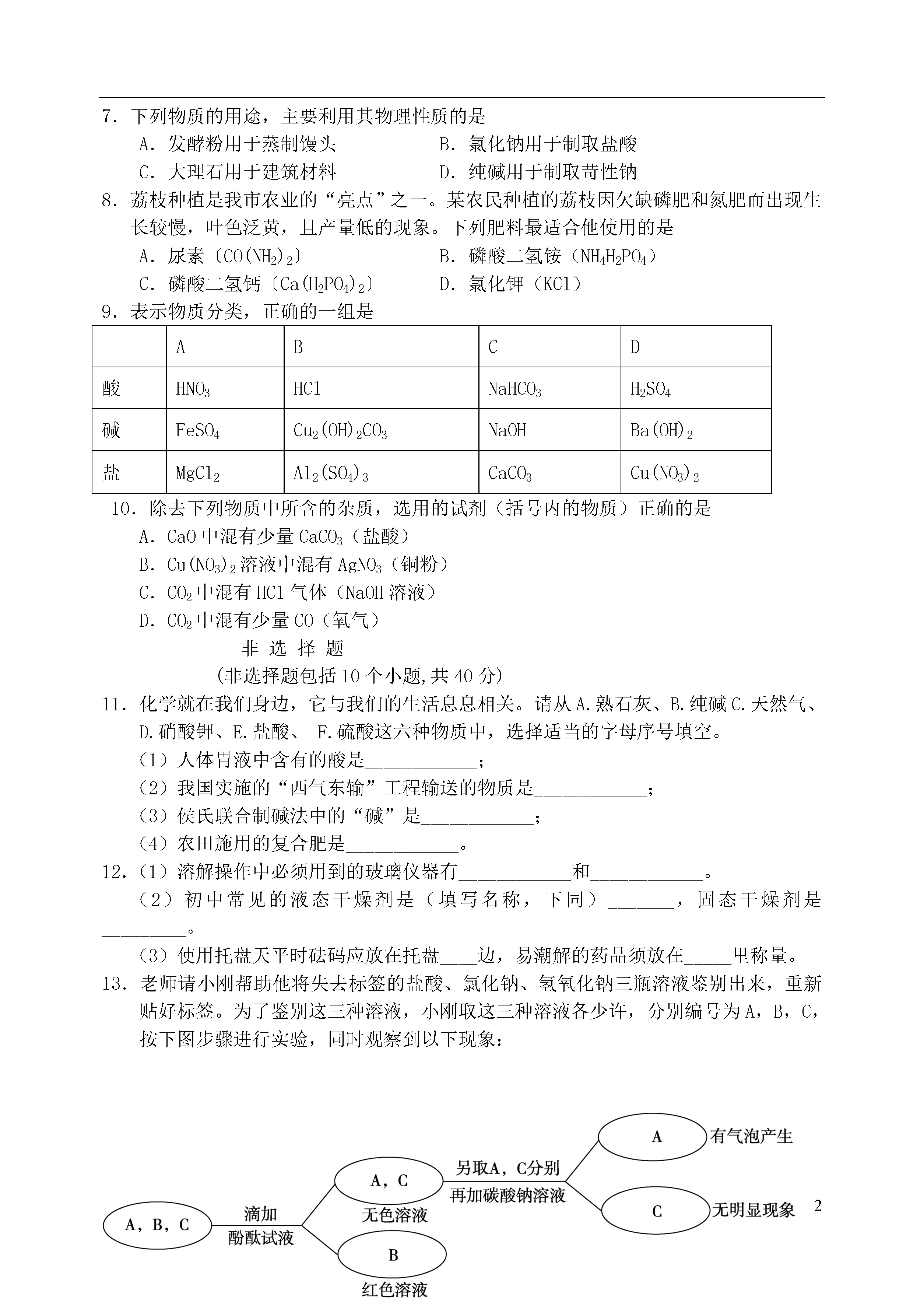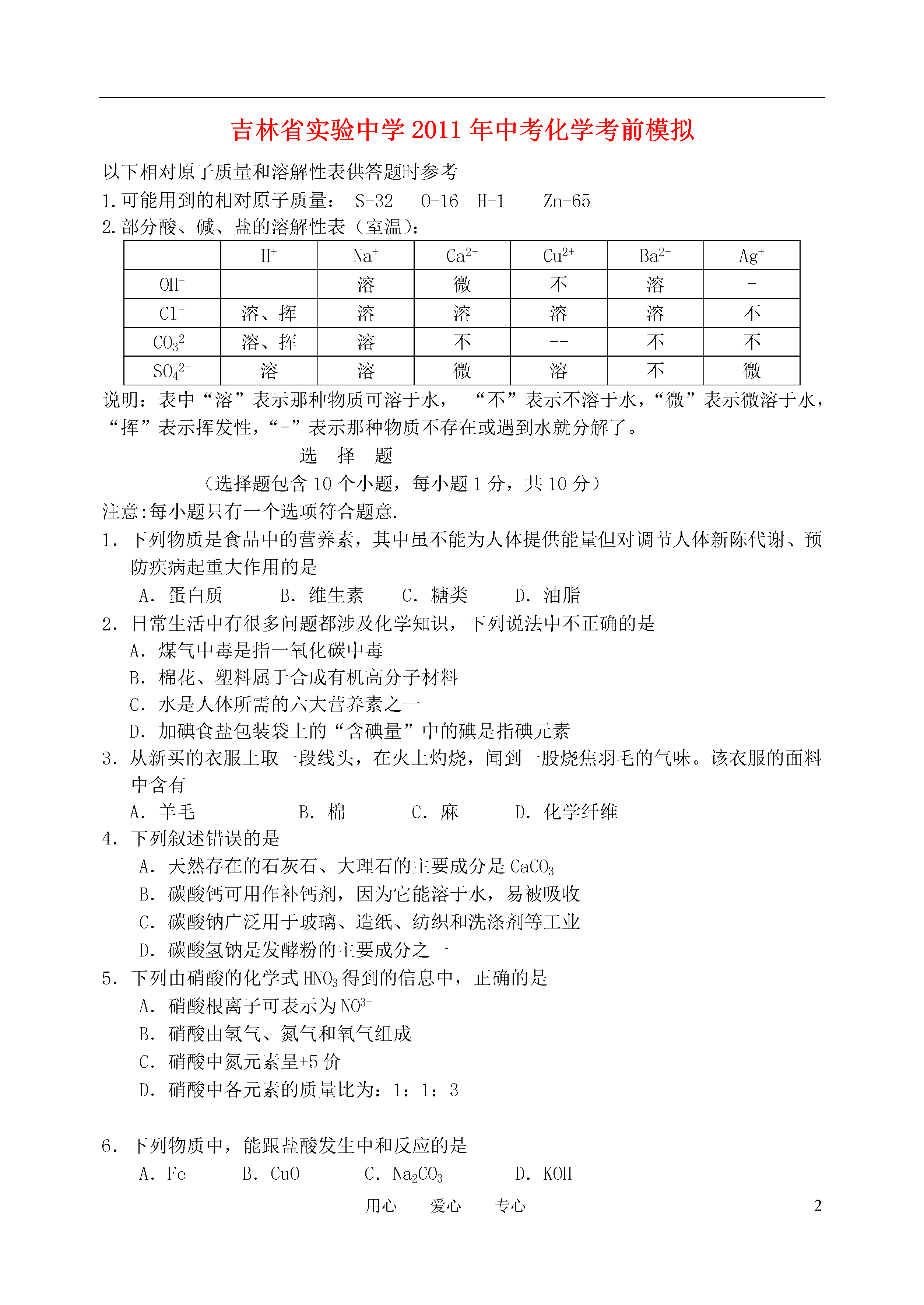 2用心爱心专心吉林省实验中学2011年中考化学考前模拟以下相对原子质量和溶解性表供答题时参考1.可能用到的相对原子质量:S-32O-16H-1Zn-652.部分酸、碱、盐的溶解性表(室温):H+Na+Ca2+Cu2+Ba2+Ag+OH-溶微不溶-Cl-溶、挥溶溶溶溶不CO32-溶、挥溶不--不不SO42-溶溶微溶不微说明:表中“溶”表示那种物质可溶于水,“不”表示不溶于水,“微”表示微溶于水,“挥”表示挥发性,“-”表示那种物质不存在或遇到水就分解了。选择题(选择题包含10个小题,每小题1分,共10分)注意:每小题只有一个选项符合题意.1.下列物质是食品中的营养素,其中虽不能为人体提供能量但对调节人体新陈代谢、预防疾病起重大作用的是A.蛋白质B.维生素C.糖类D.油脂2.日常生活中有很多问题都涉及化学知识,下列说法中不正确的是A.煤气中毒是指一氧化碳中毒B.棉花、塑料属于合成有机高分子材料C.水是人体所需的六大营养素之一D.加碘食盐包装袋上的“含碘量”中的碘是指碘元素3.从新买的衣服上取一段线头,在火上灼烧,闻到一股烧焦羽毛的气味。该衣服的面料中含有A.羊毛B.棉C.麻D.化学纤维4.下列叙述错误的是A.天然存在的石灰石、大理石的主要成分是CaCO3B.碳酸钙可用作补钙剂,因为它能溶于水,易被吸收C.碳酸钠广泛用于玻璃、造纸、纺织和洗涤剂等工业D.碳酸氢钠是发酵粉的主要成分之一5.下列由硝酸的化学式HNO3得到的信息中,正确的是A.硝酸根离子可表示为NO3-B.硝酸由氢气、氮气和氧气组成C.硝酸中氮元素呈+5价D.硝酸中各元素的质量比为:1:1:36.下列物质中,能跟盐酸发生中和反应的是A.FeB.CuOC.Na2CO3D.KOH7.下列物质的用途,主要利用其物理性质的是A.发酵粉用于蒸制馒头B.氯化钠用于制取盐酸C.大理石用于建筑材料D.纯碱用于制取苛性钠8.荔枝种植是我市农业的“亮点”之一。某农民种植的荔枝因欠缺磷肥和氮肥而出现生长较慢,叶色泛黄,且产量低的现象。下列肥料最适合他使用的是A.尿素〔CO(NH2)2〕B.磷酸二氢铵(NH4H2PO4)C.磷酸二氢钙〔Ca(H2PO4)2〕D.氯化钾(KCl)9.表示物质分类,正确的一组是ABCD酸HNO3HClNaHCO3H2SO4碱FeSO4Cu2(OH)2CO3NaOHBa(OH)2盐MgCl2Al2(SO4)3CaCO3Cu(NO3)210.除去下列物质中所含的杂质,选用的试剂(括号内的物质)正确的是A.CaO中混有少量CaCO3(盐酸)B.Cu(NO3)2溶液中混有AgNO3(铜粉)C.CO2中混有HCl气体(NaOH溶液)D.CO2中混有少量CO(氧气)非选择题(非选择题包括10个小题,共40分)11.化学就在我们身边,它与我们的生活息息相关。请从A.熟石灰、B.纯碱C.天然气、D.硝酸钾、E.盐酸、F.硫酸这六种物质中,选择适当的字母序号填空。(1)人体胃液中含有的酸是____________;(2)我国实施的“西气东输”工程输送的物质是____________;(3)侯氏联合制碱法中的“碱”是____________;(4)农田施用的复合肥是____________。12.(1)溶解操作中必须用到的玻璃仪器有____________和____________。(2)初中常见的液态干燥剂是(填写名称,下同)_______,固态干燥剂是_________。(3)使用托盘天平时砝码应放在托盘____边,易潮解的药品须放在_____里称量。13.老师请小刚帮助他将失去标签的盐酸、氯化钠、氢氧化钠三瓶溶液鉴别出来,重新贴好标签。为了鉴别这三种溶液,小刚取这三种溶液各少许,分别编号为A,B,C,按下图步骤进行实验,同时观察到以下现象:由此小刚能推测出三种溶液分别是;A为___________溶液;B为____________溶液。14.我们学习了化学以后就要用化学的视角去看待我们身边的各种物质。请你写出一种你最熟悉的物质的化学式____________,从物质分类的角度看它属于____________(填“单质”、“氧化物”、“酸”、“碱”或“盐”)。我们还知道物质的用途主要由物质的性质决定,请你写出该物质的一种用途:________________________以及决定这种用途的性质:_____________。15.根据“物质的组成和结构决定物质性质”的观点,从微观角度简要说明下列各组物质性质相似或差异的原因。(1)金刚石很硬,而石墨却很软_________________________________。(2)盐酸和硫