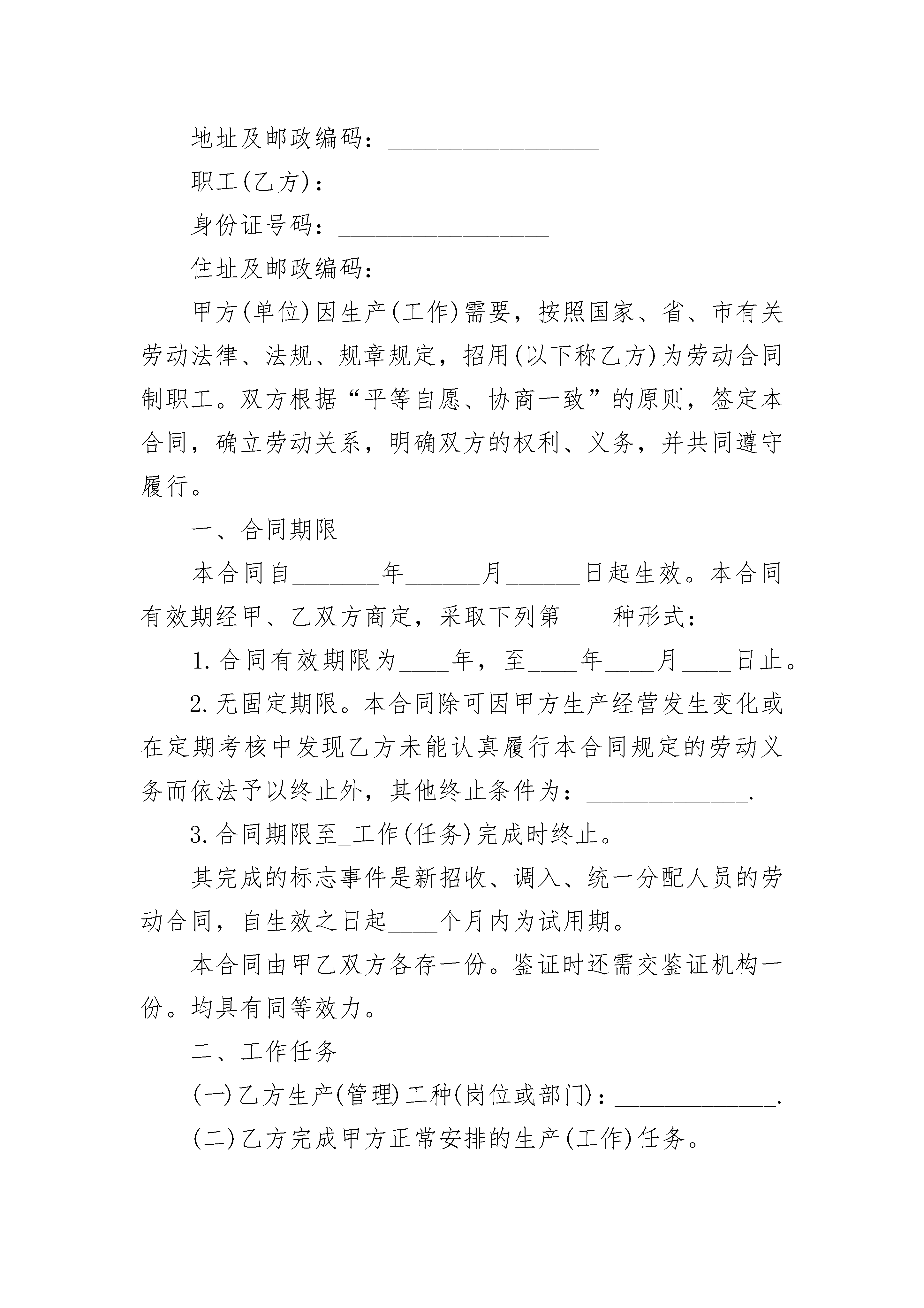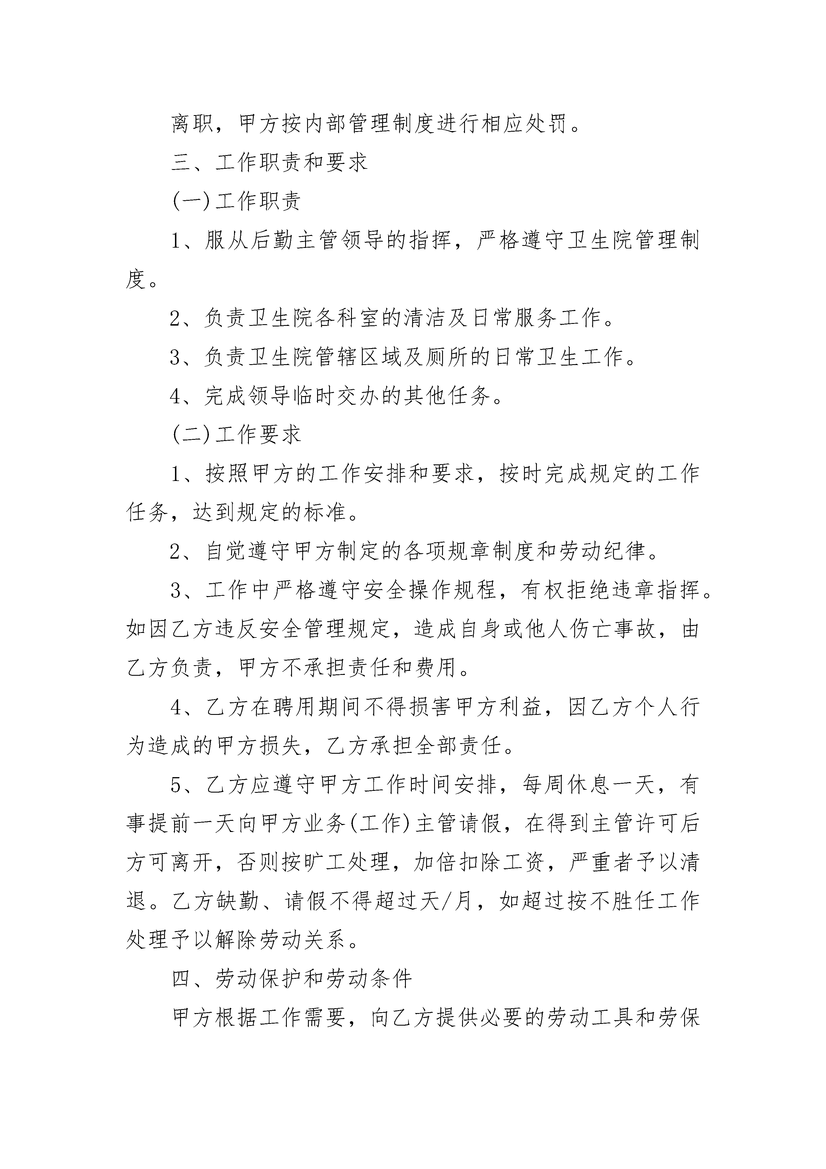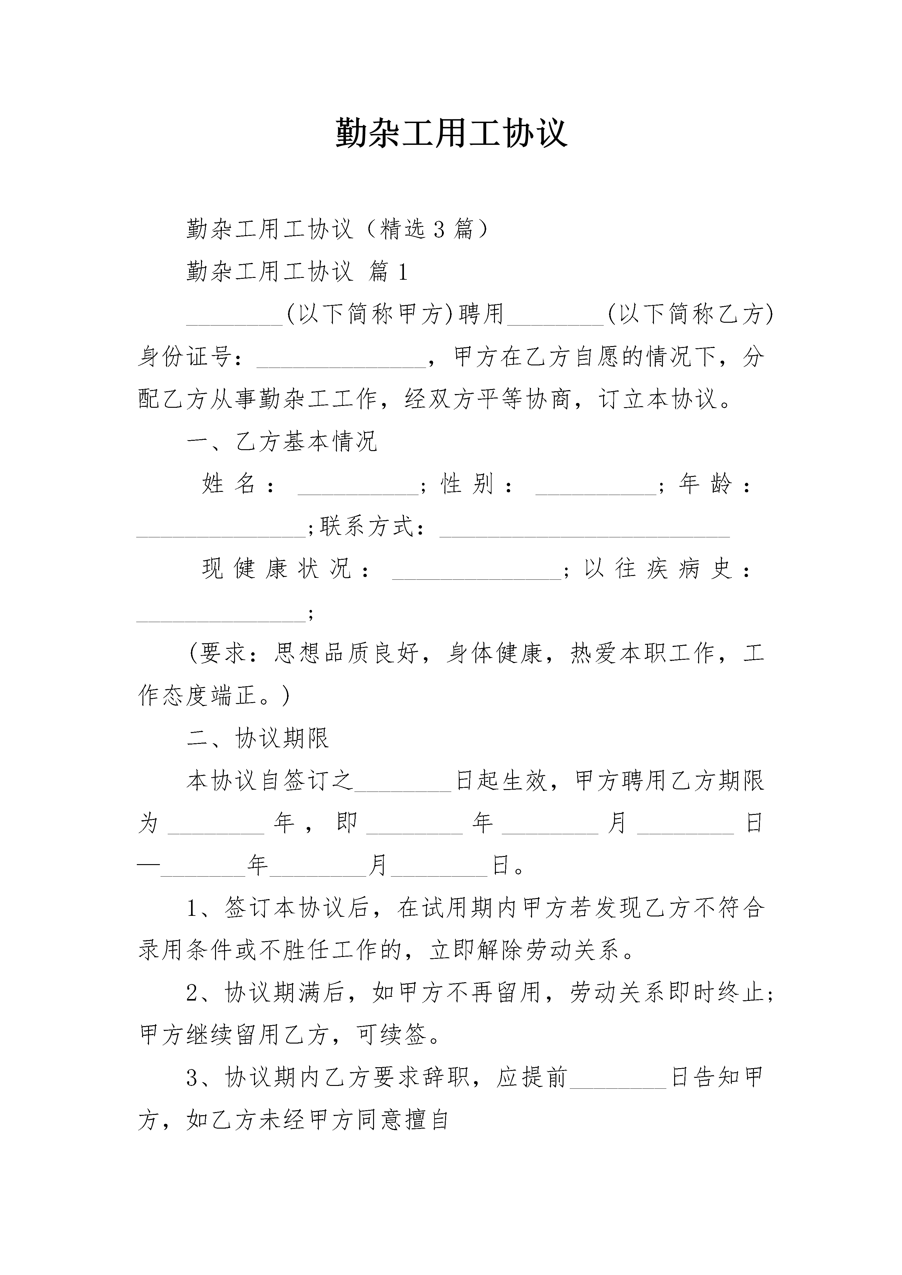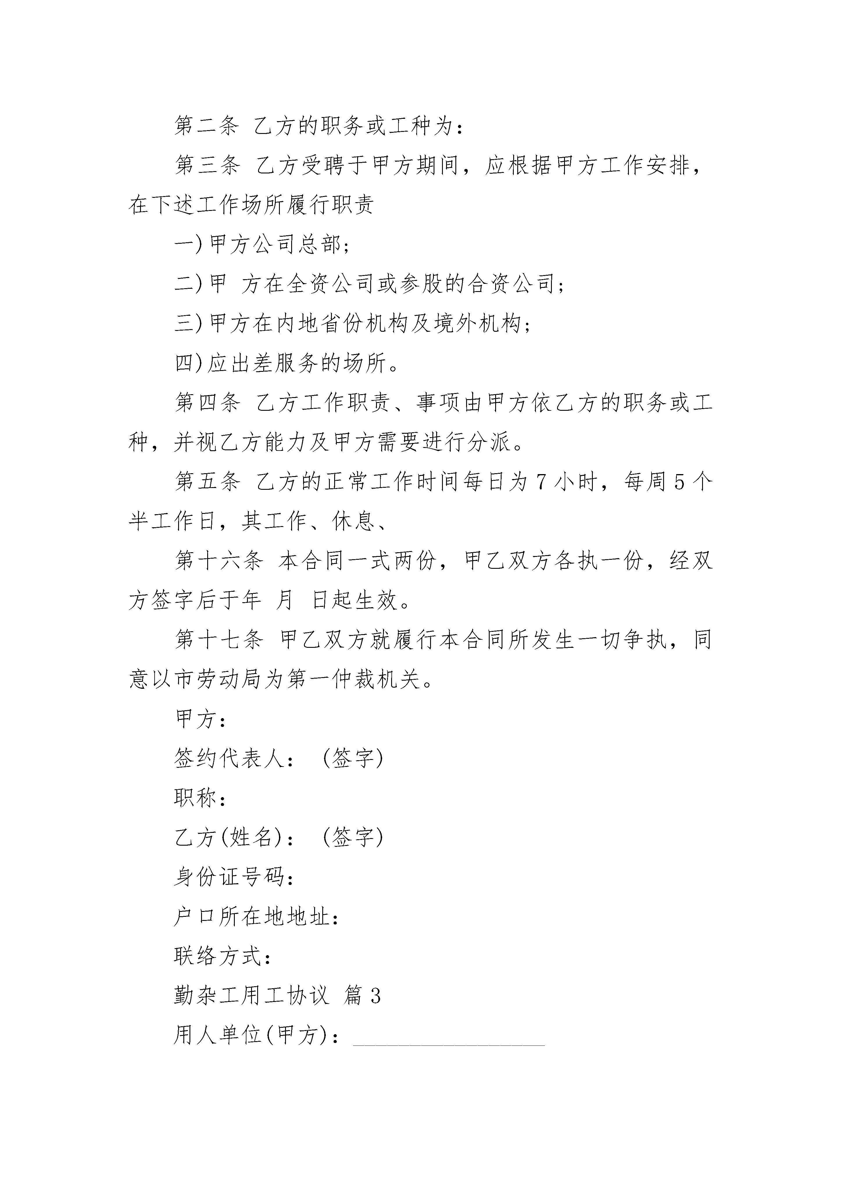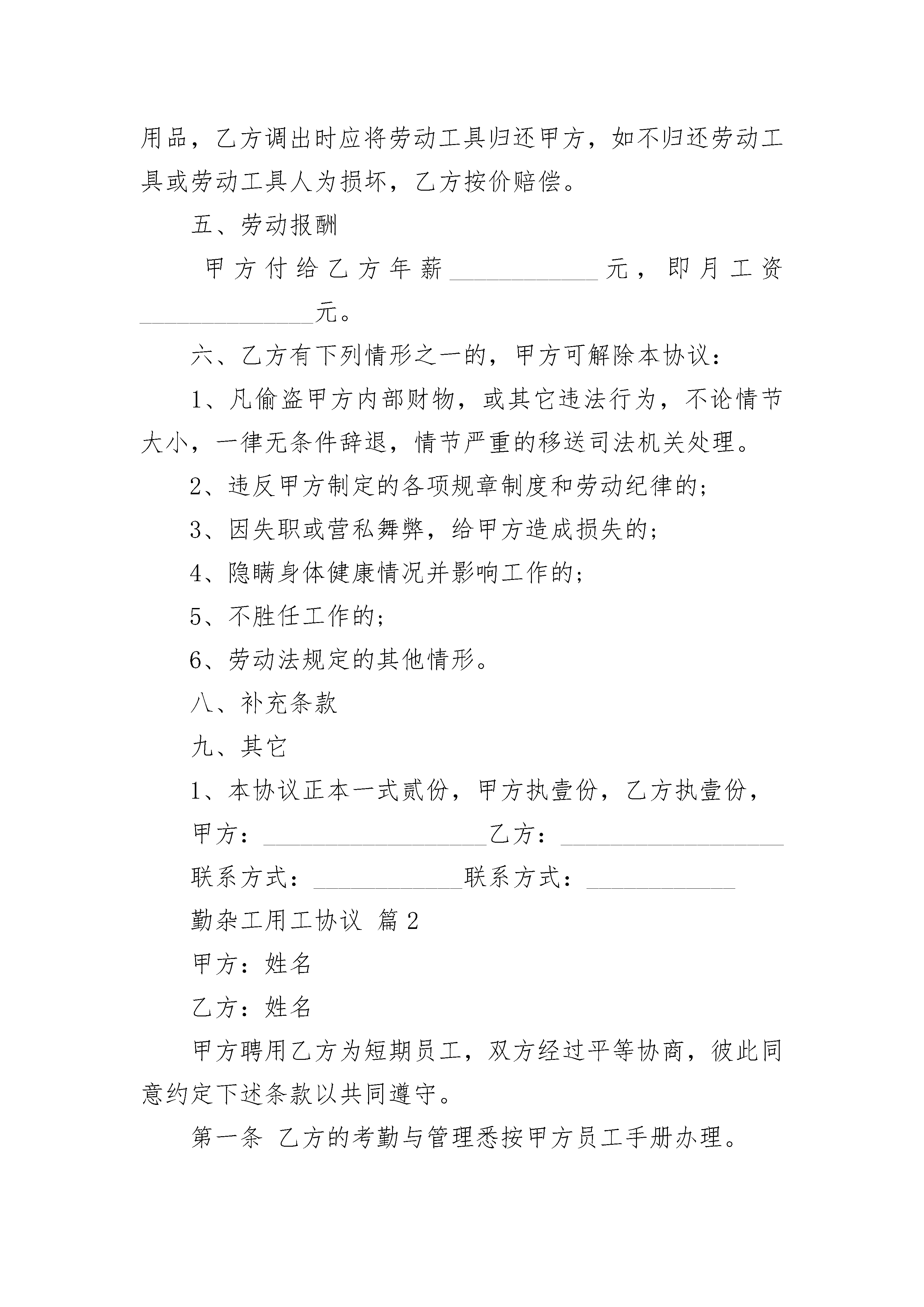 勤杂工用工协议勤杂工用工协议(精选3篇)勤杂工用工协议篇1________(以下简称甲方)聘用________(以下简称乙方)身份证号:______________,甲方在乙方自愿的情况下,分配乙方从事勤杂工工作,经双方平等协商,订立本协议。一、乙方基本情况姓名:__________;性别:__________;年龄:______________;联系方式:________________________现健康状况:______________;以往疾病史:______________;(要求:思想品质良好,身体健康,热爱本职工作,工作态度端正。)二、协议期限本协议自签订之________日起生效,甲方聘用乙方期限为________年,即________年________月________日—_______年________月________日。1、签订本协议后,在试用期内甲方若发现乙方不符合录用条件或不胜任工作的,立即解除劳动关系。2、协议期满后,如甲方不再留用,劳动关系即时终止;甲方继续留用乙方,可续签。3、协议期内乙方要求辞职,应提前________日告知甲方,如乙方未经甲方同意擅自离职,甲方按内部管理制度进行相应处罚。三、工作职责和要求(一)工作职责1、服从后勤主管领导的指挥,严格遵守卫生院管理制度。2、负责卫生院各科室的清洁及日常服务工作。3、负责卫生院管辖区域及厕所的日常卫生工作。4、完成领导临时交办的其他任务。(二)工作要求1、按照甲方的工作安排和要求,按时完成规定的工作任务,达到规定的标准。2、自觉遵守甲方制定的各项规章制度和劳动纪律。3、工作中严格遵守安全操作规程,有权拒绝违章指挥。如因乙方违反安全管理规定,造成自身或他人伤亡事故,由乙方负责,甲方不承担责任和费用。4、乙方在聘用期间不得损害甲方利益,因乙方个人行为造成的甲方损失,乙方承担全部责任。5、乙方应遵守甲方工作时间安排,每周休息一天,有事提前一天向甲方业务(工作)主管请假,在得到主管许可后方可离开,否则按旷工处理,加倍扣除工资,严重者予以清退。乙方缺勤、请假不得超过天/月,如超过按不胜任工作处理予以解除劳动关系。四、劳动保护和劳动条件甲方根据工作需要,向乙方提供必要的劳动工具和劳保用品,乙方调出时应将劳动工具归还甲方,如不归还劳动工具或劳动工具人为损坏,乙方按价赔偿。五、劳动报酬甲方付给乙方年薪____________元,即月工资______________元。六、乙方有下列情形之一的,甲方可解除本协议:1、凡偷盗甲方内部财物,或其它违法行为,不论情节大小,一律无条件辞退,情节严重的移送司法机关处理。2、违反甲方制定的各项规章制度和劳动纪律的;3、因失职或营私舞弊,给甲方造成损失的;4、隐瞒身体健康情况并影响工作的;5、不胜任工作的;6、劳动法规定的其他情形。八、补充条款九、其它1、本协议正本一式贰份,甲方执壹份,乙方执壹份,甲方:__________________乙方:__________________联系方式:____________联系方式:____________勤杂工用工协议篇2甲方:姓名乙方:姓名甲方聘用乙方为短期员工,双方经过平等协商,彼此同意约定下述条款以共同遵守。第一条乙方的考勤与管理悉按甲方员工手册办理。第二条乙方的职务或工种为:第三条乙方受聘于甲方期间,应根据甲方工作安排,在下述工作场所履行职责一)甲方公司总部;二)甲方在全资公司或参股的合资公司;三)甲方在内地省份机构及境外机构;四)应出差服务的场所。第四条乙方工作职责、事项由甲方依乙方的职务或工种,并视乙方能力及甲方需要进行分派。第五条乙方的正常工作时间每日为7小时,每周5个半工作日,其工作、休息、第十六条本合同一式两份,甲乙双方各执一份,经双方签字后于年月日起生效。第十七条甲乙双方就履行本合同所发生一切争执,同意以市劳动局为第一仲裁机关。甲方:签约代表人:(签字)职称:乙方(姓名):(签字)身份证号码:户口所在地地址:联络方式:勤杂工用工协议篇3用人单位(甲方):_________________地址及邮政编码:_________________职工(乙方):_________________身份证号码:_________________住址及邮政编码:_________________甲方(单位)因生产(工作)需要,按照国家、省、市有关劳动法律、法规、规章规定,招用(以下称乙方)为劳动合同制职工。双方根据“平等自愿、协商一致”的原则,签定本合同,确立劳动关系,明确双方的权利、义务,并共同遵守履行。一、合同期限本合同自_______年______月______日起生效。本合同有效期经甲、乙双方商定,采取下列第____种形式:1.合同有效期限为____年,至____年