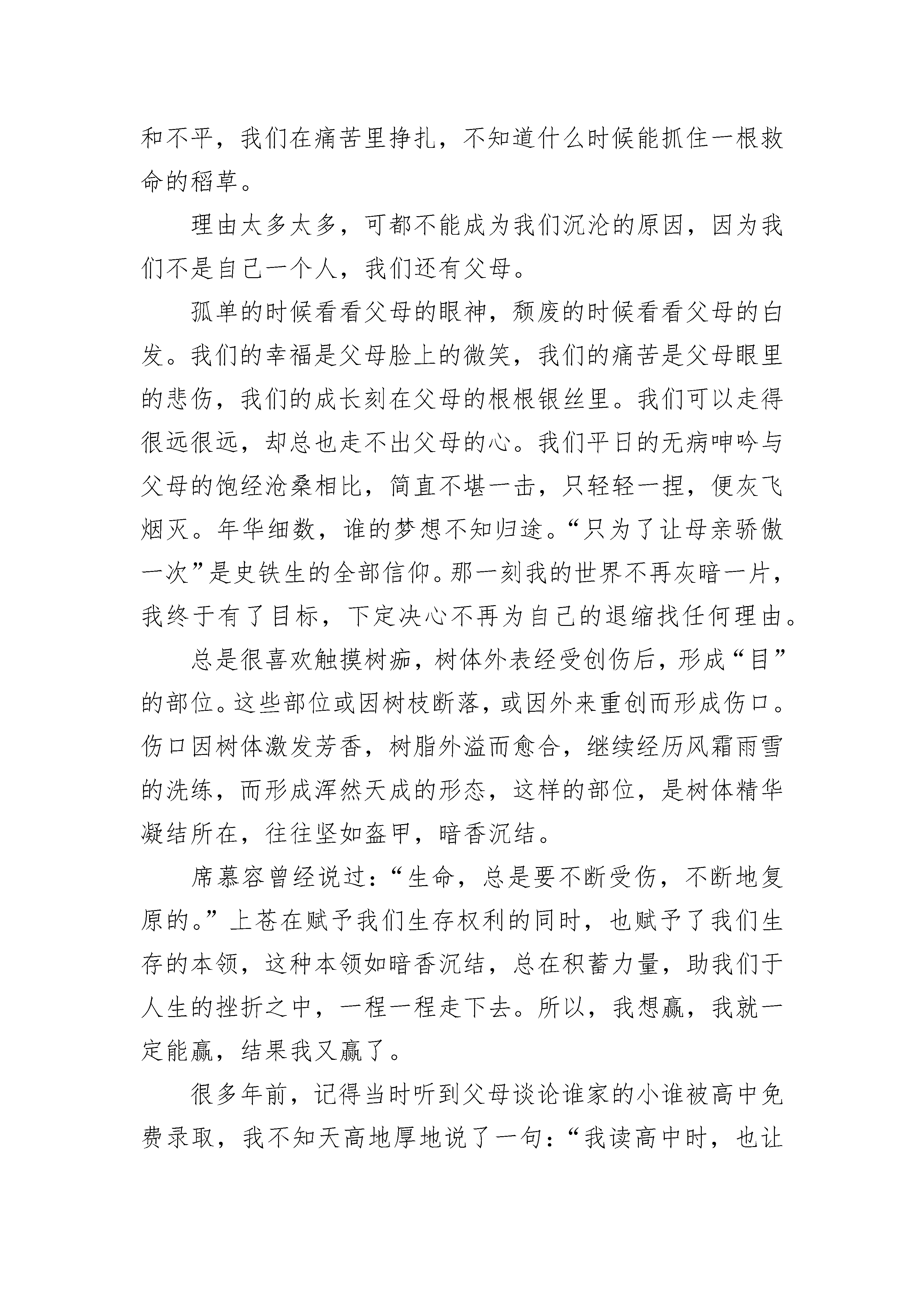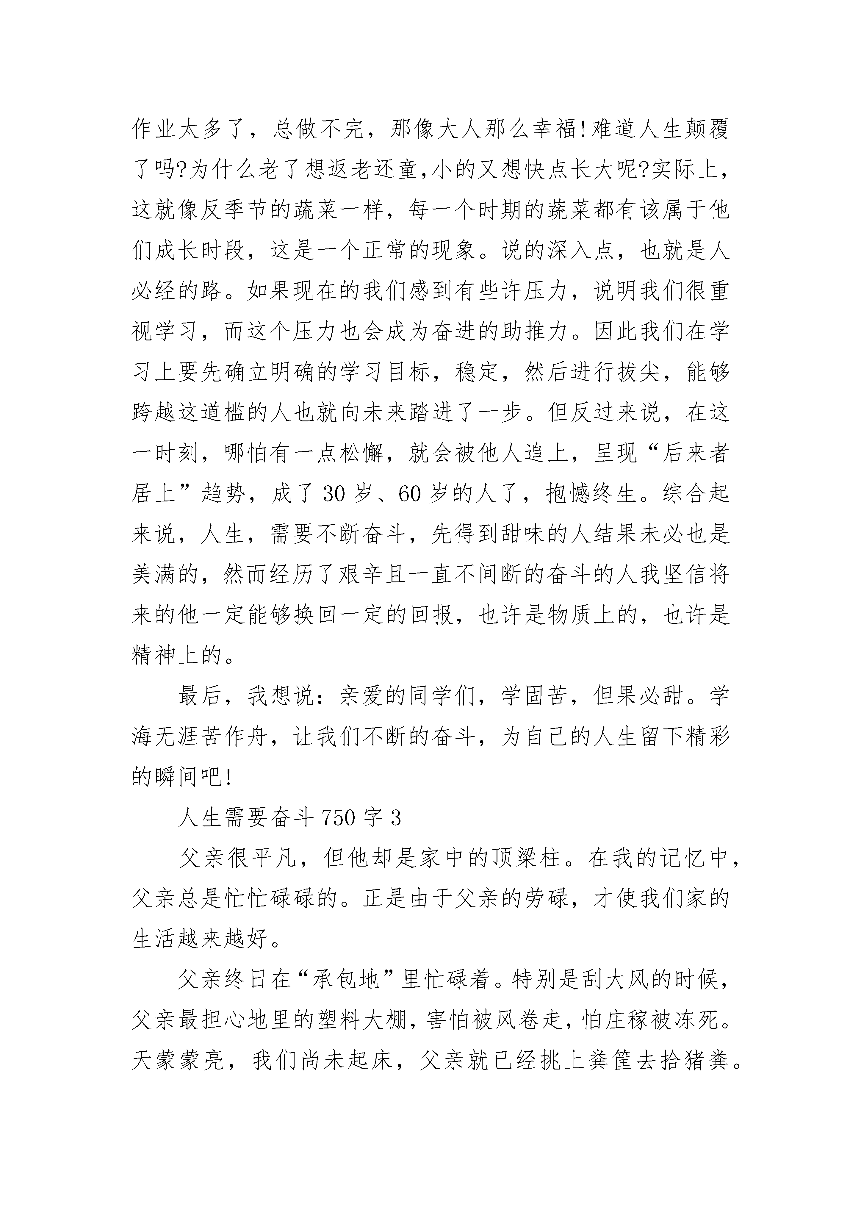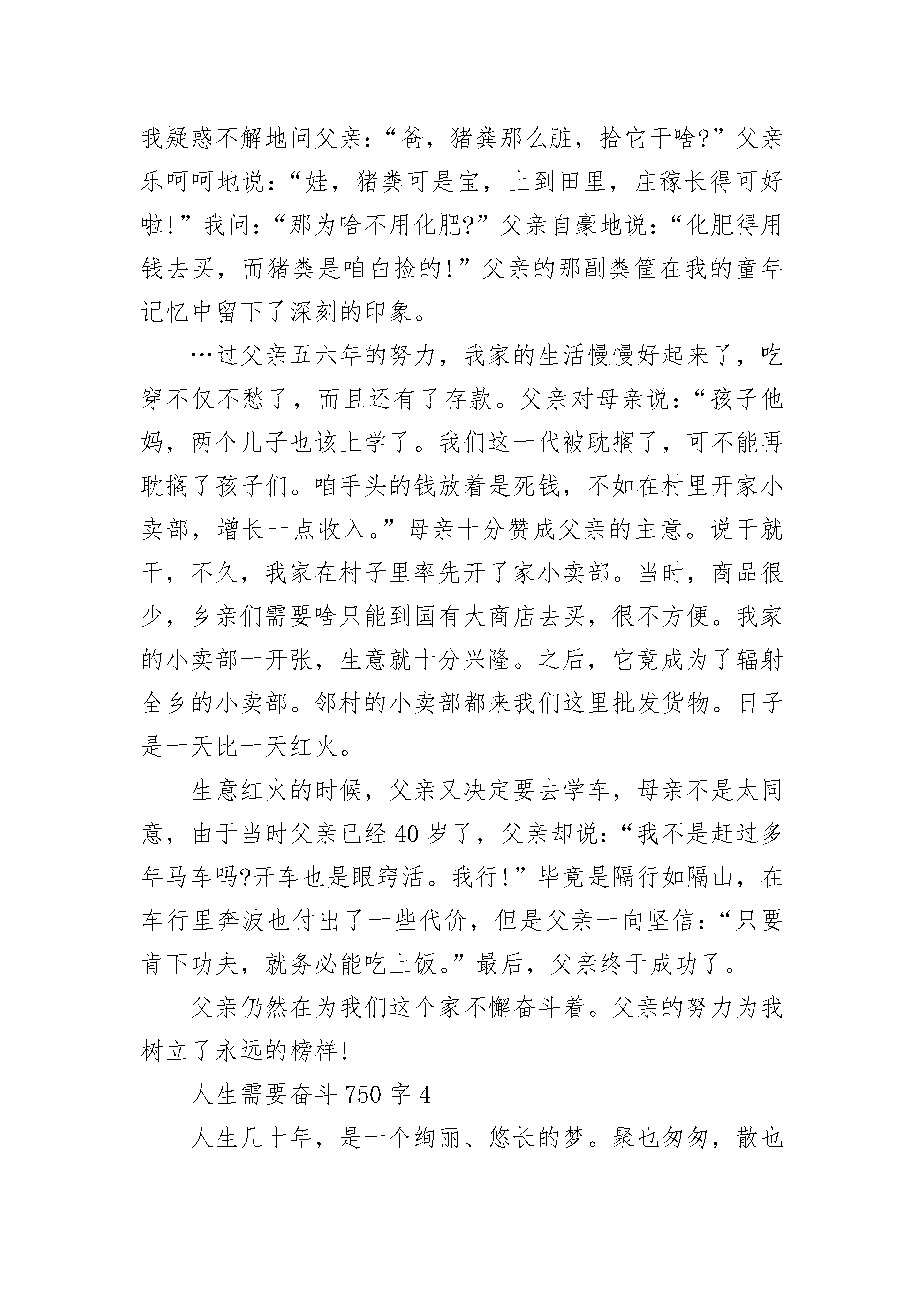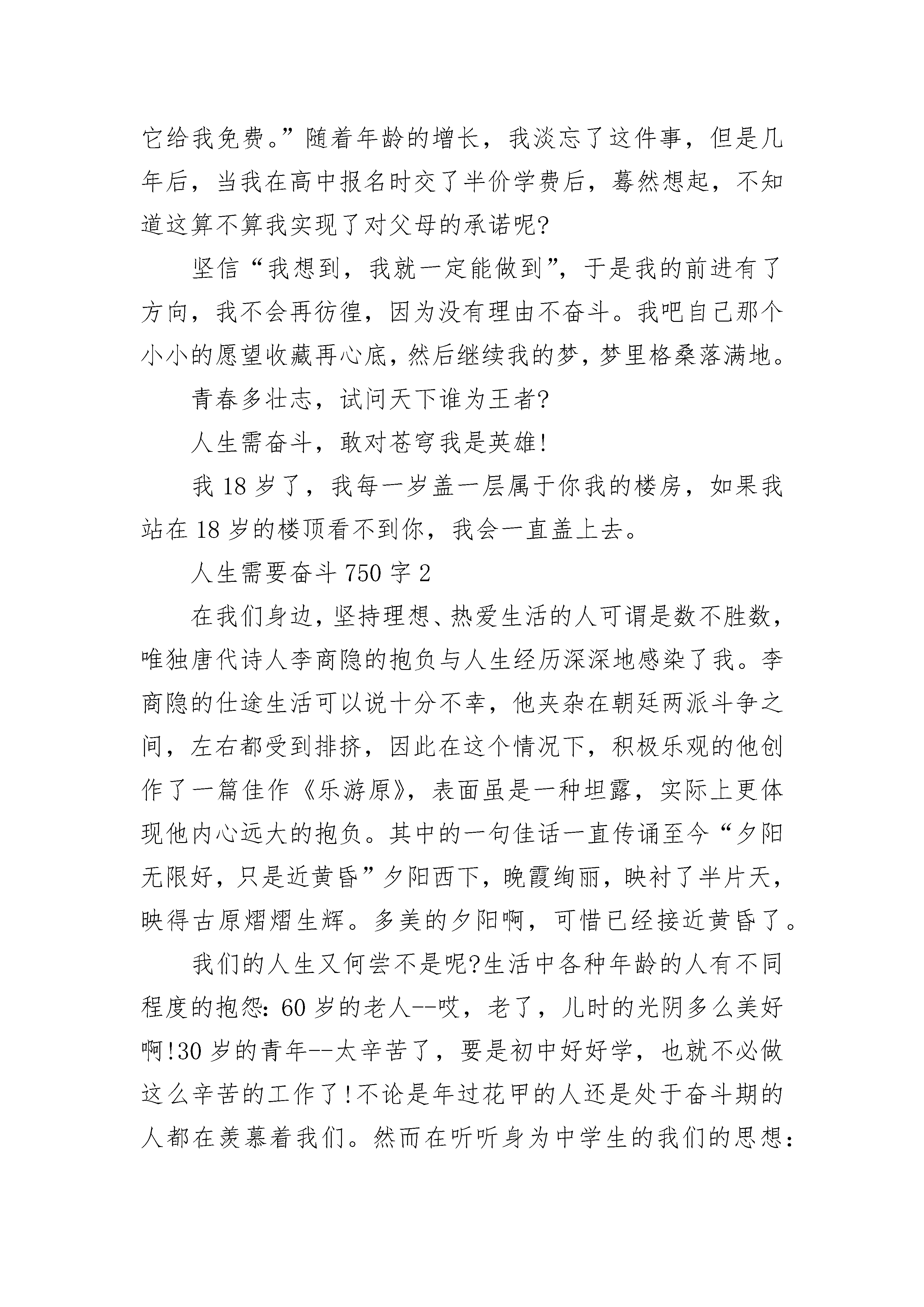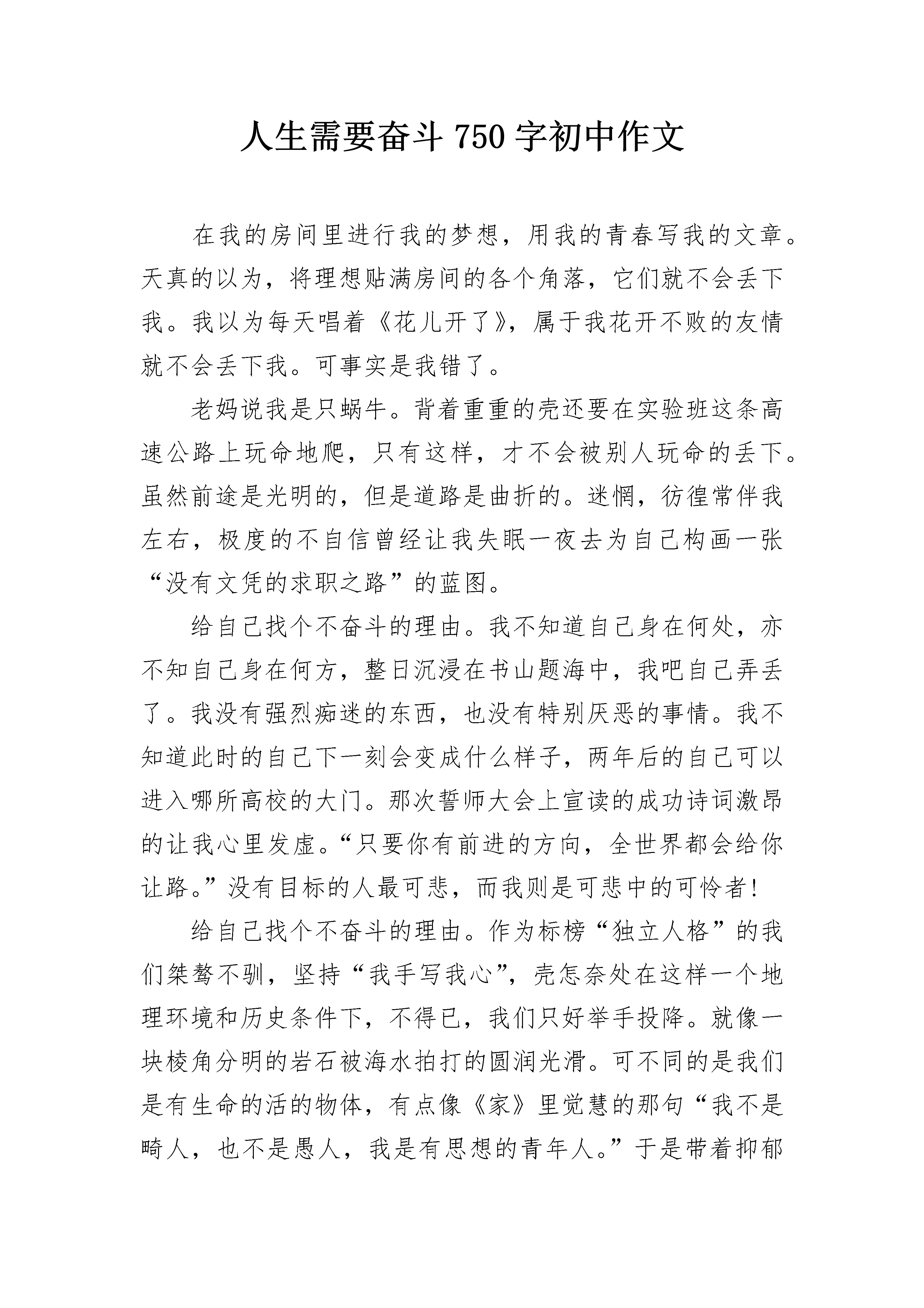 人生需要奋斗750字初中作文在我的房间里进行我的梦想,用我的青春写我的文章。天真的以为,将理想贴满房间的各个角落,它们就不会丢下我。我以为每天唱着《花儿开了》,属于我花开不败的友情就不会丢下我。可事实是我错了。老妈说我是只蜗牛。背着重重的壳还要在实验班这条高速公路上玩命地爬,只有这样,才不会被别人玩命的丢下。虽然前途是光明的,但是道路是曲折的。迷惘,彷徨常伴我左右,极度的不自信曾经让我失眠一夜去为自己构画一张“没有文凭的求职之路”的蓝图。给自己找个不奋斗的理由。我不知道自己身在何处,亦不知自己身在何方,整日沉浸在书山题海中,我吧自己弄丢了。我没有强烈痴迷的东西,也没有特别厌恶的事情。我不知道此时的自己下一刻会变成什么样子,两年后的自己可以进入哪所高校的大门。那次誓师大会上宣读的成功诗词激昂的让我心里发虚。“只要你有前进的方向,全世界都会给你让路。”没有目标的人最可悲,而我则是可悲中的可怜者!给自己找个不奋斗的理由。作为标榜“独立人格”的我们桀骜不驯,坚持“我手写我心”,壳怎奈处在这样一个地理环境和历史条件下,不得已,我们只好举手投降。就像一块棱角分明的岩石被海水拍打的圆润光滑。可不同的是我们是有生命的活的物体,有点像《家》里觉慧的那句“我不是畸人,也不是愚人,我是有思想的青年人。”于是带着抑郁和不平,我们在痛苦里挣扎,不知道什么时候能抓住一根救命的稻草。理由太多太多,可都不能成为我们沉沦的原因,因为我们不是自己一个人,我们还有父母。孤单的时候看看父母的眼神,颓废的时候看看父母的白发。我们的幸福是父母脸上的微笑,我们的痛苦是父母眼里的悲伤,我们的成长刻在父母的根根银丝里。我们可以走得很远很远,却总也走不出父母的心。我们平日的无病呻吟与父母的饱经沧桑相比,简直不堪一击,只轻轻一捏,便灰飞烟灭。年华细数,谁的梦想不知归途。“只为了让母亲骄傲一次”是史铁生的全部信仰。那一刻我的世界不再灰暗一片,我终于有了目标,下定决心不再为自己的退缩找任何理由。总是很喜欢触摸树痂,树体外表经受创伤后,形成“目”的部位。这些部位或因树枝断落,或因外来重创而形成伤口。伤口因树体激发芳香,树脂外溢而愈合,继续经历风霜雨雪的洗练,而形成浑然天成的形态,这样的部位,是树体精华凝结所在,往往坚如盔甲,暗香沉结。席慕容曾经说过:“生命,总是要不断受伤,不断地复原的。”上苍在赋予我们生存权利的同时,也赋予了我们生存的本领,这种本领如暗香沉结,总在积蓄力量,助我们于人生的挫折之中,一程一程走下去。所以,我想赢,我就一定能赢,结果我又赢了。很多年前,记得当时听到父母谈论谁家的小谁被高中免费录取,我不知天高地厚地说了一句:“我读高中时,也让它给我免费。”随着年龄的增长,我淡忘了这件事,但是几年后,当我在高中报名时交了半价学费后,蓦然想起,不知道这算不算我实现了对父母的承诺呢?坚信“我想到,我就一定能做到”,于是我的前进有了方向,我不会再彷徨,因为没有理由不奋斗。我吧自己那个小小的愿望收藏再心底,然后继续我的梦,梦里格桑落满地。青春多壮志,试问天下谁为王者?人生需奋斗,敢对苍穹我是英雄!我18岁了,我每一岁盖一层属于你我的楼房,如果我站在18岁的楼顶看不到你,我会一直盖上去。人生需要奋斗750字2在我们身边,坚持理想、热爱生活的人可谓是数不胜数,唯独唐代诗人李商隐的抱负与人生经历深深地感染了我。李商隐的仕途生活可以说十分不幸,他夹杂在朝廷两派斗争之间,左右都受到排挤,因此在这个情况下,积极乐观的他创作了一篇佳作《乐游原》,表面虽是一种坦露,实际上更体现他内心远大的抱负。其中的一句佳话一直传诵至今“夕阳无限好,只是近黄昏”夕阳西下,晚霞绚丽,映衬了半片天,映得古原熠熠生辉。多美的夕阳啊,可惜已经接近黄昏了。我们的人生又何尝不是呢?生活中各种年龄的人有不同程度的抱怨:60岁的老人--哎,老了,儿时的光阴多么美好啊!30岁的青年--太辛苦了,要是初中好好学,也就不必做这么辛苦的工作了!不论是年过花甲的人还是处于奋斗期的人都在羡慕着我们。然而在听听身为中学生的我们的思想:作业太多了,总做不完,那像大人那么幸福!难道人生颠覆了吗?为什么老了想返老还童,小的又想快点长大呢?实际上,这就像反季节的蔬菜一样,每一个时期的蔬菜都有该属于他们成长时段,这是一个正常的现象。说的深入点,也就是人必经的路。如果现在的我们感到有些许压力,说明我们很重视学习,而这个压力也会成为奋进的助推力。因此我们在学习上要先确立明确的学习目标,稳定,然后进行拔尖,能够跨越这道槛的人也就向未来踏进了一步。但反过来说,在这一时刻,哪怕有一点松懈,就会被他人追上,呈现“后来者居上”趋势,成了30岁、60岁的人了,抱憾终生。综合起来说,人生,需要不断奋斗,先得到甜味的人结果未必也是美满的,然而经历了艰辛且一直不间断的奋斗