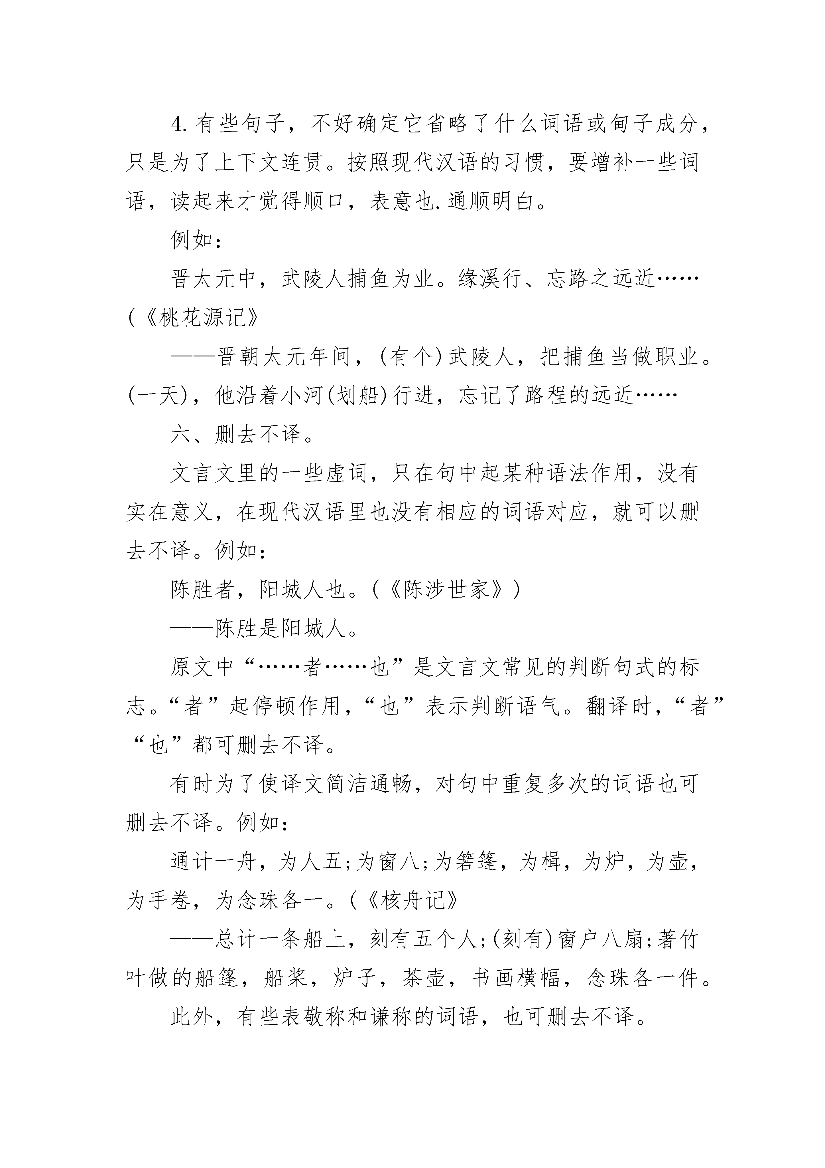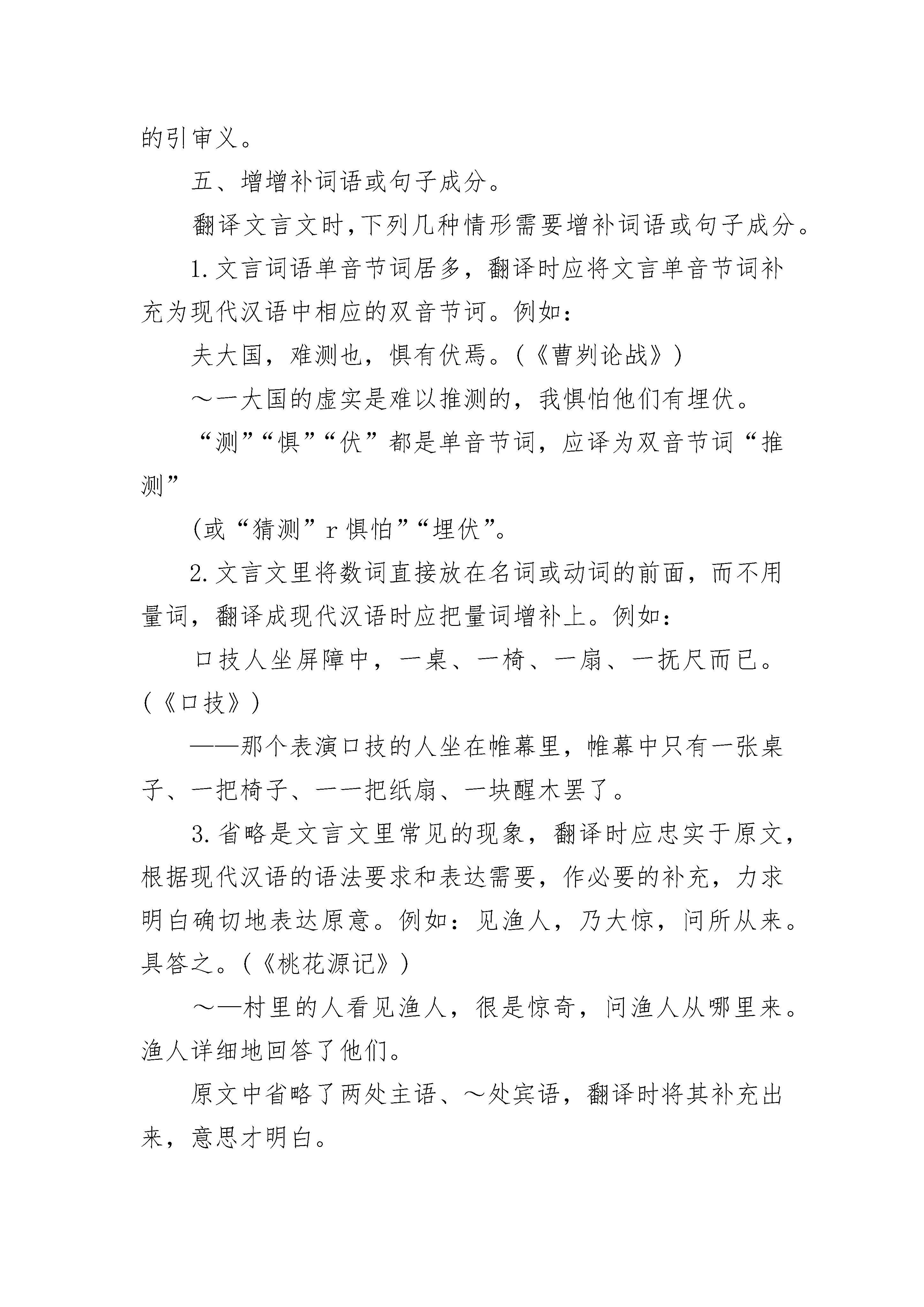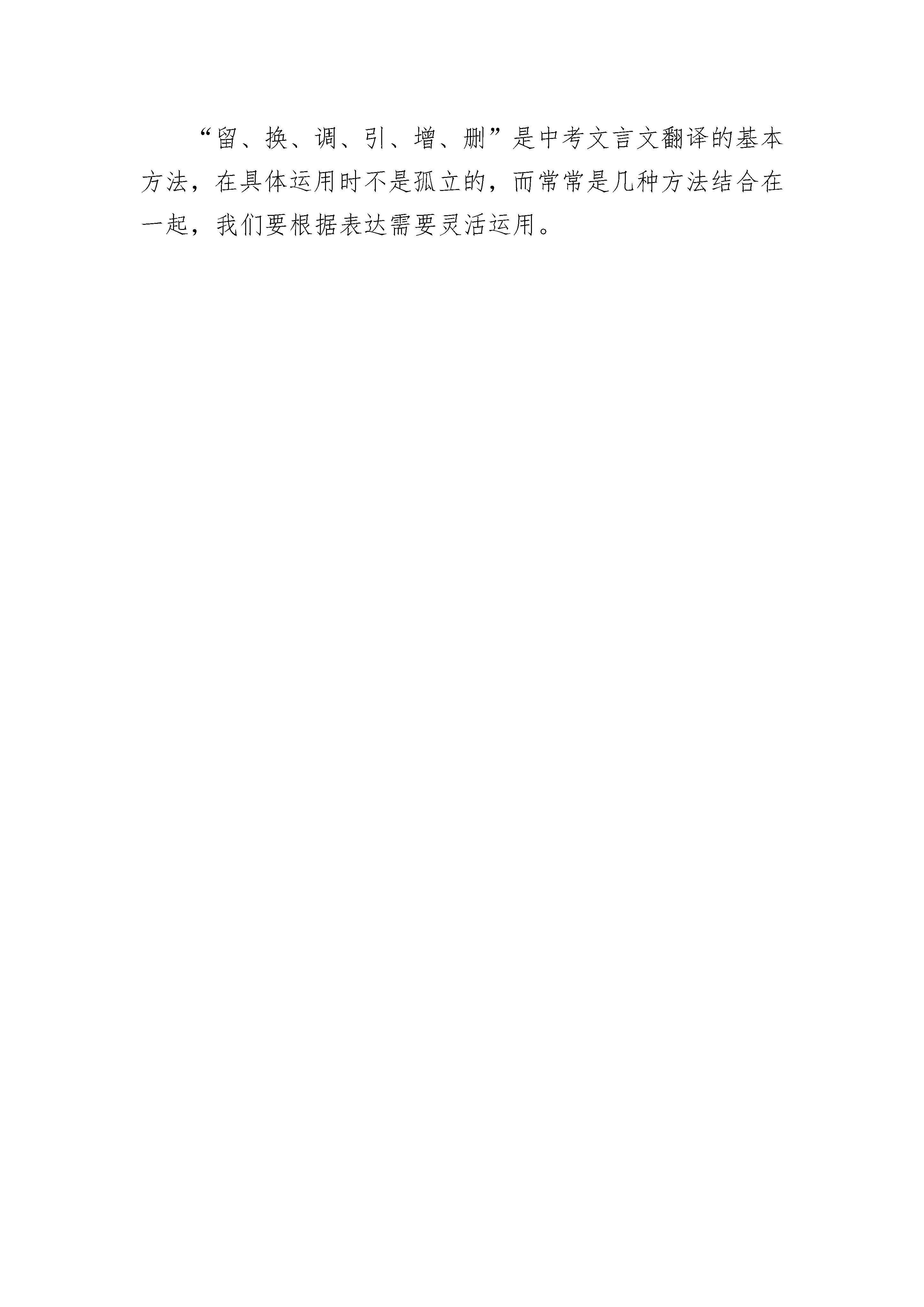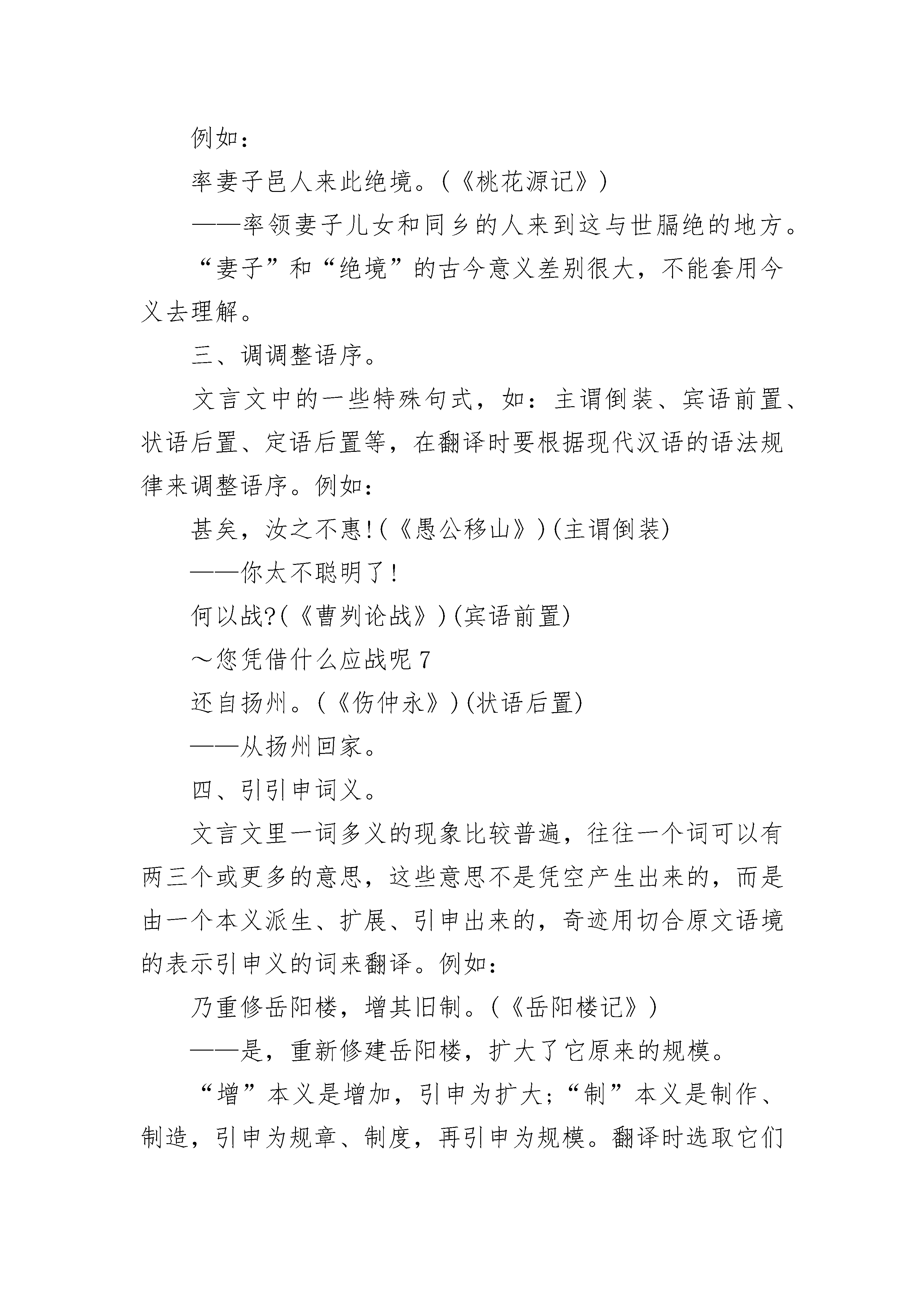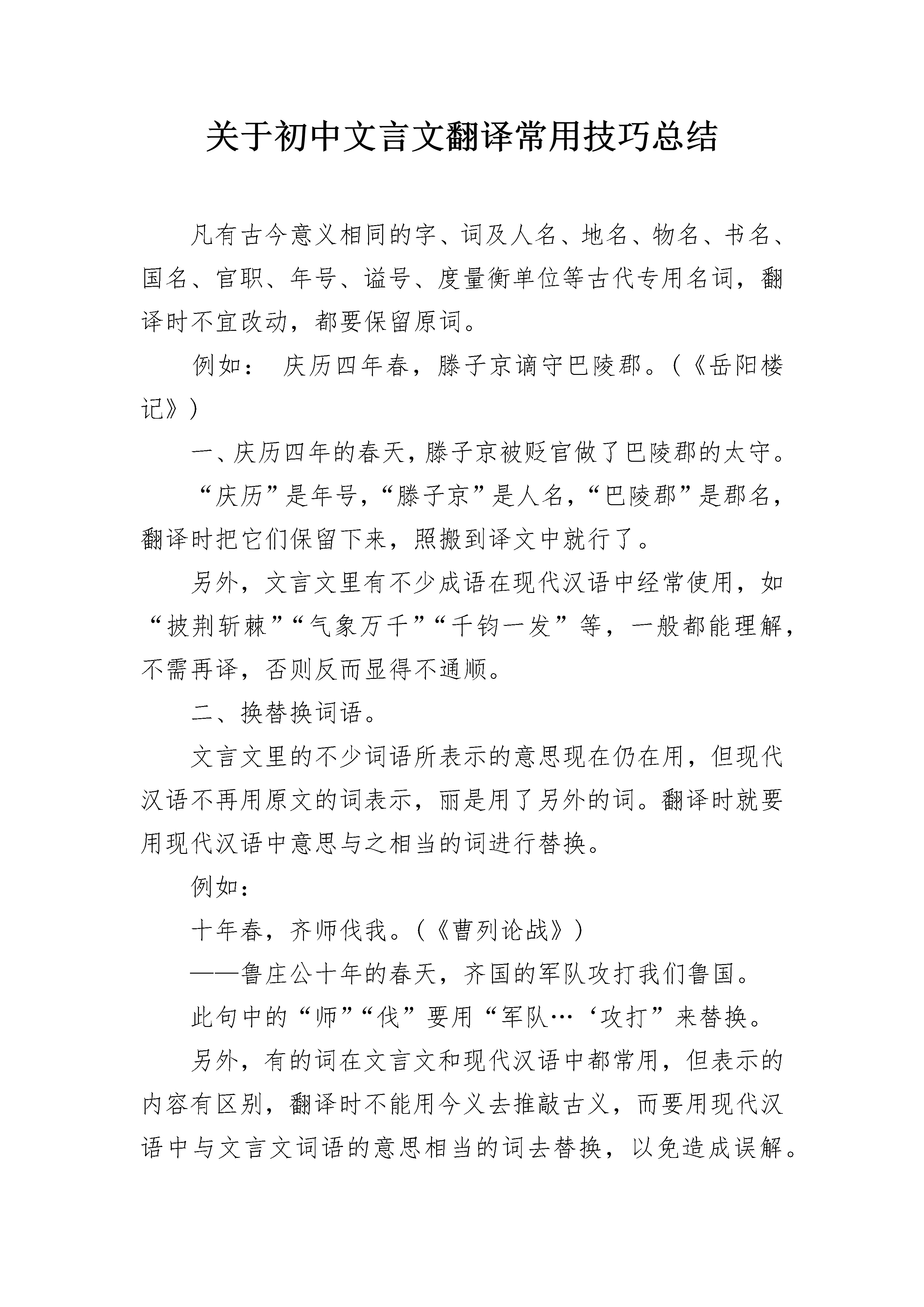 关于初中文言文翻译常用技巧总结凡有古今意义相同的字、词及人名、地名、物名、书名、国名、官职、年号、谥号、度量衡单位等古代专用名词,翻译时不宜改动,都要保留原词。例如:庆历四年春,滕子京谪守巴陵郡。(《岳阳楼记》)一、庆历四年的春天,滕子京被贬官做了巴陵郡的太守。“庆历”是年号,“滕子京”是人名,“巴陵郡”是郡名,翻译时把它们保留下来,照搬到译文中就行了。另外,文言文里有不少成语在现代汉语中经常使用,如“披荆斩棘”“气象万千”“千钧一发”等,一般都能理解,不需再译,否则反而显得不通顺。二、换替换词语。文言文里的不少词语所表示的意思现在仍在用,但现代汉语不再用原文的词表示,丽是用了另外的词。翻译时就要用现代汉语中意思与之相当的词进行替换。例如:十年春,齐师伐我。(《曹列论战》)——鲁庄公十年的春天,齐国的军队攻打我们鲁国。此句中的“师”“伐”要用“军队…‘攻打”来替换。另外,有的词在文言文和现代汉语中都常用,但表示的内容有区别,翻译时不能用今义去推敲古义,而要用现代汉语中与文言文词语的意思相当的词去替换,以免造成误解。例如:率妻子邑人来此绝境。(《桃花源记》)——率领妻子儿女和同乡的人来到这与世膈绝的地方。“妻子”和“绝境”的古今意义差别很大,不能套用今义去理解。三、调调整语序。文言文中的一些特殊句式,如:主谓倒装、宾语前置、状语后置、定语后置等,在翻译时要根据现代汉语的语法规律来调整语序。例如:甚矣,汝之不惠!(《愚公移山》)(主谓倒装)——你太不聪明了!何以战?(《曹刿论战》)(宾语前置)~您凭借什么应战呢7还自扬州。(《伤仲永》)(状语后置)——从扬州回家。四、引引申词义。文言文里一词多义的现象比较普遍,往往一个词可以有两三个或更多的意思,这些意思不是凭空产生出来的,而是由一个本义派生、扩展、引申出来的,奇迹用切合原文语境的表示引申义的词来翻译。例如:乃重修岳阳楼,增其旧制。(《岳阳楼记》)——是,重新修建岳阳楼,扩大了它原来的规模。“增”本义是增加,引申为扩大;“制”本义是制作、制造,引申为规章、制度,再引申为规模。翻译时选取它们的引审义。五、增增补词语或句子成分。翻译文言文时,下列几种情形需要增补词语或句子成分。1.文言词语单音节词居多,翻译时应将文言单音节词补充为现代汉语中相应的双音节诃。例如:夫大国,难测也,惧有伏焉。(《曹刿论战》)~一大国的虚实是难以推测的,我惧怕他们有埋伏。“测”“惧”“伏”都是单音节词,应译为双音节词“推测”(或“猜测”r惧怕”“埋伏”。2.文言文里将数词直接放在名词或动词的前面,而不用量词,翻译成现代汉语时应把量词增补上。例如:口技人坐屏障中,一桌、一椅、一扇、一抚尺而已。(《口技》)——那个表演口技的人坐在帷幕里,帷幕中只有一张桌子、一把椅子、一一把纸扇、一块醒木罢了。3.省略是文言文里常见的现象,翻译时应忠实于原文,根据现代汉语的语法要求和表达需要,作必要的补充,力求明白确切地表达原意。例如:见渔人,乃大惊,问所从来。具答之。(《桃花源记》)~—村里的人看见渔人,很是惊奇,问渔人从哪里来。渔人详细地回答了他们。原文中省略了两处主语、~处宾语,翻译时将其补充出来,意思才明白。4.有些句子,不好确定它省略了什么词语或甸子成分,只是为了上下文连贯。按照现代汉语的习惯,要增补一些词语,读起来才觉得顺口,表意也.通顺明白。例如:晋太元中,武陵人捕鱼为业。缘溪行、忘路之远近……(《桃花源记》——晋朝太元年间,(有个)武陵人,把捕鱼当做职业。(一天),他沿着小河(划船)行进,忘记了路程的远近……六、删去不译。文言文里的一些虚词,只在句中起某种语法作用,没有实在意义,在现代汉语里也没有相应的词语对应,就可以删去不译。例如:陈胜者,阳城人也。(《陈涉世家》)——陈胜是阳城人。原文中“……者……也”是文言文常见的判断句式的标志。“者”起停顿作用,“也”表示判断语气。翻译时,“者”“也”都可删去不译。有时为了使译文简洁通畅,对句中重复多次的词语也可删去不译。例如:通计一舟,为人五;为窗八;为箬篷,为楫,为炉,为壶,为手卷,为念珠各一。(《核舟记》——总计一条船上,刻有五个人;(刻有)窗户八扇;著竹叶做的船篷,船桨,炉子,茶壶,书画横幅,念珠各一件。此外,有些表敬称和谦称的词语,也可删去不译。“留、换、调、引、增、删”是中考文言文翻译的基本方法,在具体运用时不是孤立的,而常常是几种方法结合在一起,我们要根据表达需要灵活运用。