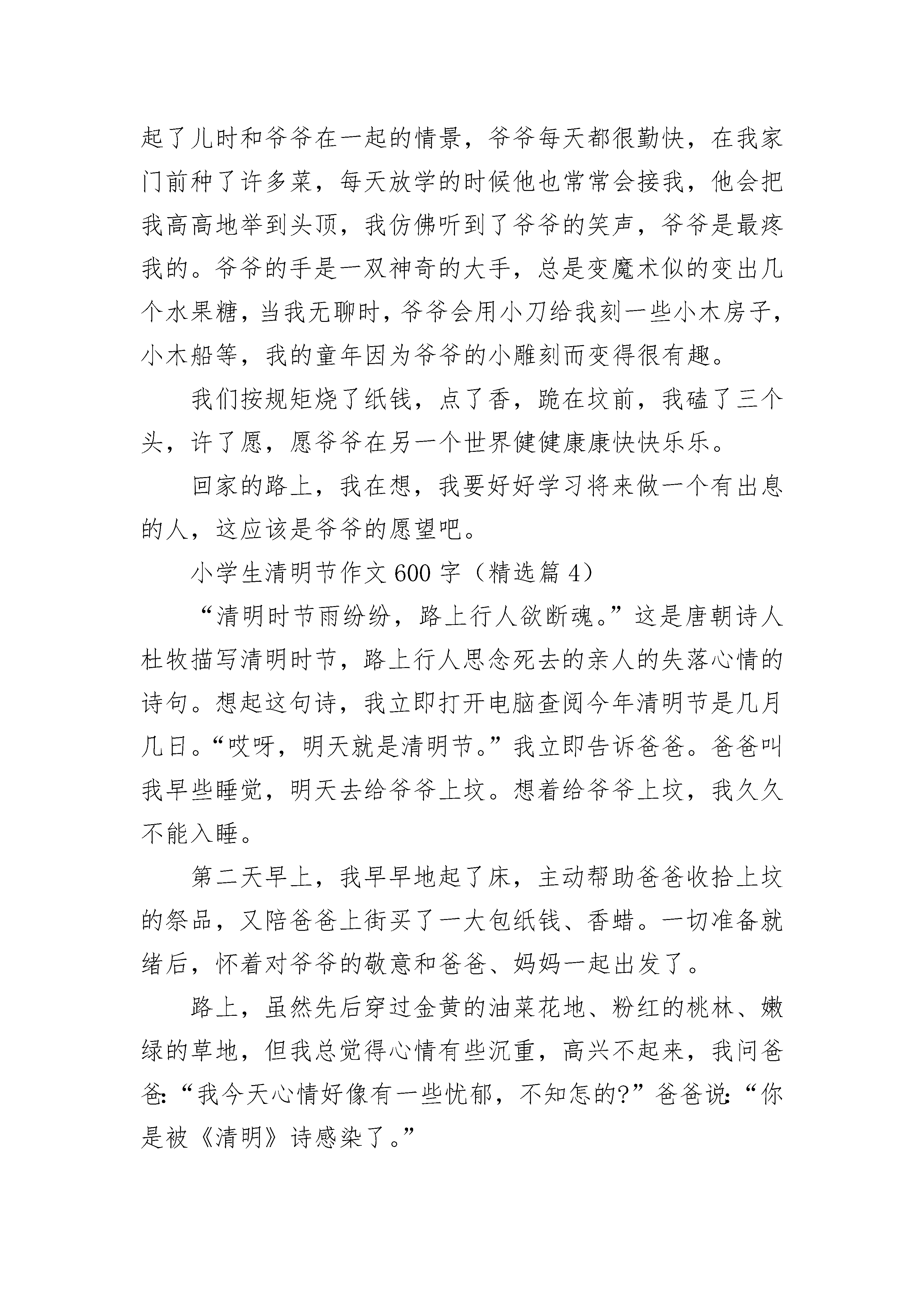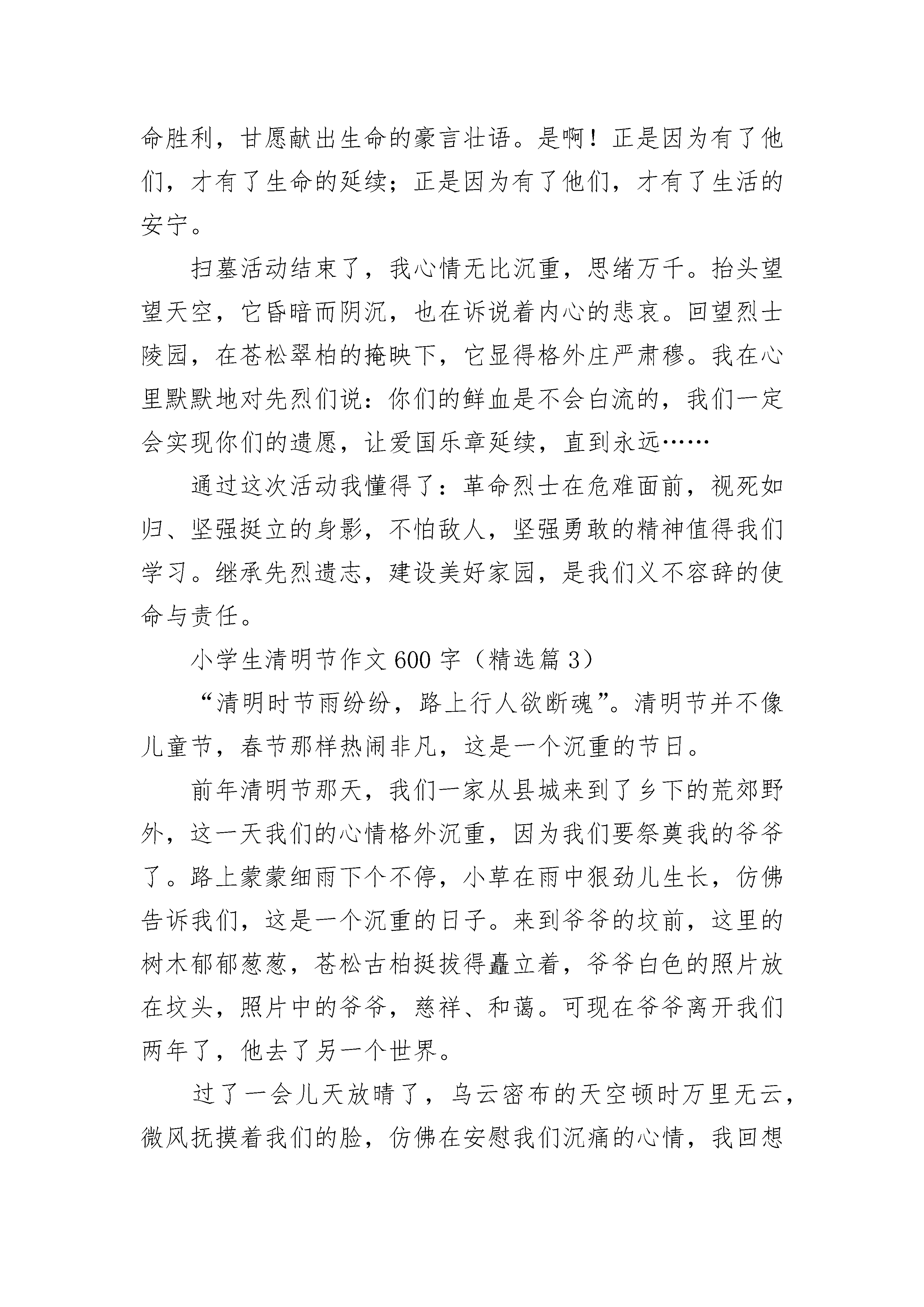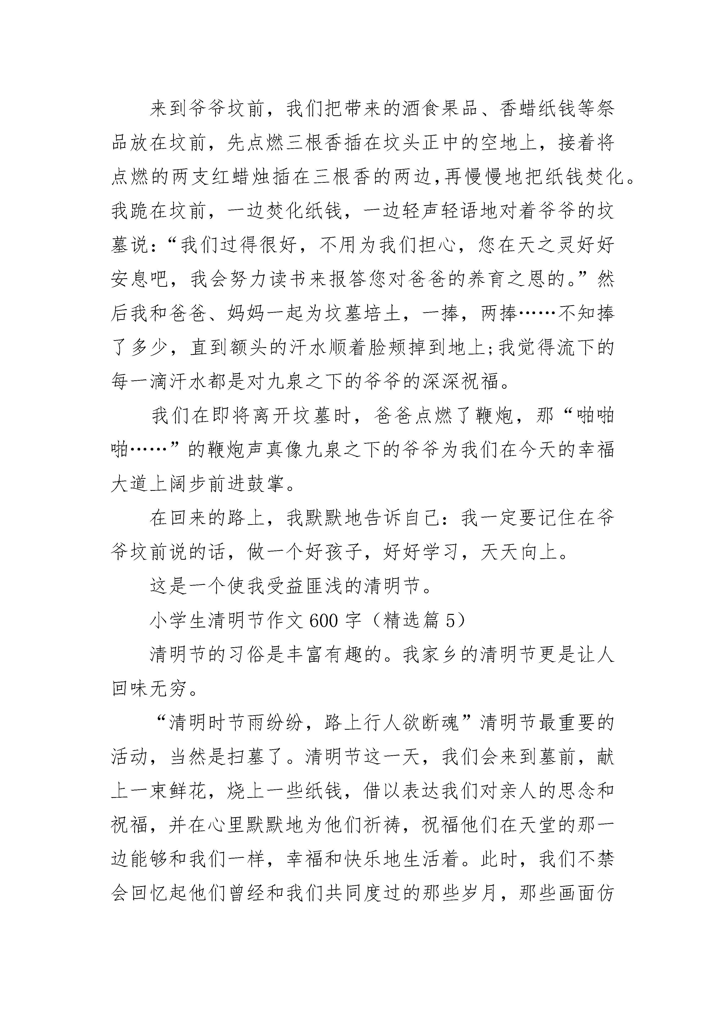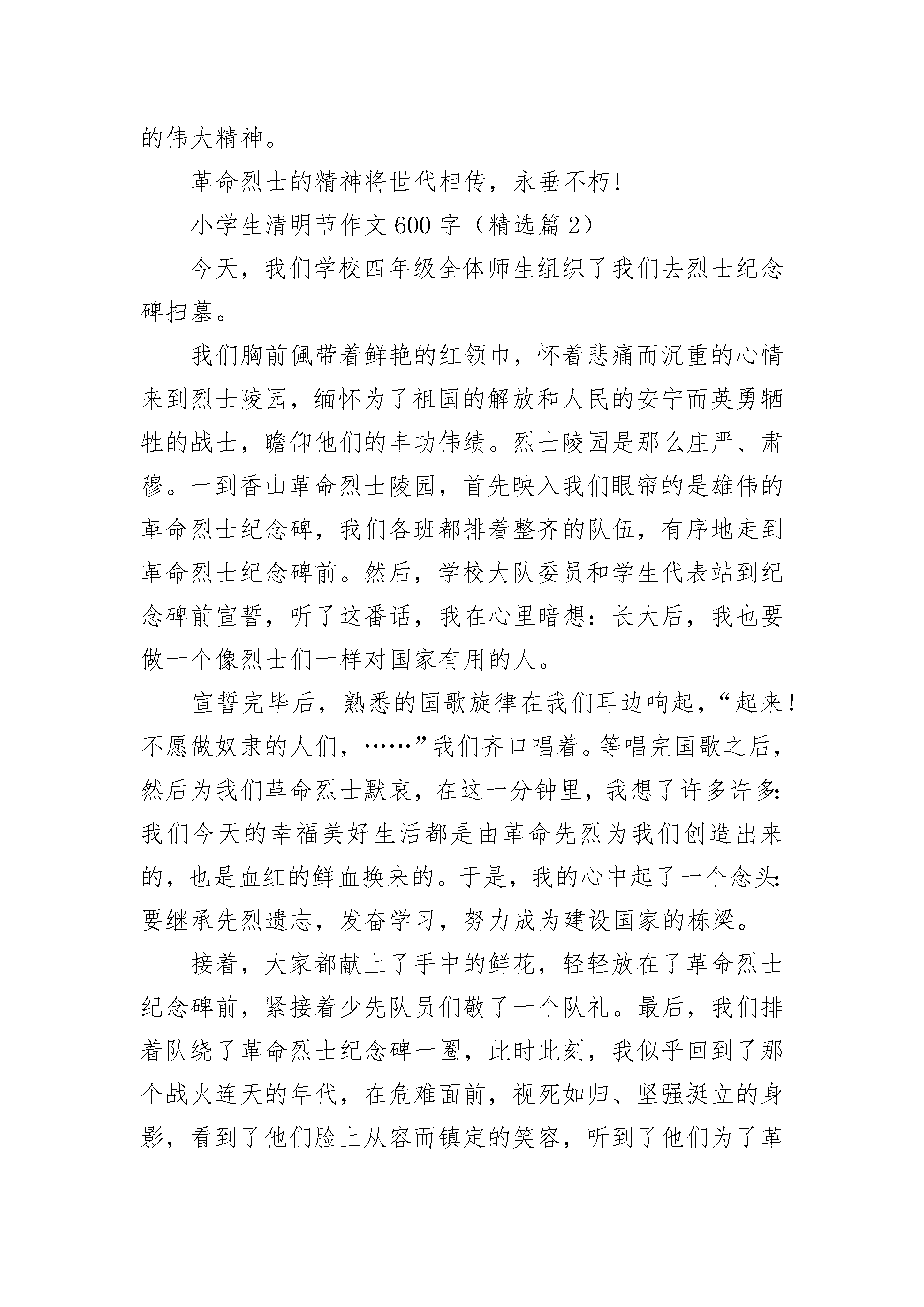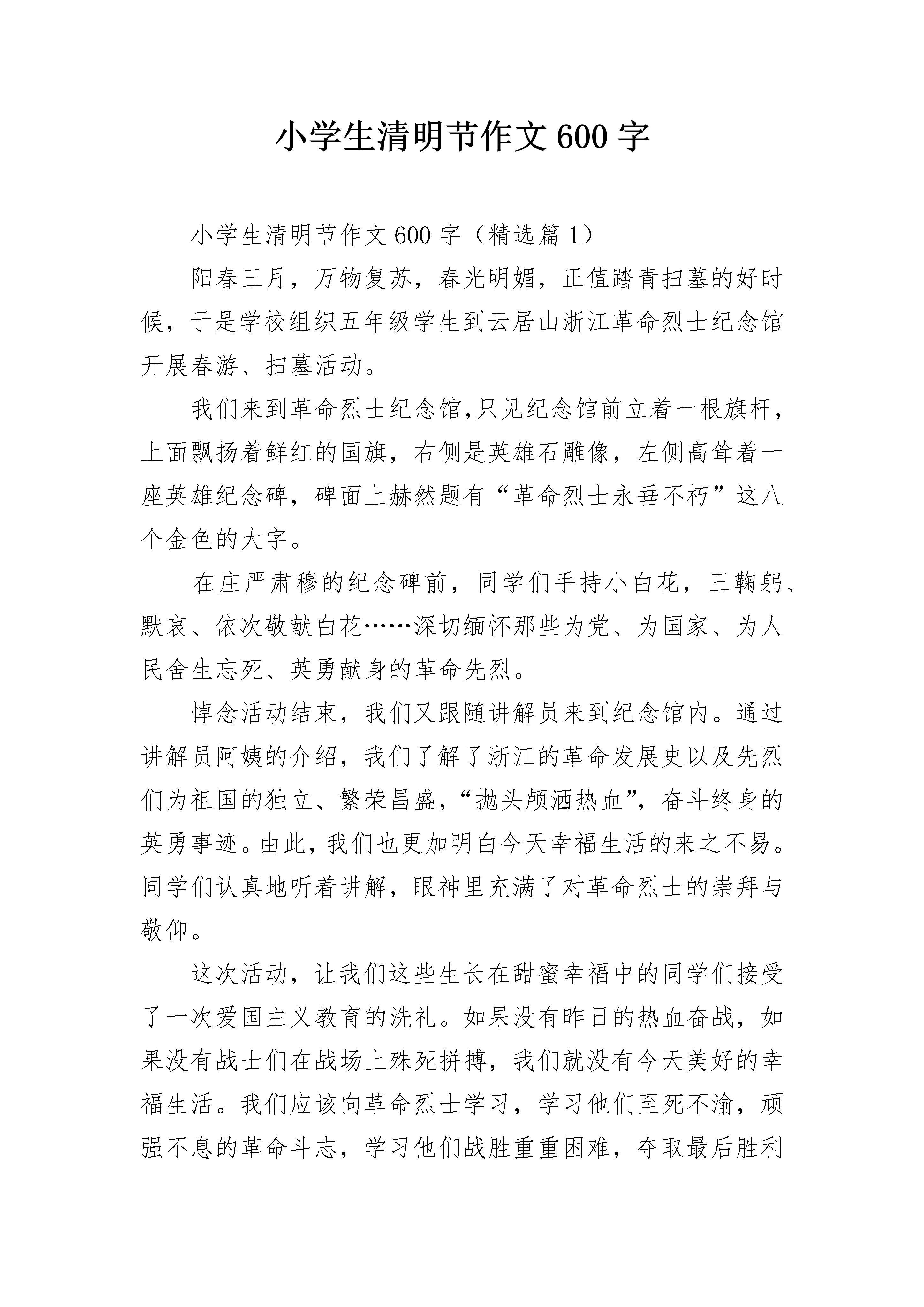 小学生清明节作文600字小学生清明节作文600字(精选篇1)阳春三月,万物复苏,春光明媚,正值踏青扫墓的好时候,于是学校组织五年级学生到云居山浙江革命烈士纪念馆开展春游、扫墓活动。我们来到革命烈士纪念馆,只见纪念馆前立着一根旗杆,上面飘扬着鲜红的国旗,右侧是英雄石雕像,左侧高耸着一座英雄纪念碑,碑面上赫然题有“革命烈士永垂不朽”这八个金色的大字。在庄严肃穆的纪念碑前,同学们手持小白花,三鞠躬、默哀、依次敬献白花……深切缅怀那些为党、为国家、为人民舍生忘死、英勇献身的革命先烈。悼念活动结束,我们又跟随讲解员来到纪念馆内。通过讲解员阿姨的介绍,我们了解了浙江的革命发展史以及先烈们为祖国的独立、繁荣昌盛,“抛头颅洒热血”,奋斗终身的英勇事迹。由此,我们也更加明白今天幸福生活的来之不易。同学们认真地听着讲解,眼神里充满了对革命烈士的崇拜与敬仰。这次活动,让我们这些生长在甜蜜幸福中的同学们接受了一次爱国主义教育的洗礼。如果没有昨日的热血奋战,如果没有战士们在战场上殊死拼搏,我们就没有今天美好的幸福生活。我们应该向革命烈士学习,学习他们至死不渝,顽强不息的革命斗志,学习他们战胜重重困难,夺取最后胜利的伟大精神。革命烈士的精神将世代相传,永垂不朽!小学生清明节作文600字(精选篇2)今天,我们学校四年级全体师生组织了我们去烈士纪念碑扫墓。我们胸前偑带着鲜艳的红领巾,怀着悲痛而沉重的心情来到烈士陵园,缅怀为了祖国的解放和人民的安宁而英勇牺牲的战士,瞻仰他们的丰功伟绩。烈士陵园是那么庄严、肃穆。一到香山革命烈士陵园,首先映入我们眼帘的是雄伟的革命烈士纪念碑,我们各班都排着整齐的队伍,有序地走到革命烈士纪念碑前。然后,学校大队委员和学生代表站到纪念碑前宣誓,听了这番话,我在心里暗想:长大后,我也要做一个像烈士们一样对国家有用的人。宣誓完毕后,熟悉的国歌旋律在我们耳边响起,“起来!不愿做奴隶的人们,……”我们齐口唱着。等唱完国歌之后,然后为我们革命烈士默哀,在这一分钟里,我想了许多许多:我们今天的幸福美好生活都是由革命先烈为我们创造出来的,也是血红的鲜血换来的。于是,我的心中起了一个念头:要继承先烈遗志,发奋学习,努力成为建设国家的栋梁。接着,大家都献上了手中的鲜花,轻轻放在了革命烈士纪念碑前,紧接着少先队员们敬了一个队礼。最后,我们排着队绕了革命烈士纪念碑一圈,此时此刻,我似乎回到了那个战火连天的年代,在危难面前,视死如归、坚强挺立的身影,看到了他们脸上从容而镇定的笑容,听到了他们为了革命胜利,甘愿献出生命的豪言壮语。是啊!正是因为有了他们,才有了生命的延续;正是因为有了他们,才有了生活的安宁。扫墓活动结束了,我心情无比沉重,思绪万千。抬头望望天空,它昏暗而阴沉,也在诉说着内心的悲哀。回望烈士陵园,在苍松翠柏的掩映下,它显得格外庄严肃穆。我在心里默默地对先烈们说:你们的鲜血是不会白流的,我们一定会实现你们的遗愿,让爱国乐章延续,直到永远……通过这次活动我懂得了:革命烈士在危难面前,视死如归、坚强挺立的身影,不怕敌人,坚强勇敢的精神值得我们学习。继承先烈遗志,建设美好家园,是我们义不容辞的使命与责任。小学生清明节作文600字(精选篇3)“清明时节雨纷纷,路上行人欲断魂”。清明节并不像儿童节,春节那样热闹非凡,这是一个沉重的节日。前年清明节那天,我们一家从县城来到了乡下的荒郊野外,这一天我们的心情格外沉重,因为我们要祭奠我的爷爷了。路上蒙蒙细雨下个不停,小草在雨中狠劲儿生长,仿佛告诉我们,这是一个沉重的日子。来到爷爷的坟前,这里的树木郁郁葱葱,苍松古柏挺拔得矗立着,爷爷白色的照片放在坟头,照片中的爷爷,慈祥、和蔼。可现在爷爷离开我们两年了,他去了另一个世界。过了一会儿天放晴了,乌云密布的天空顿时万里无云,微风抚摸着我们的脸,仿佛在安慰我们沉痛的心情,我回想起了儿时和爷爷在一起的情景,爷爷每天都很勤快,在我家门前种了许多菜,每天放学的时候他也常常会接我,他会把我高高地举到头顶,我仿佛听到了爷爷的笑声,爷爷是最疼我的。爷爷的手是一双神奇的大手,总是变魔术似的变出几个水果糖,当我无聊时,爷爷会用小刀给我刻一些小木房子,小木船等,我的童年因为爷爷的小雕刻而变得很有趣。我们按规矩烧了纸钱,点了香,跪在坟前,我磕了三个头,许了愿,愿爷爷在另一个世界健健康康快快乐乐。回家的路上,我在想,我要好好学习将来做一个有出息的人,这应该是爷爷的愿望吧。小学生清明节作文600字(精选篇4)“清明时节雨纷纷,路上行人欲断魂。”这是唐朝诗人杜牧描写清明时节,路上行人思念死去的亲人的失落心情的诗句。想起这句诗,我立即打开电脑查阅今年清明节是几月几日。“哎呀,明天就是清明节。”我立即告诉爸爸。爸爸叫我早些睡觉,明天去给爷爷上坟。想着给爷爷上坟,我久久不能入睡。第二天早上,我早早地