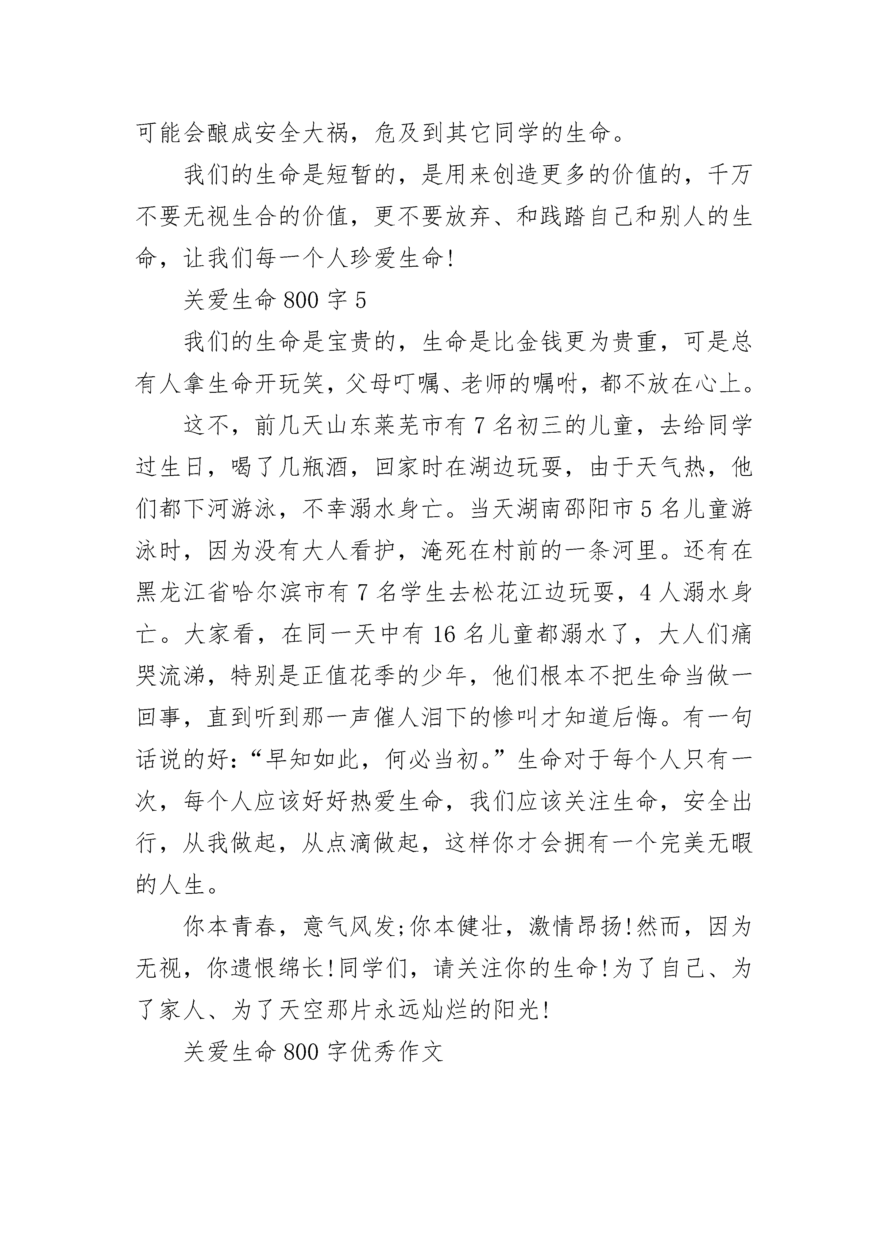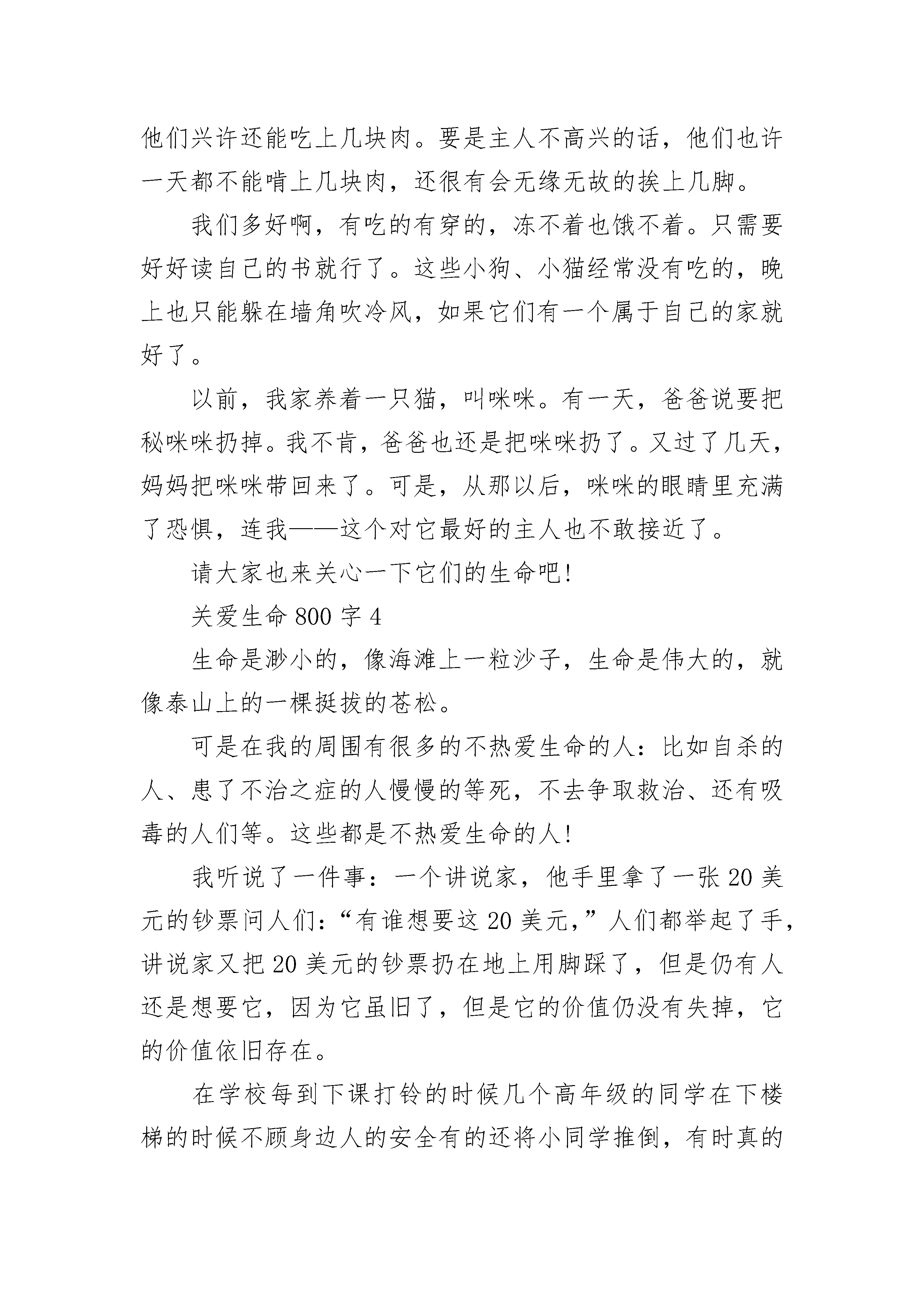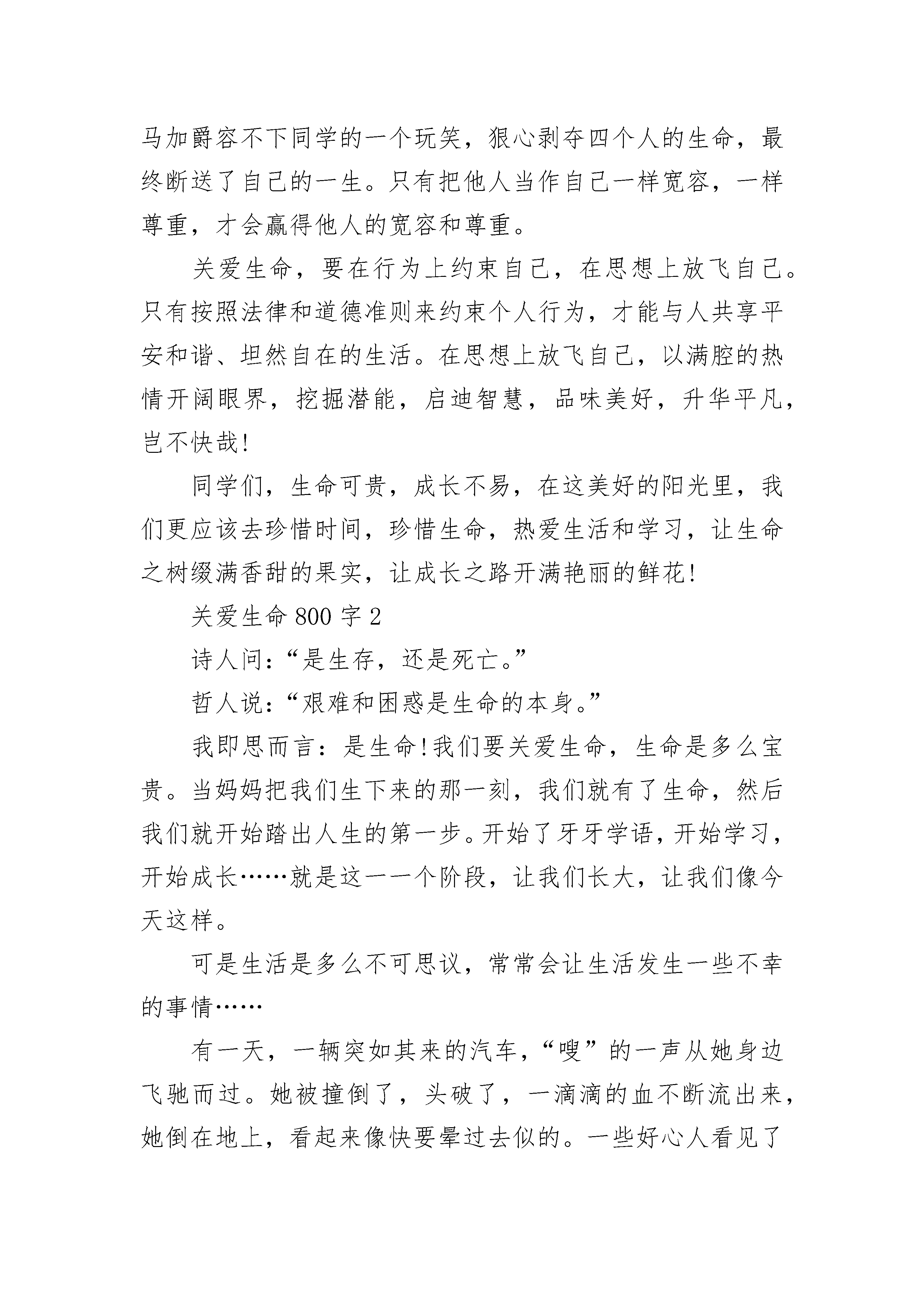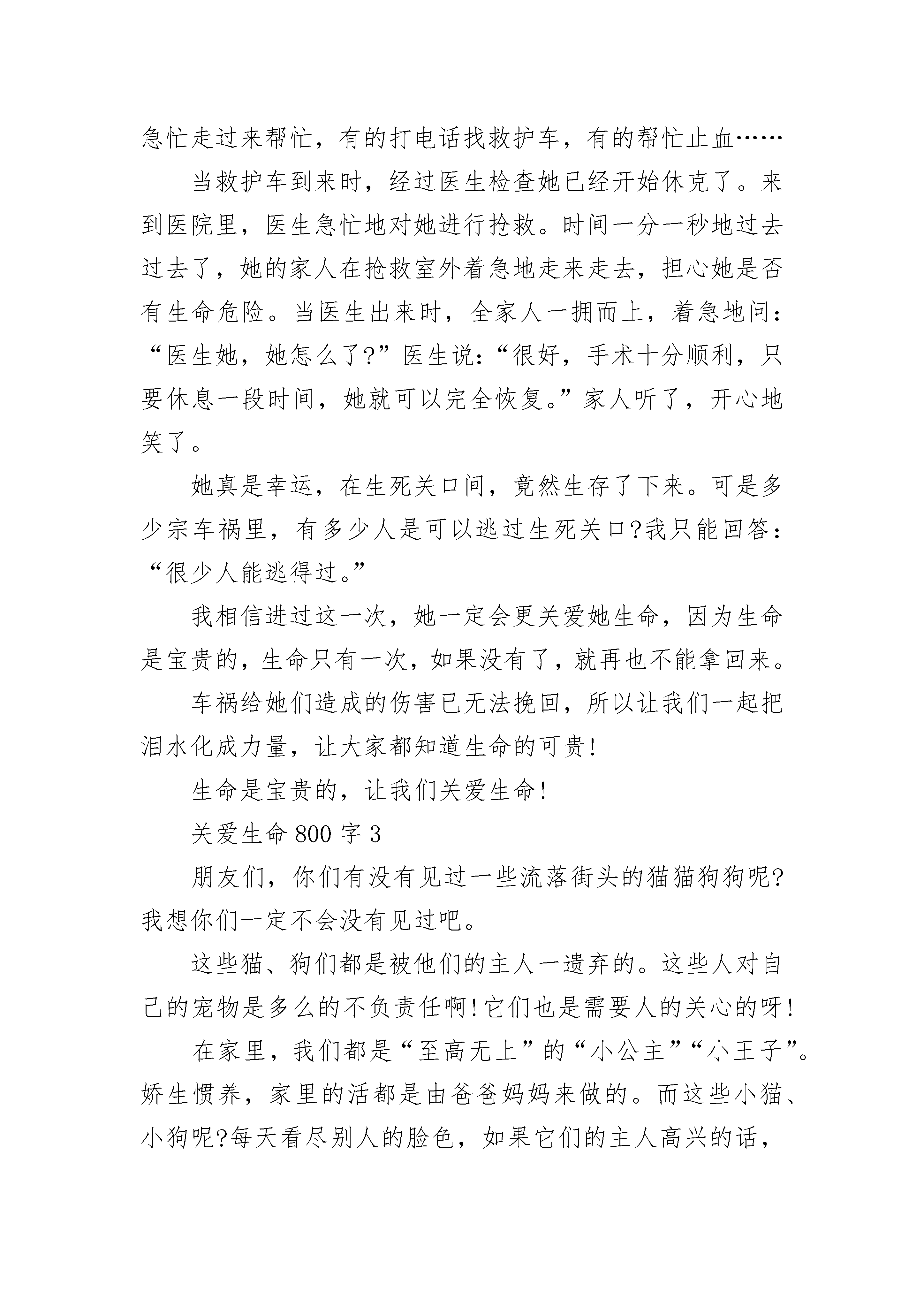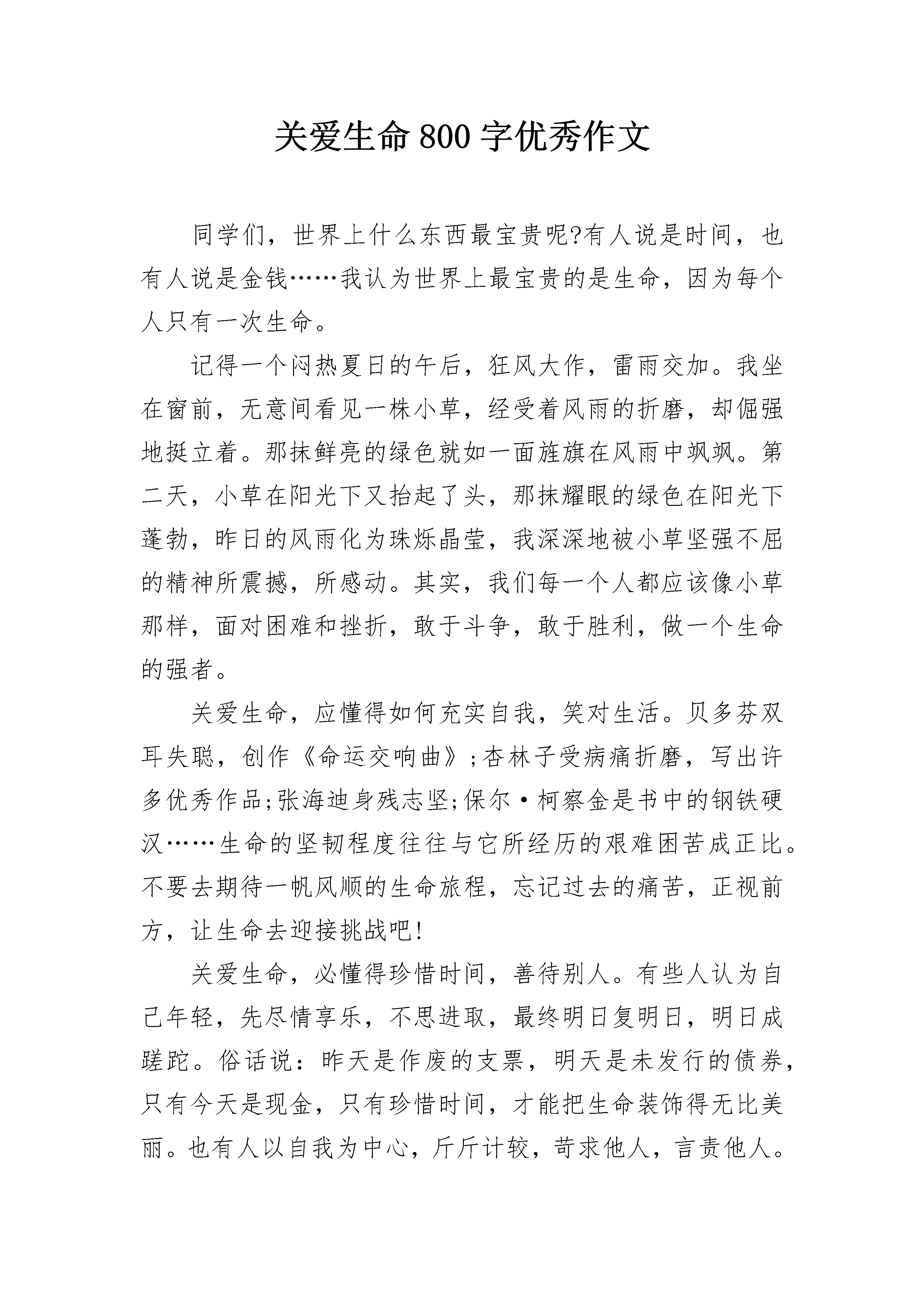 关爱生命800字优秀作文同学们,世界上什么东西最宝贵呢?有人说是时间,也有人说是金钱……我认为世界上最宝贵的是生命,因为每个人只有一次生命。记得一个闷热夏日的午后,狂风大作,雷雨交加。我坐在窗前,无意间看见一株小草,经受着风雨的折磨,却倔强地挺立着。那抹鲜亮的绿色就如一面旌旗在风雨中飒飒。第二天,小草在阳光下又抬起了头,那抹耀眼的绿色在阳光下蓬勃,昨日的风雨化为珠烁晶莹,我深深地被小草坚强不屈的精神所震撼,所感动。其实,我们每一个人都应该像小草那样,面对困难和挫折,敢于斗争,敢于胜利,做一个生命的强者。关爱生命,应懂得如何充实自我,笑对生活。贝多芬双耳失聪,创作《命运交响曲》;杏林子受病痛折磨,写出许多优秀作品;张海迪身残志坚;保尔·柯察金是书中的钢铁硬汉……生命的坚韧程度往往与它所经历的艰难困苦成正比。不要去期待一帆风顺的生命旅程,忘记过去的痛苦,正视前方,让生命去迎接挑战吧!关爱生命,必懂得珍惜时间,善待别人。有些人认为自己年轻,先尽情享乐,不思进取,最终明日复明日,明日成蹉跎。俗话说:昨天是作废的支票,明天是未发行的债券,只有今天是现金,只有珍惜时间,才能把生命装饰得无比美丽。也有人以自我为中心,斤斤计较,苛求他人,言责他人。马加爵容不下同学的一个玩笑,狠心剥夺四个人的生命,最终断送了自己的一生。只有把他人当作自己一样宽容,一样尊重,才会赢得他人的宽容和尊重。关爱生命,要在行为上约束自己,在思想上放飞自己。只有按照法律和道德准则来约束个人行为,才能与人共享平安和谐、坦然自在的生活。在思想上放飞自己,以满腔的热情开阔眼界,挖掘潜能,启迪智慧,品味美好,升华平凡,岂不快哉!同学们,生命可贵,成长不易,在这美好的阳光里,我们更应该去珍惜时间,珍惜生命,热爱生活和学习,让生命之树缀满香甜的果实,让成长之路开满艳丽的鲜花!关爱生命800字2诗人问:“是生存,还是死亡。”哲人说:“艰难和困惑是生命的本身。”我即思而言:是生命!我们要关爱生命,生命是多么宝贵。当妈妈把我们生下来的那一刻,我们就有了生命,然后我们就开始踏出人生的第一步。开始了牙牙学语,开始学习,开始成长……就是这一一个阶段,让我们长大,让我们像今天这样。可是生活是多么不可思议,常常会让生活发生一些不幸的事情……有一天,一辆突如其来的汽车,“嗖”的一声从她身边飞驰而过。她被撞倒了,头破了,一滴滴的血不断流出来,她倒在地上,看起来像快要晕过去似的。一些好心人看见了急忙走过来帮忙,有的打电话找救护车,有的帮忙止血……当救护车到来时,经过医生检查她已经开始休克了。来到医院里,医生急忙地对她进行抢救。时间一分一秒地过去过去了,她的家人在抢救室外着急地走来走去,担心她是否有生命危险。当医生出来时,全家人一拥而上,着急地问:“医生她,她怎么了?”医生说:“很好,手术十分顺利,只要休息一段时间,她就可以完全恢复。”家人听了,开心地笑了。她真是幸运,在生死关口间,竟然生存了下来。可是多少宗车祸里,有多少人是可以逃过生死关口?我只能回答:“很少人能逃得过。”我相信进过这一次,她一定会更关爱她生命,因为生命是宝贵的,生命只有一次,如果没有了,就再也不能拿回来。车祸给她们造成的伤害已无法挽回,所以让我们一起把泪水化成力量,让大家都知道生命的可贵!生命是宝贵的,让我们关爱生命!关爱生命800字3朋友们,你们有没有见过一些流落街头的猫猫狗狗呢?我想你们一定不会没有见过吧。这些猫、狗们都是被他们的主人一遗弃的。这些人对自己的宠物是多么的不负责任啊!它们也是需要人的关心的呀!在家里,我们都是“至高无上”的“小公主”“小王子”。娇生惯养,家里的活都是由爸爸妈妈来做的。而这些小猫、小狗呢?每天看尽别人的脸色,如果它们的主人高兴的话,他们兴许还能吃上几块肉。要是主人不高兴的话,他们也许一天都不能啃上几块肉,还很有会无缘无故的挨上几脚。我们多好啊,有吃的有穿的,冻不着也饿不着。只需要好好读自己的书就行了。这些小狗、小猫经常没有吃的,晚上也只能躲在墙角吹冷风,如果它们有一个属于自己的家就好了。以前,我家养着一只猫,叫咪咪。有一天,爸爸说要把秘咪咪扔掉。我不肯,爸爸也还是把咪咪扔了。又过了几天,妈妈把咪咪带回来了。可是,从那以后,咪咪的眼睛里充满了恐惧,连我——这个对它最好的主人也不敢接近了。请大家也来关心一下它们的生命吧!关爱生命800字4生命是渺小的,像海滩上一粒沙子,生命是伟大的,就像泰山上的一棵挺拔的苍松。可是在我的周围有很多的不热爱生命的人:比如自杀的人、患了不治之症的人慢慢的等死,不去争取救治、还有吸毒的人们等。这些都是不热爱生命的人!我听说了一件事:一个讲说家,他手里拿了一张20美元的钞票问人们:“有谁想要这20美元,”人们都举起了手,讲说家又把20美元的钞票扔在地上用脚踩了,但是仍有人还是想要
