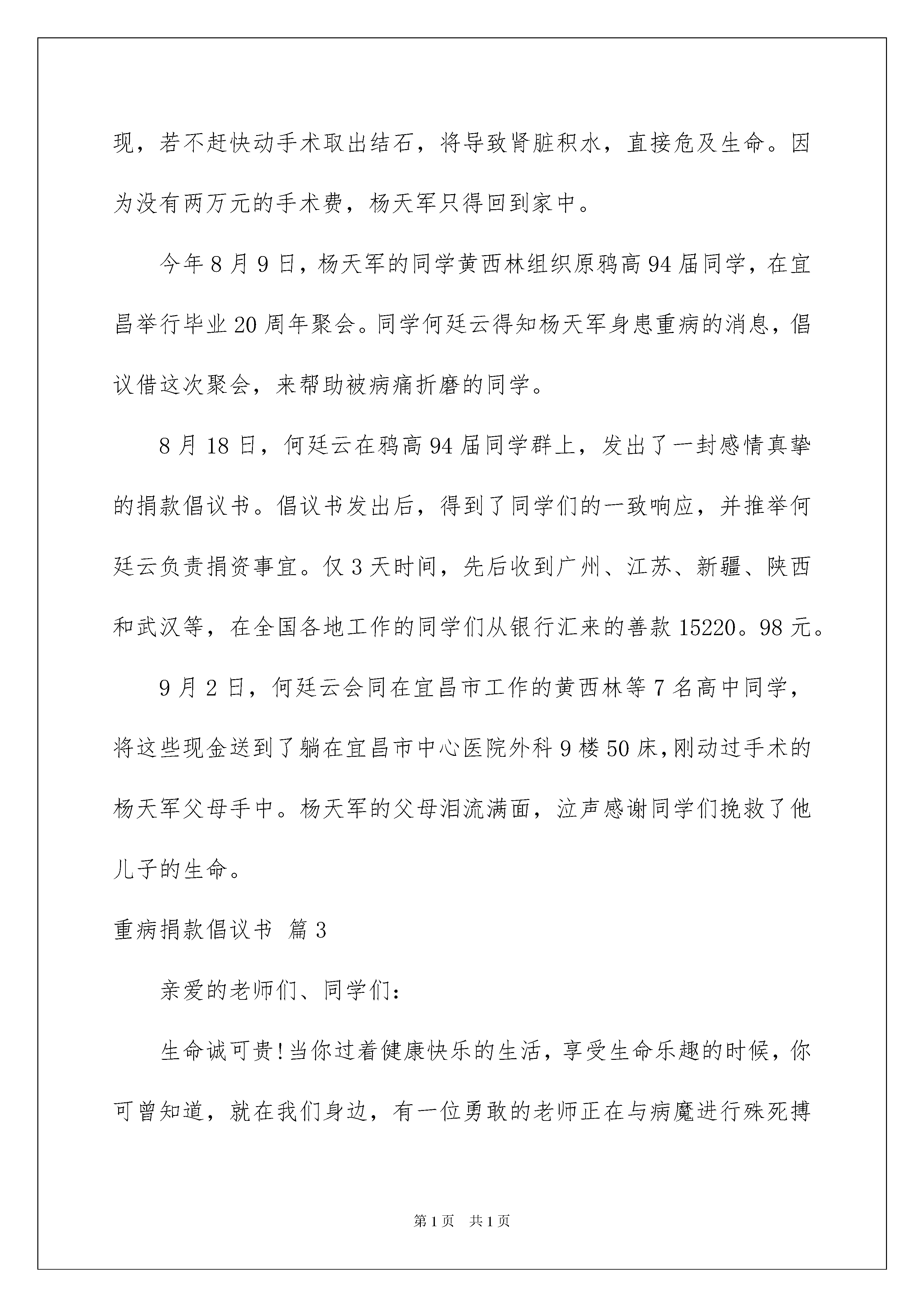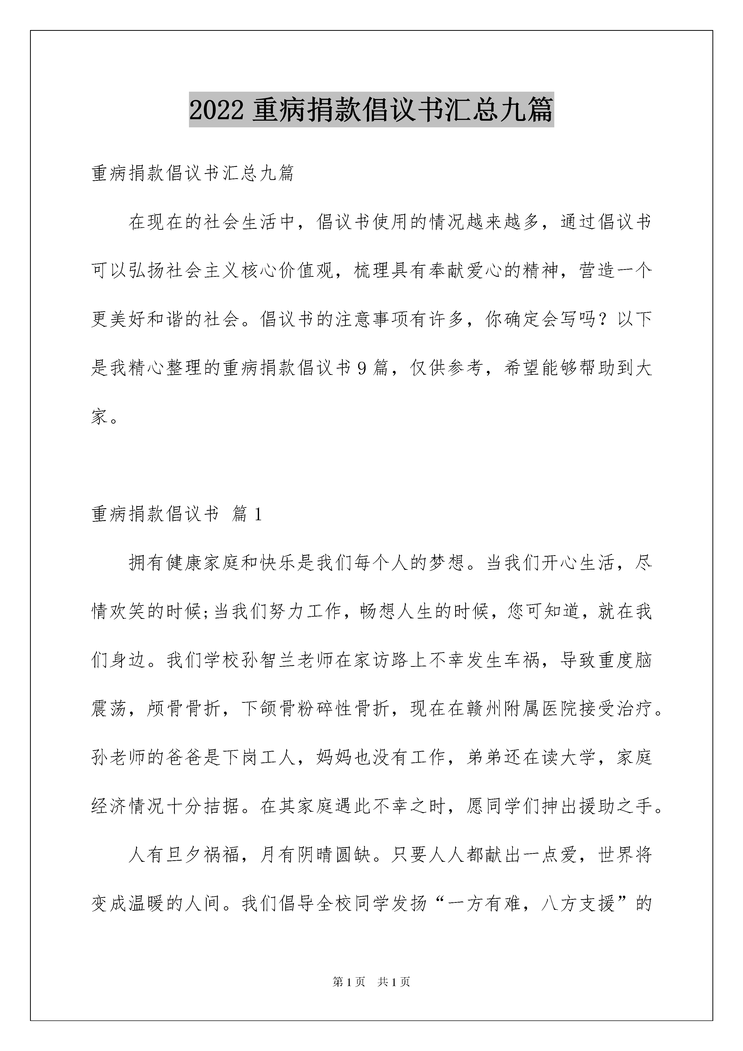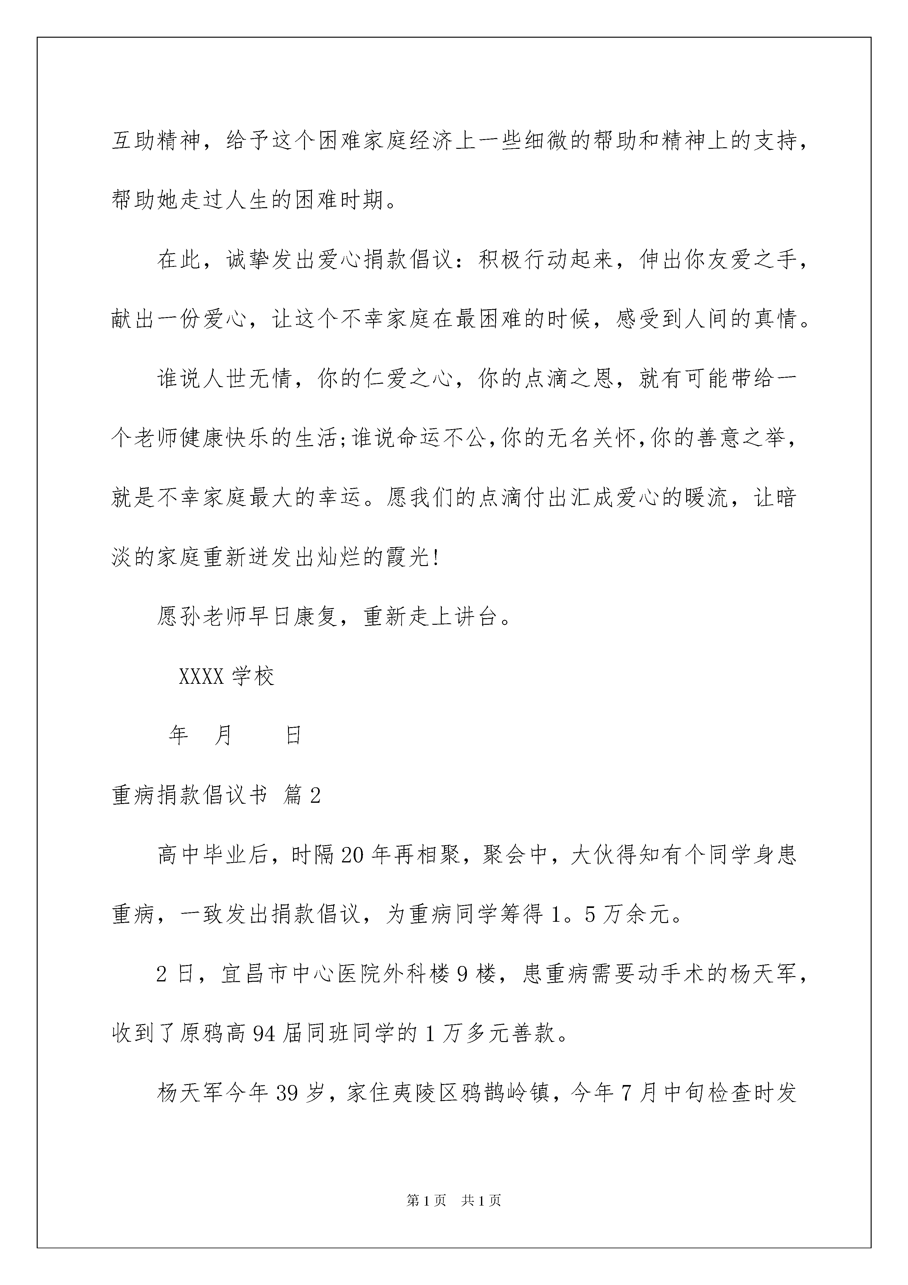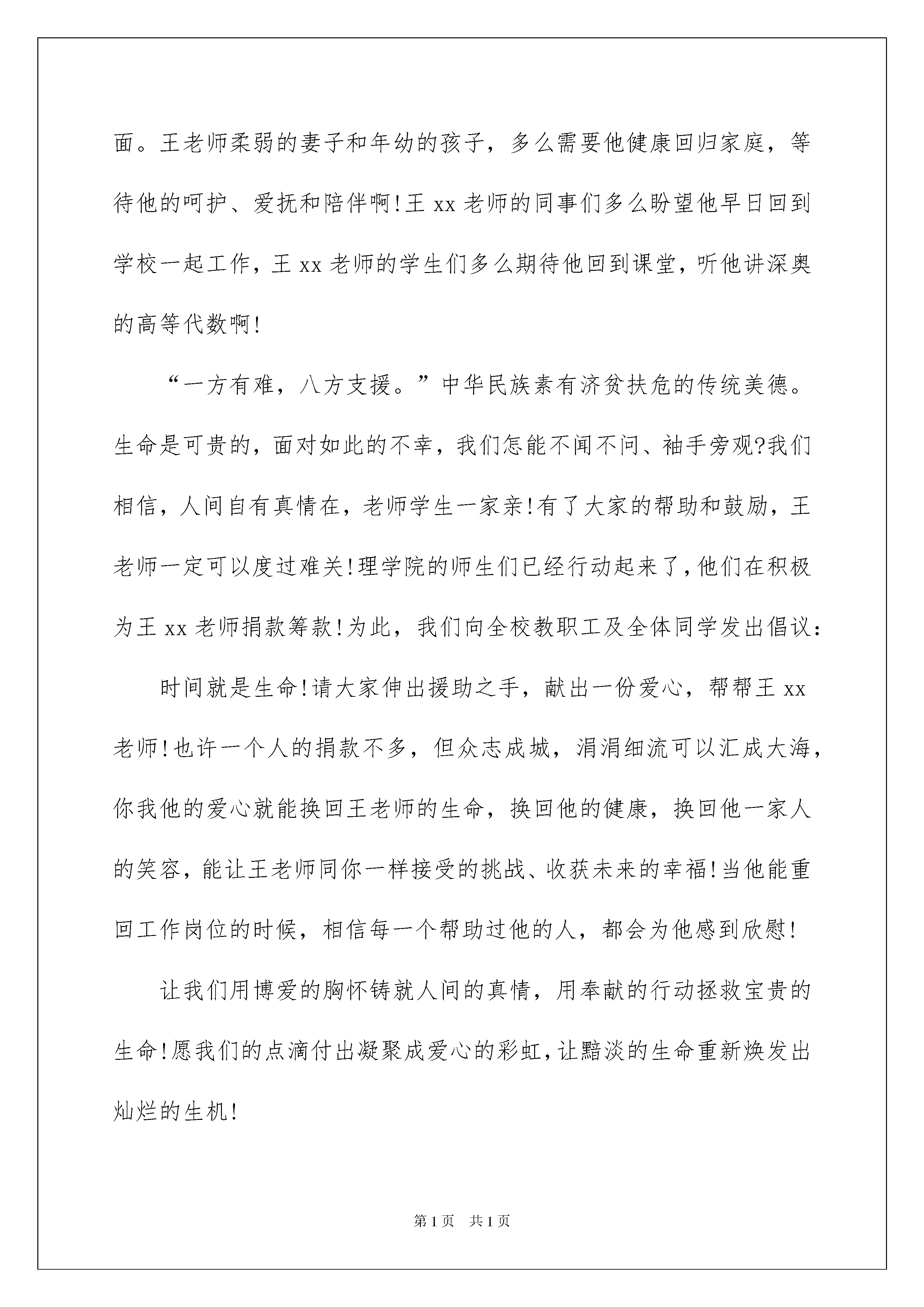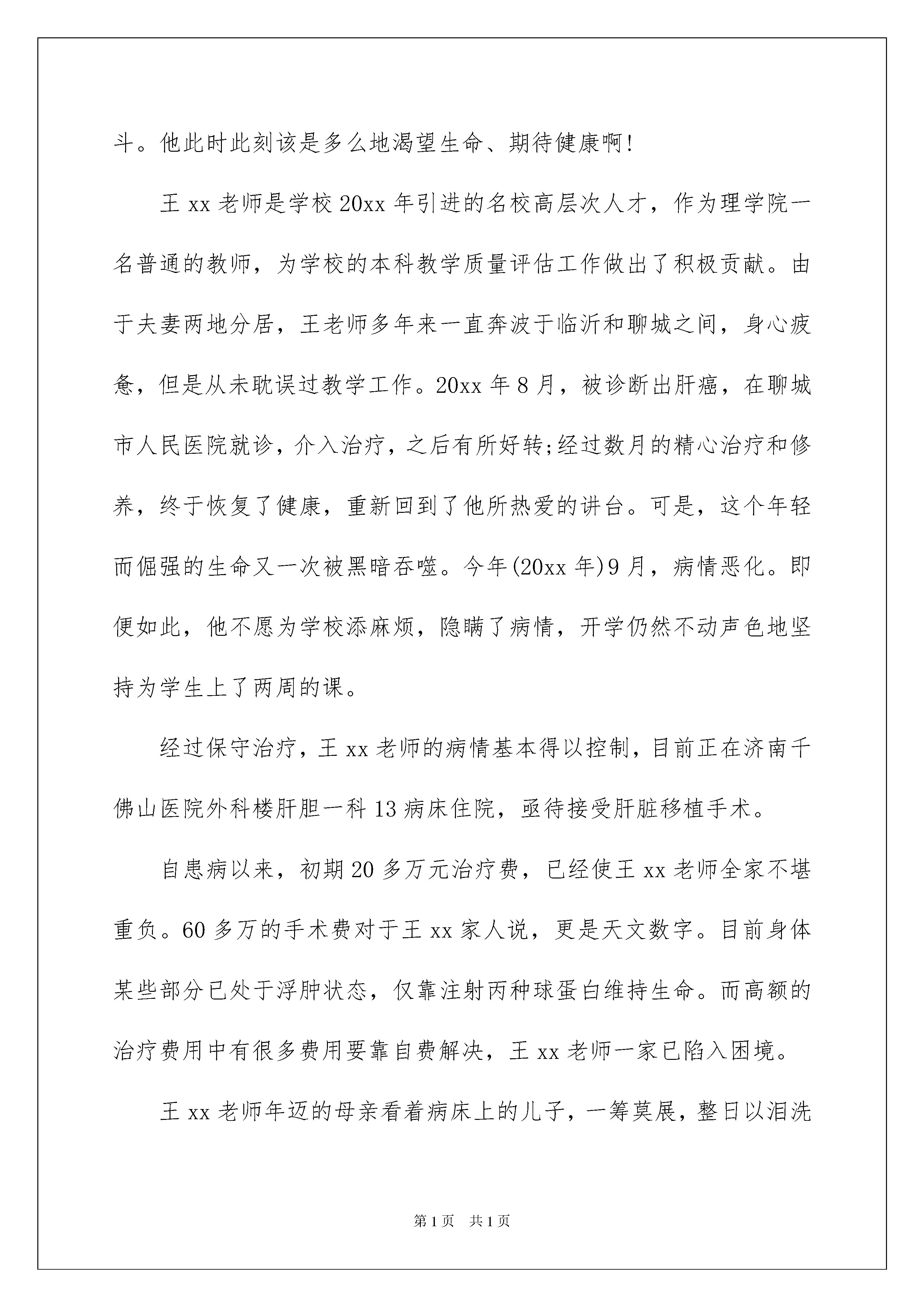 2022重病捐款倡议书汇总九篇重病捐款倡议书汇总九篇在现在的社会生活中,倡议书使用的情况越来越多,通过倡议书可以弘扬社会主义核心价值观,梳理具有奉献爱心的精神,营造一个更美好和谐的社会。倡议书的注意事项有许多,你确定会写吗?以下是我精心整理的重病捐款倡议书9篇,仅供参考,希望能够帮助到大家。重病捐款倡议书篇1拥有健康家庭和快乐是我们每个人的梦想。当我们开心生活,尽情欢笑的时候;当我们努力工作,畅想人生的时候,您可知道,就在我们身边。我们学校孙智兰老师在家访路上不幸发生车祸,导致重度脑震荡,颅骨骨折,下颌骨粉碎性骨折,现在在赣州附属医院接受治疗。孙老师的爸爸是下岗工人,妈妈也没有工作,弟弟还在读大学,家庭经济情况十分拮据。在其家庭遇此不幸之时,愿同学们抻出援助之手。人有旦夕祸福,月有阴晴圆缺。只要人人都献出一点爱,世界将变成温暖的人间。我们倡导全校同学发扬“一方有难,八方支援”的互助精神,给予这个困难家庭经济上一些细微的帮助和精神上的支持,帮助她走过人生的困难时期。在此,诚挚发出爱心捐款倡议:积极行动起来,伸出你友爱之手,献出一份爱心,让这个不幸家庭在最困难的时候,感受到人间的真情。谁说人世无情,你的仁爱之心,你的点滴之恩,就有可能带给一个老师健康快乐的生活;谁说命运不公,你的无名关怀,你的善意之举,就是不幸家庭最大的幸运。愿我们的点滴付出汇成爱心的暖流,让暗淡的家庭重新迸发出灿烂的霞光!愿孙老师早日康复,重新走上讲台。XXXX学校年月日重病捐款倡议书篇2高中毕业后,时隔20年再相聚,聚会中,大伙得知有个同学身患重病,一致发出捐款倡议,为重病同学筹得1。5万余元。2日,宜昌市中心医院外科楼9楼,患重病需要动手术的杨天军,收到了原鸦高94届同班同学的1万多元善款。杨天军今年39岁,家住夷陵区鸦鹊岭镇,今年7月中旬检查时发现,若不赶快动手术取出结石,将导致肾脏积水,直接危及生命。因为没有两万元的手术费,杨天军只得回到家中。今年8月9日,杨天军的同学黄西林组织原鸦高94届同学,在宜昌举行毕业20周年聚会。同学何廷云得知杨天军身患重病的消息,倡议借这次聚会,来帮助被病痛折磨的同学。8月18日,何廷云在鸦高94届同学群上,发出了一封感情真挚的捐款倡议书。倡议书发出后,得到了同学们的一致响应,并推举何廷云负责捐资事宜。仅3天时间,先后收到广州、江苏、新疆、陕西和武汉等,在全国各地工作的同学们从银行汇来的善款15220。98元。9月2日,何廷云会同在宜昌市工作的黄西林等7名高中同学,将这些现金送到了躺在宜昌市中心医院外科9楼50床,刚动过手术的杨天军父母手中。杨天军的父母泪流满面,泣声感谢同学们挽救了他儿子的生命。重病捐款倡议书篇3亲爱的老师们、同学们:生命诚可贵!当你过着健康快乐的生活,享受生命乐趣的时候,你可曾知道,就在我们身边,有一位勇敢的老师正在与病魔进行殊死搏斗。他此时此刻该是多么地渴望生命、期待健康啊!王xx老师是学校20xx年引进的名校高层次人才,作为理学院一名普通的教师,为学校的本科教学质量评估工作做出了积极贡献。由于夫妻两地分居,王老师多年来一直奔波于临沂和聊城之间,身心疲惫,但是从未耽误过教学工作。20xx年8月,被诊断出肝癌,在聊城市人民医院就诊,介入治疗,之后有所好转;经过数月的精心治疗和修养,终于恢复了健康,重新回到了他所热爱的讲台。可是,这个年轻而倔强的生命又一次被黑暗吞噬。今年(20xx年)9月,病情恶化。即便如此,他不愿为学校添麻烦,隐瞒了病情,开学仍然不动声色地坚持为学生上了两周的课。经过保守治疗,王xx老师的病情基本得以控制,目前正在济南千佛山医院外科楼肝胆一科13病床住院,亟待接受肝脏移植手术。自患病以来,初期20多万元治疗费,已经使王xx老师全家不堪重负。60多万的手术费对于王xx家人说,更是天文数字。目前身体某些部分已处于浮肿状态,仅靠注射丙种球蛋白维持生命。而高额的治疗费用中有很多费用要靠自费解决,王xx老师一家已陷入困境。王xx老师年迈的母亲看着病床上的儿子,一筹莫展,整日以泪洗面。王老师柔弱的妻子和年幼的孩子,多么需要他健康回归家庭,等待他的呵护、爱抚和陪伴啊!王xx老师的同事们多么盼望他早日回到学校一起工作,王xx老师的学生们多么期待他回到课堂,听他讲深奥的高等代数啊!“一方有难,八方支援。”中华民族素有济贫扶危的传统美德。生命是可贵的,面对如此的不幸,我们怎能不闻不问、袖手旁观?我们相信,人间自有真情在,老师学生一家亲!有了大家的帮助和鼓励,王老师一定可以度过难关!理学院的师生们已经行动起来了,他们在积极为王xx老师捐款筹款!为此,我们