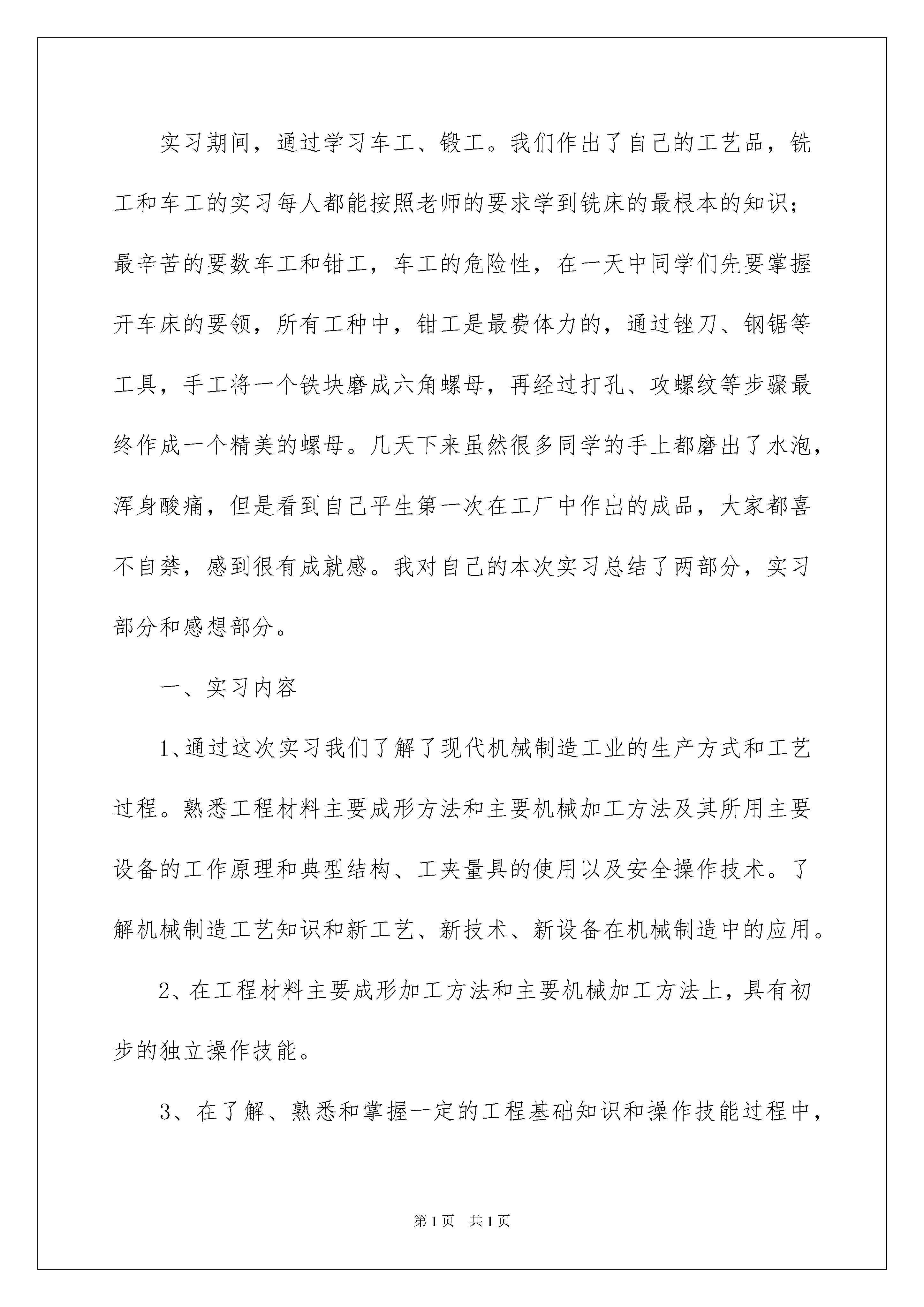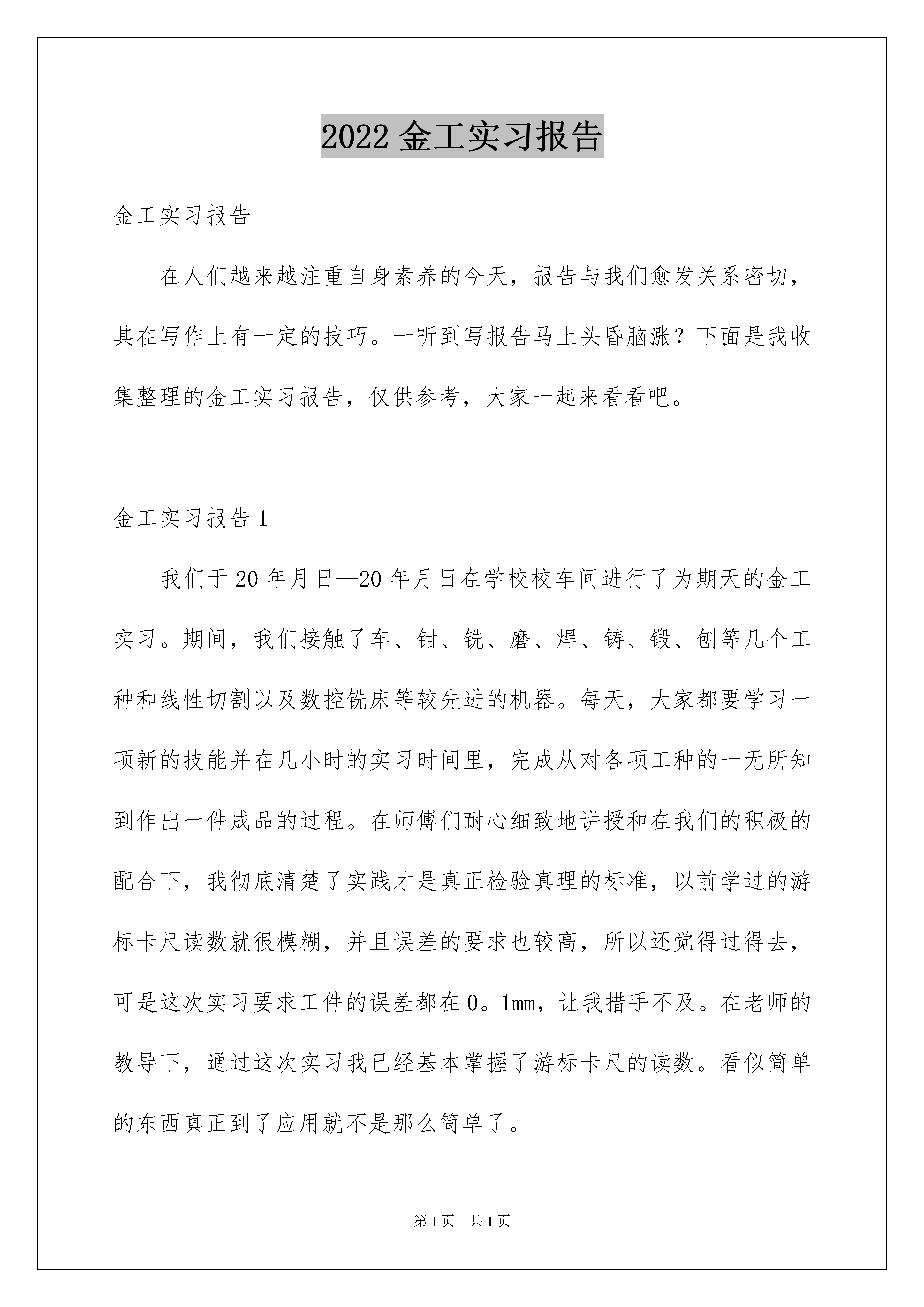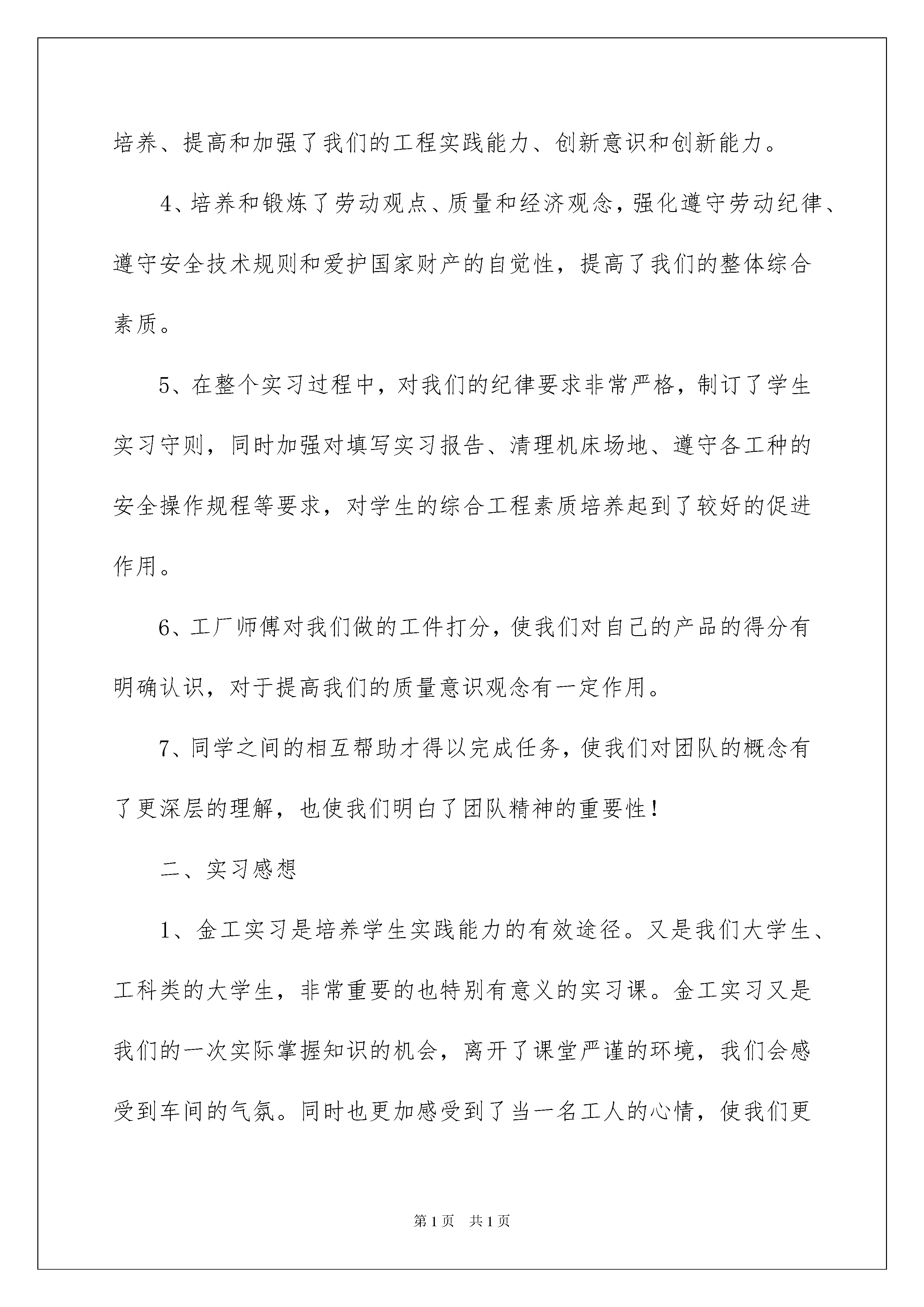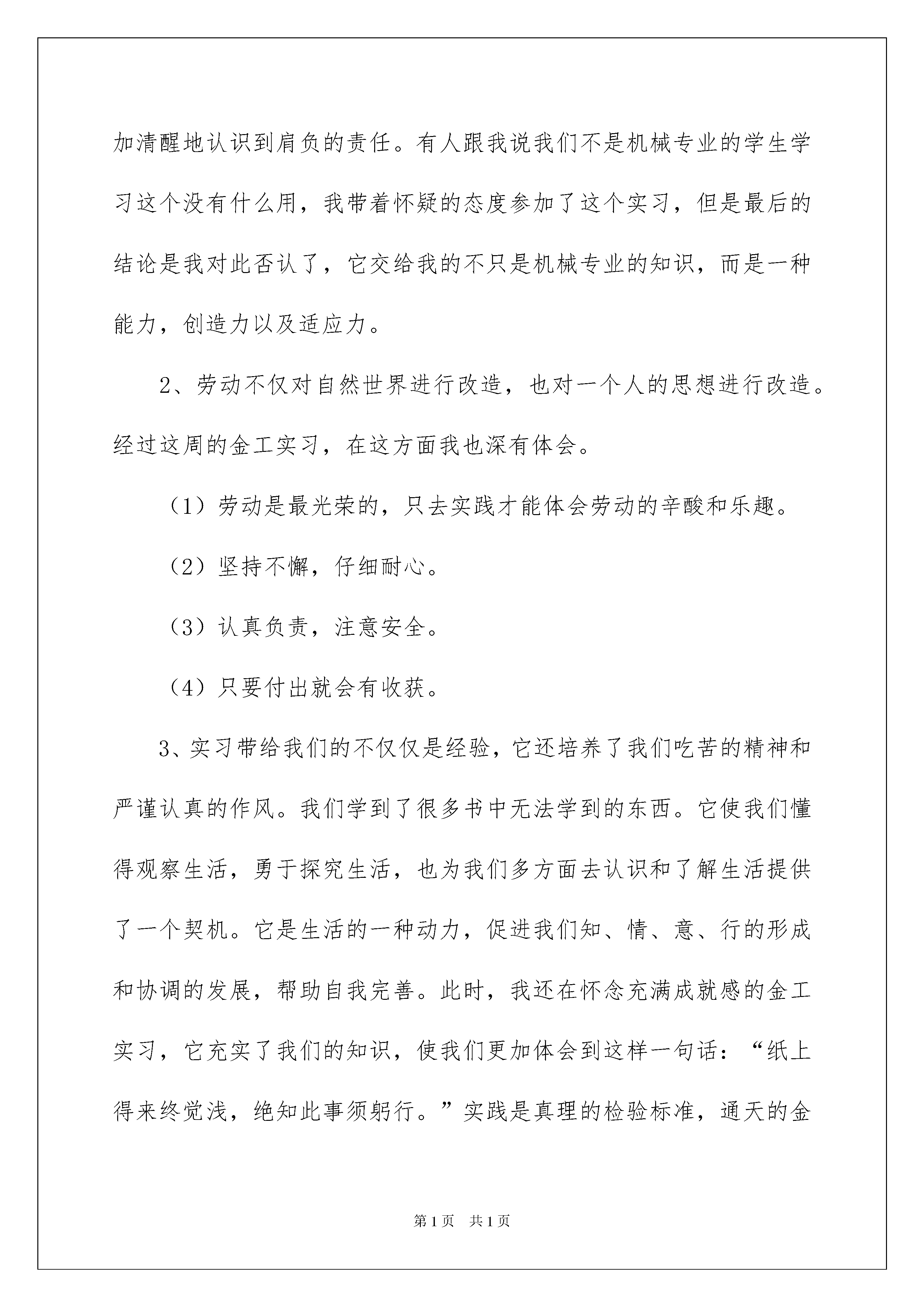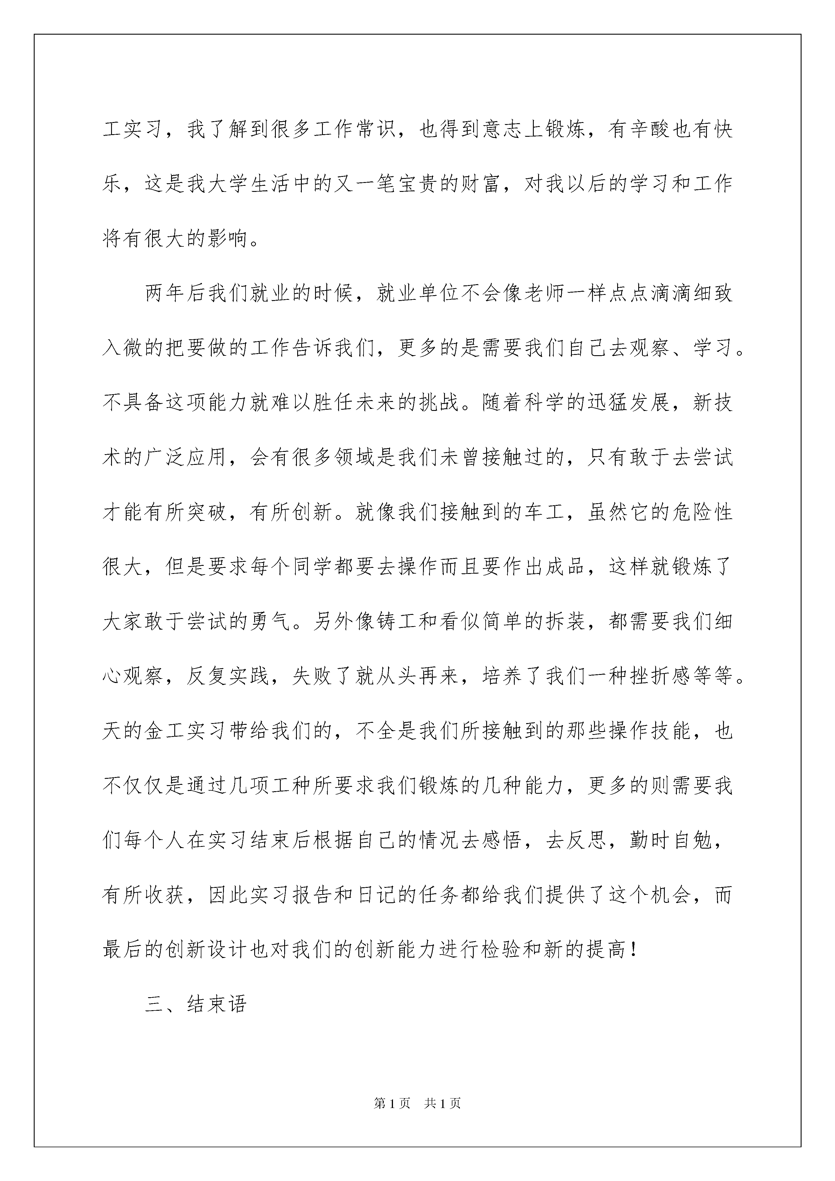 2022金工实习报告金工实习报告在人们越来越注重自身素养的今天,报告与我们愈发关系密切,其在写作上有一定的技巧。一听到写报告马上头昏脑涨?下面是我收集整理的金工实习报告,仅供参考,大家一起来看看吧。金工实习报告1我们于20年月日—20年月日在学校校车间进行了为期天的金工实习。期间,我们接触了车、钳、铣、磨、焊、铸、锻、刨等几个工种和线性切割以及数控铣床等较先进的机器。每天,大家都要学习一项新的技能并在几小时的实习时间里,完成从对各项工种的一无所知到作出一件成品的过程。在师傅们耐心细致地讲授和在我们的积极的配合下,我彻底清楚了实践才是真正检验真理的标准,以前学过的游标卡尺读数就很模糊,并且误差的要求也较高,所以还觉得过得去,可是这次实习要求工件的误差都在0。1mm,让我措手不及。在老师的教导下,通过这次实习我已经基本掌握了游标卡尺的读数。看似简单的东西真正到了应用就不是那么简单了。实习期间,通过学习车工、锻工。我们作出了自己的工艺品,铣工和车工的实习每人都能按照老师的要求学到铣床的最根本的知识;最辛苦的要数车工和钳工,车工的危险性,在一天中同学们先要掌握开车床的要领,所有工种中,钳工是最费体力的,通过锉刀、钢锯等工具,手工将一个铁块磨成六角螺母,再经过打孔、攻螺纹等步骤最终作成一个精美的螺母。几天下来虽然很多同学的手上都磨出了水泡,浑身酸痛,但是看到自己平生第一次在工厂中作出的成品,大家都喜不自禁,感到很有成就感。我对自己的本次实习总结了两部分,实习部分和感想部分。一、实习内容1、通过这次实习我们了解了现代机械制造工业的生产方式和工艺过程。熟悉工程材料主要成形方法和主要机械加工方法及其所用主要设备的工作原理和典型结构、工夹量具的使用以及安全操作技术。了解机械制造工艺知识和新工艺、新技术、新设备在机械制造中的应用。2、在工程材料主要成形加工方法和主要机械加工方法上,具有初步的独立操作技能。3、在了解、熟悉和掌握一定的工程基础知识和操作技能过程中,培养、提高和加强了我们的工程实践能力、创新意识和创新能力。4、培养和锻炼了劳动观点、质量和经济观念,强化遵守劳动纪律、遵守安全技术规则和爱护国家财产的自觉性,提高了我们的整体综合素质。5、在整个实习过程中,对我们的纪律要求非常严格,制订了学生实习守则,同时加强对填写实习报告、清理机床场地、遵守各工种的安全操作规程等要求,对学生的综合工程素质培养起到了较好的促进作用。6、工厂师傅对我们做的工件打分,使我们对自己的产品的得分有明确认识,对于提高我们的质量意识观念有一定作用。7、同学之间的相互帮助才得以完成任务,使我们对团队的概念有了更深层的理解,也使我们明白了团队精神的重要性!二、实习感想1、金工实习是培养学生实践能力的有效途径。又是我们大学生、工科类的大学生,非常重要的也特别有意义的实习课。金工实习又是我们的一次实际掌握知识的机会,离开了课堂严谨的环境,我们会感受到车间的气氛。同时也更加感受到了当一名工人的心情,使我们更加清醒地认识到肩负的责任。有人跟我说我们不是机械专业的学生学习这个没有什么用,我带着怀疑的态度参加了这个实习,但是最后的结论是我对此否认了,它交给我的不只是机械专业的知识,而是一种能力,创造力以及适应力。2、劳动不仅对自然世界进行改造,也对一个人的思想进行改造。经过这周的金工实习,在这方面我也深有体会。(1)劳动是最光荣的,只去实践才能体会劳动的辛酸和乐趣。(2)坚持不懈,仔细耐心。(3)认真负责,注意安全。(4)只要付出就会有收获。3、实习带给我们的不仅仅是经验,它还培养了我们吃苦的精神和严谨认真的作风。我们学到了很多书中无法学到的东西。它使我们懂得观察生活,勇于探究生活,也为我们多方面去认识和了解生活提供了一个契机。它是生活的一种动力,促进我们知、情、意、行的形成和协调的发展,帮助自我完善。此时,我还在怀念充满成就感的金工实习,它充实了我们的知识,使我们更加体会到这样一句话:“纸上得来终觉浅,绝知此事须躬行。”实践是真理的检验标准,通天的金工实习,我了解到很多工作常识,也得到意志上锻炼,有辛酸也有快乐,这是我大学生活中的又一笔宝贵的财富,对我以后的学习和工作将有很大的影响。两年后我们就业的时候,就业单位不会像老师一样点点滴滴细致入微的把要做的工作告诉我们,更多的是需要我们自己去观察、学习。不具备这项能力就难以胜任未来的挑战。随着科学的迅猛发展,新技术的广泛应用,会有很多领域是我们未曾接触过的,只有敢于去尝试才能有所突破,有所创新。就像我们接触到的车工,虽然它的危险性很大,但是要求每个同学都要去操作而且要作出成品,这样