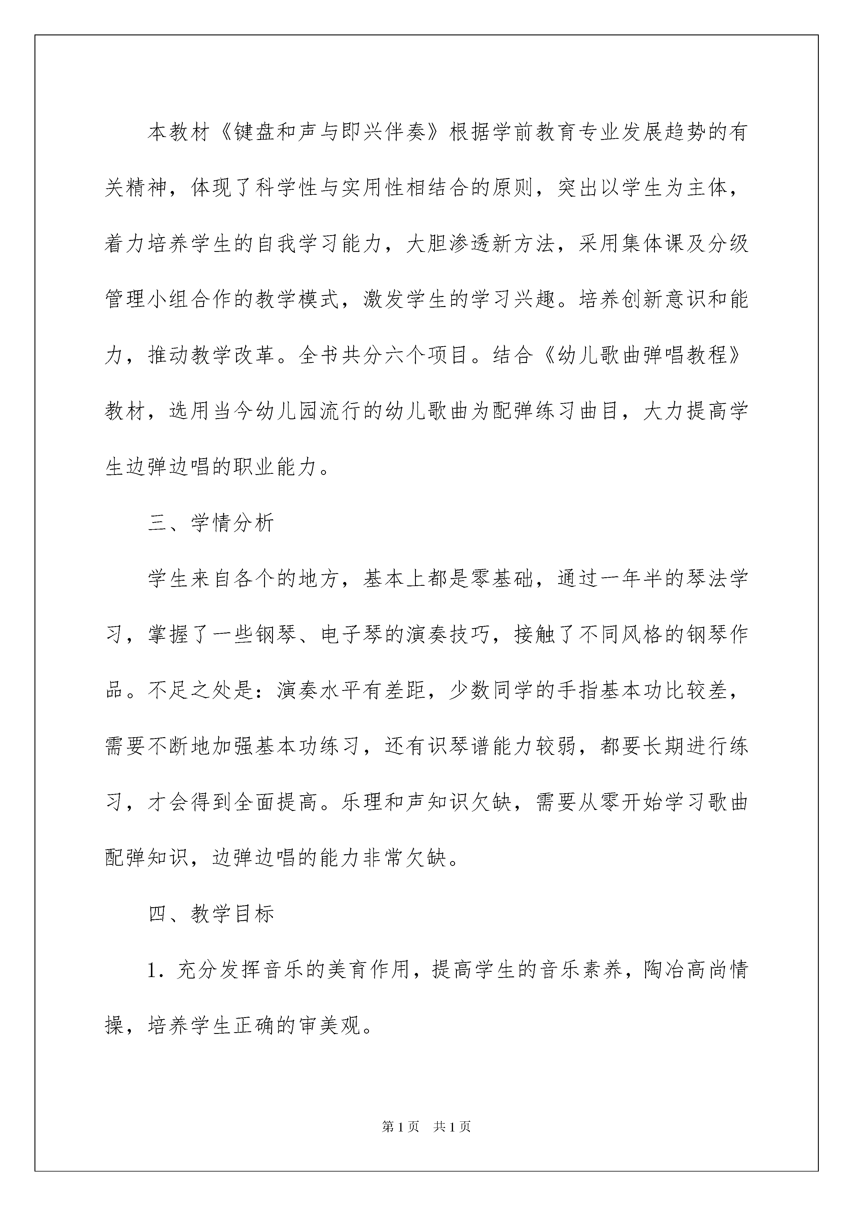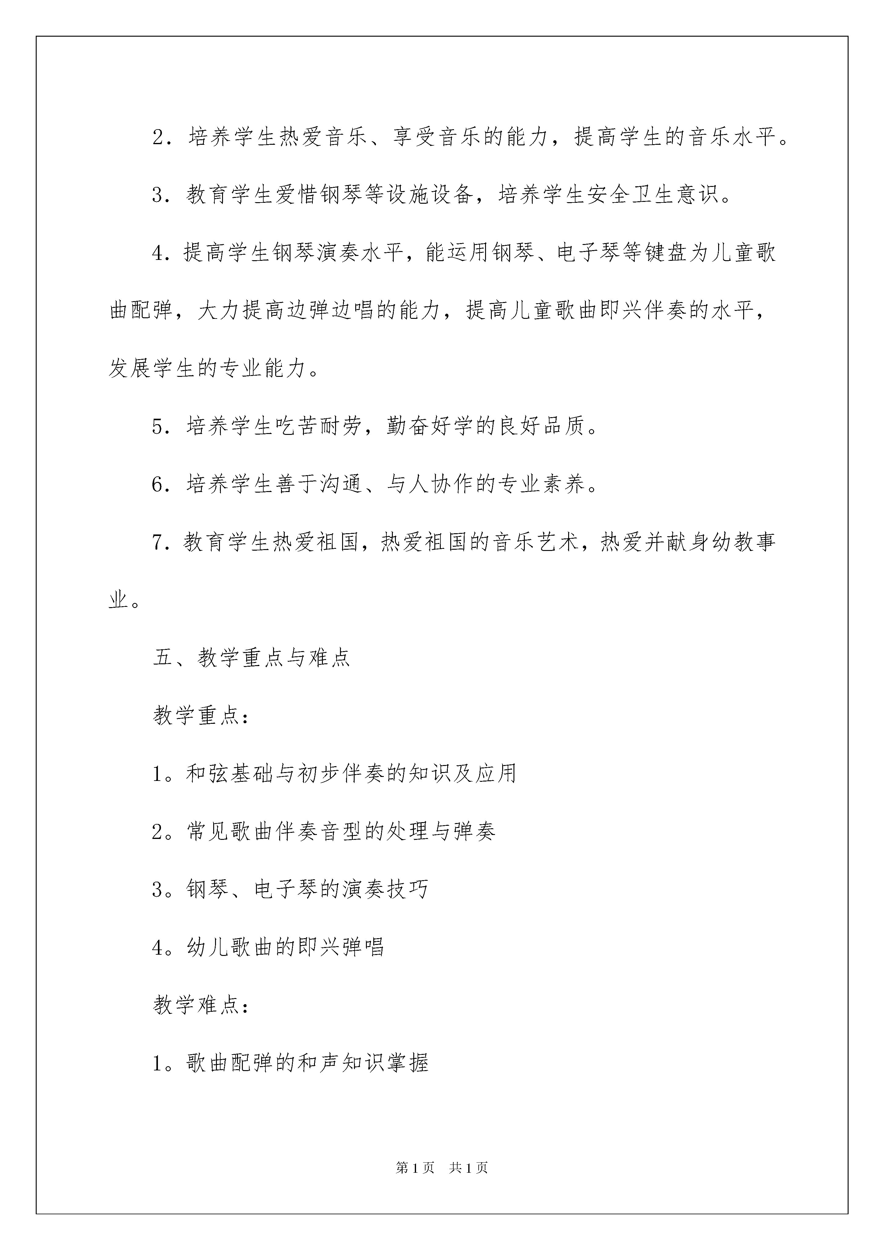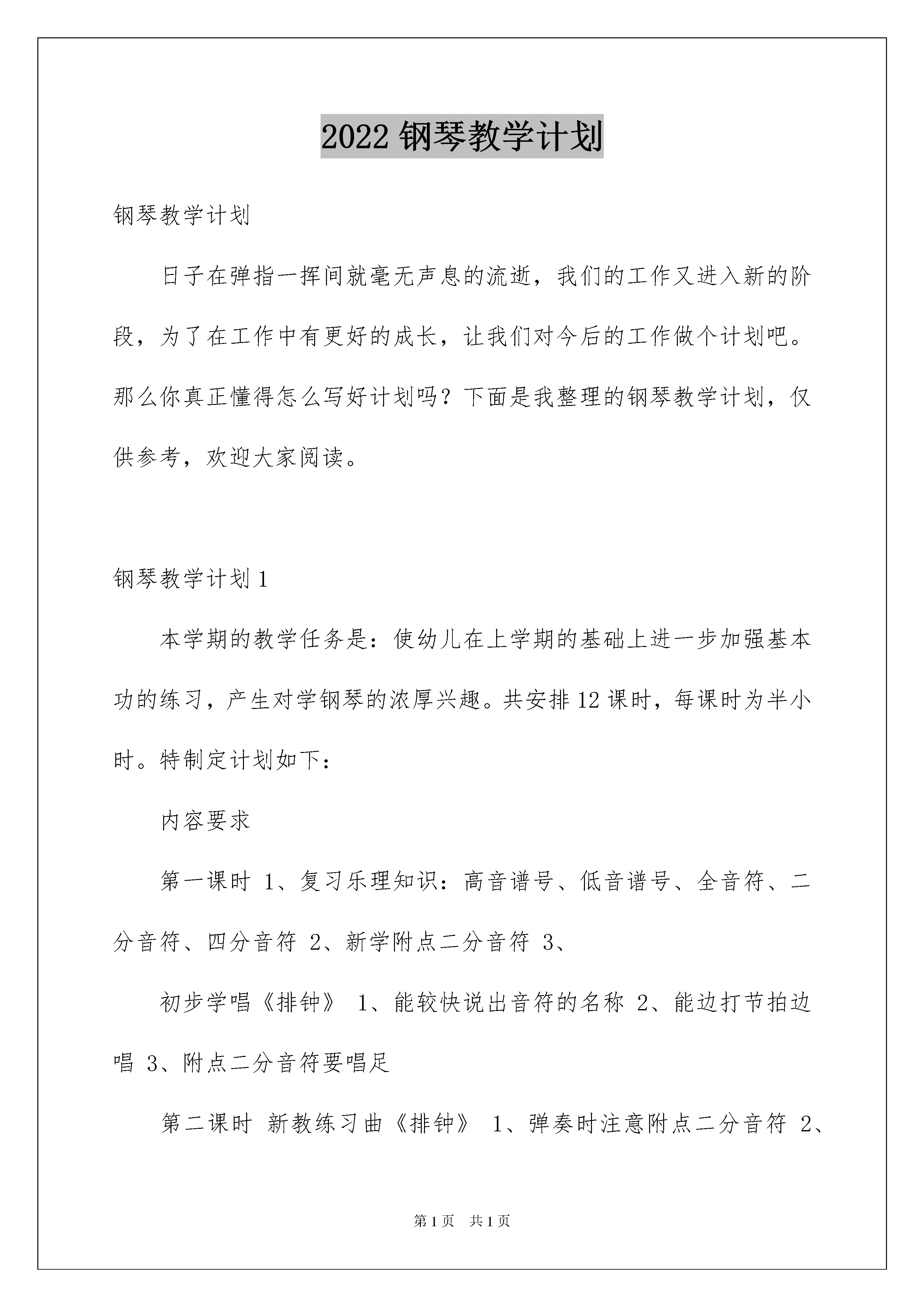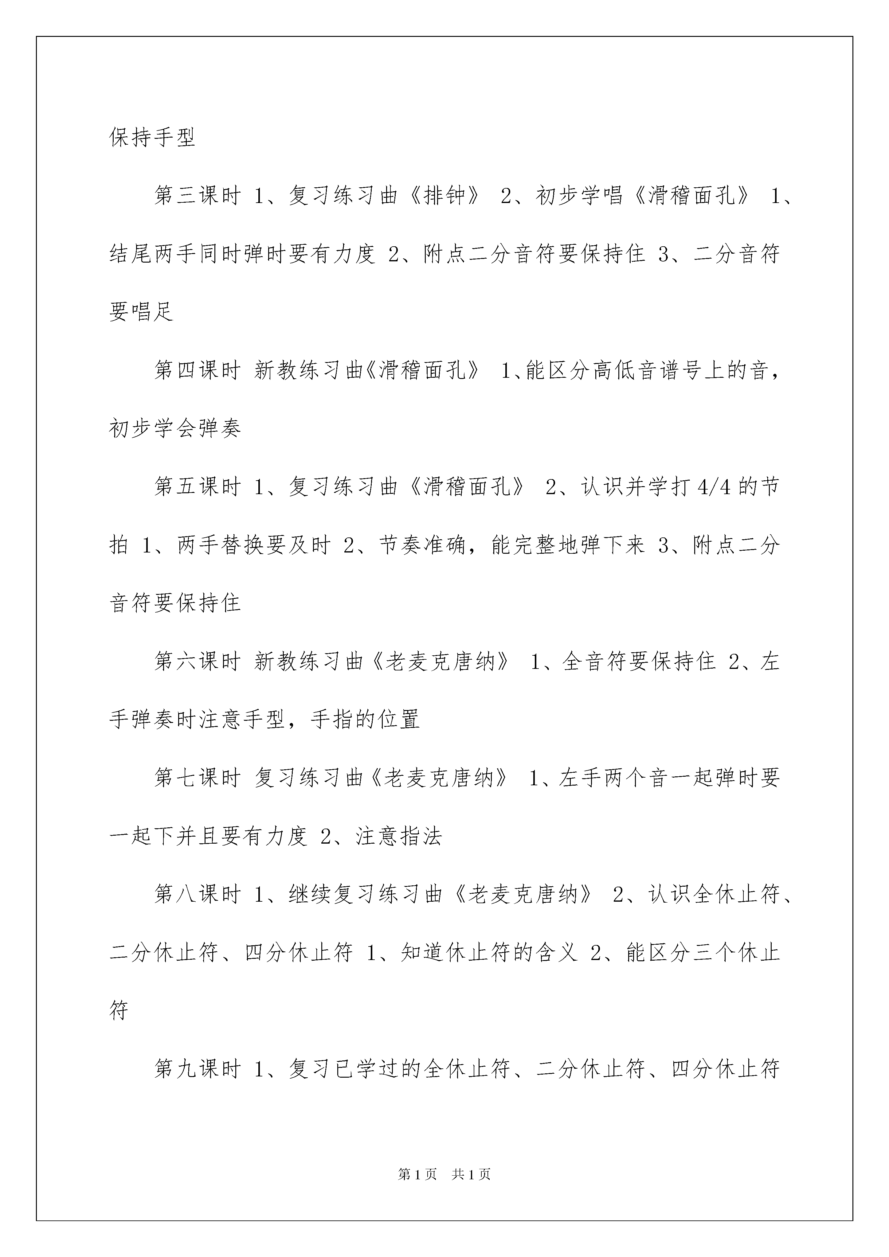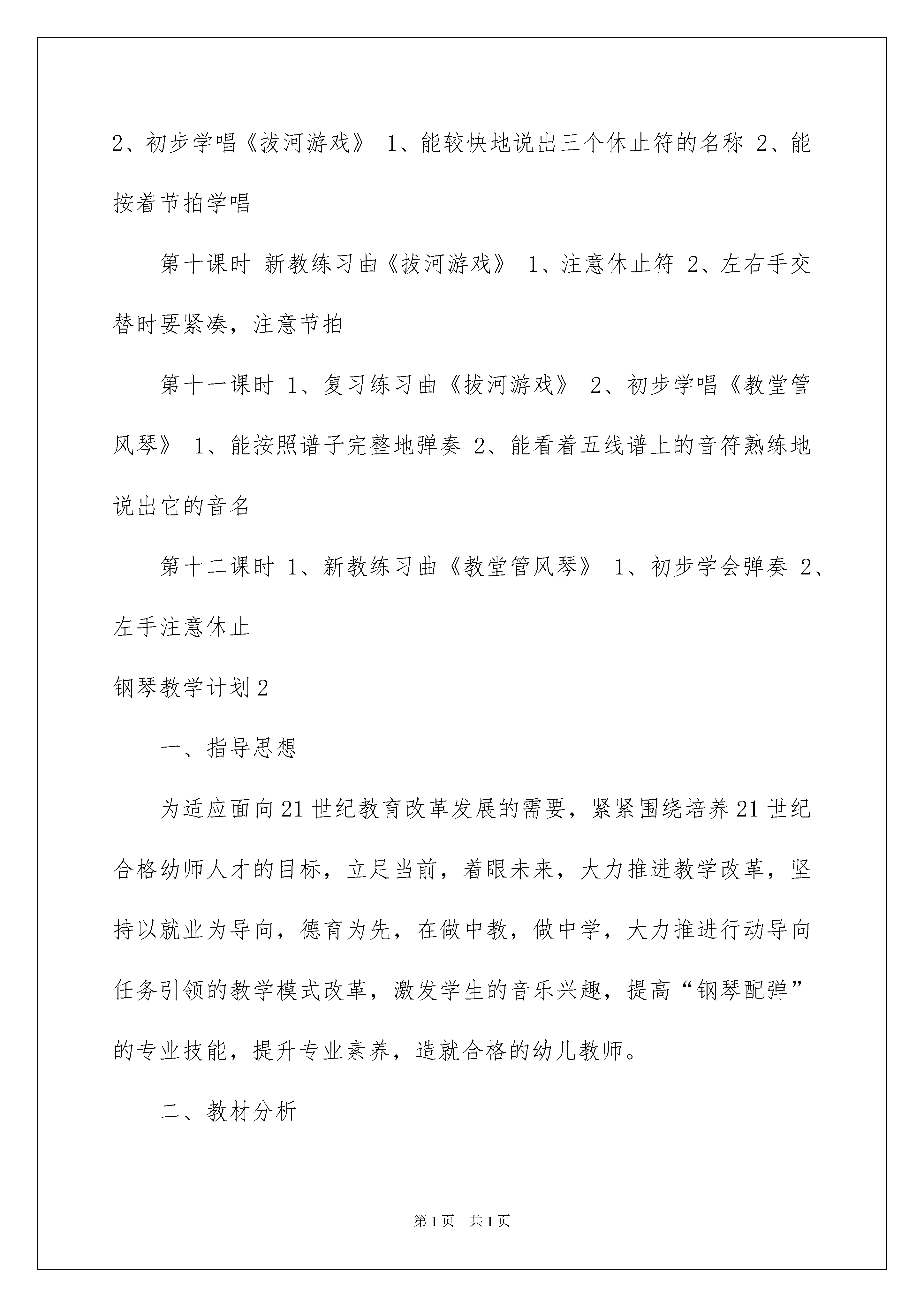 2022钢琴教学计划钢琴教学计划日子在弹指一挥间就毫无声息的流逝,我们的工作又进入新的阶段,为了在工作中有更好的成长,让我们对今后的工作做个计划吧。那么你真正懂得怎么写好计划吗?下面是我整理的钢琴教学计划,仅供参考,欢迎大家阅读。钢琴教学计划1本学期的教学任务是:使幼儿在上学期的基础上进一步加强基本功的练习,产生对学钢琴的浓厚兴趣。共安排12课时,每课时为半小时。特制定计划如下:内容要求第一课时1、复习乐理知识:高音谱号、低音谱号、全音符、二分音符、四分音符2、新学附点二分音符3、初步学唱《排钟》1、能较快说出音符的名称2、能边打节拍边唱3、附点二分音符要唱足第二课时新教练习曲《排钟》1、弹奏时注意附点二分音符2、保持手型第三课时1、复习练习曲《排钟》2、初步学唱《滑稽面孔》1、结尾两手同时弹时要有力度2、附点二分音符要保持住3、二分音符要唱足第四课时新教练习曲《滑稽面孔》1、能区分高低音谱号上的音,初步学会弹奏第五课时1、复习练习曲《滑稽面孔》2、认识并学打4/4的节拍1、两手替换要及时2、节奏准确,能完整地弹下来3、附点二分音符要保持住第六课时新教练习曲《老麦克唐纳》1、全音符要保持住2、左手弹奏时注意手型,手指的位置第七课时复习练习曲《老麦克唐纳》1、左手两个音一起弹时要一起下并且要有力度2、注意指法第八课时1、继续复习练习曲《老麦克唐纳》2、认识全休止符、二分休止符、四分休止符1、知道休止符的含义2、能区分三个休止符第九课时1、复习已学过的全休止符、二分休止符、四分休止符2、初步学唱《拔河游戏》1、能较快地说出三个休止符的名称2、能按着节拍学唱第十课时新教练习曲《拔河游戏》1、注意休止符2、左右手交替时要紧凑,注意节拍第十一课时1、复习练习曲《拔河游戏》2、初步学唱《教堂管风琴》1、能按照谱子完整地弹奏2、能看着五线谱上的音符熟练地说出它的音名第十二课时1、新教练习曲《教堂管风琴》1、初步学会弹奏2、左手注意休止钢琴教学计划2一、指导思想为适应面向21世纪教育改革发展的需要,紧紧围绕培养21世纪合格幼师人才的目标,立足当前,着眼未来,大力推进教学改革,坚持以就业为导向,德育为先,在做中教,做中学,大力推进行动导向任务引领的教学模式改革,激发学生的音乐兴趣,提高“钢琴配弹”的专业技能,提升专业素养,造就合格的幼儿教师。二、教材分析本教材《键盘和声与即兴伴奏》根据学前教育专业发展趋势的有关精神,体现了科学性与实用性相结合的原则,突出以学生为主体,着力培养学生的自我学习能力,大胆渗透新方法,采用集体课及分级管理小组合作的教学模式,激发学生的学习兴趣。培养创新意识和能力,推动教学改革。全书共分六个项目。结合《幼儿歌曲弹唱教程》教材,选用当今幼儿园流行的幼儿歌曲为配弹练习曲目,大力提高学生边弹边唱的职业能力。三、学情分析学生来自各个的地方,基本上都是零基础,通过一年半的琴法学习,掌握了一些钢琴、电子琴的演奏技巧,接触了不同风格的钢琴作品。不足之处是:演奏水平有差距,少数同学的手指基本功比较差,需要不断地加强基本功练习,还有识琴谱能力较弱,都要长期进行练习,才会得到全面提高。乐理和声知识欠缺,需要从零开始学习歌曲配弹知识,边弹边唱的能力非常欠缺。四、教学目标1.充分发挥音乐的美育作用,提高学生的音乐素养,陶冶高尚情操,培养学生正确的审美观。2.培养学生热爱音乐、享受音乐的能力,提高学生的音乐水平。3.教育学生爱惜钢琴等设施设备,培养学生安全卫生意识。4.提高学生钢琴演奏水平,能运用钢琴、电子琴等键盘为儿童歌曲配弹,大力提高边弹边唱的能力,提高儿童歌曲即兴伴奏的水平,发展学生的专业能力。5.培养学生吃苦耐劳,勤奋好学的良好品质。6.培养学生善于沟通、与人协作的专业素养。7.教育学生热爱祖国,热爱祖国的音乐艺术,热爱并献身幼教事业。五、教学重点与难点教学重点:1。和弦基础与初步伴奏的知识及应用2。常见歌曲伴奏音型的处理与弹奏3。钢琴、电子琴的演奏技巧4。幼儿歌曲的即兴弹唱教学难点:1。歌曲配弹的和声知识掌握2。各种不同伴奏音型的双手配合3。幼儿歌曲的边弹边唱六、具体措施及教学方法具体措施:1。运用多元化的教学手段,提高课堂教学质量。2。寓教于乐,激发学生的学习兴趣。3。丰富课堂形式,运用实训教室和多媒体教学4。运用生动形象的比喻,创设活跃的课堂气氛5。分层教学,做到面向全体,因材施教。6。用归纳比较法,帮助学生发现规律,总结规律,掌握科学学习方法。教学方法:1。运用任务驱动法、演示法、归纳比较法、讲解法、分析法等教学方法。2。运用现代化设备,打击乐器为课堂增添色彩。3。面向全体学