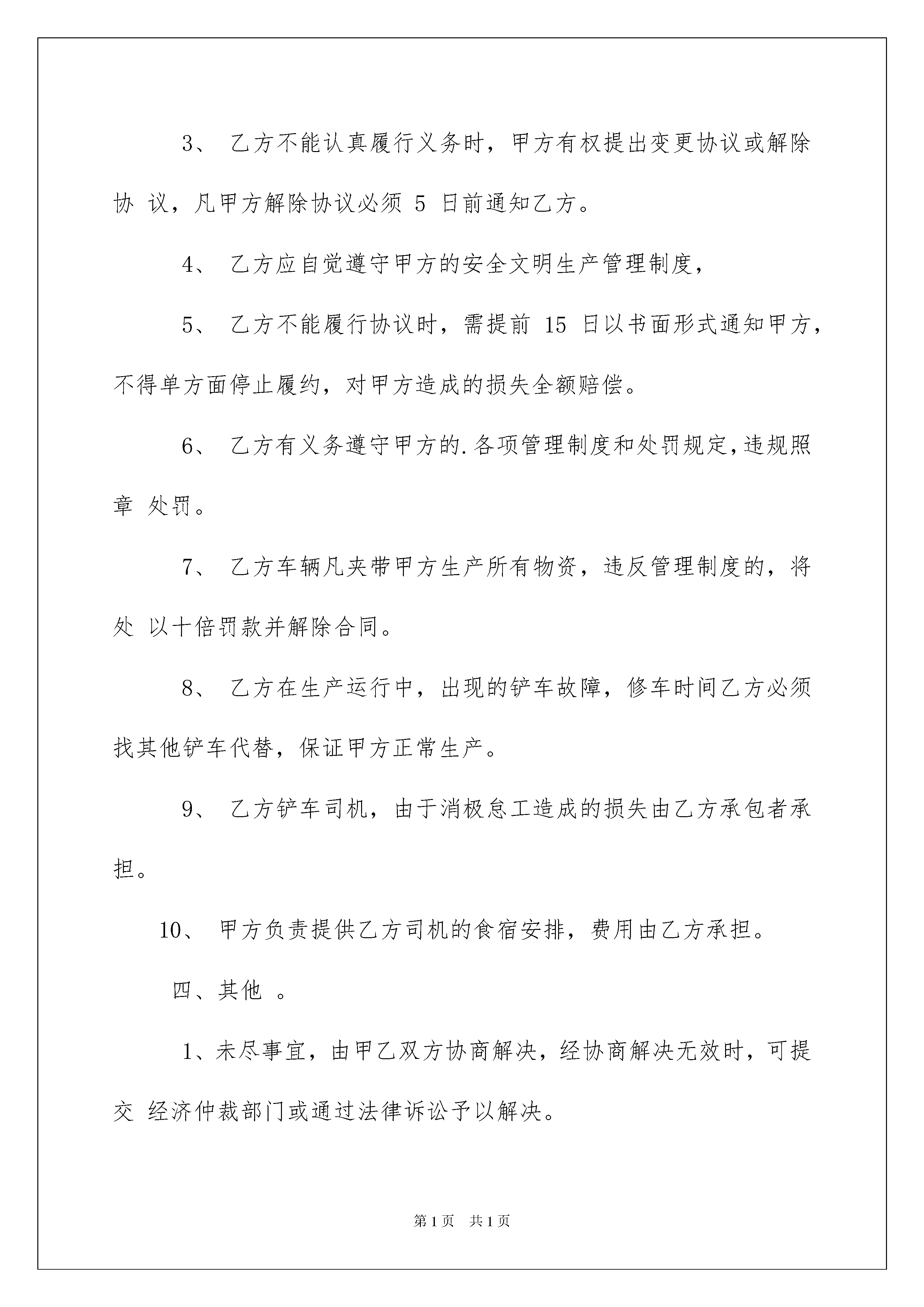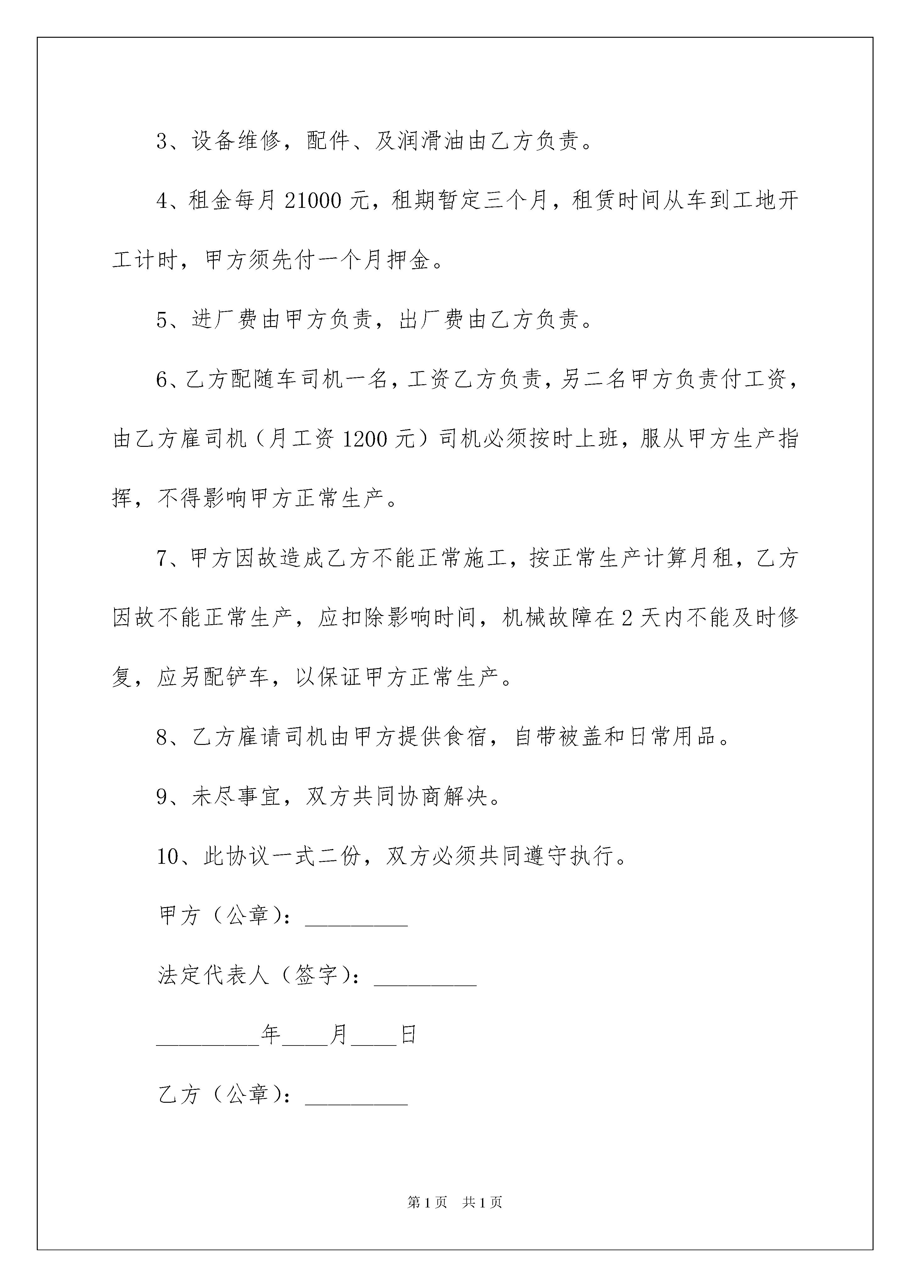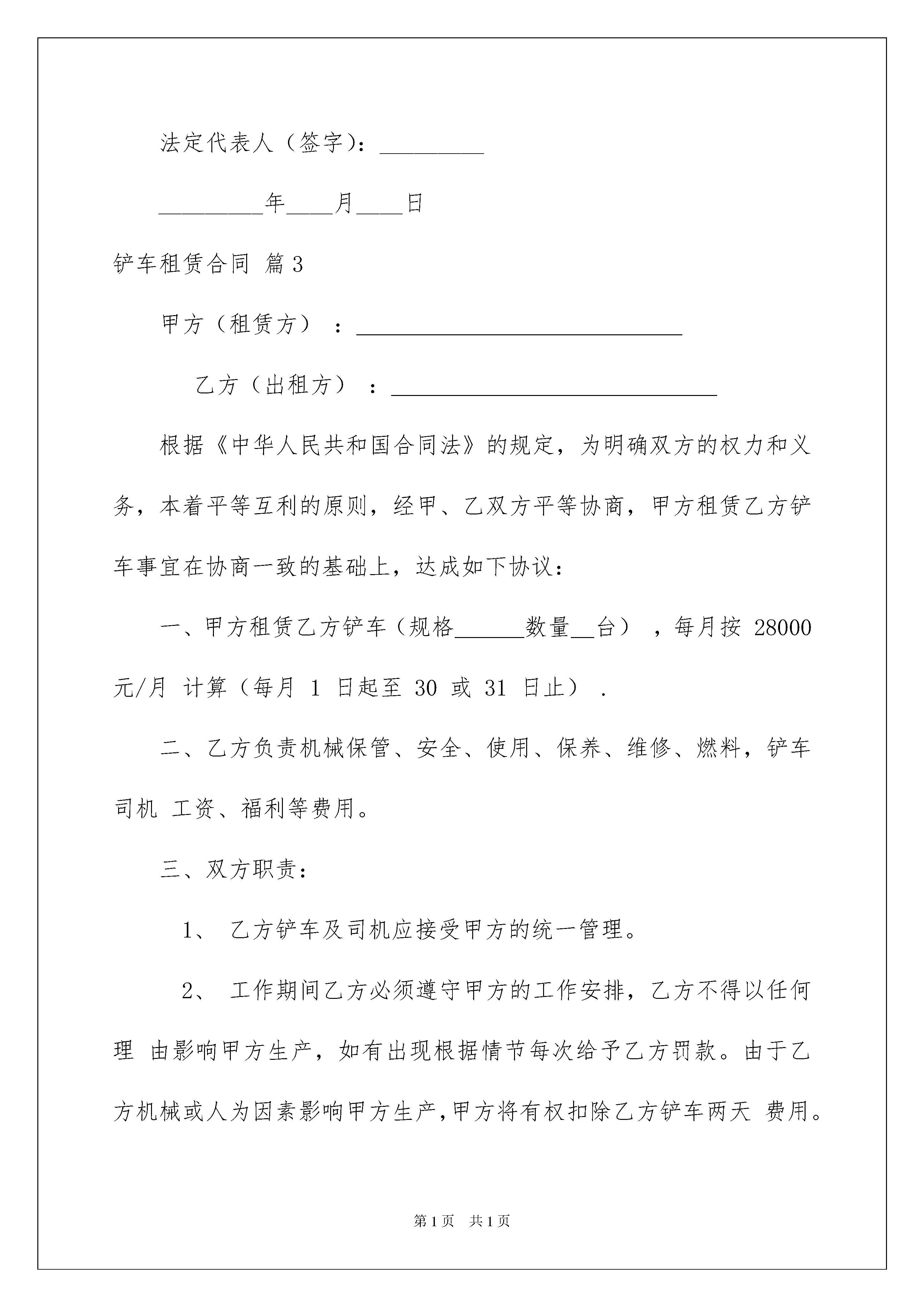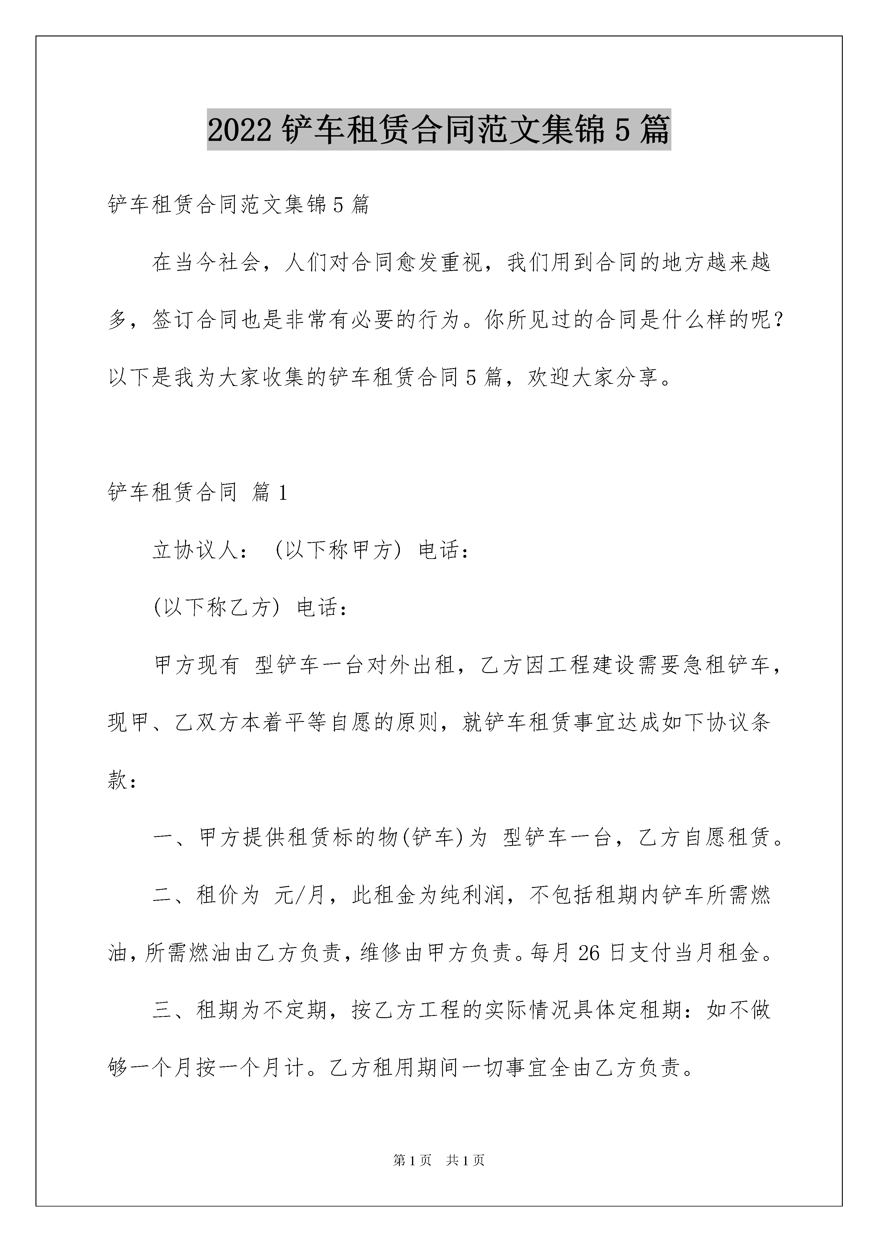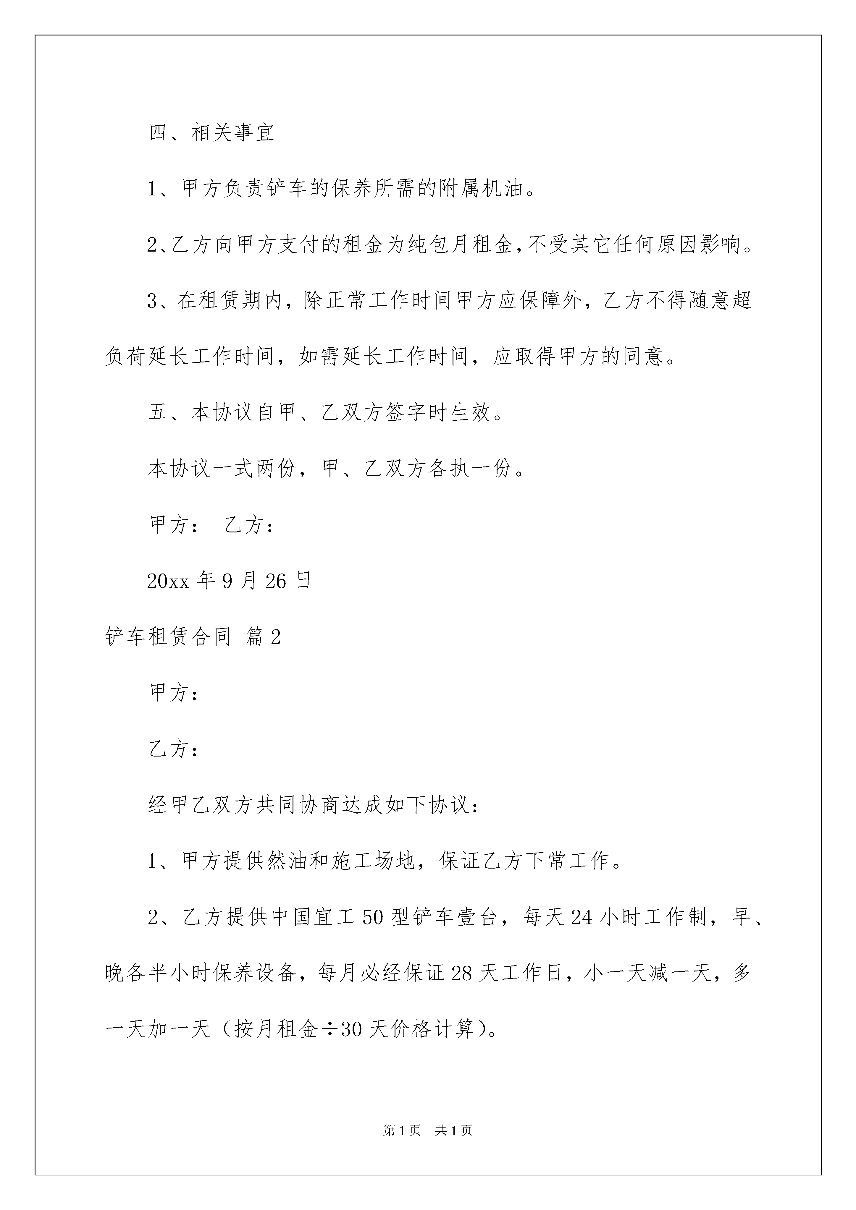 2022铲车租赁合同范文集锦5篇铲车租赁合同范文集锦5篇在当今社会,人们对合同愈发重视,我们用到合同的地方越来越多,签订合同也是非常有必要的行为。你所见过的合同是什么样的呢?以下是我为大家收集的铲车租赁合同5篇,欢迎大家分享。铲车租赁合同篇1立协议人:(以下称甲方)电话:(以下称乙方)电话:甲方现有型铲车一台对外出租,乙方因工程建设需要急租铲车,现甲、乙双方本着平等自愿的原则,就铲车租赁事宜达成如下协议条款:一、甲方提供租赁标的物(铲车)为型铲车一台,乙方自愿租赁。二、租价为元/月,此租金为纯利润,不包括租期内铲车所需燃油,所需燃油由乙方负责,维修由甲方负责。每月26日支付当月租金。三、租期为不定期,按乙方工程的实际情况具体定租期:如不做够一个月按一个月计。乙方租用期间一切事宜全由乙方负责。四、相关事宜1、甲方负责铲车的保养所需的附属机油。2、乙方向甲方支付的租金为纯包月租金,不受其它任何原因影响。3、在租赁期内,除正常工作时间甲方应保障外,乙方不得随意超负荷延长工作时间,如需延长工作时间,应取得甲方的同意。五、本协议自甲、乙双方签字时生效。本协议一式两份,甲、乙双方各执一份。甲方:乙方:20xx年9月26日铲车租赁合同篇2甲方:乙方:经甲乙双方共同协商达成如下协议:1、甲方提供然油和施工场地,保证乙方下常工作。2、乙方提供中国宜工50型铲车壹台,每天24小时工作制,早、晚各半小时保养设备,每月必经保证28天工作日,小一天减一天,多一天加一天(按月租金÷30天价格计算)。3、设备维修,配件、及润滑油由乙方负责。4、租金每月21000元,租期暂定三个月,租赁时间从车到工地开工计时,甲方须先付一个月押金。5、进厂费由甲方负责,出厂费由乙方负责。6、乙方配随车司机一名,工资乙方负责,另二名甲方负责付工资,由乙方雇司机(月工资1200元)司机必须按时上班,服从甲方生产指挥,不得影响甲方正常生产。7、甲方因故造成乙方不能正常施工,按正常生产计算月租,乙方因故不能正常生产,应扣除影响时间,机械故障在2天内不能及时修复,应另配铲车,以保证甲方正常生产。8、乙方雇请司机由甲方提供食宿,自带被盖和日常用品。9、未尽事宜,双方共同协商解决。10、此协议一式二份,双方必须共同遵守执行。甲方(公章):_________法定代表人(签字):__________________年____月____日乙方(公章):_________法定代表人(签字):__________________年____月____日铲车租赁合同篇3甲方(租赁方):______________乙方(出租方):______________根据《中华人民共和国合同法》的规定,为明确双方的权力和义务,本着平等互利的原则,经甲、乙双方平等协商,甲方租赁乙方铲车事宜在协商一致的基础上,达成如下协议:一、甲方租赁乙方铲车(规格___数量_台),每月按28000元/月计算(每月1日起至30或31日止).二、乙方负责机械保管、安全、使用、保养、维修、燃料,铲车司机工资、福利等费用。三、双方职责:1、乙方铲车及司机应接受甲方的统一管理。2、工作期间乙方必须遵守甲方的工作安排,乙方不得以任何理由影响甲方生产,如有出现根据情节每次给予乙方罚款。由于乙方机械或人为因素影响甲方生产,甲方将有权扣除乙方铲车两天费用。3、乙方不能认真履行义务时,甲方有权提出变更协议或解除协议,凡甲方解除协议必须5日前通知乙方。4、乙方应自觉遵守甲方的安全文明生产管理制度,5、乙方不能履行协议时,需提前15日以书面形式通知甲方,不得单方面停止履约,对甲方造成的损失全额赔偿。6、乙方有义务遵守甲方的.各项管理制度和处罚规定,违规照章处罚。7、乙方车辆凡夹带甲方生产所有物资,违反管理制度的,将处以十倍罚款并解除合同。8、乙方在生产运行中,出现的铲车故障,修车时间乙方必须找其他铲车代替,保证甲方正常生产。9、乙方铲车司机,由于消极怠工造成的损失由乙方承包者承担。10、甲方负责提供乙方司机的食宿安排,费用由乙方承担。四、其他。1、未尽事宜,由甲乙双方协商解决,经协商解决无效时,可提交经济仲裁部门或通过法律诉讼予以解决。2、本协议有效期自___年_月_日至___年_月_日止。3、协议期满前15日经双方协商一致后,签订续约协议。4、本协议一式二份,甲方一份,乙方一份。5、本协议自签字之日起生效。甲方:(盖章)签字:乙方:(盖章)签字:年月日铲车租赁合同篇4承租方:(以下简称甲方)出租方:(以下简称乙方)根据《中华人民共和国合同法》及有关规定,为明确设备租赁双方的权利义务,甲方根据工程需