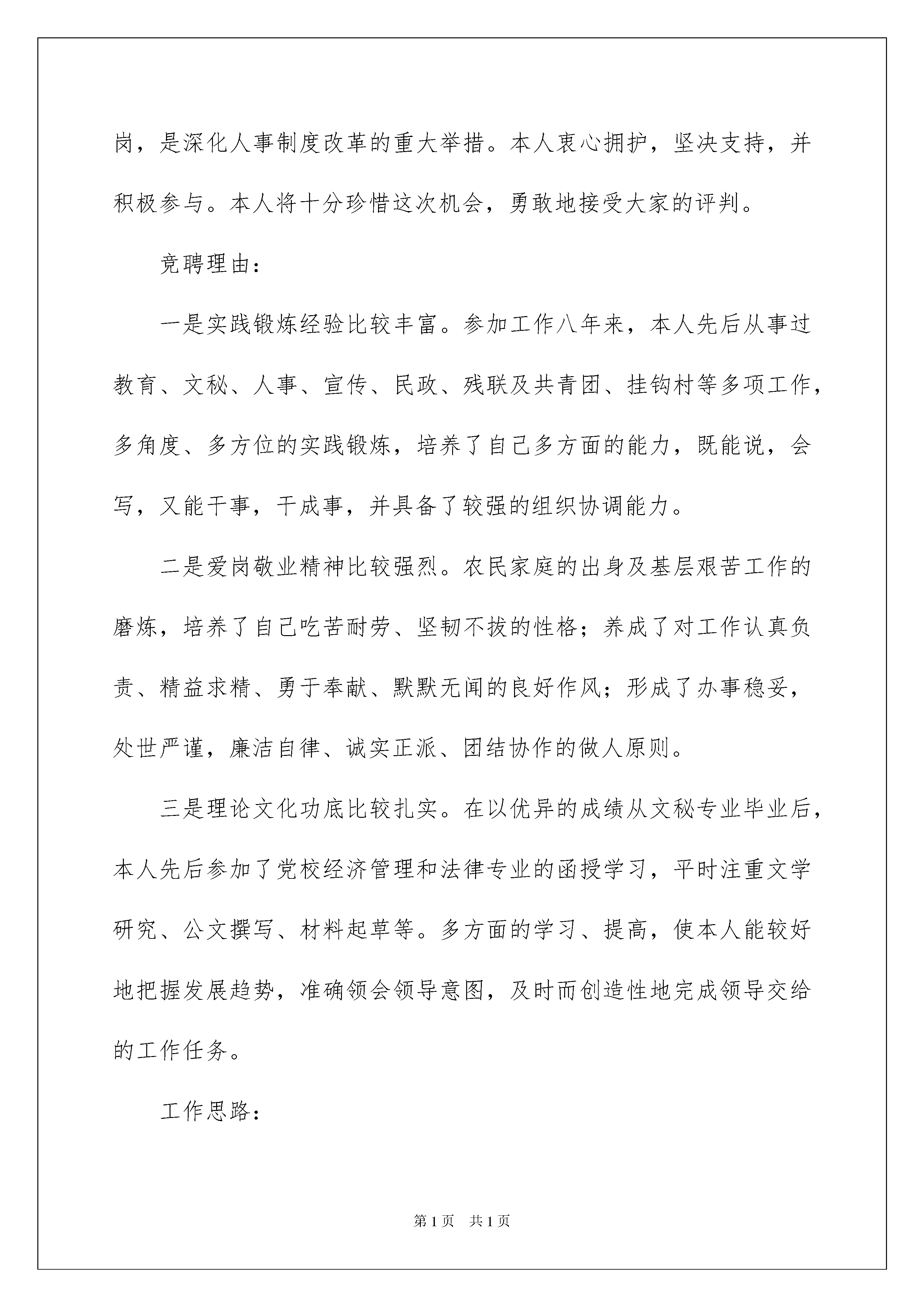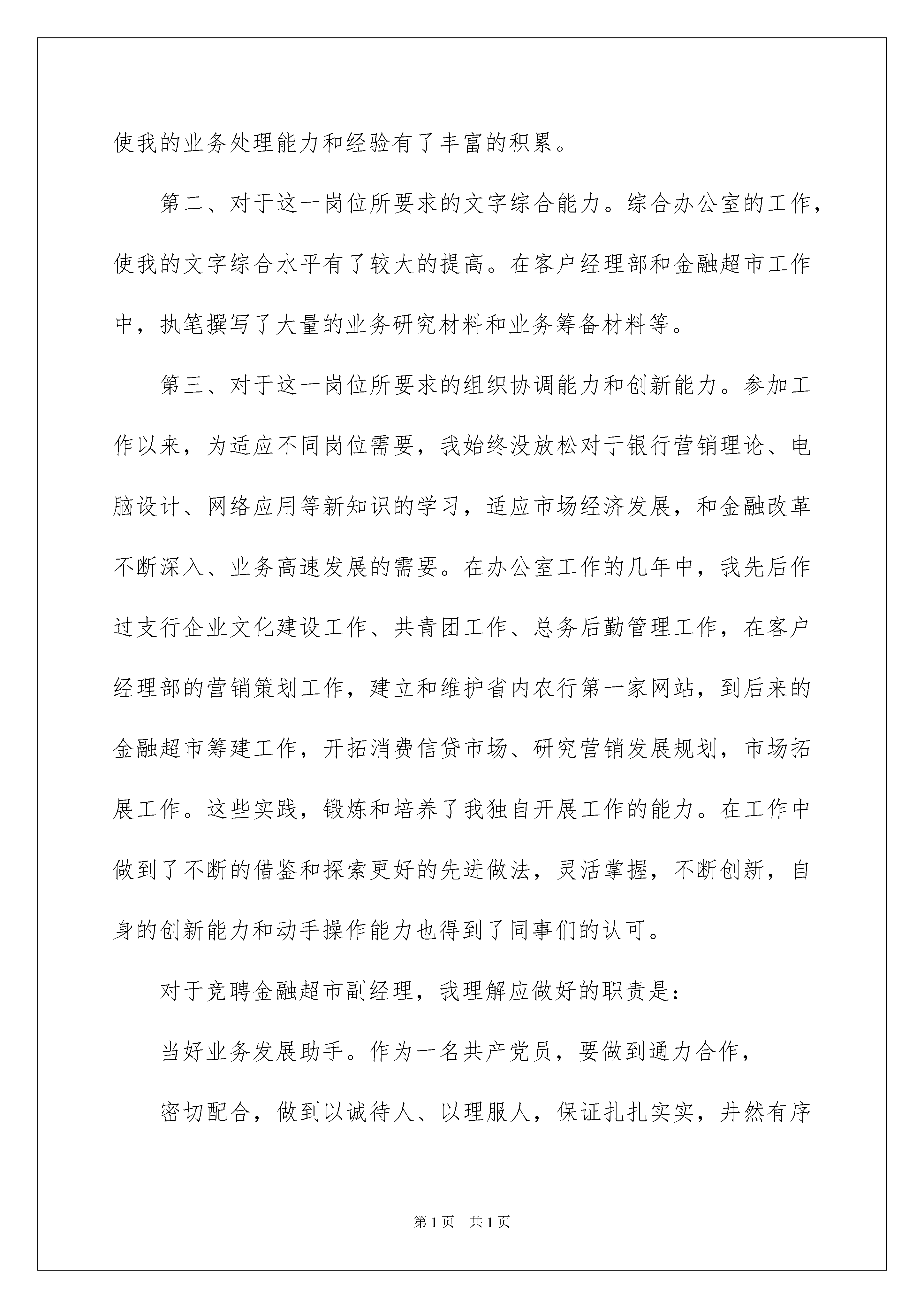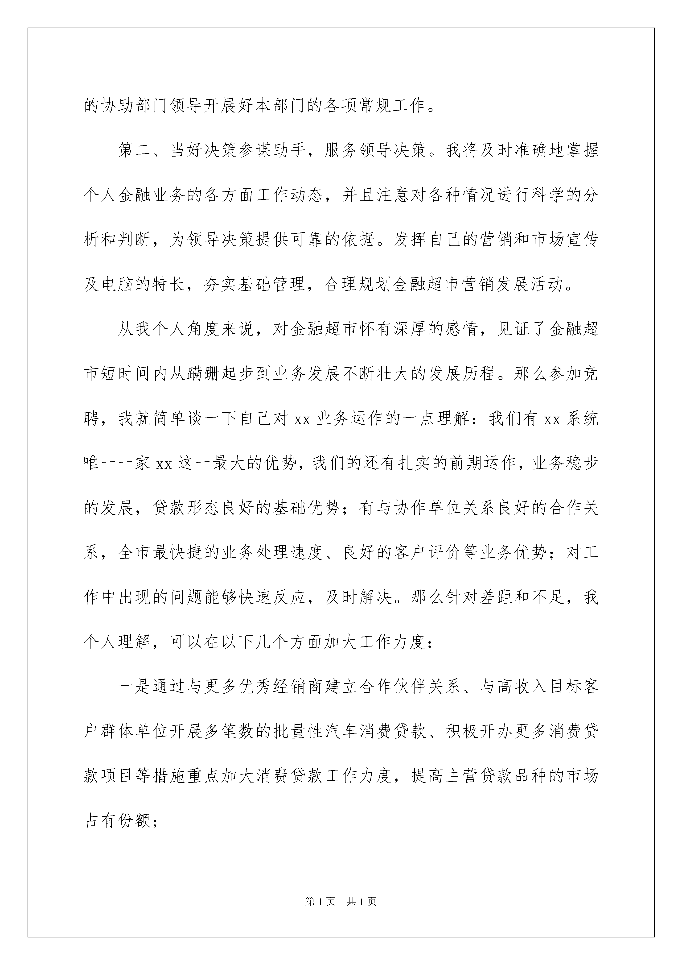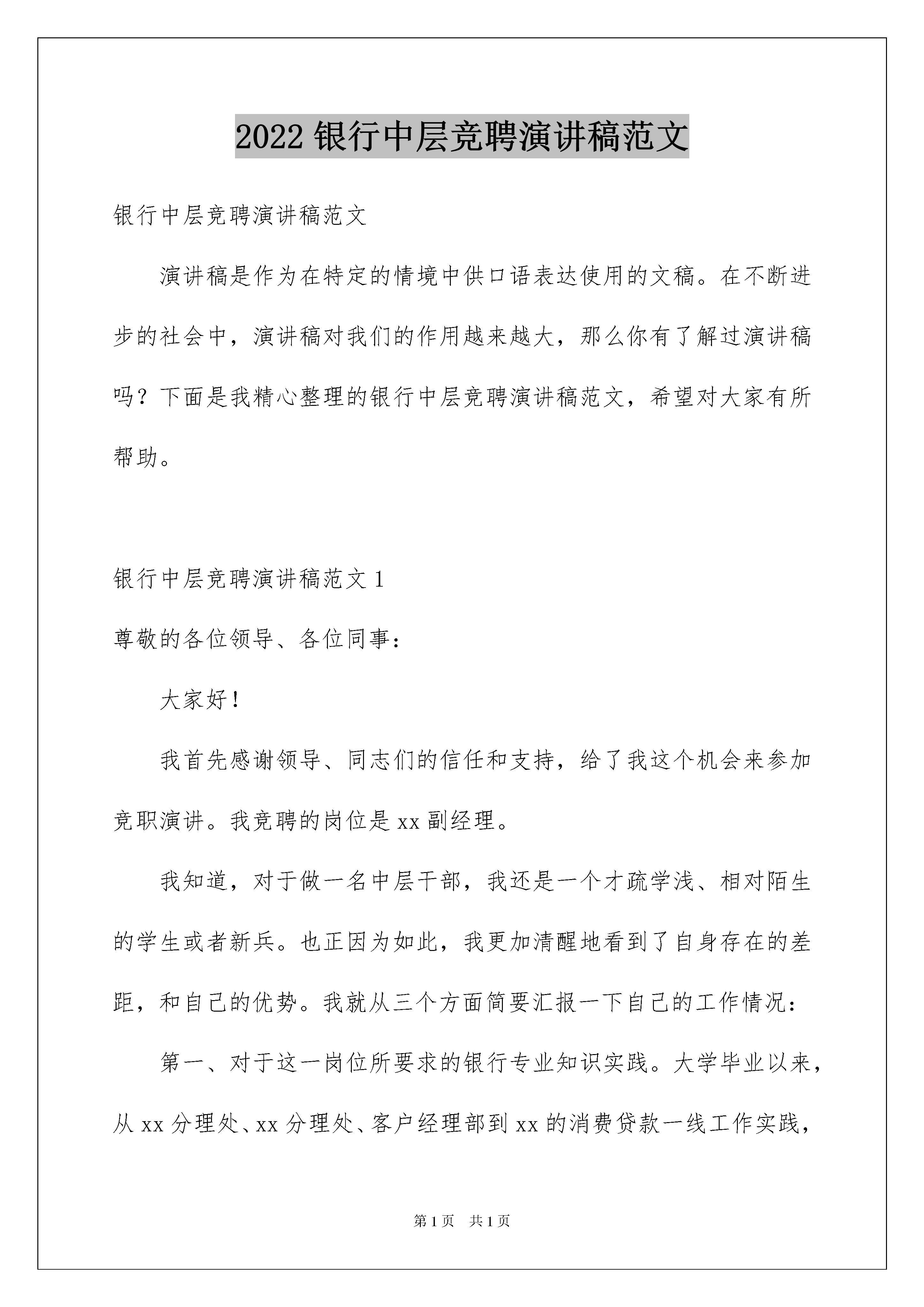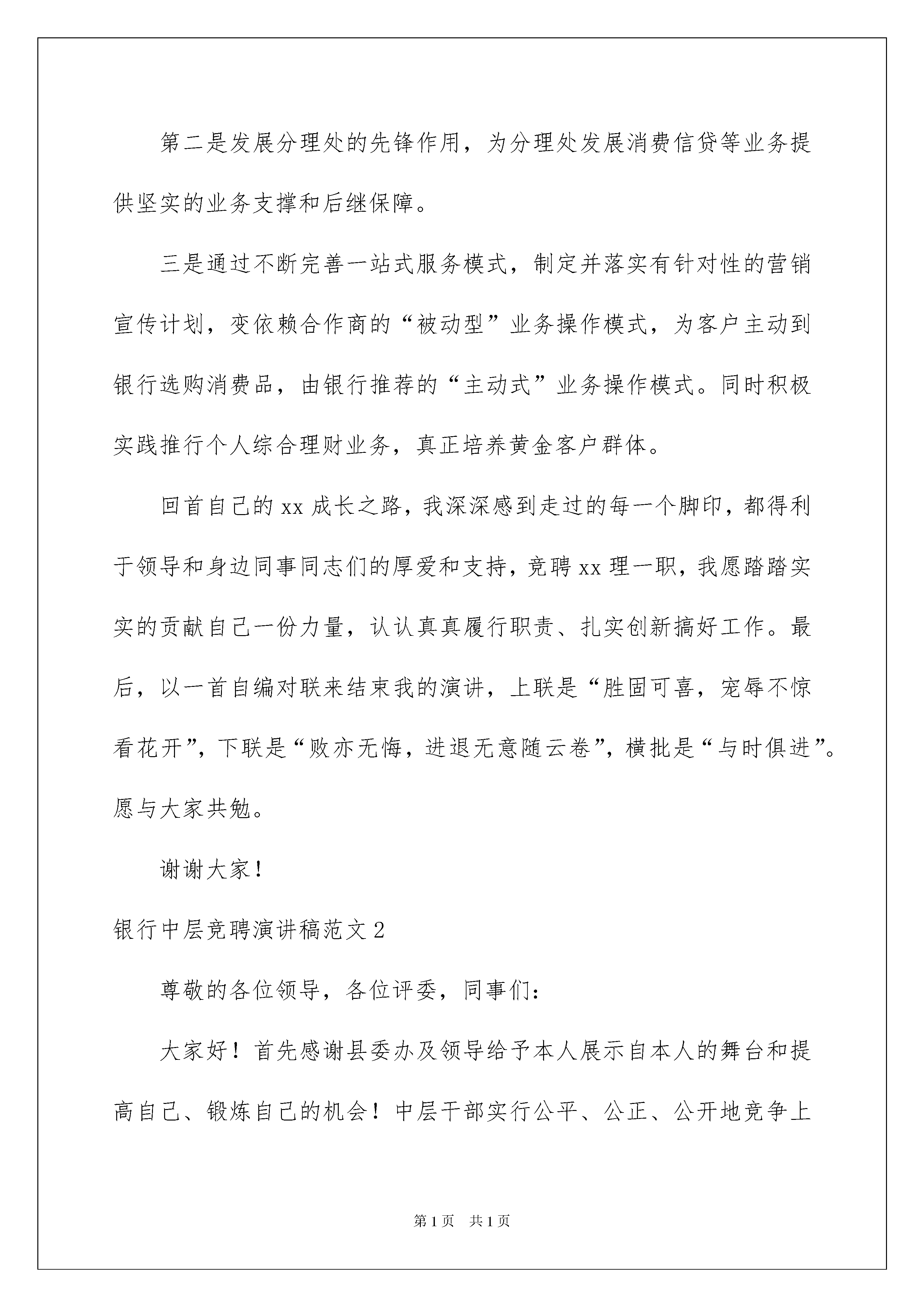2022银行中层竞聘演讲稿范文银行中层竞聘演讲稿范文演讲稿是作为在特定的情境中供口语表达使用的文稿。在不断进步的社会中,演讲稿对我们的作用越来越大,那么你有了解过演讲稿吗?下面是我精心整理的银行中层竞聘演讲稿范文,希望对大家有所帮助。银行中层竞聘演讲稿范文1尊敬的各位领导、各位同事:大家好!我首先感谢领导、同志们的信任和支持,给了我这个机会来参加竞职演讲。我竞聘的岗位是xx副经理。我知道,对于做一名中层干部,我还是一个才疏学浅、相对陌生的学生或者新兵。也正因为如此,我更加清醒地看到了自身存在的差距,和自己的优势。我就从三个方面简要汇报一下自己的工作情况:第一、对于这一岗位所要求的银行专业知识实践。大学毕业以来,从xx分理处、xx分理处、客户经理部到xx的消费贷款一线工作实践,使我的业务处理能力和经验有了丰富的积累。第二、对于这一岗位所要求的文字综合能力。综合办公室的工作,使我的文字综合水平有了较大的提高。在客户经理部和金融超市工作中,执笔撰写了大量的业务研究材料和业务筹备材料等。第三、对于这一岗位所要求的组织协调能力和创新能力。参加工作以来,为适应不同岗位需要,我始终没放松对于银行营销理论、电脑设计、网络应用等新知识的学习,适应市场经济发展,和金融改革不断深入、业务高速发展的需要。在办公室工作的几年中,我先后作过支行企业文化建设工作、共青团工作、总务后勤管理工作,在客户经理部的营销策划工作,建立和维护省内农行第一家网站,到后来的金融超市筹建工作,开拓消费信贷市场、研究营销发展规划,市场拓展工作。这些实践,锻炼和培养了我独自开展工作的能力。在工作中做到了不断的借鉴和探索更好的先进做法,灵活掌握,不断创新,自身的创新能力和动手操作能力也得到了同事们的认可。对于竞聘金融超市副经理,我理解应做好的职责是:当好业务发展助手。作为一名共产党员,要做到通力合作,密切配合,做到以诚待人、以理服人,保证扎扎实实,井然有序的协助部门领导开展好本部门的各项常规工作。第二、当好决策参谋助手,服务领导决策。我将及时准确地掌握个人金融业务的各方面工作动态,并且注意对各种情况进行科学的分析和判断,为领导决策提供可靠的依据。发挥自己的营销和市场宣传及电脑的特长,夯实基础管理,合理规划金融超市营销发展活动。从我个人角度来说,对金融超市怀有深厚的感情,见证了金融超市短时间内从蹒跚起步到业务发展不断壮大的发展历程。那么参加竞聘,我就简单谈一下自己对xx业务运作的一点理解:我们有xx系统唯一一家xx这一最大的优势,我们的还有扎实的前期运作,业务稳步的发展,贷款形态良好的基础优势;有与协作单位关系良好的合作关系,全市最快捷的业务处理速度、良好的客户评价等业务优势;对工作中出现的问题能够快速反应,及时解决。那么针对差距和不足,我个人理解,可以在以下几个方面加大工作力度:一是通过与更多优秀经销商建立合作伙伴关系、与高收入目标客户群体单位开展多笔数的批量性汽车消费贷款、积极开办更多消费贷款项目等措施重点加大消费贷款工作力度,提高主营贷款品种的市场占有份额;第二是发展分理处的先锋作用,为分理处发展消费信贷等业务提供坚实的业务支撑和后继保障。三是通过不断完善一站式服务模式,制定并落实有针对性的营销宣传计划,变依赖合作商的“被动型”业务操作模式,为客户主动到银行选购消费品,由银行推荐的“主动式”业务操作模式。同时积极实践推行个人综合理财业务,真正培养黄金客户群体。回首自己的xx成长之路,我深深感到走过的每一个脚印,都得利于领导和身边同事同志们的厚爱和支持,竞聘xx理一职,我愿踏踏实实的贡献自己一份力量,认认真真履行职责、扎实创新搞好工作。最后,以一首自编对联来结束我的演讲,上联是“胜固可喜,宠辱不惊看花开”,下联是“败亦无悔,进退无意随云卷”,横批是“与时俱进”。愿与大家共勉。谢谢大家!银行中层竞聘演讲稿范文2尊敬的各位领导,各位评委,同事们:大家好!首先感谢县委办及领导给予本人展示自本人的舞台和提高自己、锻炼自己的机会!中层干部实行公平、公正、公开地竞争上岗,是深化人事制度改革的重大举措。本人衷心拥护,坚决支持,并积极参与。本人将十分珍惜这次机会,勇敢地接受大家的评判。竞聘理由:一是实践锻炼经验比较丰富。参加工作八年来,本人先后从事过教育、文秘、人事、宣传、民政、残联及共青团、挂钩村等多项工作,多角度、多方位的实践锻炼,培养了自己多方面的能力,既能说,会写,又能干事,干成事,并具备了较强的组织协调能力。二是爱岗敬业精神比较强烈。农民家庭的出身及基层艰苦工作的磨炼,培养了自己吃苦耐劳、坚韧不拔的性格;养成了对工作认真负责、精