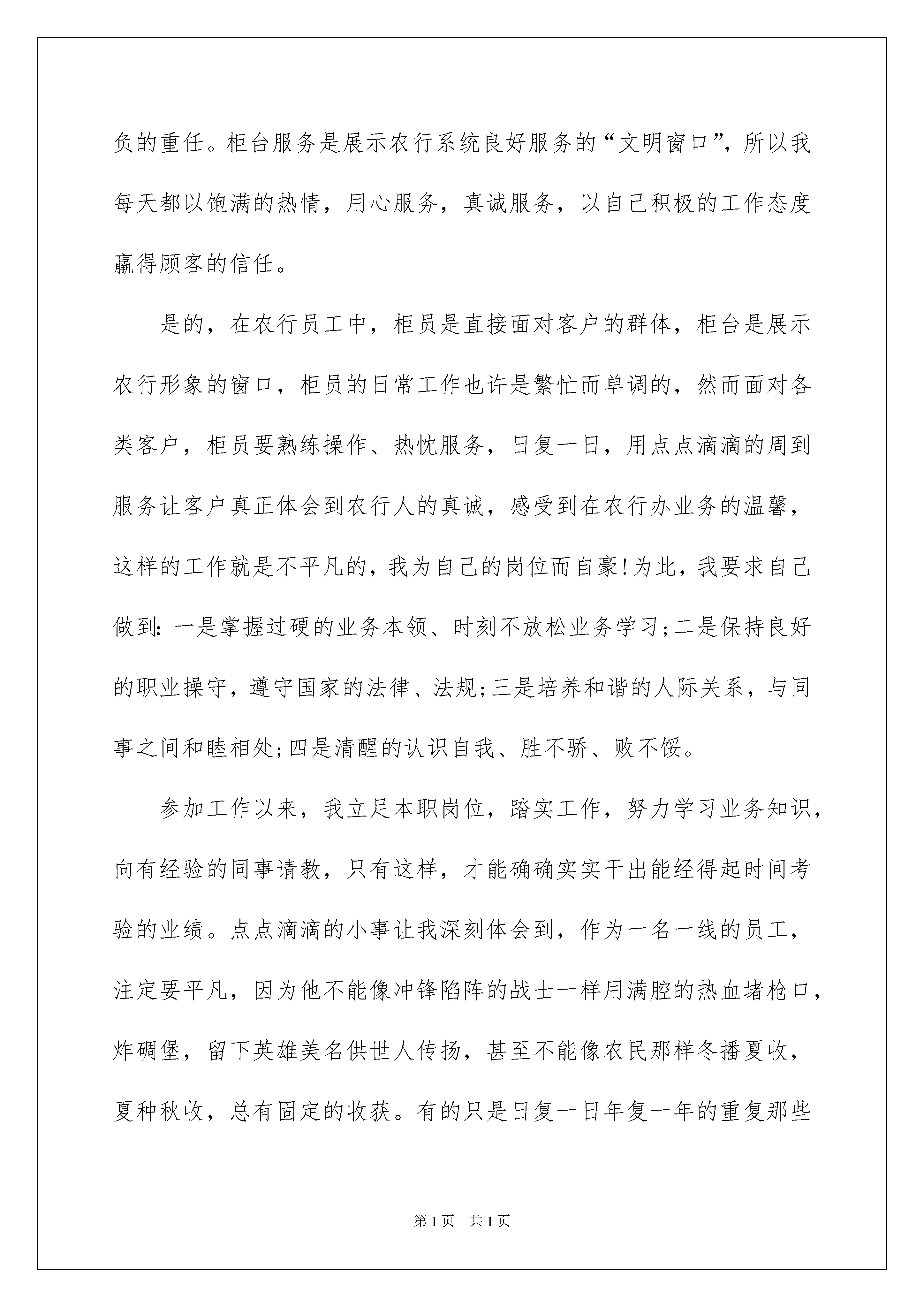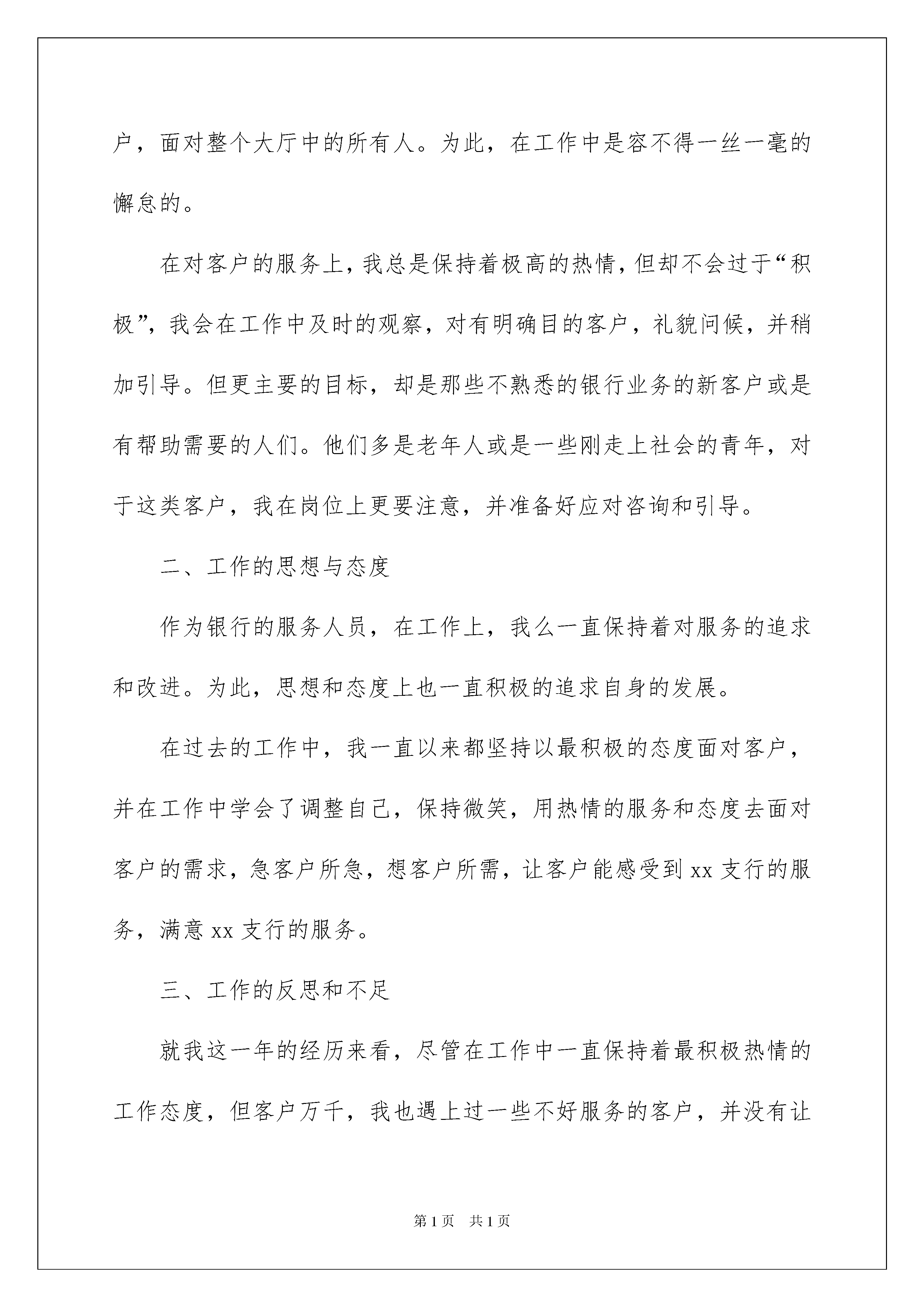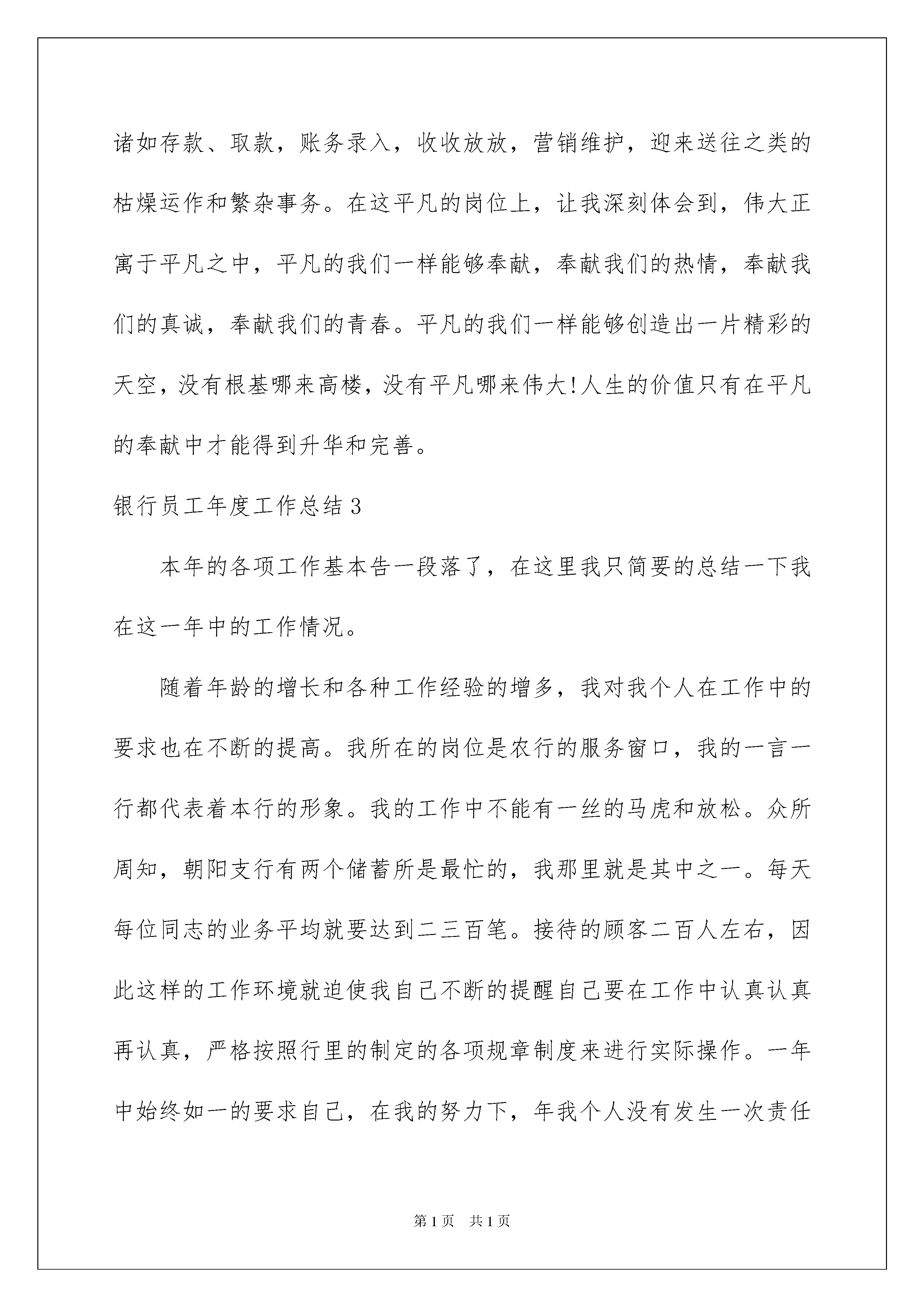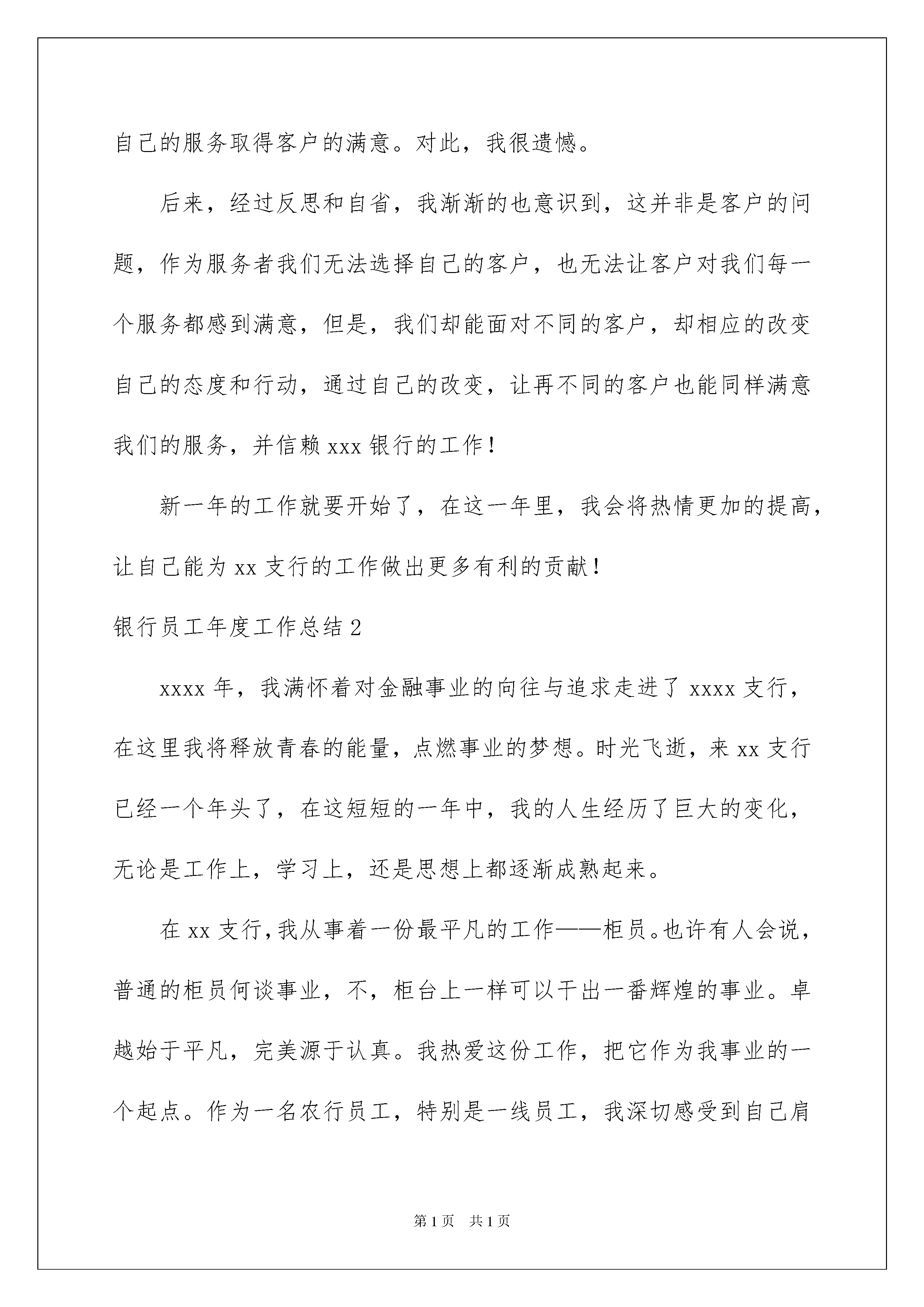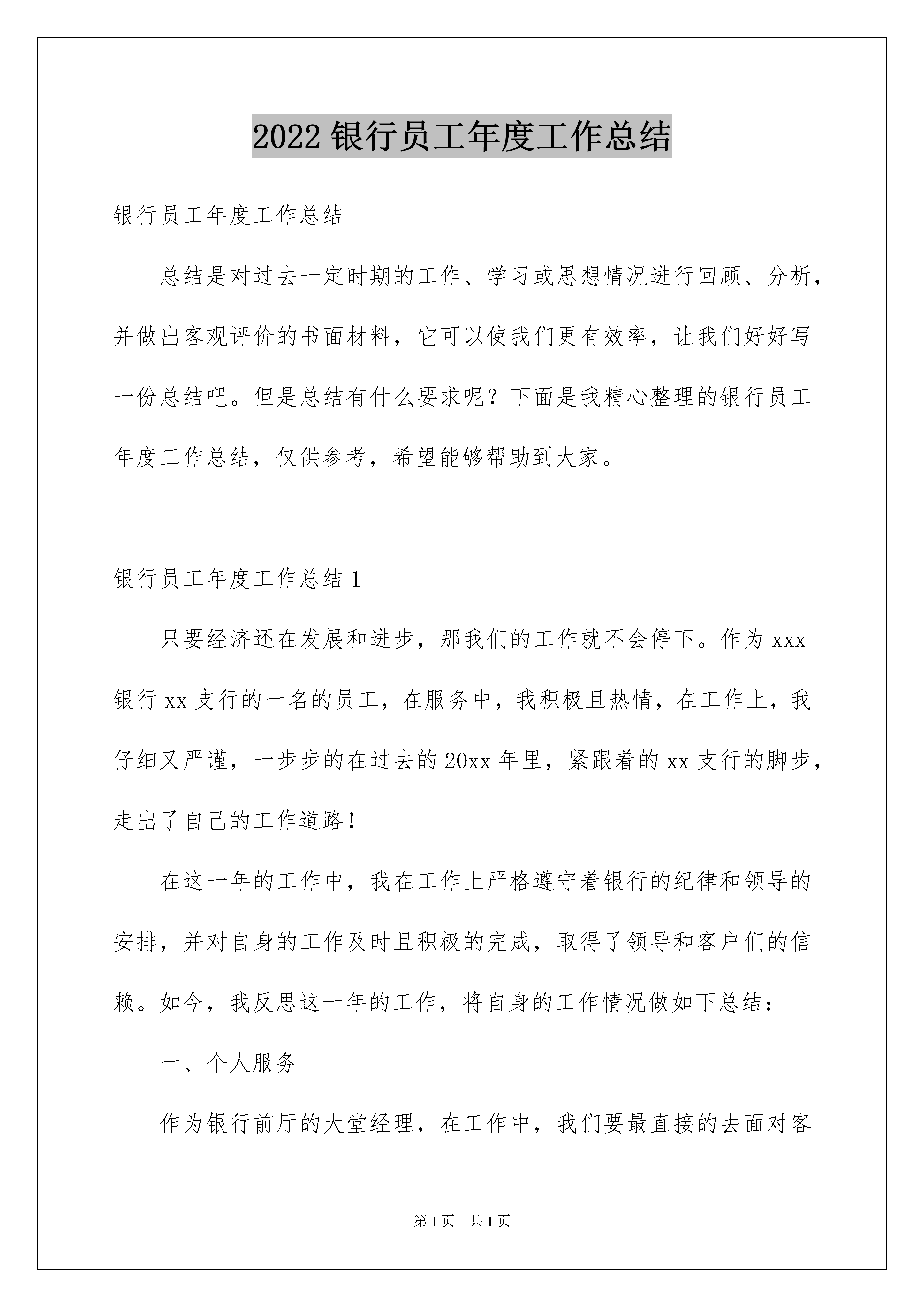 2022银行员工年度工作总结银行员工年度工作总结总结是对过去一定时期的工作、学习或思想情况进行回顾、分析,并做出客观评价的书面材料,它可以使我们更有效率,让我们好好写一份总结吧。但是总结有什么要求呢?下面是我精心整理的银行员工年度工作总结,仅供参考,希望能够帮助到大家。银行员工年度工作总结1只要经济还在发展和进步,那我们的工作就不会停下。作为xxx银行xx支行的一名的员工,在服务中,我积极且热情,在工作上,我仔细又严谨,一步步的在过去的20xx年里,紧跟着的xx支行的脚步,走出了自己的工作道路!在这一年的工作中,我在工作上严格遵守着银行的纪律和领导的安排,并对自身的工作及时且积极的完成,取得了领导和客户们的信赖。如今,我反思这一年的工作,将自身的工作情况做如下总结:一、个人服务作为银行前厅的大堂经理,在工作中,我们要最直接的去面对客户,面对整个大厅中的所有人。为此,在工作中是容不得一丝一毫的懈怠的。在对客户的服务上,我总是保持着极高的热情,但却不会过于“积极”,我会在工作中及时的观察,对有明确目的客户,礼貌问候,并稍加引导。但更主要的目标,却是那些不熟悉的银行业务的新客户或是有帮助需要的人们。他们多是老年人或是一些刚走上社会的青年,对于这类客户,我在岗位上更要注意,并准备好应对咨询和引导。二、工作的思想与态度作为银行的服务人员,在工作上,我么一直保持着对服务的追求和改进。为此,思想和态度上也一直积极的追求自身的发展。在过去的工作中,我一直以来都坚持以最积极的态度面对客户,并在工作中学会了调整自己,保持微笑,用热情的服务和态度去面对客户的需求,急客户所急,想客户所需,让客户能感受到xx支行的服务,满意xx支行的服务。三、工作的反思和不足就我这一年的经历来看,尽管在工作中一直保持着最积极热情的工作态度,但客户万千,我也遇上过一些不好服务的客户,并没有让自己的服务取得客户的满意。对此,我很遗憾。后来,经过反思和自省,我渐渐的也意识到,这并非是客户的问题,作为服务者我们无法选择自己的客户,也无法让客户对我们每一个服务都感到满意,但是,我们却能面对不同的客户,却相应的改变自己的态度和行动,通过自己的改变,让再不同的客户也能同样满意我们的服务,并信赖xxx银行的工作!新一年的工作就要开始了,在这一年里,我会将热情更加的提高,让自己能为xx支行的工作做出更多有利的贡献!银行员工年度工作总结2xxxx年,我满怀着对金融事业的向往与追求走进了xxxx支行,在这里我将释放青春的能量,点燃事业的梦想。时光飞逝,来xx支行已经一个年头了,在这短短的一年中,我的人生经历了巨大的变化,无论是工作上,学习上,还是思想上都逐渐成熟起来。在xx支行,我从事着一份最平凡的工作——柜员。也许有人会说,普通的柜员何谈事业,不,柜台上一样可以干出一番辉煌的事业。卓越始于平凡,完美源于认真。我热爱这份工作,把它作为我事业的一个起点。作为一名农行员工,特别是一线员工,我深切感受到自己肩负的重任。柜台服务是展示农行系统良好服务的“文明窗口”,所以我每天都以饱满的热情,用心服务,真诚服务,以自己积极的工作态度羸得顾客的信任。是的,在农行员工中,柜员是直接面对客户的群体,柜台是展示农行形象的窗口,柜员的日常工作也许是繁忙而单调的,然而面对各类客户,柜员要熟练操作、热忱服务,日复一日,用点点滴滴的周到服务让客户真正体会到农行人的真诚,感受到在农行办业务的温馨,这样的工作就是不平凡的,我为自己的岗位而自豪!为此,我要求自己做到:一是掌握过硬的业务本领、时刻不放松业务学习;二是保持良好的职业操守,遵守国家的法律、法规;三是培养和谐的人际关系,与同事之间和睦相处;四是清醒的认识自我、胜不骄、败不馁。参加工作以来,我立足本职岗位,踏实工作,努力学习业务知识,向有经验的同事请教,只有这样,才能确确实实干出能经得起时间考验的业绩。点点滴滴的小事让我深刻体会到,作为一名一线的员工,注定要平凡,因为他不能像冲锋陷阵的战士一样用满腔的热血堵枪口,炸碉堡,留下英雄美名供世人传扬,甚至不能像农民那样冬播夏收,夏种秋收,总有固定的收获。有的只是日复一日年复一年的重复那些诸如存款、取款,账务录入,收收放放,营销维护,迎来送往之类的枯燥运作和繁杂事务。在这平凡的岗位上,让我深刻体会到,伟大正寓于平凡之中,平凡的我们一样能够奉献,奉献我们的热情,奉献我们的真诚,奉献我们的青春。平凡的我们一样能够创造出一片精彩的天空,没有根基哪来高楼,没有平凡哪来伟大!人生的价值只有在平凡的奉献中才能得到升华和完善。银行员工年度工作总结3本年的各项工作基本告一段落了,在这