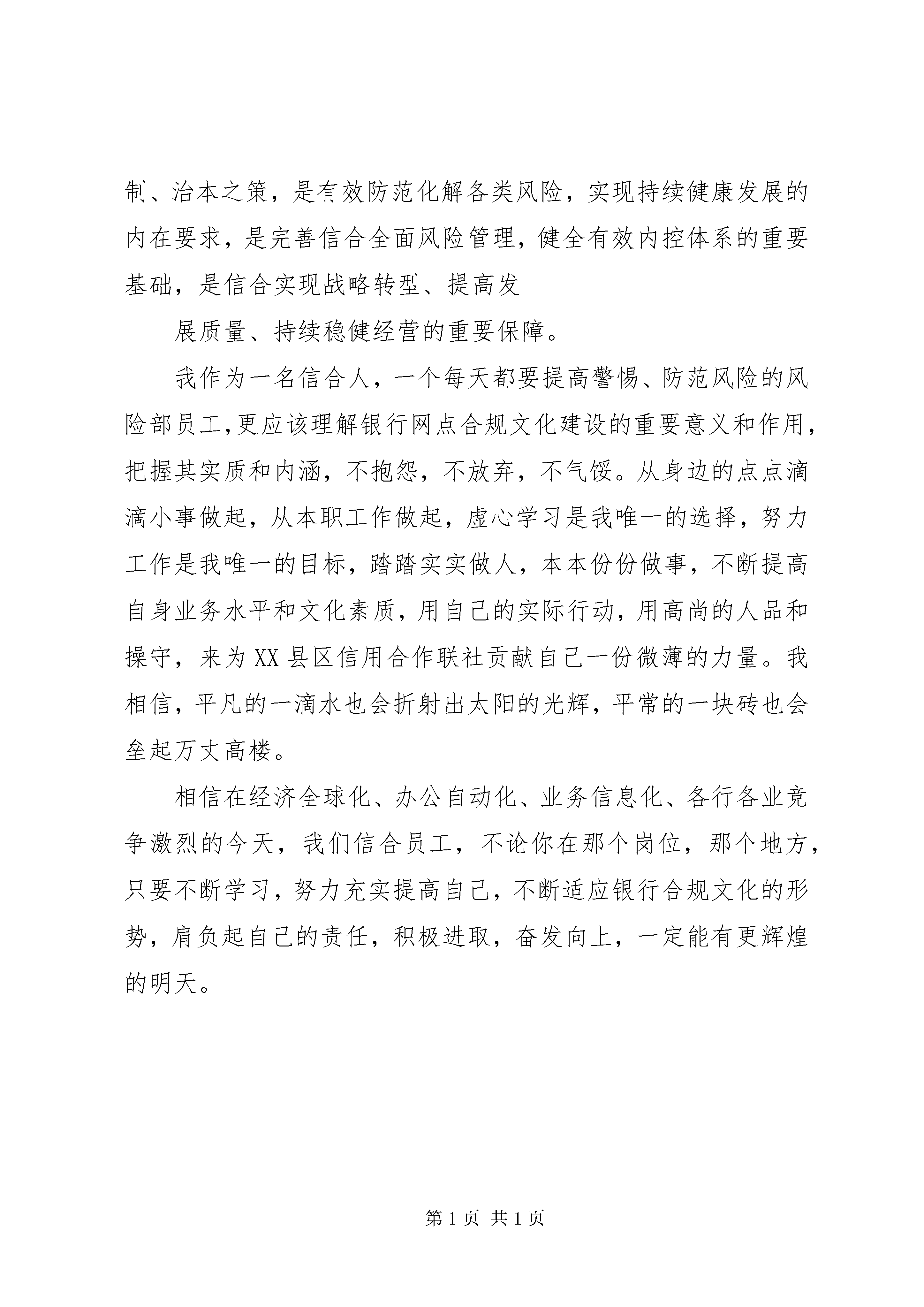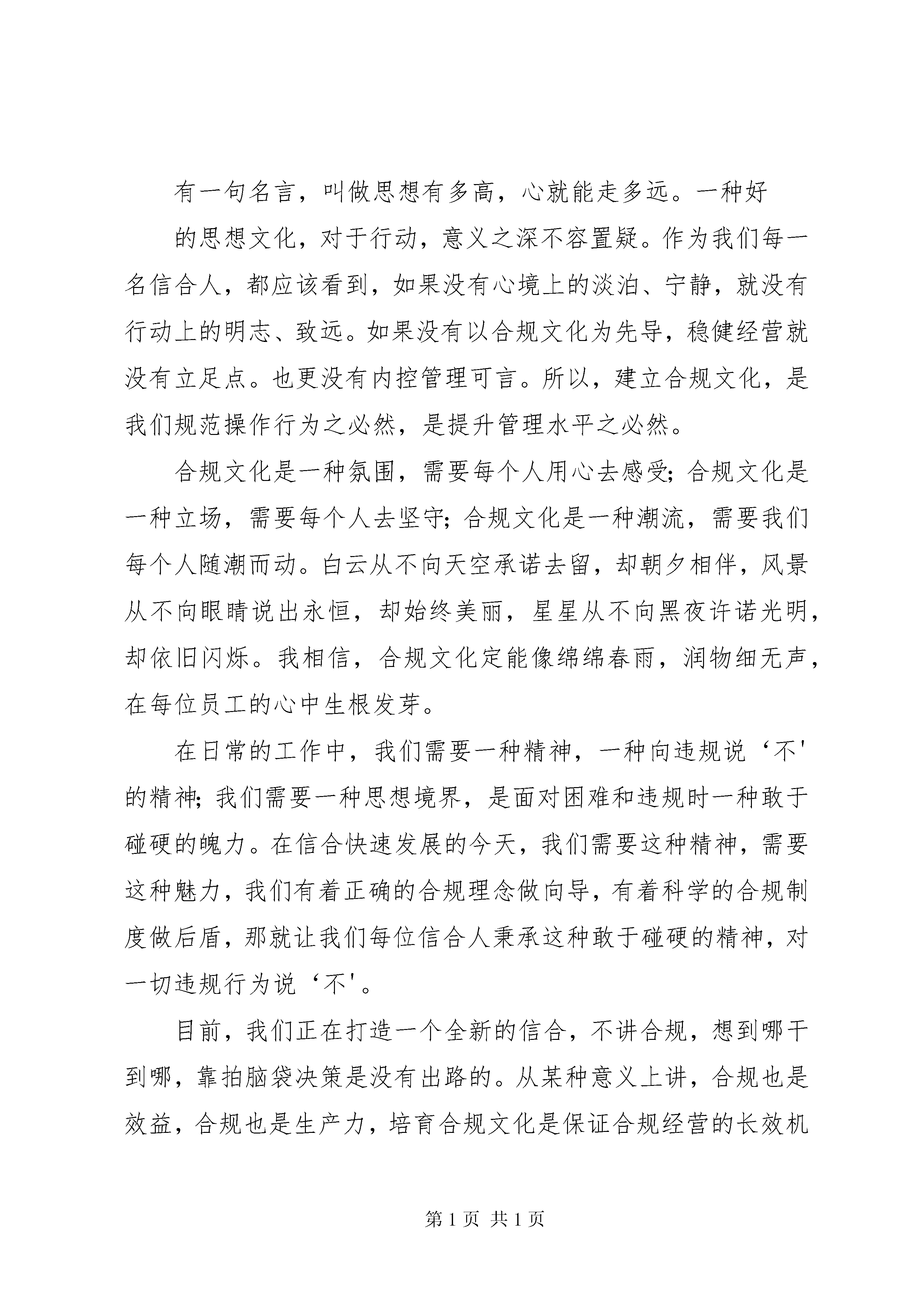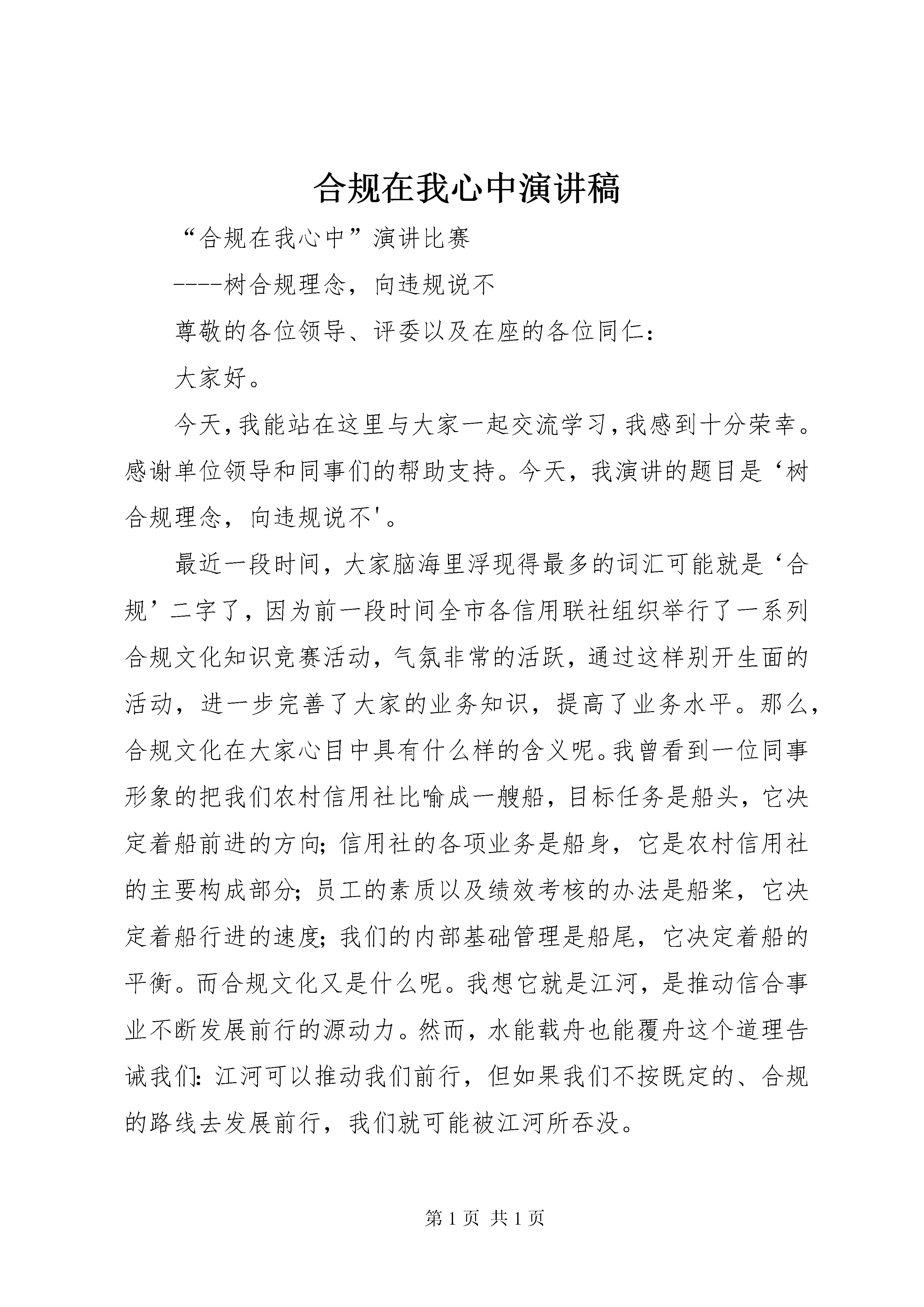 合规在我心中演讲稿“合规在我心中”演讲比赛----树合规理念,向违规说不尊敬的各位领导、评委以及在座的各位同仁:大家好。今天,我能站在这里与大家一起交流学习,我感到十分荣幸。感谢单位领导和同事们的帮助支持。今天,我演讲的题目是‘树合规理念,向违规说不'。最近一段时间,大家脑海里浮现得最多的词汇可能就是‘合规’二字了,因为前一段时间全市各信用联社组织举行了一系列合规文化知识竞赛活动,气氛非常的活跃,通过这样别开生面的活动,进一步完善了大家的业务知识,提高了业务水平。那么,合规文化在大家心目中具有什么样的含义呢。我曾看到一位同事形象的把我们农村信用社比喻成一艘船,目标任务是船头,它决定着船前进的方向;信用社的各项业务是船身,它是农村信用社的主要构成部分;员工的素质以及绩效考核的办法是船桨,它决定着船行进的速度;我们的内部基础管理是船尾,它决定着船的平衡。而合规文化又是什么呢。我想它就是江河,是推动信合事业不断发展前行的源动力。然而,水能载舟也能覆舟这个道理告诫我们:江河可以推动我们前行,但如果我们不按既定的、合规的路线去发展前行,我们就可能被江河所吞没。有一句名言,叫做思想有多高,心就能走多远。一种好的思想文化,对于行动,意义之深不容置疑。作为我们每一名信合人,都应该看到,如果没有心境上的淡泊、宁静,就没有行动上的明志、致远。如果没有以合规文化为先导,稳健经营就没有立足点。也更没有内控管理可言。所以,建立合规文化,是我们规范操作行为之必然,是提升管理水平之必然。合规文化是一种氛围,需要每个人用心去感受;合规文化是一种立场,需要每个人去坚守;合规文化是一种潮流,需要我们每个人随潮而动。白云从不向天空承诺去留,却朝夕相伴,风景从不向眼睛说出永恒,却始终美丽,星星从不向黑夜许诺光明,却依旧闪烁。我相信,合规文化定能像绵绵春雨,润物细无声,在每位员工的心中生根发芽。在日常的工作中,我们需要一种精神,一种向违规说‘不'的精神;我们需要一种思想境界,是面对困难和违规时一种敢于碰硬的魄力。在信合快速发展的今天,我们需要这种精神,需要这种魅力,我们有着正确的合规理念做向导,有着科学的合规制度做后盾,那就让我们每位信合人秉承这种敢于碰硬的精神,对一切违规行为说‘不'。目前,我们正在打造一个全新的信合,不讲合规,想到哪干到哪,靠拍脑袋决策是没有出路的。从某种意义上讲,合规也是效益,合规也是生产力,培育合规文化是保证合规经营的长效机制、治本之策,是有效防范化解各类风险,实现持续健康发展的内在要求,是完善信合全面风险管理,健全有效内控体系的重要基础,是信合实现战略转型、提高发展质量、持续稳健经营的重要保障。我作为一名信合人,一个每天都要提高警惕、防范风险的风险部员工,更应该理解银行网点合规文化建设的重要意义和作用,把握其实质和内涵,不抱怨,不放弃,不气馁。从身边的点点滴滴小事做起,从本职工作做起,虚心学习是我唯一的选择,努力工作是我唯一的目标,踏踏实实做人,本本份份做事,不断提高自身业务水平和文化素质,用自己的实际行动,用高尚的人品和操守,来为XX县区信用合作联社贡献自己一份微薄的力量。我相信,平凡的一滴水也会折射出太阳的光辉,平常的一块砖也会垒起万丈高楼。相信在经济全球化、办公自动化、业务信息化、各行各业竞争激烈的今天,我们信合员工,不论你在那个岗位,那个地方,只要不断学习,努力充实提高自己,不断适应银行合规文化的形势,肩负起自己的责任,积极进取,奋发向上,一定能有更辉煌的明天。