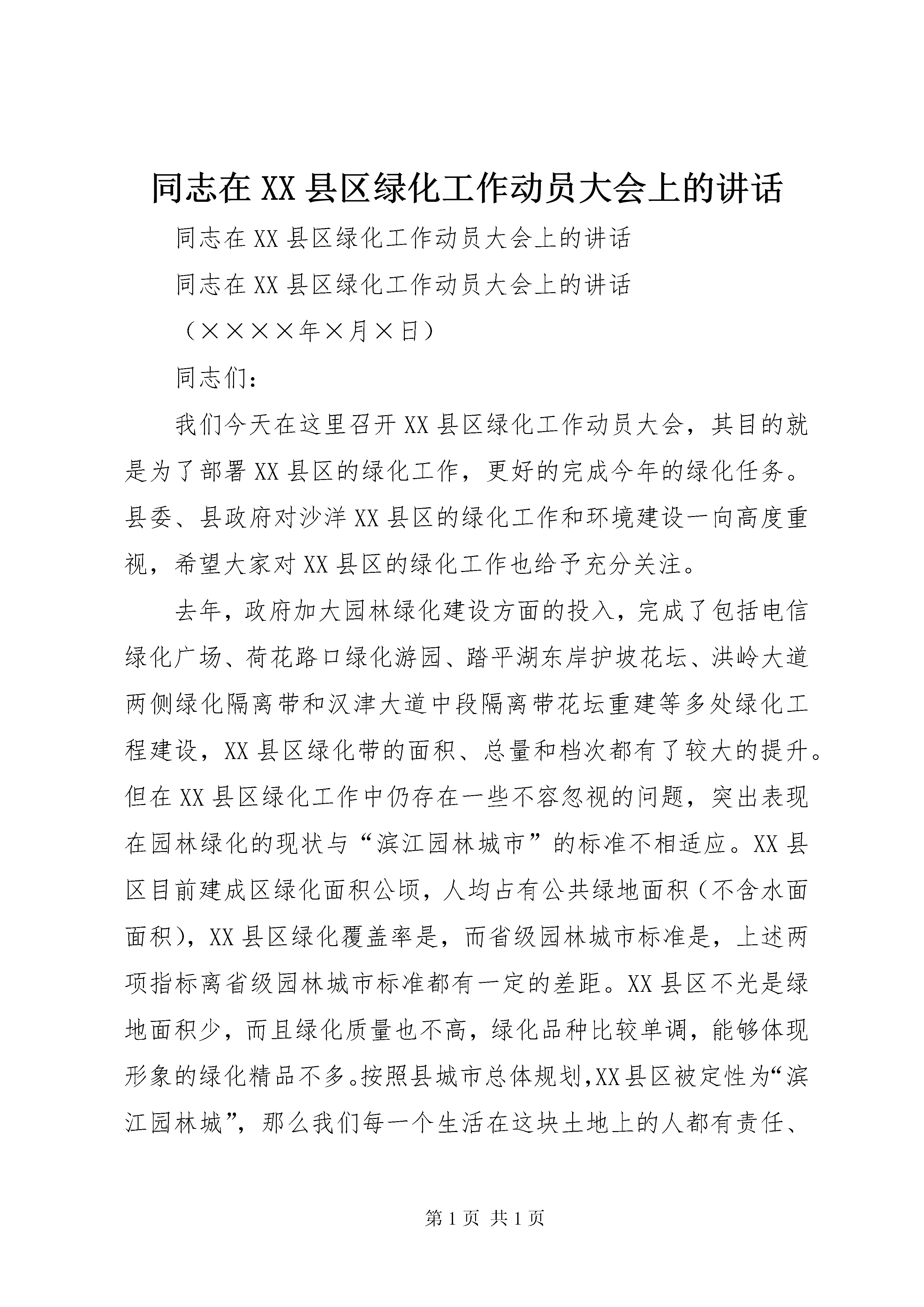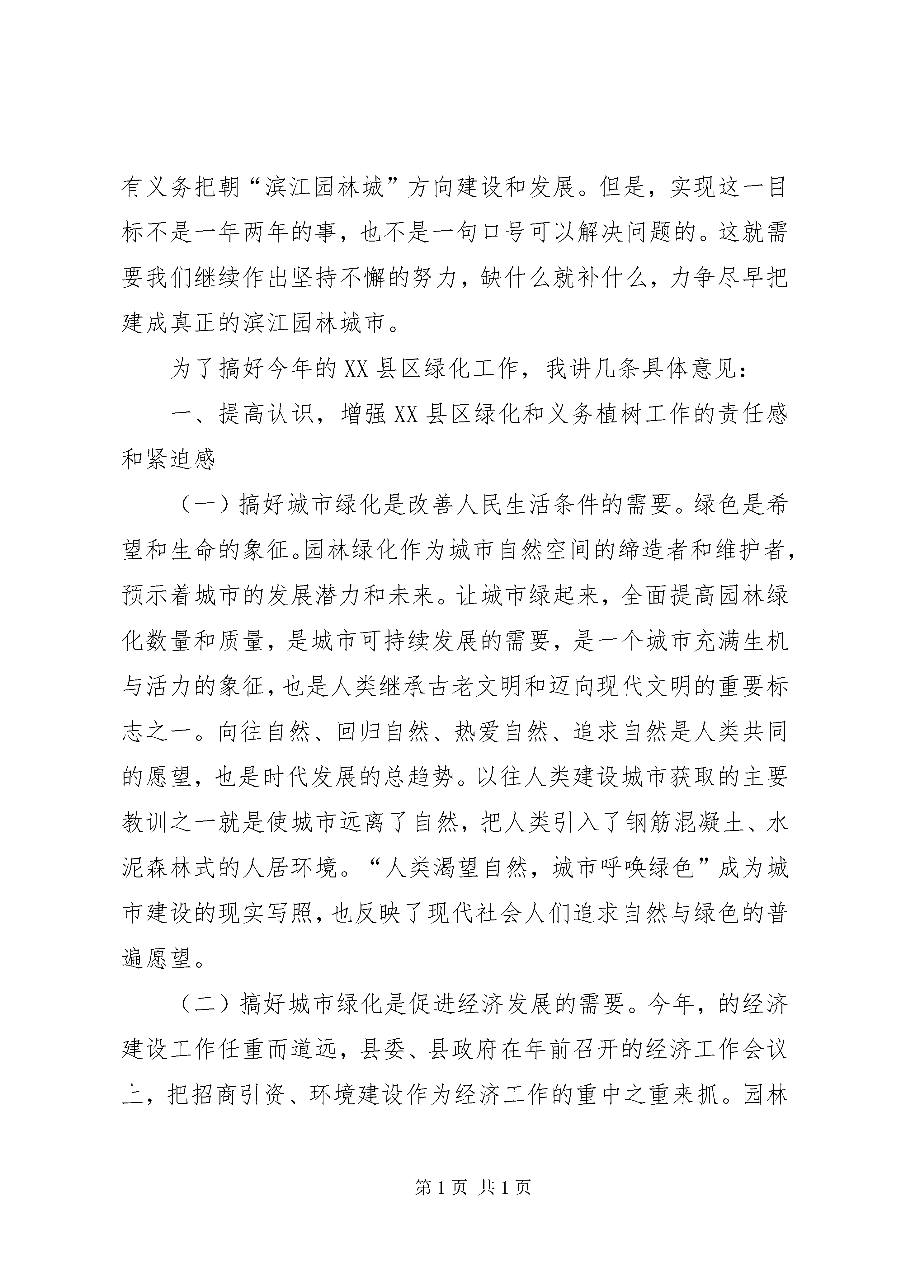 同志在XX县区绿化工作动员大会上的讲话同志在XX县区绿化工作动员大会上的讲话同志在XX县区绿化工作动员大会上的讲话(××××年×月×日)同志们:我们今天在这里召开XX县区绿化工作动员大会,其目的就是为了部署XX县区的绿化工作,更好的完成今年的绿化任务。县委、县政府对沙洋XX县区的绿化工作和环境建设一向高度重视,希望大家对XX县区的绿化工作也给予充分关注。去年,政府加大园林绿化建设方面的投入,完成了包括电信绿化广场、荷花路口绿化游园、踏平湖东岸护坡花坛、洪岭大道两侧绿化隔离带和汉津大道中段隔离带花坛重建等多处绿化工程建设,XX县区绿化带的面积、总量和档次都有了较大的提升。但在XX县区绿化工作中仍存在一些不容忽视的问题,突出表现在园林绿化的现状与“滨江园林城市”的标准不相适应。XX县区目前建成区绿化面积公顷,人均占有公共绿地面积(不含水面面积),XX县区绿化覆盖率是,而省级园林城市标准是,上述两项指标离省级园林城市标准都有一定的差距。XX县区不光是绿地面积少,而且绿化质量也不高,绿化品种比较单调,能够体现形象的绿化精品不多。按照县城市总体规划,XX县区被定性为“滨江园林城”,那么我们每一个生活在这块土地上的人都有责任、有义务把朝“滨江园林城”方向建设和发展。但是,实现这一目标不是一年两年的事,也不是一句口号可以解决问题的。这就需要我们继续作出坚持不懈的努力,缺什么就补什么,力争尽早把建成真正的滨江园林城市。为了搞好今年的XX县区绿化工作,我讲几条具体意见:一、提高认识,增强XX县区绿化和义务植树工作的责任感和紧迫感(一)搞好城市绿化是改善人民生活条件的需要。绿色是希望和生命的象征。园林绿化作为城市自然空间的缔造者和维护者,预示着城市的发展潜力和未来。让城市绿起来,全面提高园林绿化数量和质量,是城市可持续发展的需要,是一个城市充满生机与活力的象征,也是人类继承古老文明和迈向现代文明的重要标志之一。向往自然、回归自然、热爱自然、追求自然是人类共同的愿望,也是时代发展的总趋势。以往人类建设城市获取的主要教训之一就是使城市远离了自然,把人类引入了钢筋混凝土、水泥森林式的人居环境。“人类渴望自然,城市呼唤绿色”成为城市建设的现实写照,也反映了现代社会人们追求自然与绿色的普遍愿望。(二)搞好城市绿化是促进经济发展的需要。今年,的经济建设工作任重而道远,县委、县政府在年前召开的经济工作会议上,把招商引资、环境建设作为经济工作的重中之重来抓。园林绿化建设作为环境建设的一项硬指标,其重要性不言而喻。作为国民经济的重要组成部分,园林绿化工作不仅直接体现形象和文明程度,还对经济发展具有举足轻重的影响。试想,一个地方环境凌乱,灰尘满天,谁还来投资。随着社会的发展、历史的前进,作为社会主义国家的园林绿化事业,应最大限度地满足广大人民群众日益增长的物质文化生活的需要。作为园林绿化这一经济建设不可分割的一部分工作,县委、县政府十分重视。最近,几次召开会议讨论研究并将园林绿化工作列为当前主抓的几件大事之一。XX县区的园林绿化工作一定要上档升级,这样才能体现滨江园林的风貌。因此,县建设局、县园林部门要搞好XX县区园林规划,合理布局,多搞适合特色的园林精品,当好园林绿化的主力军。要从改善人民生活环境、促进全县经济稳定增长的高度来认识搞好园林绿化工作的重要性和紧迫性,进一步增强责任感和使命感,变压力为动力,变责任为自我加压,切实把这项工作抓紧、抓好,抓出新的气象。(三)义务植树是法律要求我们每个公民的应尽义务。五届全国人大四次会议做出的《关于开展全民义务植树活动的决议》明确要求:“凡是条件具备的地方,年满岁的中华人民共和国公民,除老弱病残者外,因地制宜,每人每年义务植树至棵”。县直各部门、各单位也要站在讲政治、讲大局,从发展经济、改善人民生活环境的高度来认识搞好园林绿化工作的重要性,不能事不关已,高高挂起,要增强责任感和紧迫感,切实配合园林部门把分配的绿化工作完成好。同时我们也希望驻沙单位的同志对XX县区绿化工作给予大力支持。我们必须统一思想、提高认识,进一步加大园林绿化工作的力度,多渠道增加绿化投入,唤醒市民爱绿惜绿、热爱自然、绿化城市的绿化意识,增强历史责任感和事业心,不断改善我们的生存环境和生活质量。在提高认识的同时,要克服三种思想。一是要克服义务植树与己无关的思想,牢固树立政府的事就是大家的事、“义务植树、人人有责”的思想。二是要克服义务植树就是集资植树的思想。植树是我们应尽的义务,各单位、每个公民要把义务植树作为我们自觉自愿的行动;要站在保持共产党员先进性的高度来看待这项工作。三是要克服资金紧张的畏难思想。我们已经充分考虑到大家的实际困难,所以我们只按照人平植棵树、棵树元(同志在XX县区绿化工作动员大会上的讲话人平元)的标准分