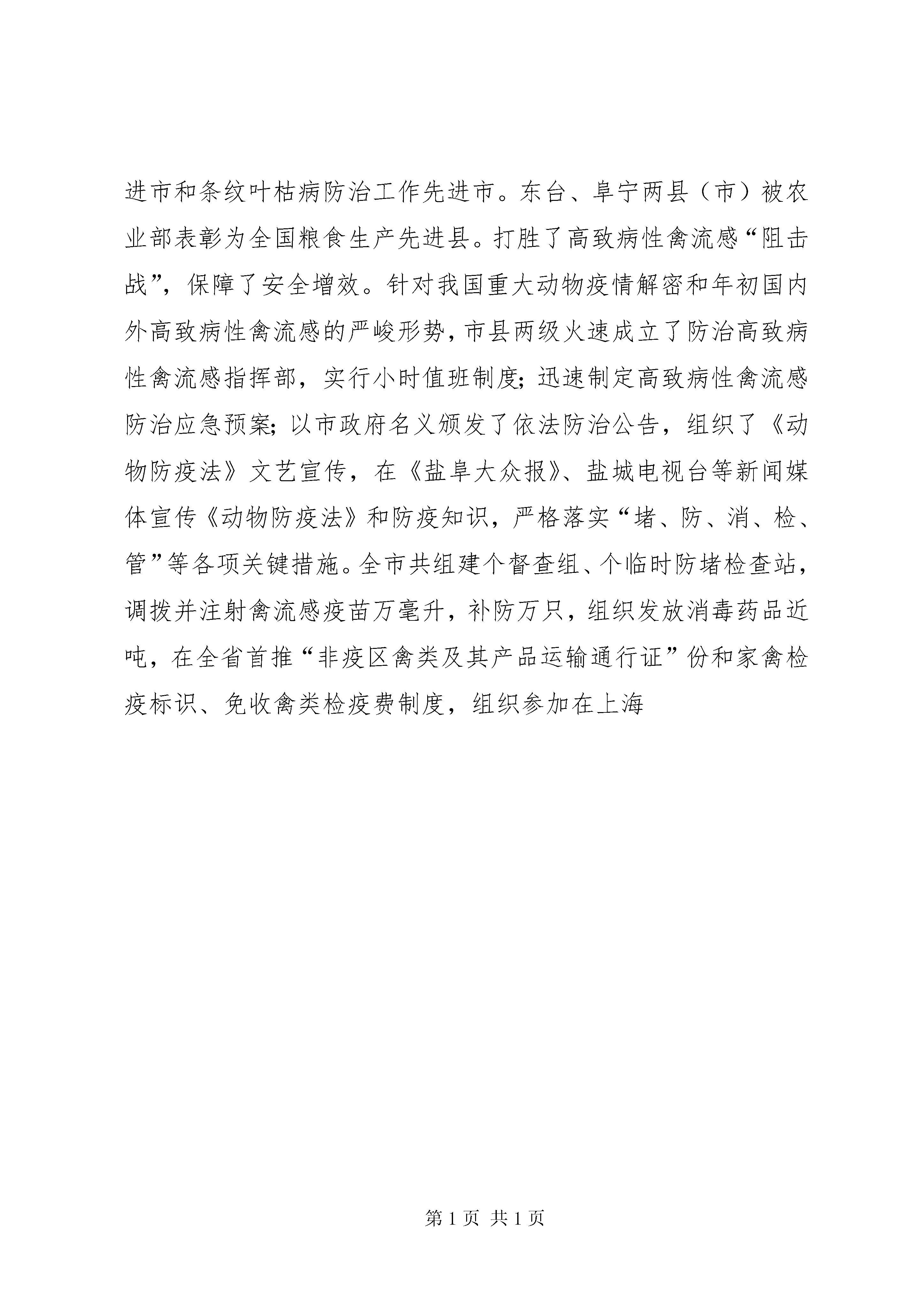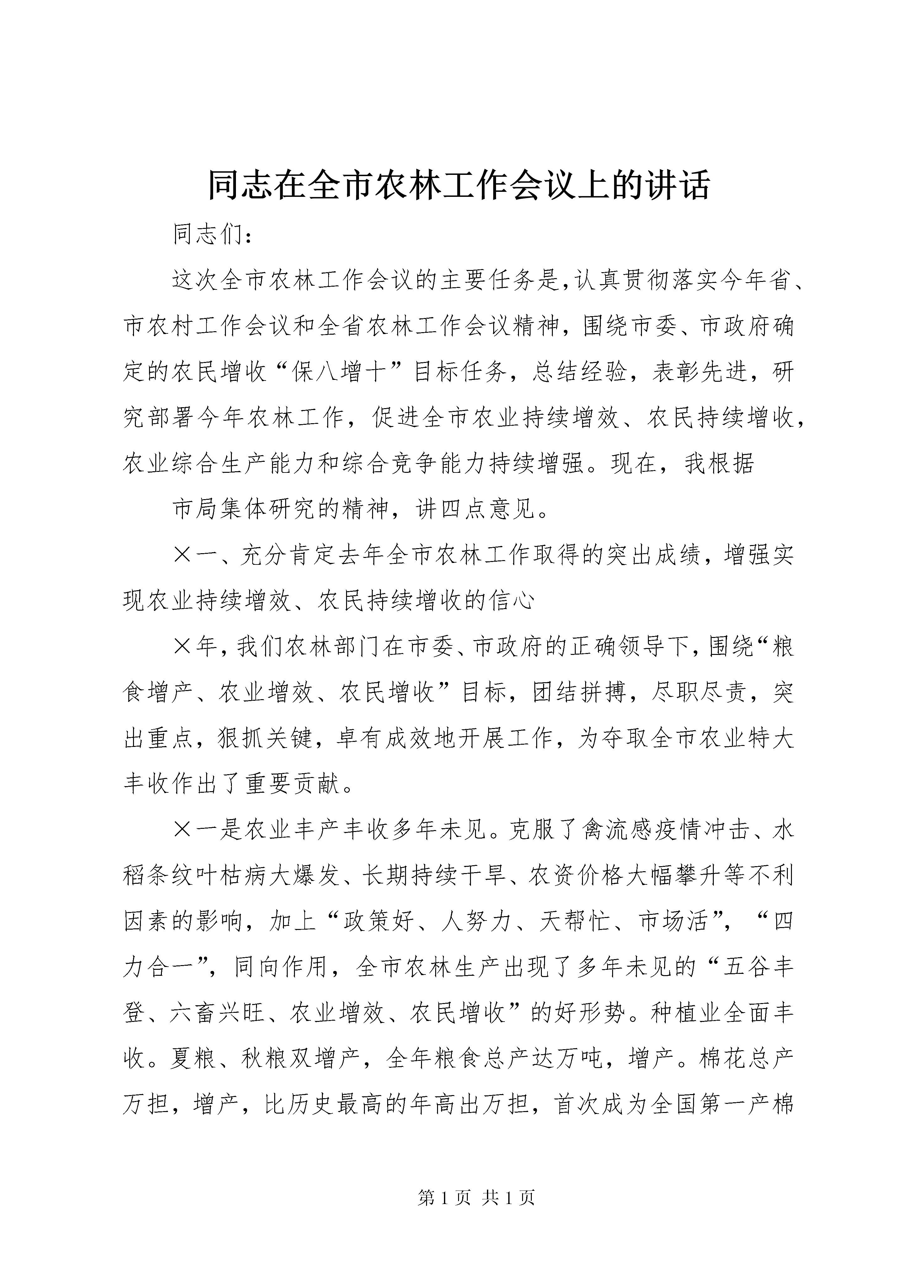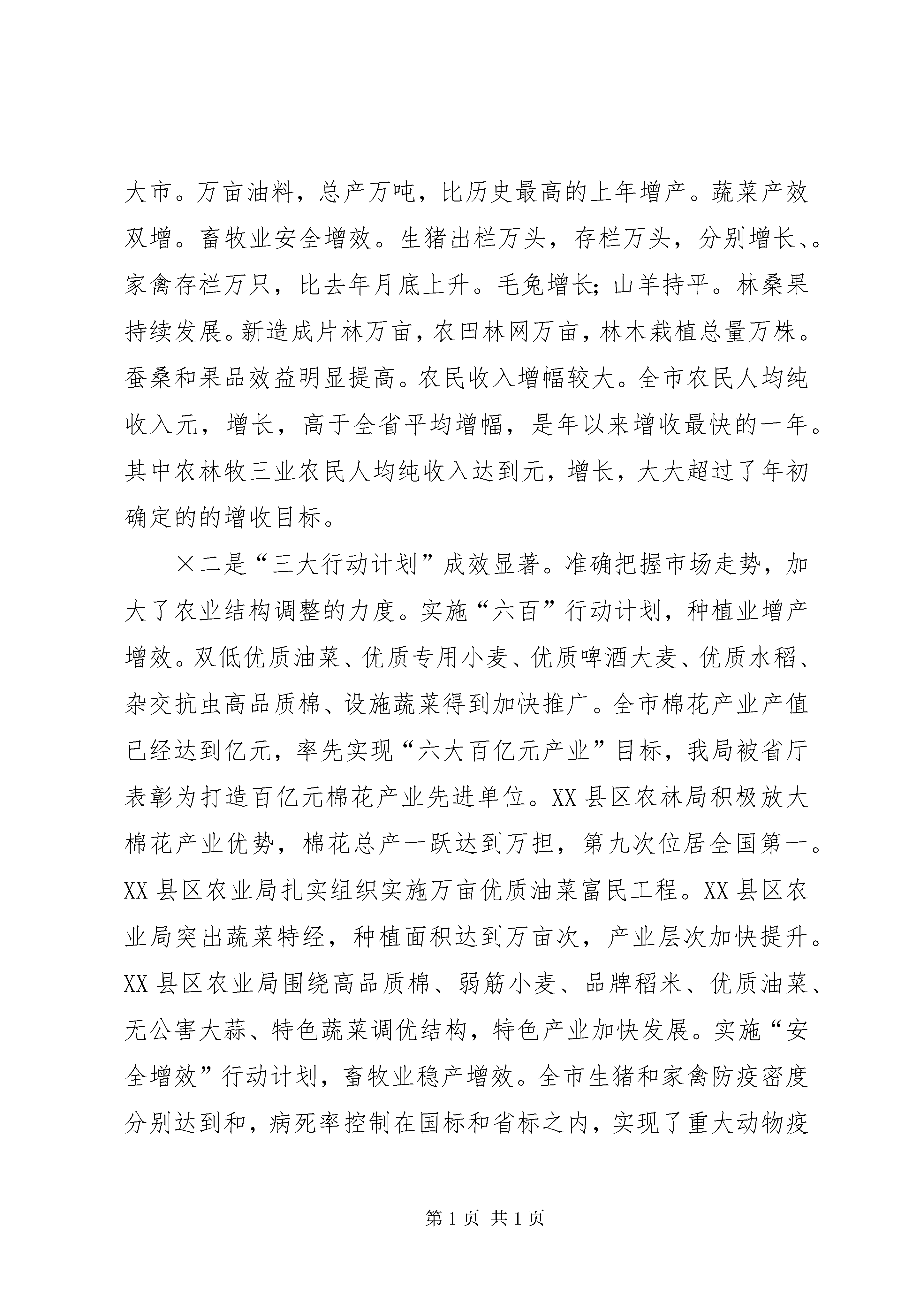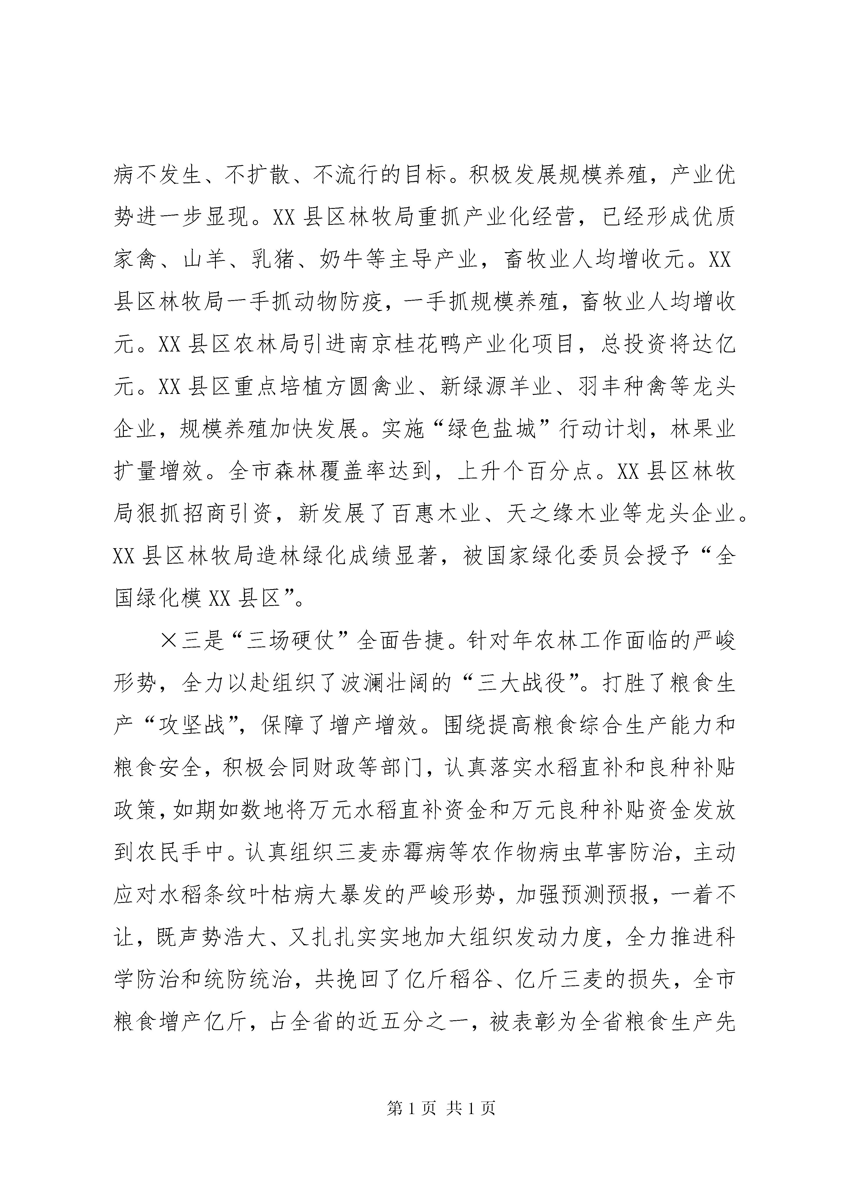 同志在全市农林工作会议上的讲话同志们:这次全市农林工作会议的主要任务是,认真贯彻落实今年省、市农村工作会议和全省农林工作会议精神,围绕市委、市政府确定的农民增收“保八增十”目标任务,总结经验,表彰先进,研究部署今年农林工作,促进全市农业持续增效、农民持续增收,农业综合生产能力和综合竞争能力持续增强。现在,我根据市局集体研究的精神,讲四点意见。×一、充分肯定去年全市农林工作取得的突出成绩,增强实现农业持续增效、农民持续增收的信心×年,我们农林部门在市委、市政府的正确领导下,围绕“粮食增产、农业增效、农民增收”目标,团结拼搏,尽职尽责,突出重点,狠抓关键,卓有成效地开展工作,为夺取全市农业特大丰收作出了重要贡献。×一是农业丰产丰收多年未见。克服了禽流感疫情冲击、水稻条纹叶枯病大爆发、长期持续干旱、农资价格大幅攀升等不利因素的影响,加上“政策好、人努力、天帮忙、市场活”,“四力合一”,同向作用,全市农林生产出现了多年未见的“五谷丰登、六畜兴旺、农业增效、农民增收”的好形势。种植业全面丰收。夏粮、秋粮双增产,全年粮食总产达万吨,增产。棉花总产万担,增产,比历史最高的年高出万担,首次成为全国第一产棉大市。万亩油料,总产万吨,比历史最高的上年增产。蔬菜产效双增。畜牧业安全增效。生猪出栏万头,存栏万头,分别增长、。家禽存栏万只,比去年月底上升。毛兔增长;山羊持平。林桑果持续发展。新造成片林万亩,农田林网万亩,林木栽植总量万株。蚕桑和果品效益明显提高。农民收入增幅较大。全市农民人均纯收入元,增长,高于全省平均增幅,是年以来增收最快的一年。其中农林牧三业农民人均纯收入达到元,增长,大大超过了年初确定的的增收目标。×二是“三大行动计划”成效显著。准确把握市场走势,加大了农业结构调整的力度。实施“六百”行动计划,种植业增产增效。双低优质油菜、优质专用小麦、优质啤酒大麦、优质水稻、杂交抗虫高品质棉、设施蔬菜得到加快推广。全市棉花产业产值已经达到亿元,率先实现“六大百亿元产业”目标,我局被省厅表彰为打造百亿元棉花产业先进单位。XX县区农林局积极放大棉花产业优势,棉花总产一跃达到万担,第九次位居全国第一。XX县区农业局扎实组织实施万亩优质油菜富民工程。XX县区农业局突出蔬菜特经,种植面积达到万亩次,产业层次加快提升。XX县区农业局围绕高品质棉、弱筋小麦、品牌稻米、优质油菜、无公害大蒜、特色蔬菜调优结构,特色产业加快发展。实施“安全增效”行动计划,畜牧业稳产增效。全市生猪和家禽防疫密度分别达到和,病死率控制在国标和省标之内,实现了重大动物疫病不发生、不扩散、不流行的目标。积极发展规模养殖,产业优势进一步显现。XX县区林牧局重抓产业化经营,已经形成优质家禽、山羊、乳猪、奶牛等主导产业,畜牧业人均增收元。XX县区林牧局一手抓动物防疫,一手抓规模养殖,畜牧业人均增收元。XX县区农林局引进南京桂花鸭产业化项目,总投资将达亿元。XX县区重点培植方圆禽业、新绿源羊业、羽丰种禽等龙头企业,规模养殖加快发展。实施“绿色盐城”行动计划,林果业扩量增效。全市森林覆盖率达到,上升个百分点。XX县区林牧局狠抓招商引资,新发展了百惠木业、天之缘木业等龙头企业。XX县区林牧局造林绿化成绩显著,被国家绿化委员会授予“全国绿化模XX县区”。×三是“三场硬仗”全面告捷。针对年农林工作面临的严峻形势,全力以赴组织了波澜壮阔的“三大战役”。打胜了粮食生产“攻坚战”,保障了增产增效。围绕提高粮食综合生产能力和粮食安全,积极会同财政等部门,认真落实水稻直补和良种补贴政策,如期如数地将万元水稻直补资金和万元良种补贴资金发放到农民手中。认真组织三麦赤霉病等农作物病虫草害防治,主动应对水稻条纹叶枯病大暴发的严峻形势,加强预测预报,一着不让,既声势浩大、又扎扎实实地加大组织发动力度,全力推进科学防治和统防统治,共挽回了亿斤稻谷、亿斤三麦的损失,全市粮食增产亿斤,占全省的近五分之一,被表彰为全省粮食生产先进市和条纹叶枯病防治工作先进市。东台、阜宁两县(市)被农业部表彰为全国粮食生产先进县。打胜了高致病性禽流感“阻击战”,保障了安全增效。针对我国重大动物疫情解密和年初国内外高致病性禽流感的严峻形势,市县两级火速成立了防治高致病性禽流感指挥部,实行小时值班制度;迅速制定高致病性禽流感防治应急预案;以市政府名义颁发了依法防治公告,组织了《动物防疫法》文艺宣传,在《盐阜大众报》、盐城电视台等新闻媒体宣传《动物防疫法》和防疫知识,严格落实“堵、防、消、检、管”等各项关键措施。全市共组建个督查组、个临时防堵检查站,调拨并注射禽流感疫苗万毫升,补防万只,组织发放消毒药品近吨,在全省首推“非疫区禽类及其产品运输通行证”份和家禽检疫标识、免收禽类检疫费制度,组织参加在上海
