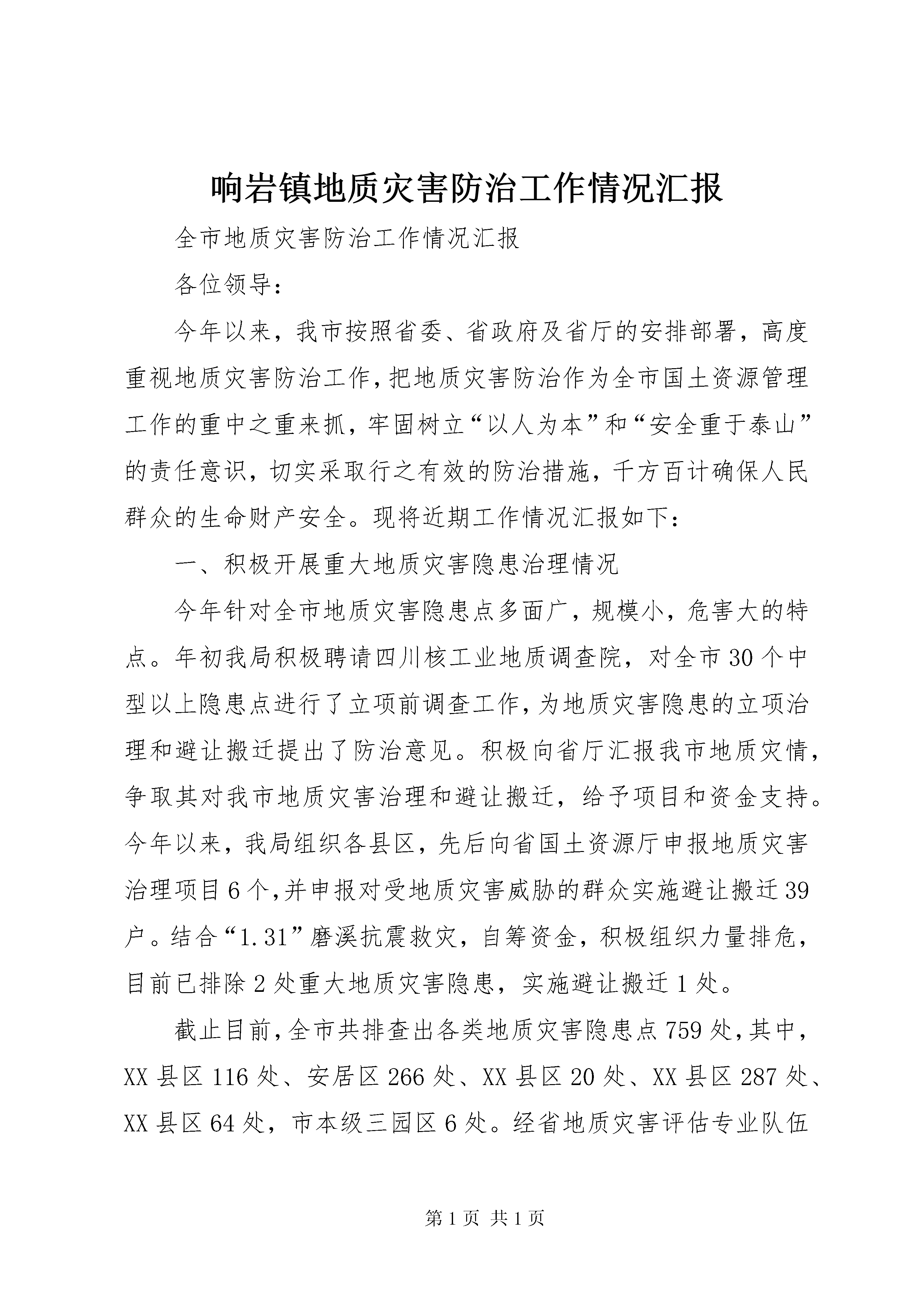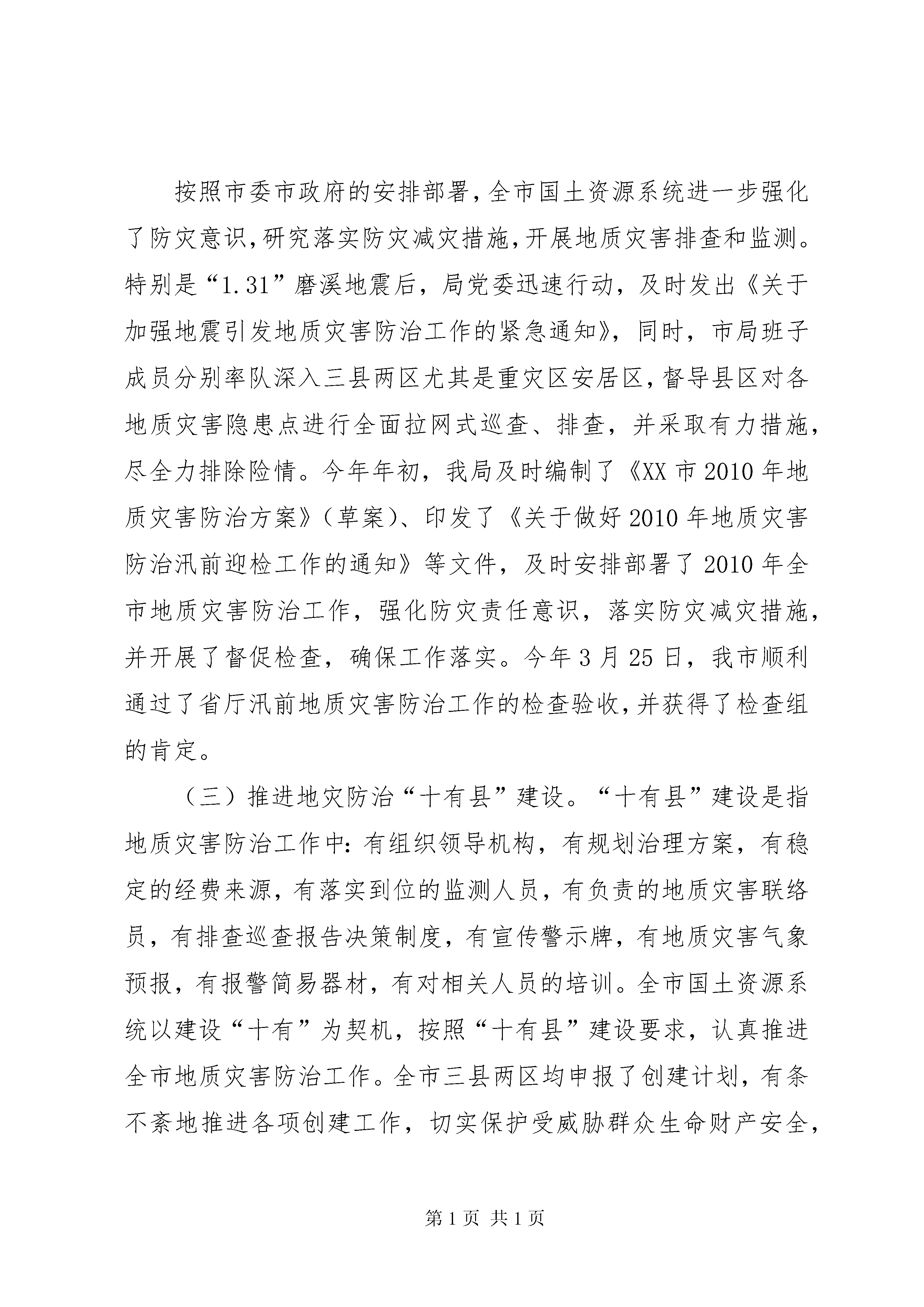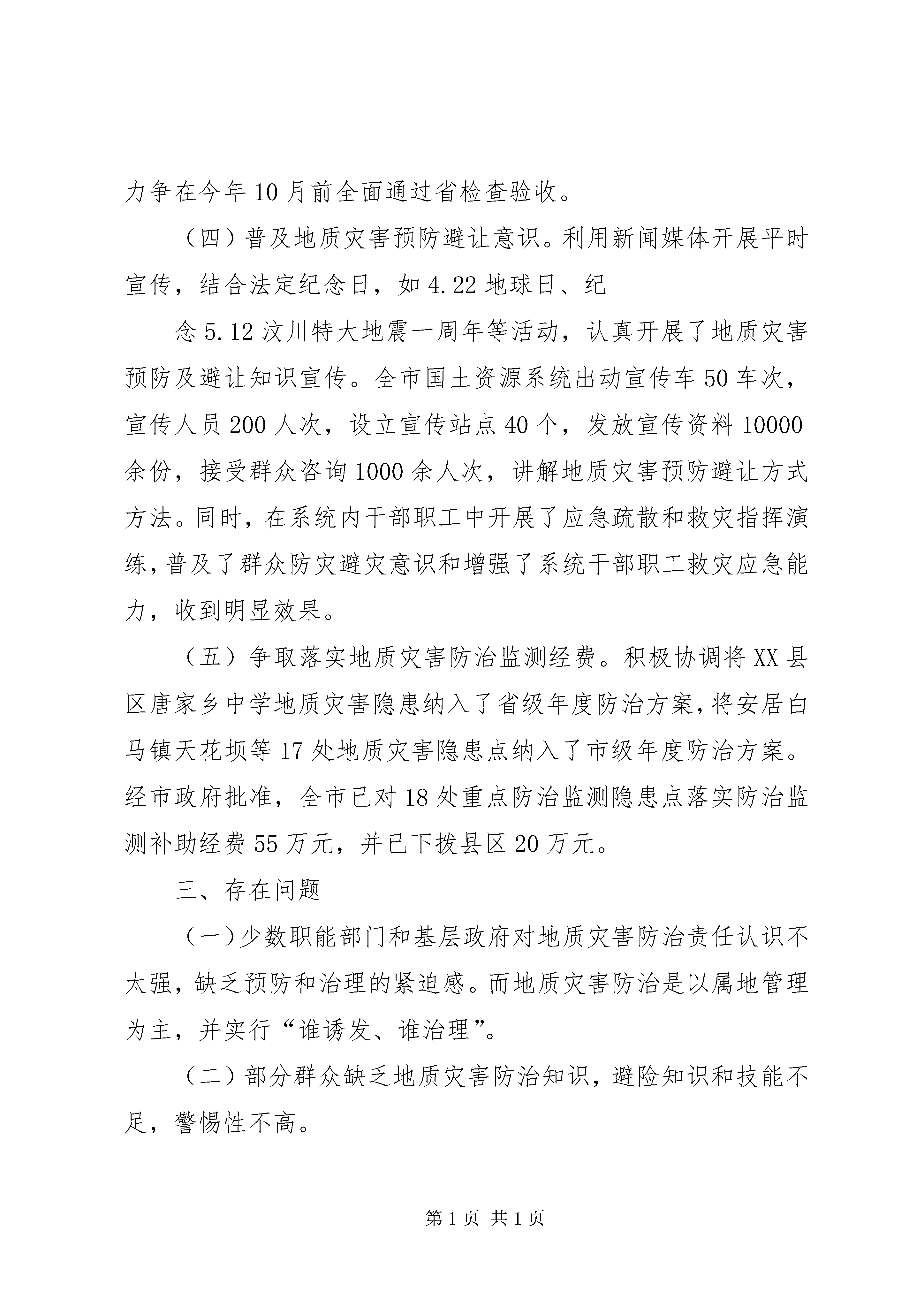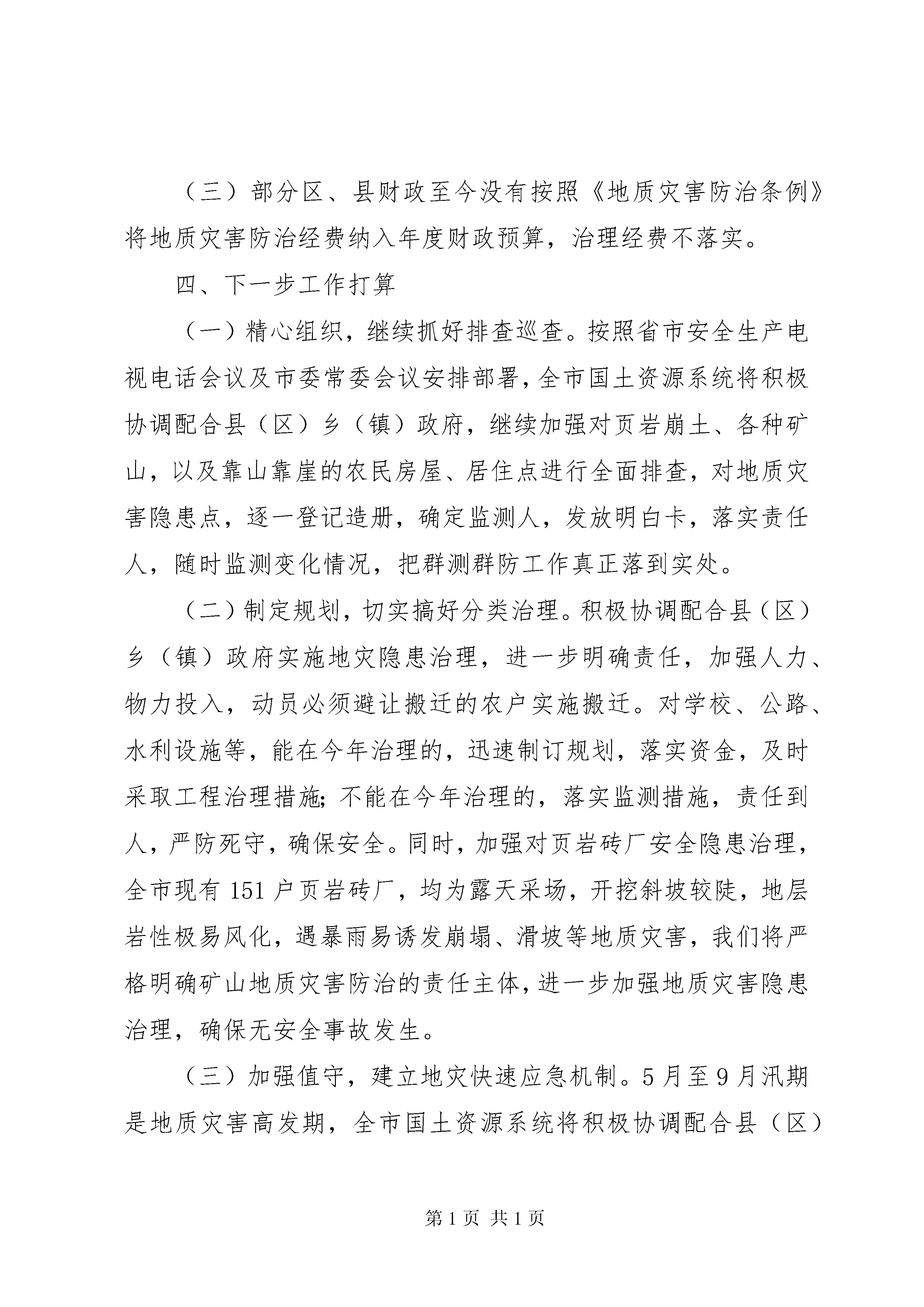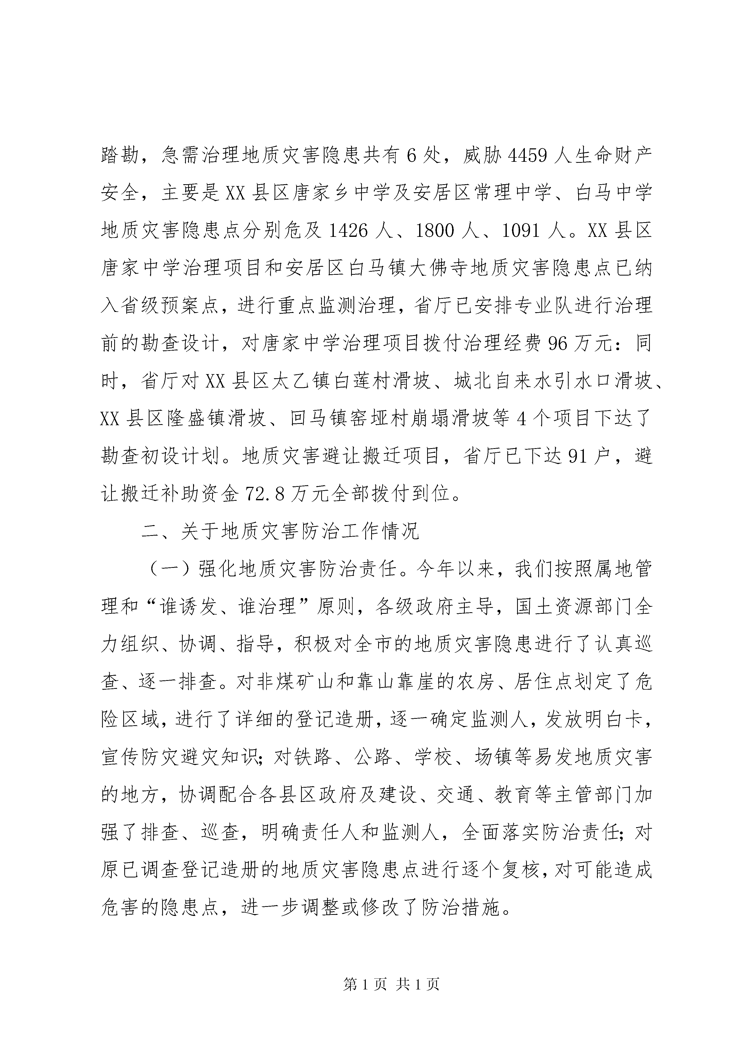 响岩镇地质灾害防治工作情况汇报全市地质灾害防治工作情况汇报各位领导:今年以来,我市按照省委、省政府及省厅的安排部署,高度重视地质灾害防治工作,把地质灾害防治作为全市国土资源管理工作的重中之重来抓,牢固树立“以人为本”和“安全重于泰山”的责任意识,切实采取行之有效的防治措施,千方百计确保人民群众的生命财产安全。现将近期工作情况汇报如下:一、积极开展重大地质灾害隐患治理情况今年针对全市地质灾害隐患点多面广,规模小,危害大的特点。年初我局积极聘请四川核工业地质调查院,对全市30个中型以上隐患点进行了立项前调查工作,为地质灾害隐患的立项治理和避让搬迁提出了防治意见。积极向省厅汇报我市地质灾情,争取其对我市地质灾害治理和避让搬迁,给予项目和资金支持。今年以来,我局组织各县区,先后向省国土资源厅申报地质灾害治理项目6个,并申报对受地质灾害威胁的群众实施避让搬迁39户。结合“1.31”磨溪抗震救灾,自筹资金,积极组织力量排危,目前已排除2处重大地质灾害隐患,实施避让搬迁1处。截止目前,全市共排查出各类地质灾害隐患点759处,其中,XX县区116处、安居区266处、XX县区20处、XX县区287处、XX县区64处,市本级三园区6处。经省地质灾害评估专业队伍踏勘,急需治理地质灾害隐患共有6处,威胁4459人生命财产安全,主要是XX县区唐家乡中学及安居区常理中学、白马中学地质灾害隐患点分别危及1426人、1800人、1091人。XX县区唐家中学治理项目和安居区白马镇大佛寺地质灾害隐患点已纳入省级预案点,进行重点监测治理,省厅已安排专业队进行治理前的勘查设计,对唐家中学治理项目拨付治理经费96万元:同时,省厅对XX县区太乙镇白莲村滑坡、城北自来水引水口滑坡、XX县区隆盛镇滑坡、回马镇窑垭村崩塌滑坡等4个项目下达了勘查初设计划。地质灾害避让搬迁项目,省厅已下达91户,避让搬迁补助资金72.8万元全部拨付到位。二、关于地质灾害防治工作情况(一)强化地质灾害防治责任。今年以来,我们按照属地管理和“谁诱发、谁治理”原则,各级政府主导,国土资源部门全力组织、协调、指导,积极对全市的地质灾害隐患进行了认真巡查、逐一排查。对非煤矿山和靠山靠崖的农房、居住点划定了危险区域,进行了详细的登记造册,逐一确定监测人,发放明白卡,宣传防灾避灾知识;对铁路、公路、学校、场镇等易发地质灾害的地方,协调配合各县区政府及建设、交通、教育等主管部门加强了排查、巡查,明确责任人和监测人,全面落实防治责任;对原已调查登记造册的地质灾害隐患点进行逐个复核,对可能造成危害的隐患点,进一步调整或修改了防治措施。按照市委市政府的安排部署,全市国土资源系统进一步强化了防灾意识,研究落实防灾减灾措施,开展地质灾害排查和监测。特别是“1.31”磨溪地震后,局党委迅速行动,及时发出《关于加强地震引发地质灾害防治工作的紧急通知》,同时,市局班子成员分别率队深入三县两区尤其是重灾区安居区,督导县区对各地质灾害隐患点进行全面拉网式巡查、排查,并采取有力措施,尽全力排除险情。今年年初,我局及时编制了《XX市2010年地质灾害防治方案》(草案)、印发了《关于做好2010年地质灾害防治汛前迎检工作的通知》等文件,及时安排部署了2010年全市地质灾害防治工作,强化防灾责任意识,落实防灾减灾措施,并开展了督促检查,确保工作落实。今年3月25日,我市顺利通过了省厅汛前地质灾害防治工作的检查验收,并获得了检查组的肯定。(三)推进地灾防治“十有县”建设。“十有县”建设是指地质灾害防治工作中:有组织领导机构,有规划治理方案,有稳定的经费来源,有落实到位的监测人员,有负责的地质灾害联络员,有排查巡查报告决策制度,有宣传警示牌,有地质灾害气象预报,有报警简易器材,有对相关人员的培训。全市国土资源系统以建设“十有”为契机,按照“十有县”建设要求,认真推进全市地质灾害防治工作。全市三县两区均申报了创建计划,有条不紊地推进各项创建工作,切实保护受威胁群众生命财产安全,力争在今年10月前全面通过省检查验收。(四)普及地质灾害预防避让意识。利用新闻媒体开展平时宣传,结合法定纪念日,如4.22地球日、纪念5.12汶川特大地震一周年等活动,认真开展了地质灾害预防及避让知识宣传。全市国土资源系统出动宣传车50车次,宣传人员200人次,设立宣传站点40个,发放宣传资料10000余份,接受群众咨询1000余人次,讲解地质灾害预防避让方式方法。同时,在系统内干部职工中开展了应急疏散和救灾指挥演练,普及了群众防灾避灾意识和增强了系统干部职工救灾应急能力,收到明显效果。(五)争取落实地质灾害防治监测经费。积极协调将XX县区唐家乡中学地质灾害隐患纳入了省级年度防治方案,将安居白马镇天花坝等17处地质灾害隐患点纳入了市级年度防治方案