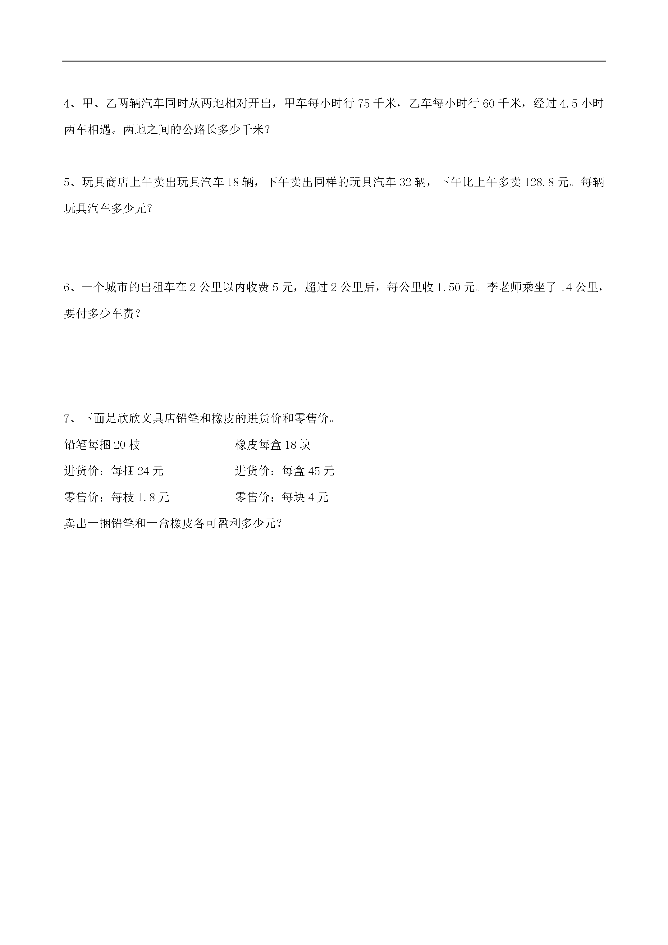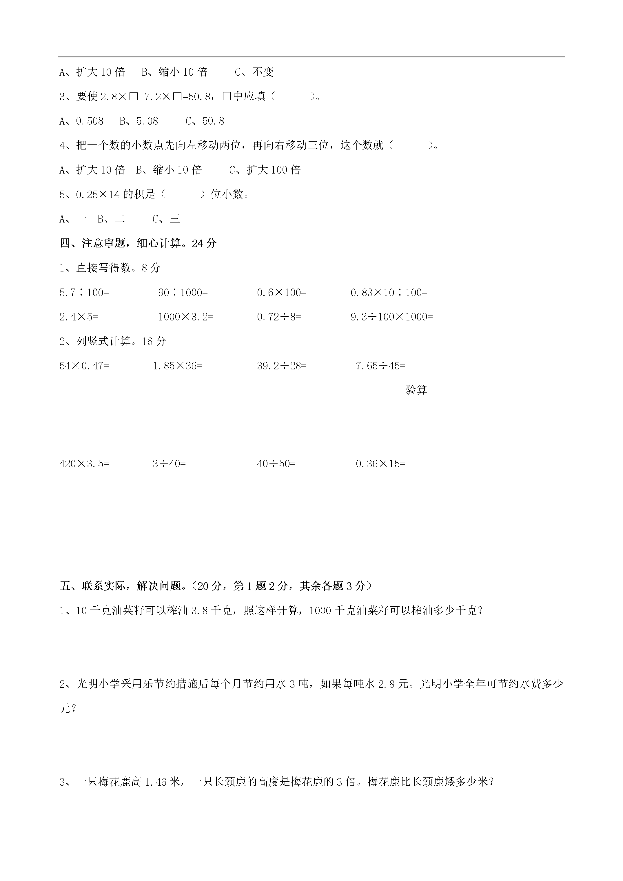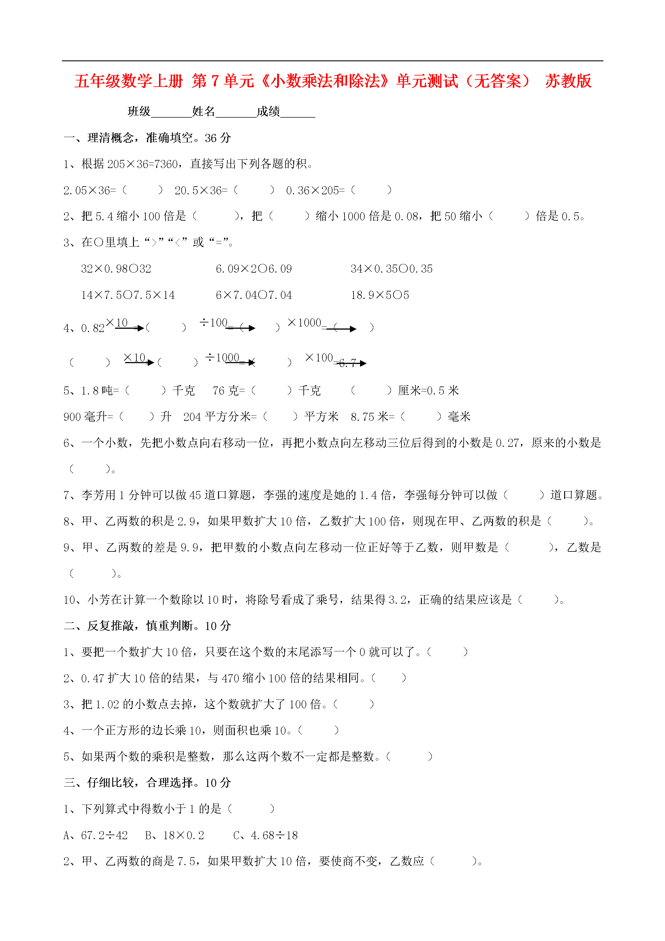 五年级数学上册第7单元《小数乘法和除法》单元测试(无答案)苏教版班级姓名成绩一、理清概念,准确填空。36分1、根据205×36=7360,直接写出下列各题的积。2.05×36=()20.5×36=()0.36×205=()2、把5.4缩小100倍是(),把()缩小1000倍是0.08,把50缩小()倍是0.5。3、在○里填上“>”“<”或“=”。32×0.98○326.09×2○6.0934×0.35○0.3514×7.5○7.5×146×7.04○7.0418.9×5○54、0.82×10=()÷100=()×1000=()()×10=()÷1000=()×100=6.75、1.8吨=()千克76克=()千克()厘米=0.5米900毫升=()升204平方分米=()平方米8.75米=()毫米6、一个小数,先把小数点向右移动一位,再把小数点向左移动三位后得到的小数是0.27,原来的小数是()。7、李芳用1分钟可以做45道口算题,李强的速度是她的1.4倍,李强每分钟可以做()道口算题。8、甲、乙两数的积是2.9,如果甲数扩大10倍,乙数扩大100倍,则现在甲、乙两数的积是()。9、甲、乙两数的差是9.9,把甲数的小数点向左移动一位正好等于乙数,则甲数是(),乙数是()。10、小芳在计算一个数除以10时,将除号看成了乘号,结果得3.2,正确的结果应该是()。二、反复推敲,慎重判断。10分1、要把一个数扩大10倍,只要在这个数的末尾添写一个0就可以了。()2、0.47扩大10倍的结果,与470缩小100倍的结果相同。()3、把1.02的小数点去掉,这个数就扩大了100倍。()4、一个正方形的边长乘10,则面积也乘10。()5、如果两个数的乘积是整数,那么这两个数不一定都是整数。()三、仔细比较,合理选择。10分1、下列算式中得数小于1的是()A、67.2÷42B、18×0.2C、4.68÷182、甲、乙两数的商是7.5,如果甲数扩大10倍,要使商不变,乙数应()。A、扩大10倍B、缩小10倍C、不变3、要使2.8×□+7.2×□=50.8,□中应填()。A、0.508B、5.08C、50.84、把一个数的小数点先向左移动两位,再向右移动三位,这个数就()。A、扩大10倍B、缩小10倍C、扩大100倍5、0.25×14的积是()位小数。A、一B、二C、三四、注意审题,细心计算。24分1、直接写得数。8分5.7÷100=90÷1000=0.6×100=0.83×10÷100=2.4×5=1000×3.2=0.72÷8=9.3÷100×1000=2、列竖式计算。16分54×0.47=1.85×36=39.2÷28=7.65÷45=验算420×3.5=3÷40=40÷50=0.36×15=五、联系实际,解决问题。(20分,第1题2分,其余各题3分)1、10千克油菜籽可以榨油3.8千克,照这样计算,1000千克油菜籽可以榨油多少千克?2、光明小学采用乐节约措施后每个月节约用水3吨,如果每吨水2.8元。光明小学全年可节约水费多少元?3、一只梅花鹿高1.46米,一只长颈鹿的高度是梅花鹿的3倍。梅花鹿比长颈鹿矮多少米?4、甲、乙两辆汽车同时从两地相对开出,甲车每小时行75千米,乙车每小时行60千米,经过4.5小时两车相遇。两地之间的公路长多少千米?5、玩具商店上午卖出玩具汽车18辆,下午卖出同样的玩具汽车32辆,下午比上午多卖128.8元。每辆玩具汽车多少元?6、一个城市的出租车在2公里以内收费5元,超过2公里后,每公里收1.50元。李老师乘坐了14公里,要付多少车费?7、下面是欣欣文具店铅笔和橡皮的进货价和零售价。铅笔每捆20枝橡皮每盒18块进货价:每捆24元进货价:每盒45元零售价:每枝1.8元零售价:每块4元卖出一捆铅笔和一盒橡皮各可盈利多少元?