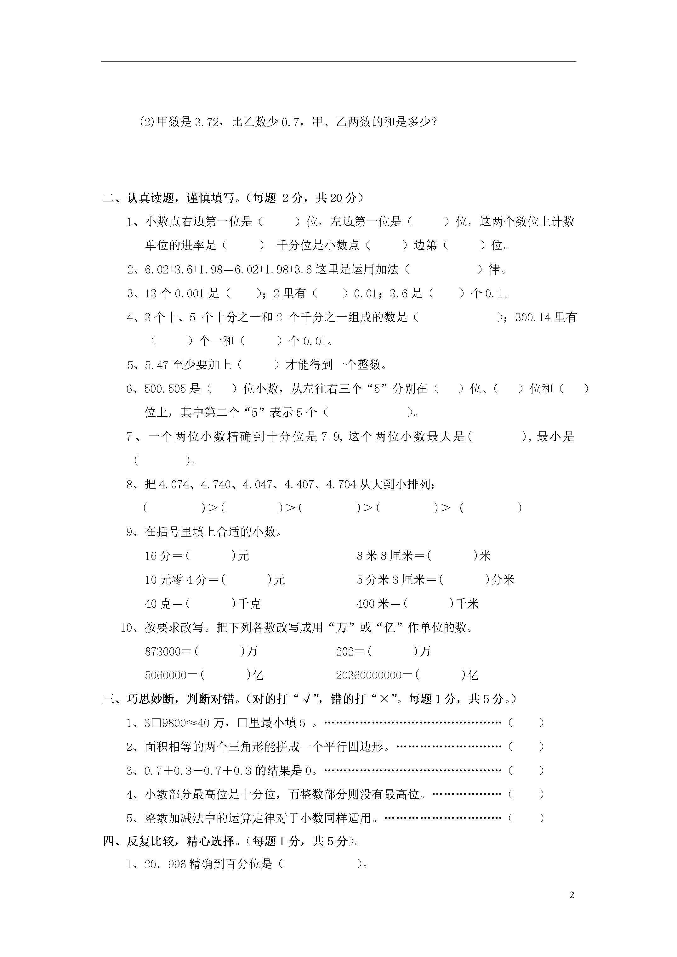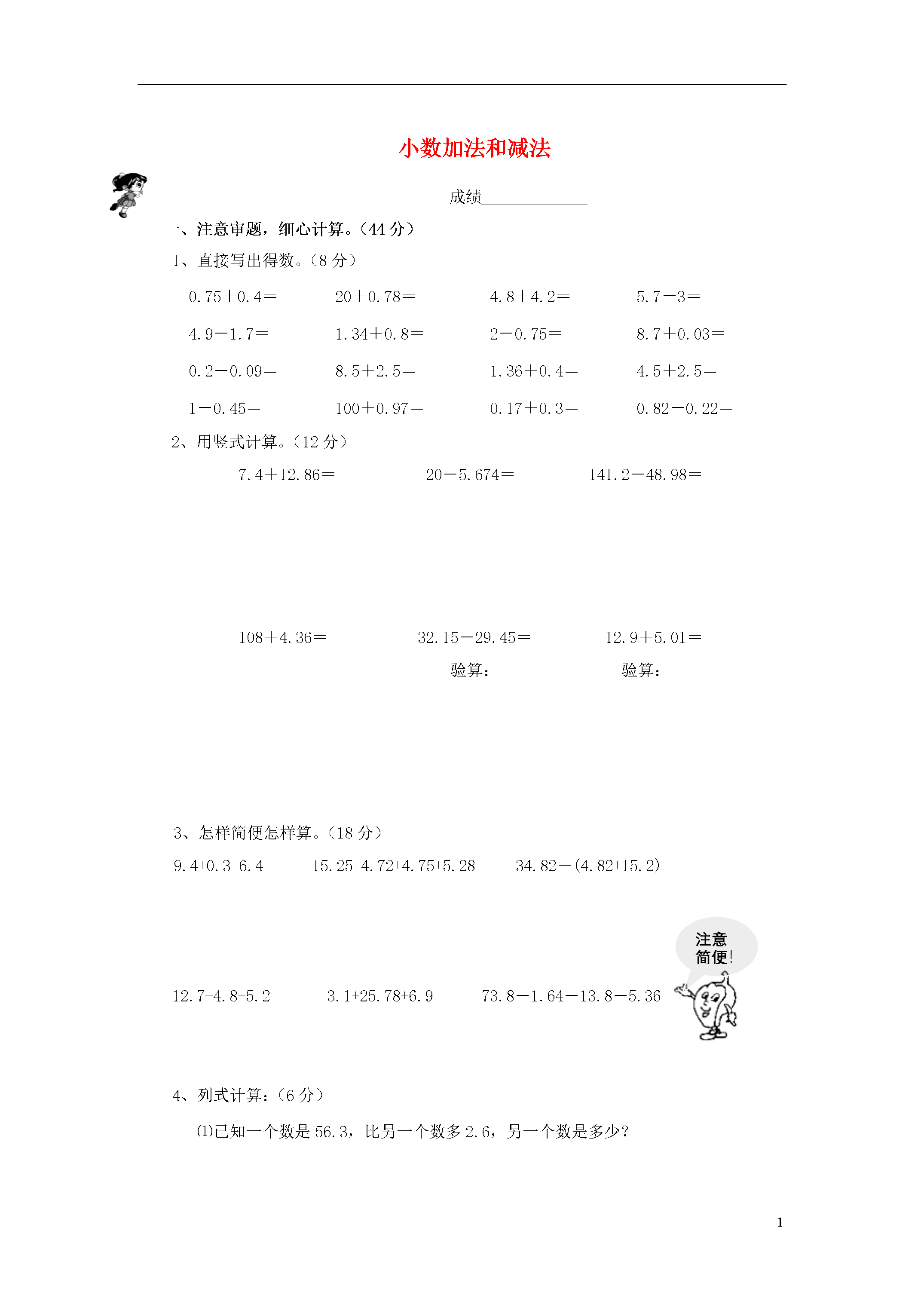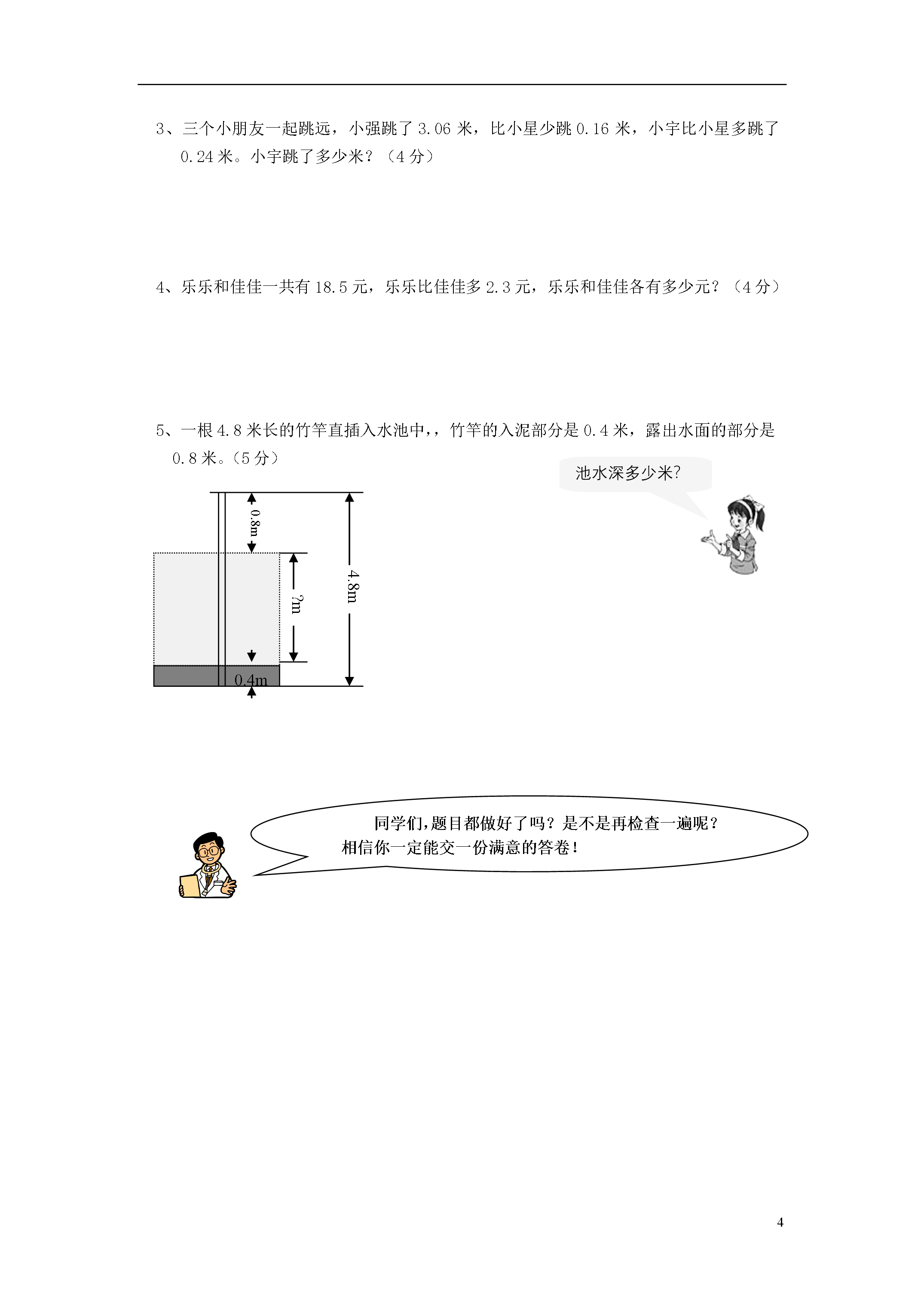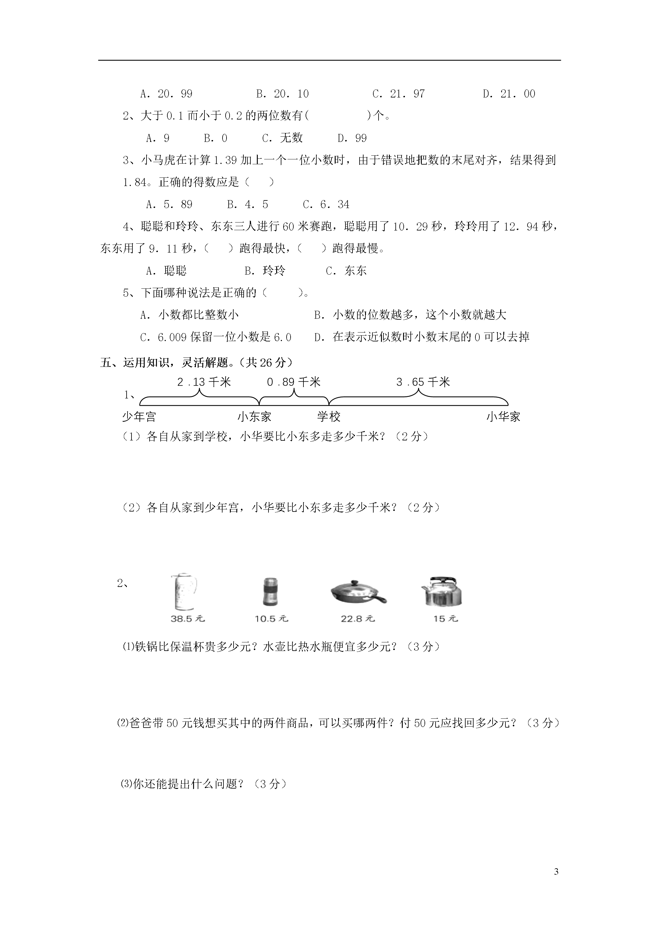4小数加法和减法成绩_____________一、注意审题,细心计算。(44分)1、直接写出得数。(8分)0.75+0.4=20+0.78=4.8+4.2=5.7-3=4.9-1.7=1.34+0.8=2-0.75=8.7+0.03=0.2-0.09=8.5+2.5=1.36+0.4=4.5+2.5=1-0.45=100+0.97=0.17+0.3=0.82-0.22=2、用竖式计算。(12分)7.4+12.86=20-5.674=141.2-48.98=108+4.36=32.15-29.45=12.9+5.01=验算:验算:3、怎样简便怎样算。(18分)9.4+0.3-6.415.25+4.72+4.75+5.2834.82-(4.82+15.2)注意简便!12.7-4.8-5.23.1+25.78+6.973.8-1.64-13.8-5.364、列式计算:(6分)⑴已知一个数是56.3,比另一个数多2.6,另一个数是多少?(2)甲数是3.72,比乙数少0.7,甲、乙两数的和是多少?二、认真读题,谨慎填写。(每题2分,共20分)1、小数点右边第一位是()位,左边第一位是()位,这两个数位上计数单位的进率是()。千分位是小数点()边第()位。2、6.02+3.6+1.98=6.02+1.98+3.6这里是运用加法()律。3、13个0.001是();2里有()0.01;3.6是()个0.1。4、3个十、5个十分之一和2个千分之一组成的数是();300.14里有()个一和()个0.01。5、5.47至少要加上()才能得到一个整数。6、500.505是()位小数,从左往右三个“5”分别在()位、()位和()位上,其中第二个“5”表示5个()。7、一个两位小数精确到十分位是7.9,这个两位小数最大是(),最小是()。8、把4.074、4.740、4.047、4.407、4.704从大到小排列:()>()>()>()>()9、在括号里填上合适的小数。16分=()元8米8厘米=()米10元零4分=()元5分米3厘米=()分米40克=()千克400米=()千米10、按要求改写。把下列各数改写成用“万”或“亿”作单位的数。873000=()万202=()万5060000=()亿20360000000=()亿三、巧思妙断,判断对错。(对的打“√”,错的打“×”。每题1分,共5分。)1、3□9800≈40万,□里最小填5。………………………………………()2、面积相等的两个三角形能拼成一个平行四边形。………………………()3、0.7+0.3-0.7+0.3的结果是0。………………………………………()4、小数部分最高位是十分位,而整数部分则没有最高位。………………()5、整数加减法中的运算定律对于小数同样适用。…………………………()四、反复比较,精心选择。(每题1分,共5分)。1、20.996精确到百分位是()。A.20.99B.20.10C.21.97D.21.002、大于0.1而小于0.2的两位数有()个。A.9B.0C.无数D.993、小马虎在计算1.39加上一个一位小数时,由于错误地把数的末尾对齐,结果得到1.84。正确的得数应是()A.5.89B.4.5C.6.344、聪聪和玲玲、东东三人进行60米赛跑,聪聪用了10.29秒,玲玲用了12.94秒,东东用了9.11秒,()跑得最快,()跑得最慢。A.聪聪B.玲玲C.东东5、下面哪种说法是正确的()。A.小数都比整数小B.小数的位数越多,这个小数就越大C.6.009保留一位小数是6.0D.在表示近似数时小数末尾的0可以去掉小东家2.13千米0.89千米3.65千米学校小华家五、运用知识,灵活解题。(共26分)1、少年宫(1)各自从家到学校,小华要比小东多走多少千米?(2分)(2)各自从家到少年宫,小华要比小东多走多少千米?(2分)2、⑴铁锅比保温杯贵多少元?水壶比热水瓶便宜多少元?(3分)⑵爸爸带50元钱想买其中的两件商品,可以买哪两件?付50元应找回多少元?(3分)⑶你还能提出什么问题?(3分)3、三个小朋友一起跳远,小强跳了3.06米,比小星少跳0.16米,小宇比小星多跳了0.24米。小宇跳了多少米?(4分)4、乐乐和佳佳一共有18.5元,乐乐比佳佳多2.3元,乐乐和佳佳各有多少元?(4分)5、一根4.8米长的竹竿直插入水池中,,竹竿的入泥部分是0.4米,露出水面的部分是池水深多少米?0.8米。(5分)0.4m4.8m?m0.8m同学们,题目都做好了吗?是不是再检查一遍呢?相信你一定能交一份满意的答卷!