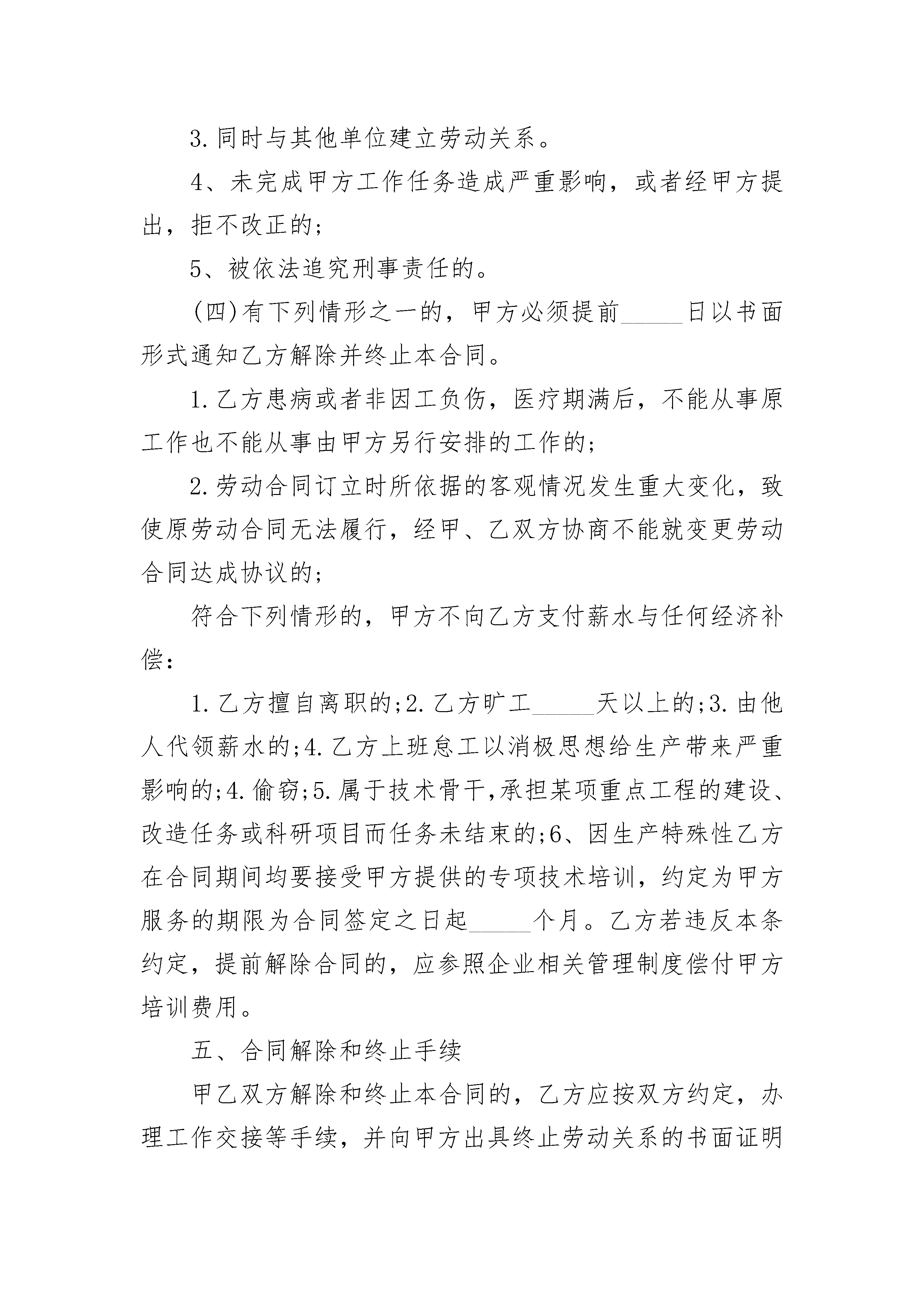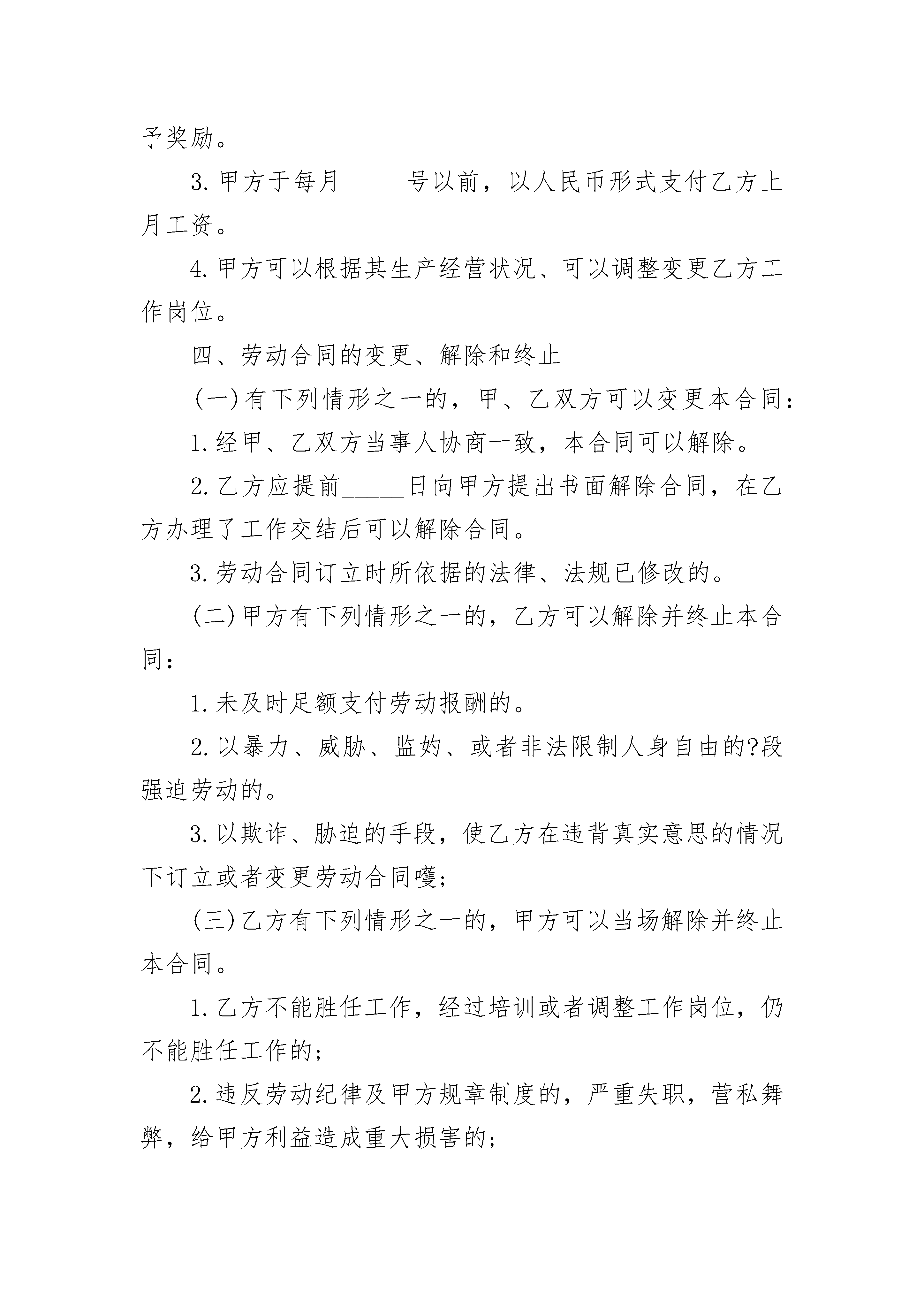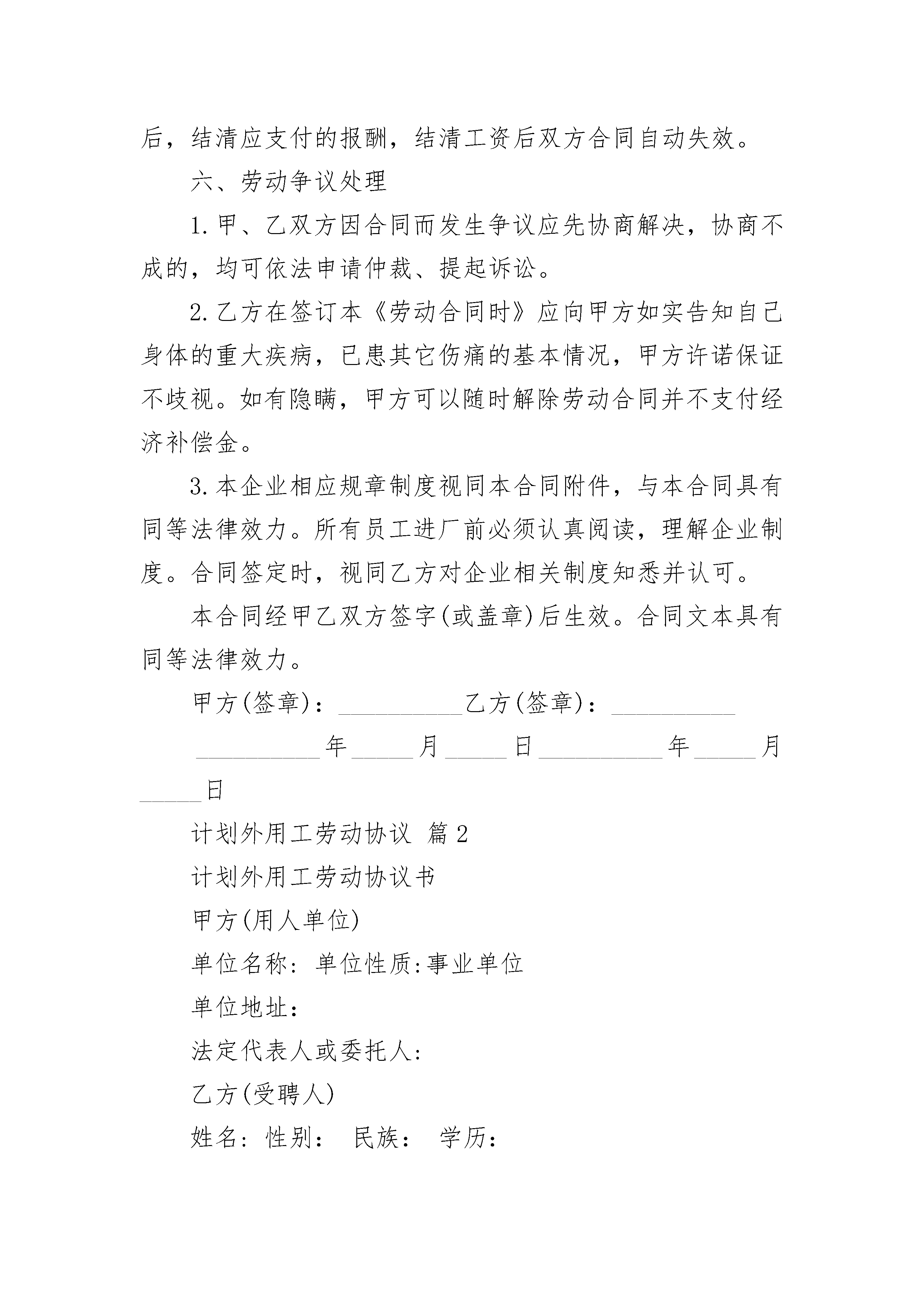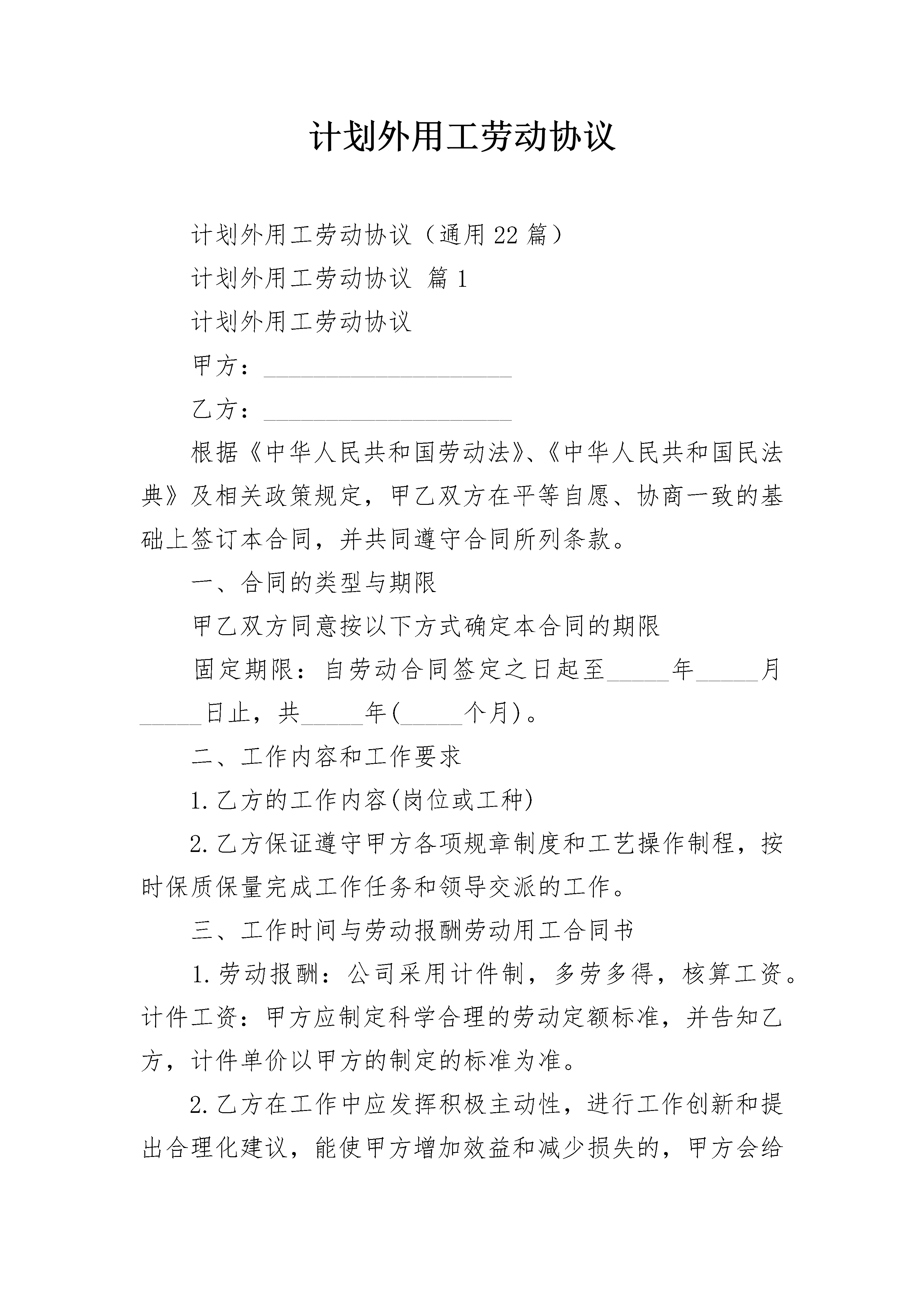 计划外用工劳动协议计划外用工劳动协议(通用22篇)计划外用工劳动协议篇1计划外用工劳动协议甲方:____________________乙方:____________________根据《中华人民共和国劳动法》、《中华人民共和国民法典》及相关政策规定,甲乙双方在平等自愿、协商一致的基础上签订本合同,并共同遵守合同所列条款。一、合同的类型与期限甲乙双方同意按以下方式确定本合同的期限固定期限:自劳动合同签定之日起至_____年_____月_____日止,共_____年(_____个月)。二、工作内容和工作要求1.乙方的工作内容(岗位或工种)2.乙方保证遵守甲方各项规章制度和工艺操作制程,按时保质保量完成工作任务和领导交派的工作。三、工作时间与劳动报酬劳动用工合同书1.劳动报酬:公司采用计件制,多劳多得,核算工资。计件工资:甲方应制定科学合理的劳动定额标准,并告知乙方,计件单价以甲方的制定的标准为准。2.乙方在工作中应发挥积极主动性,进行工作创新和提出合理化建议,能使甲方增加效益和减少损失的,甲方会给予奖励。3.甲方于每月_____号以前,以人民币形式支付乙方上月工资。4.甲方可以根据其生产经营状况、可以调整变更乙方工作岗位。四、劳动合同的变更、解除和终止(一)有下列情形之一的,甲、乙双方可以变更本合同:1.经甲、乙双方当事人协商一致,本合同可以解除。2.乙方应提前_____日向甲方提出书面解除合同,在乙方办理了工作交结后可以解除合同。3.劳动合同订立时所依据的法律、法规已修改的。(二)甲方有下列情形之一的,乙方可以解除并终止本合同:1.未及时足额支付劳动报酬的。2.以暴力、威胁、监妁、或者非法限制人身自由的?段强迫劳动的。3.以欺诈、胁迫的手段,使乙方在违背真实意思的情况下订立或者变更劳动合同嚄;(三)乙方有下列情形之一的,甲方可以当场解除并终止本合同。1.乙方不能胜任工作,经过培训或者调整工作岗位,仍不能胜任工作的;2.违反劳动纪律及甲方规章制度的,严重失职,营私舞弊,给甲方利益造成重大损害的;3.同时与其他单位建立劳动关系。4、未完成甲方工作任务造成严重影响,或者经甲方提出,拒不改正的;5、被依法追究刑事责任的。(四)有下列情形之一的,甲方必须提前_____日以书面形式通知乙方解除并终止本合同。1.乙方患病或者非因工负伤,医疗期满后,不能从事原工作也不能从事由甲方另行安排的工作的;2.劳动合同订立时所依据的客观情况发生重大变化,致使原劳动合同无法履行,经甲、乙双方协商不能就变更劳动合同达成协议的;符合下列情形的,甲方不向乙方支付薪水与任何经济补偿:1.乙方擅自离职的;2.乙方旷工_____天以上的;3.由他人代领薪水的;4.乙方上班怠工以消极思想给生产带来严重影响的;4.偷窃;5.属于技术骨干,承担某项重点工程的建设、改造任务或科研项目而任务未结束的;6、因生产特殊性乙方在合同期间均要接受甲方提供的专项技术培训,约定为甲方服务的期限为合同签定之日起_____个月。乙方若违反本条约定,提前解除合同的,应参照企业相关管理制度偿付甲方培训费用。五、合同解除和终止手续甲乙双方解除和终止本合同的,乙方应按双方约定,办理工作交接等手续,并向甲方出具终止劳动关系的书面证明后,结清应支付的报酬,结清工资后双方合同自动失效。六、劳动争议处理1.甲、乙双方因合同而发生争议应先协商解决,协商不成的,均可依法申请仲裁、提起诉讼。2.乙方在签订本《劳动合同时》应向甲方如实告知自己身体的重大疾病,已患其它伤痛的基本情况,甲方许诺保证不歧视。如有隐瞒,甲方可以随时解除劳动合同并不支付经济补偿金。3.本企业相应规章制度视同本合同附件,与本合同具有同等法律效力。所有员工进厂前必须认真阅读,理解企业制度。合同签定时,视同乙方对企业相关制度知悉并认可。本合同经甲乙双方签字(或盖章)后生效。合同文本具有同等法律效力。甲方(签章):__________乙方(签章):____________________年_____月_____日__________年_____月_____日计划外用工劳动协议篇2计划外用工劳动协议书甲方(用人单位)单位名称:单位性质:事业单位单位地址:法定代表人或委托人:乙方(受聘人)姓名:性别:民族:学历:出生年月:身份证号:家庭地址:邮政编码:户口所在地:甲乙双方依据《中国科学院知识创新工程试点全面推进阶段全员岗位聘任制试行办法》和《研究所岗位聘任制实施细则》,达成一致意见,签订本合同。一、岗位名称甲方聘任乙方在岗位工作。岗位性质与职级。二、合同期限合同期限:自年月日起;至年月日止;其中:年月日至年月日为试用期。三、岗位职责乙方的岗位职责:四、工作纪律和技术保密要求1.乙方应严格遵守国家的法律法规,遵守甲方制定的各项规章制度,服从甲方的管理;