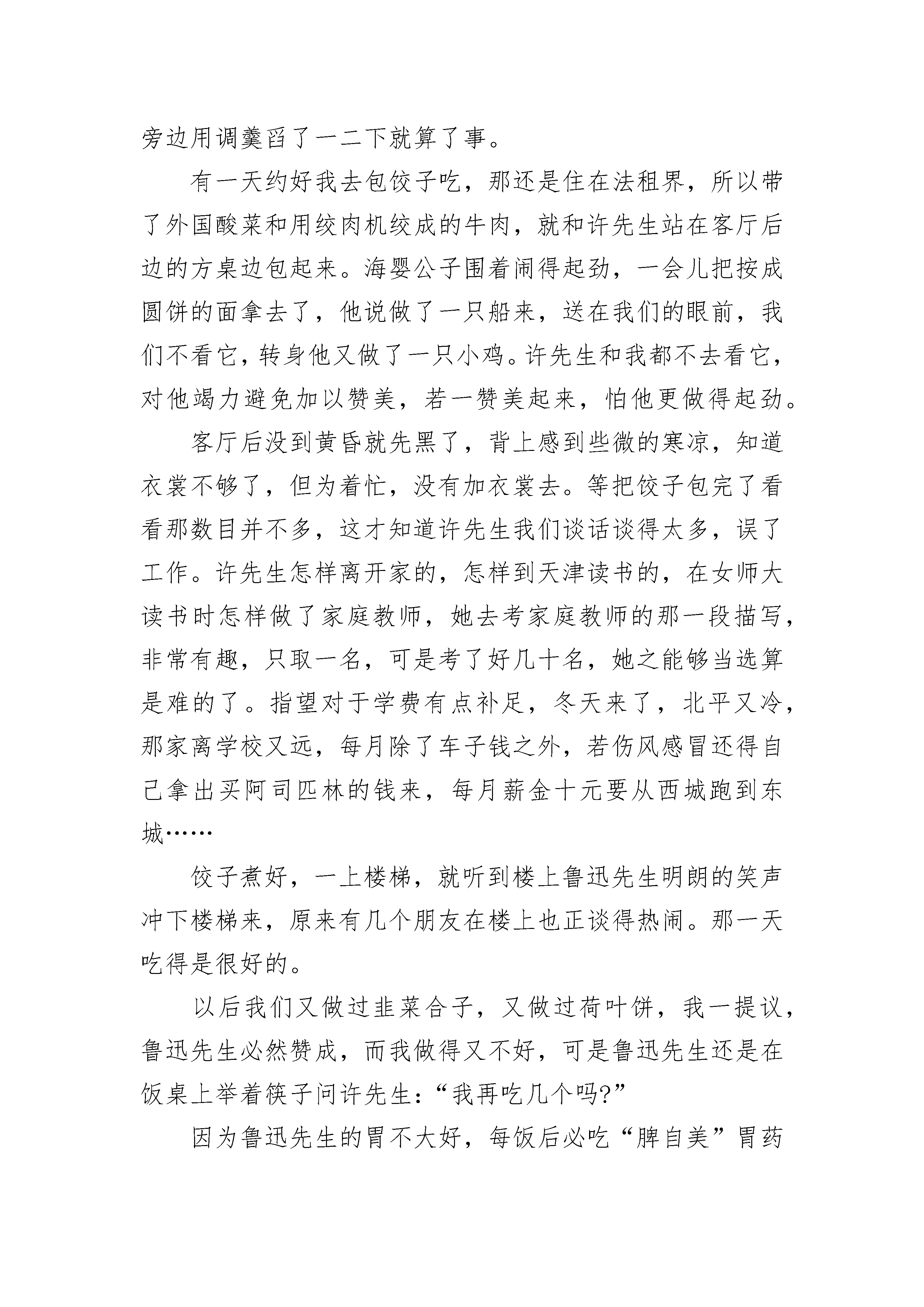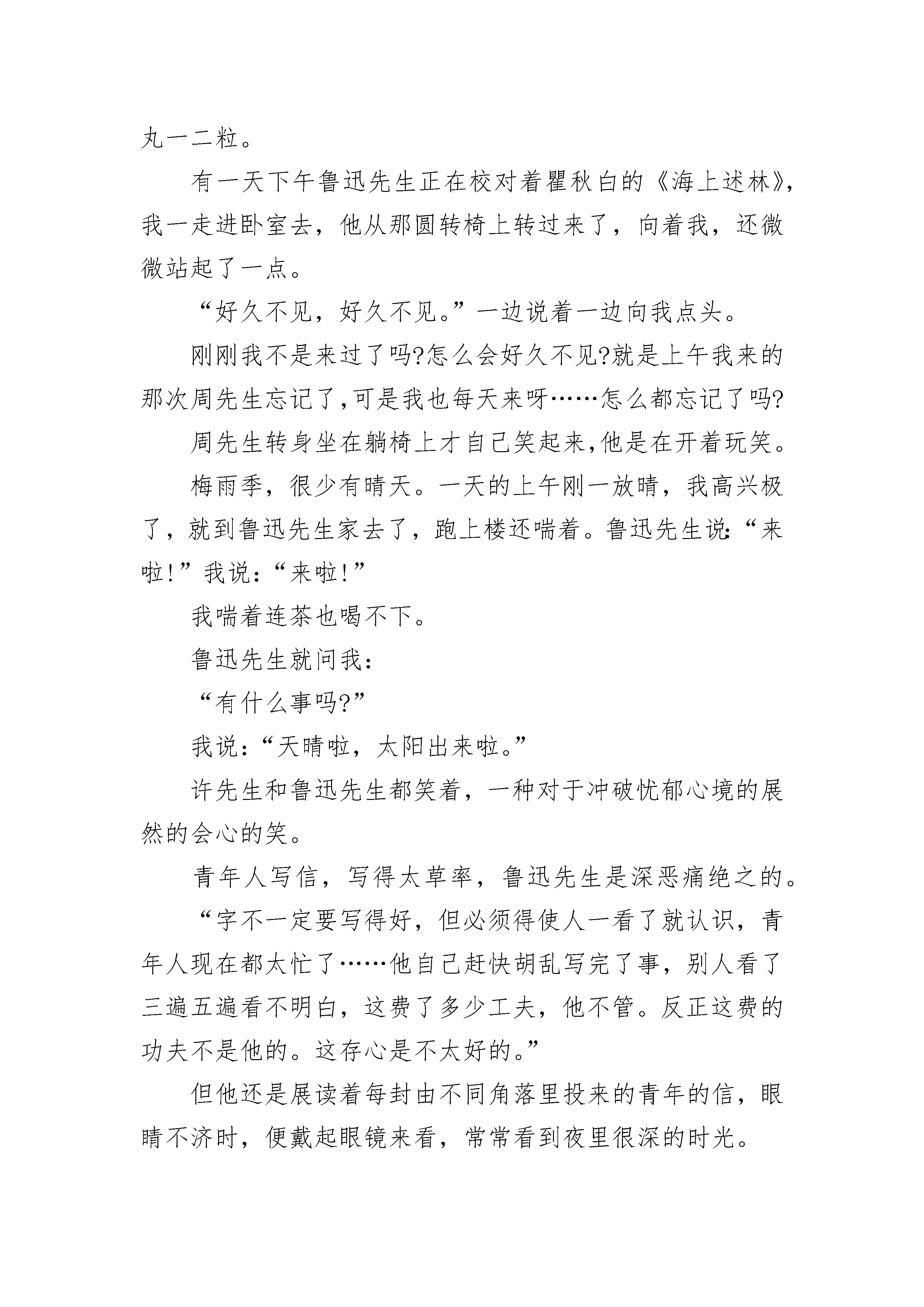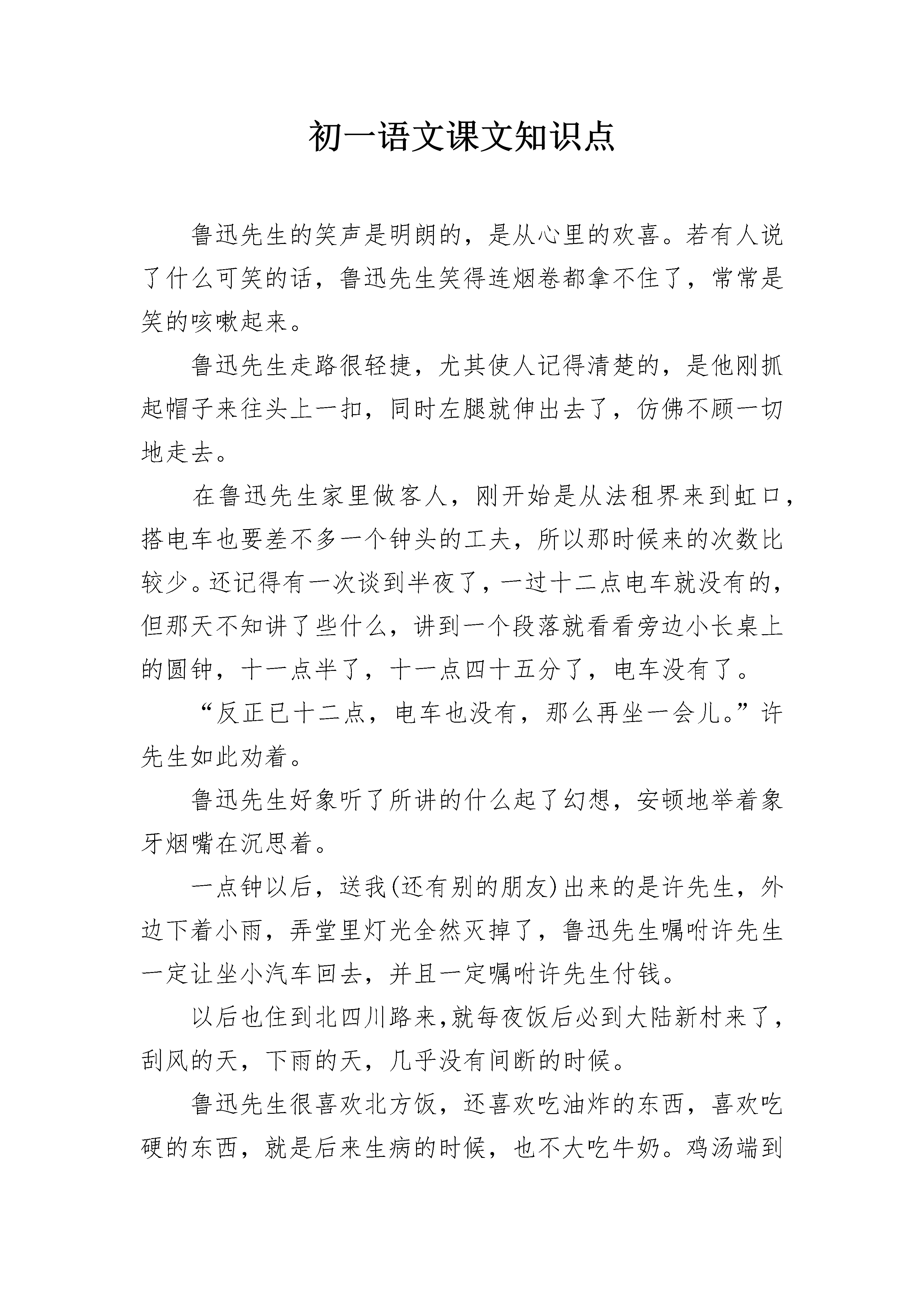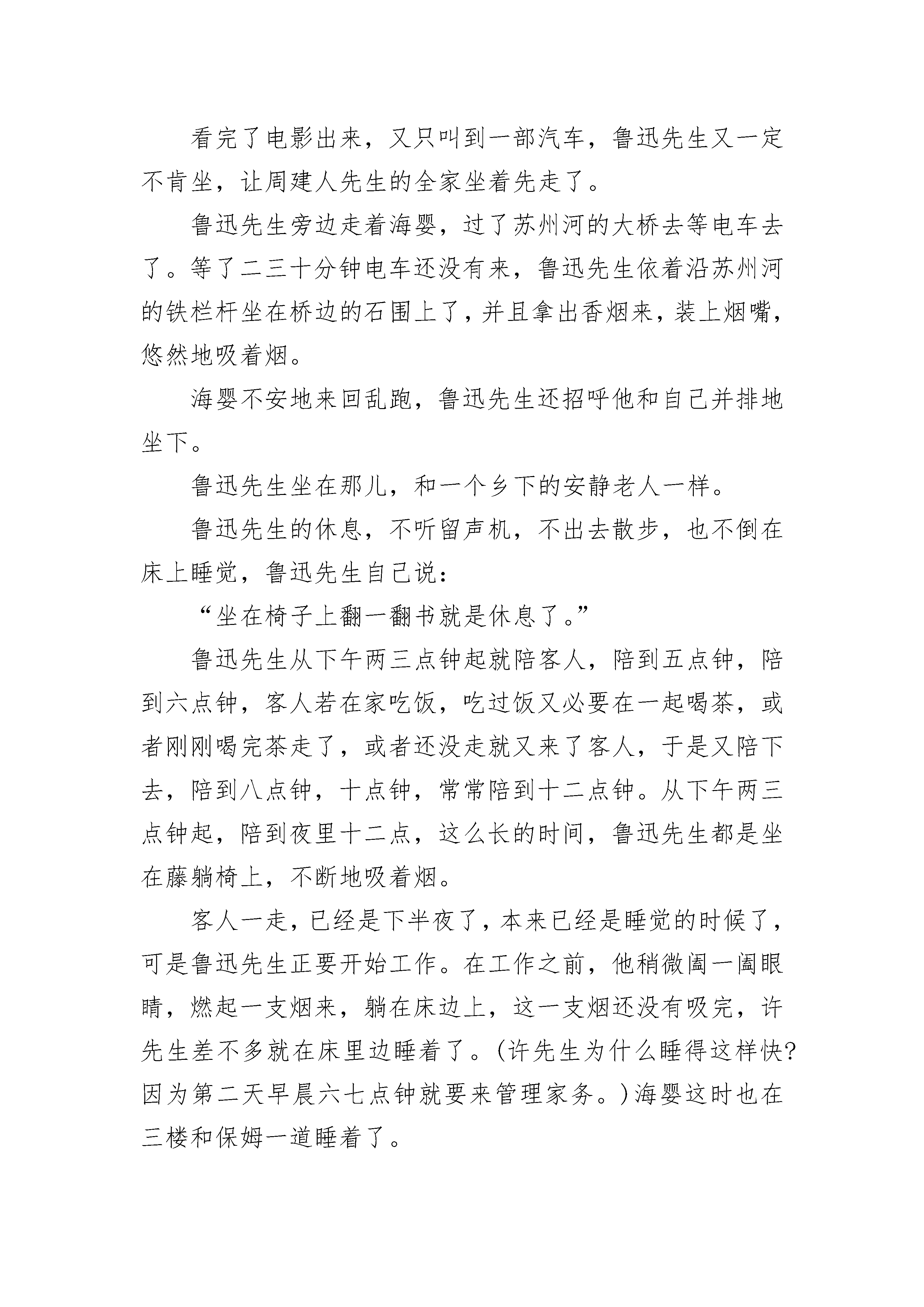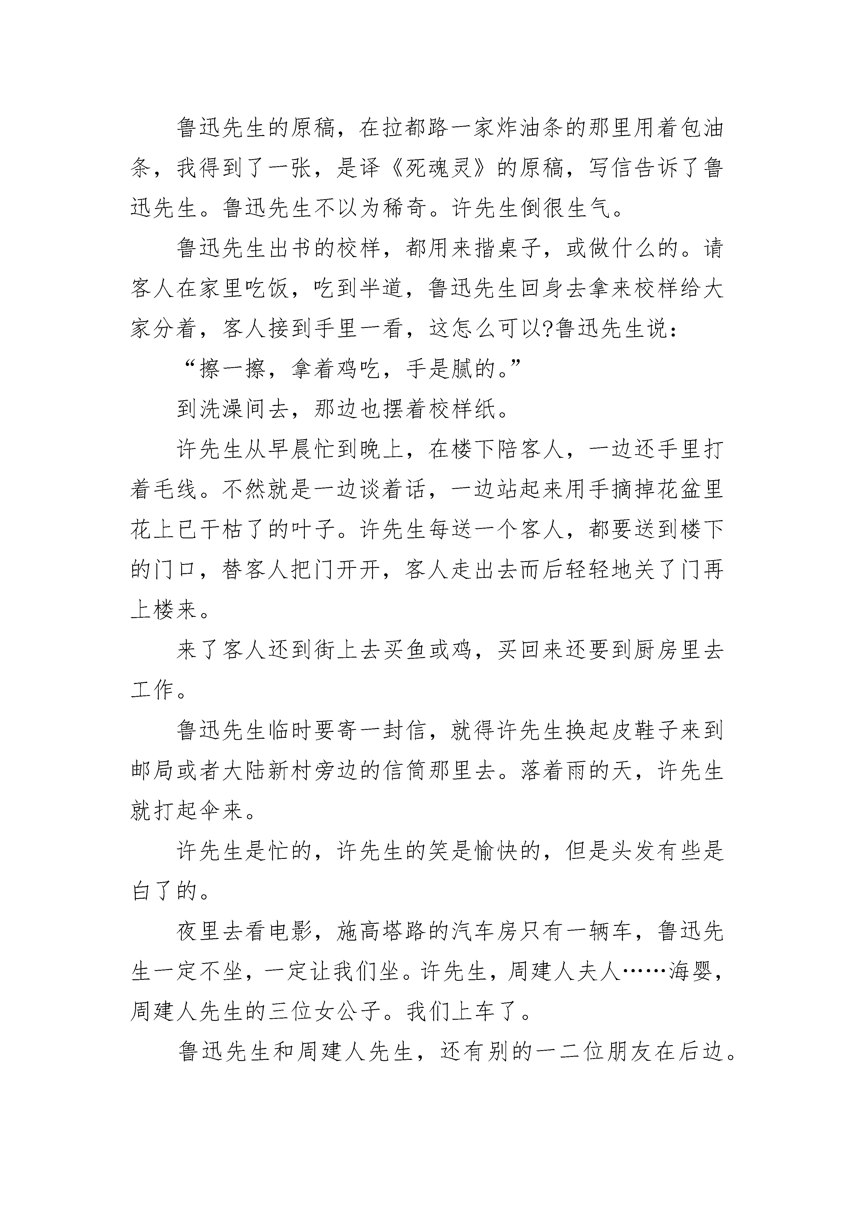 初一语文课文知识点鲁迅先生的笑声是明朗的,是从心里的欢喜。若有人说了什么可笑的话,鲁迅先生笑得连烟卷都拿不住了,常常是笑的咳嗽起来。鲁迅先生走路很轻捷,尤其使人记得清楚的,是他刚抓起帽子来往头上一扣,同时左腿就伸出去了,仿佛不顾一切地走去。在鲁迅先生家里做客人,刚开始是从法租界来到虹口,搭电车也要差不多一个钟头的工夫,所以那时候来的次数比较少。还记得有一次谈到半夜了,一过十二点电车就没有的,但那天不知讲了些什么,讲到一个段落就看看旁边小长桌上的圆钟,十一点半了,十一点四十五分了,电车没有了。“反正已十二点,电车也没有,那么再坐一会儿。”许先生如此劝着。鲁迅先生好象听了所讲的什么起了幻想,安顿地举着象牙烟嘴在沉思着。一点钟以后,送我(还有别的朋友)出来的是许先生,外边下着小雨,弄堂里灯光全然灭掉了,鲁迅先生嘱咐许先生一定让坐小汽车回去,并且一定嘱咐许先生付钱。以后也住到北四川路来,就每夜饭后必到大陆新村来了,刮风的天,下雨的天,几乎没有间断的时候。鲁迅先生很喜欢北方饭,还喜欢吃油炸的东西,喜欢吃硬的东西,就是后来生病的时候,也不大吃牛奶。鸡汤端到旁边用调羹舀了一二下就算了事。有一天约好我去包饺子吃,那还是住在法租界,所以带了外国酸菜和用绞肉机绞成的牛肉,就和许先生站在客厅后边的方桌边包起来。海婴公子围着闹得起劲,一会儿把按成圆饼的面拿去了,他说做了一只船来,送在我们的眼前,我们不看它,转身他又做了一只小鸡。许先生和我都不去看它,对他竭力避免加以赞美,若一赞美起来,怕他更做得起劲。客厅后没到黄昏就先黑了,背上感到些微的寒凉,知道衣裳不够了,但为着忙,没有加衣裳去。等把饺子包完了看看那数目并不多,这才知道许先生我们谈话谈得太多,误了工作。许先生怎样离开家的,怎样到天津读书的,在女师大读书时怎样做了家庭教师,她去考家庭教师的那一段描写,非常有趣,只取一名,可是考了好几十名,她之能够当选算是难的了。指望对于学费有点补足,冬天来了,北平又冷,那家离学校又远,每月除了车子钱之外,若伤风感冒还得自己拿出买阿司匹林的钱来,每月薪金十元要从西城跑到东城……饺子煮好,一上楼梯,就听到楼上鲁迅先生明朗的笑声冲下楼梯来,原来有几个朋友在楼上也正谈得热闹。那一天吃得是很好的。以后我们又做过韭菜合子,又做过荷叶饼,我一提议,鲁迅先生必然赞成,而我做得又不好,可是鲁迅先生还是在饭桌上举着筷子问许先生:“我再吃几个吗?”因为鲁迅先生的胃不大好,每饭后必吃“脾自美”胃药丸一二粒。有一天下午鲁迅先生正在校对着瞿秋白的《海上述林》,我一走进卧室去,他从那圆转椅上转过来了,向着我,还微微站起了一点。“好久不见,好久不见。”一边说着一边向我点头。刚刚我不是来过了吗?怎么会好久不见?就是上午我来的那次周先生忘记了,可是我也每天来呀……怎么都忘记了吗?周先生转身坐在躺椅上才自己笑起来,他是在开着玩笑。梅雨季,很少有晴天。一天的上午刚一放晴,我高兴极了,就到鲁迅先生家去了,跑上楼还喘着。鲁迅先生说:“来啦!”我说:“来啦!”我喘着连茶也喝不下。鲁迅先生就问我:“有什么事吗?”我说:“天晴啦,太阳出来啦。”许先生和鲁迅先生都笑着,一种对于冲破忧郁心境的展然的会心的笑。青年人写信,写得太草率,鲁迅先生是深恶痛绝之的。“字不一定要写得好,但必须得使人一看了就认识,青年人现在都太忙了……他自己赶快胡乱写完了事,别人看了三遍五遍看不明白,这费了多少工夫,他不管。反正这费的功夫不是他的。这存心是不太好的。”但他还是展读着每封由不同角落里投来的青年的信,眼睛不济时,便戴起眼镜来看,常常看到夜里很深的时光。鲁迅先生的原稿,在拉都路一家炸油条的那里用着包油条,我得到了一张,是译《死魂灵》的原稿,写信告诉了鲁迅先生。鲁迅先生不以为稀奇。许先生倒很生气。鲁迅先生出书的校样,都用来揩桌子,或做什么的。请客人在家里吃饭,吃到半道,鲁迅先生回身去拿来校样给大家分着,客人接到手里一看,这怎么可以?鲁迅先生说:“擦一擦,拿着鸡吃,手是腻的。”到洗澡间去,那边也摆着校样纸。许先生从早晨忙到晚上,在楼下陪客人,一边还手里打着毛线。不然就是一边谈着话,一边站起来用手摘掉花盆里花上已干枯了的叶子。许先生每送一个客人,都要送到楼下的门口,替客人把门开开,客人走出去而后轻轻地关了门再上楼来。来了客人还到街上去买鱼或鸡,买回来还要到厨房里去工作。鲁迅先生临时要寄一封信,就得许先生换起皮鞋子来到邮局或者大陆新村旁边的信筒那里去。落着雨的天,许先生就打起伞来。许先生是忙的,许先生的笑是愉快的,但是头发有些是白了的。夜里去看电影,施高塔路的汽车房只有一辆车,鲁迅先生一定不坐,一定让我们坐。许先生,周建人夫人……海婴,周建人先生的三位女公子。我们上车了。鲁迅先生和周建人先生,还有别的一二位朋友在后边。看完了电影出来,又只叫到