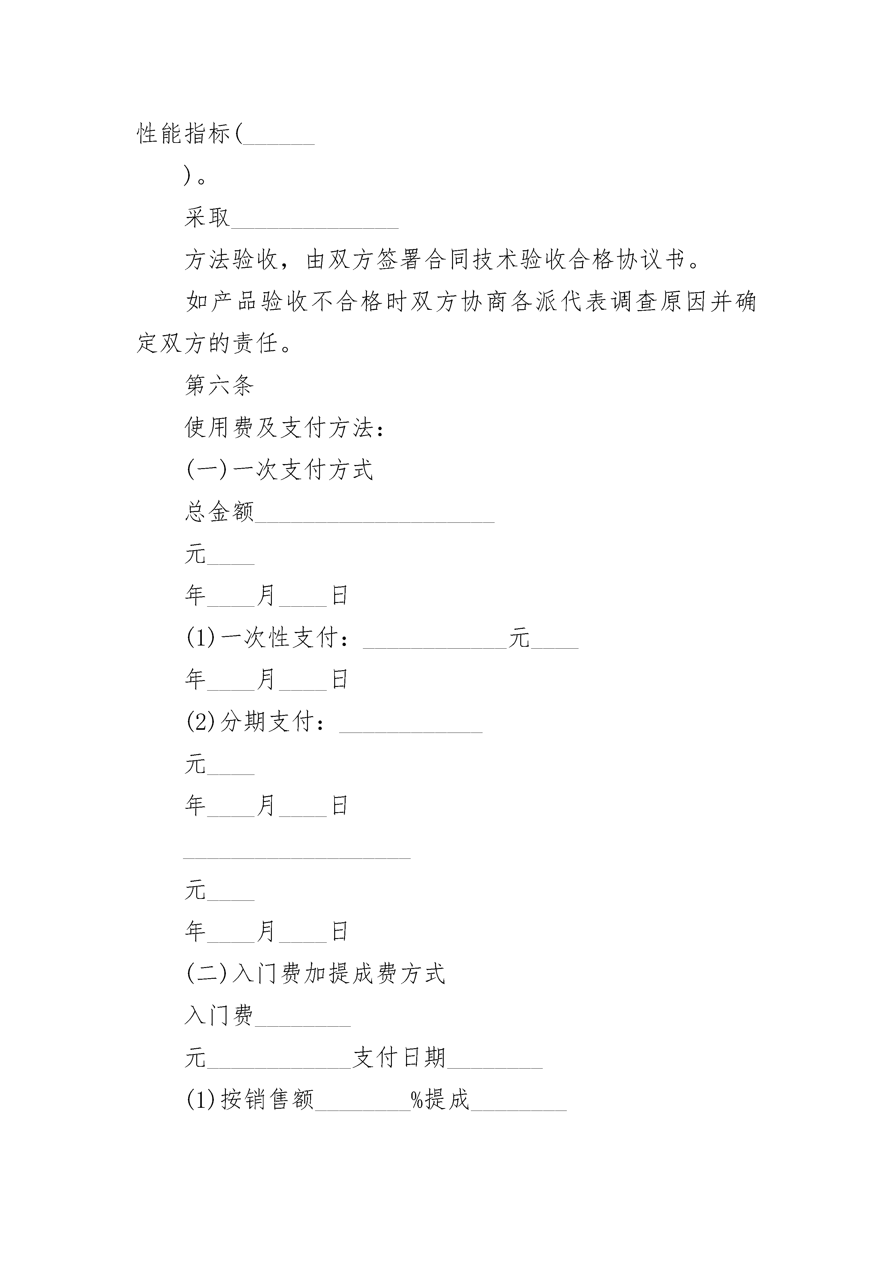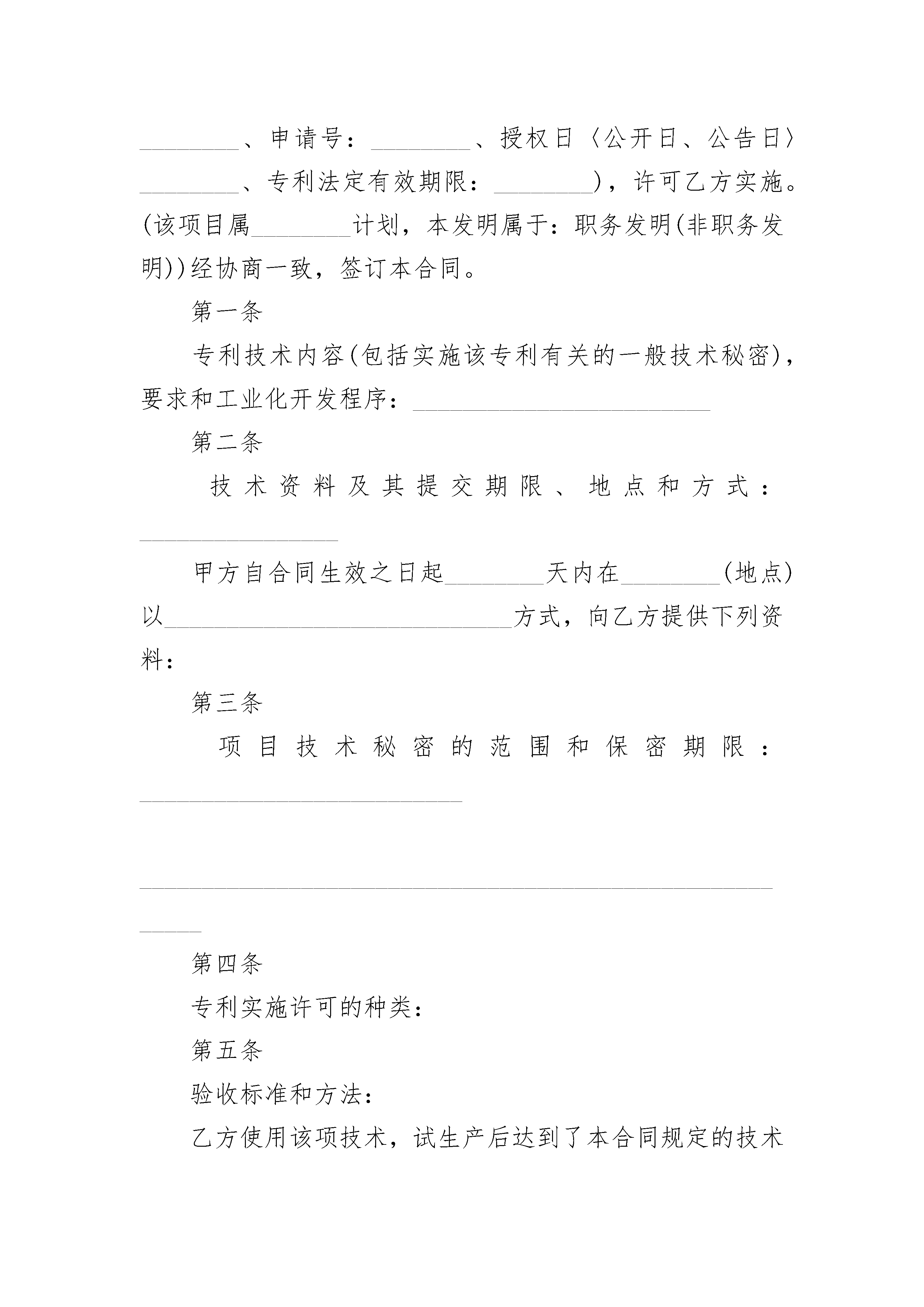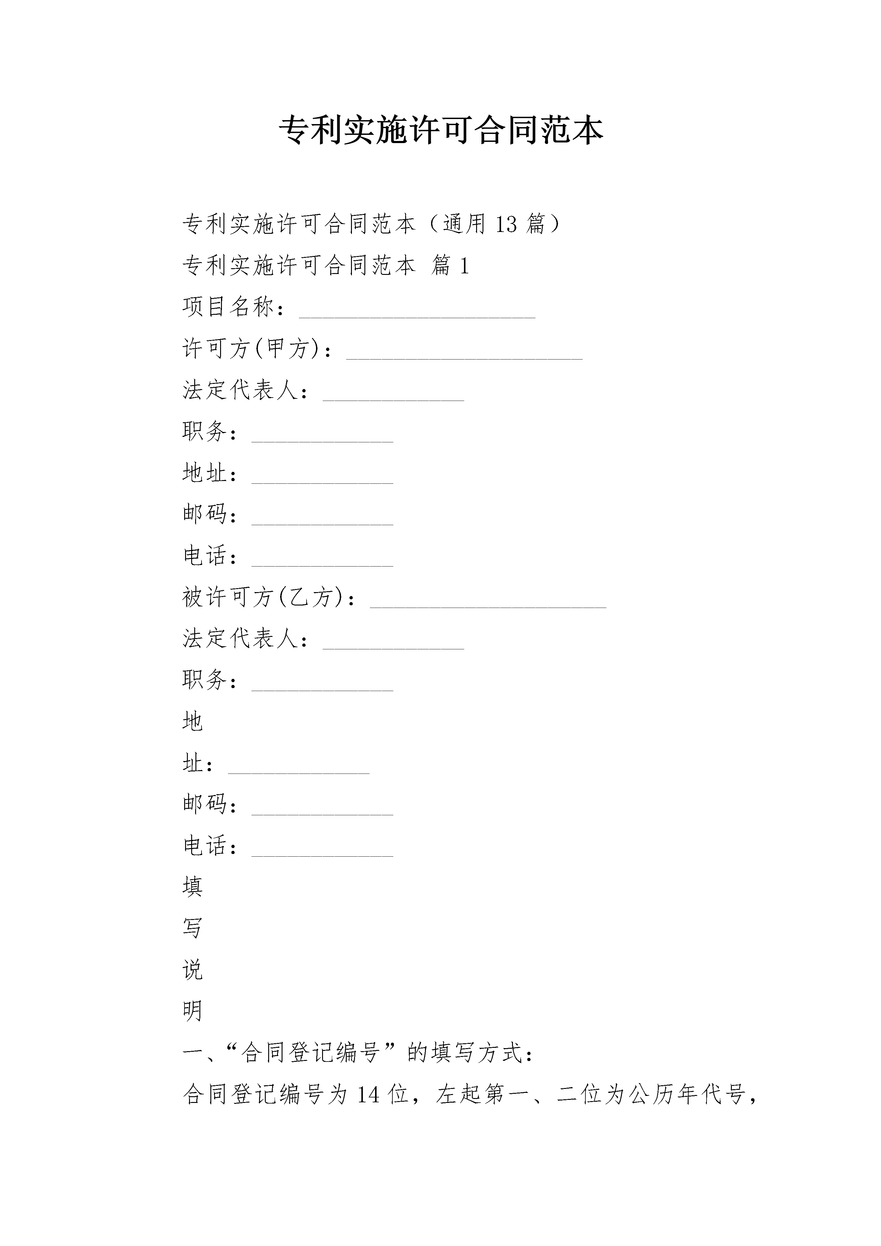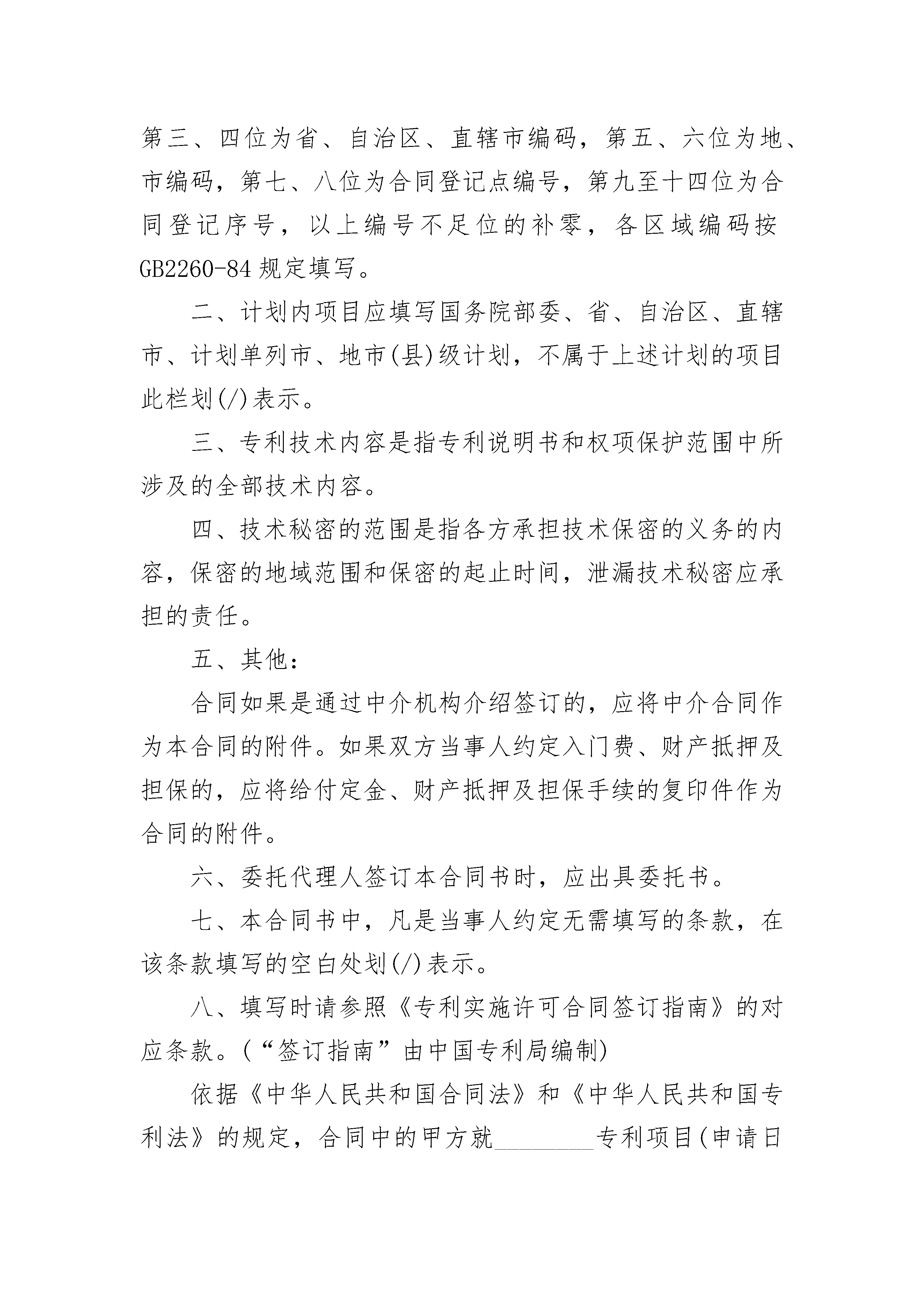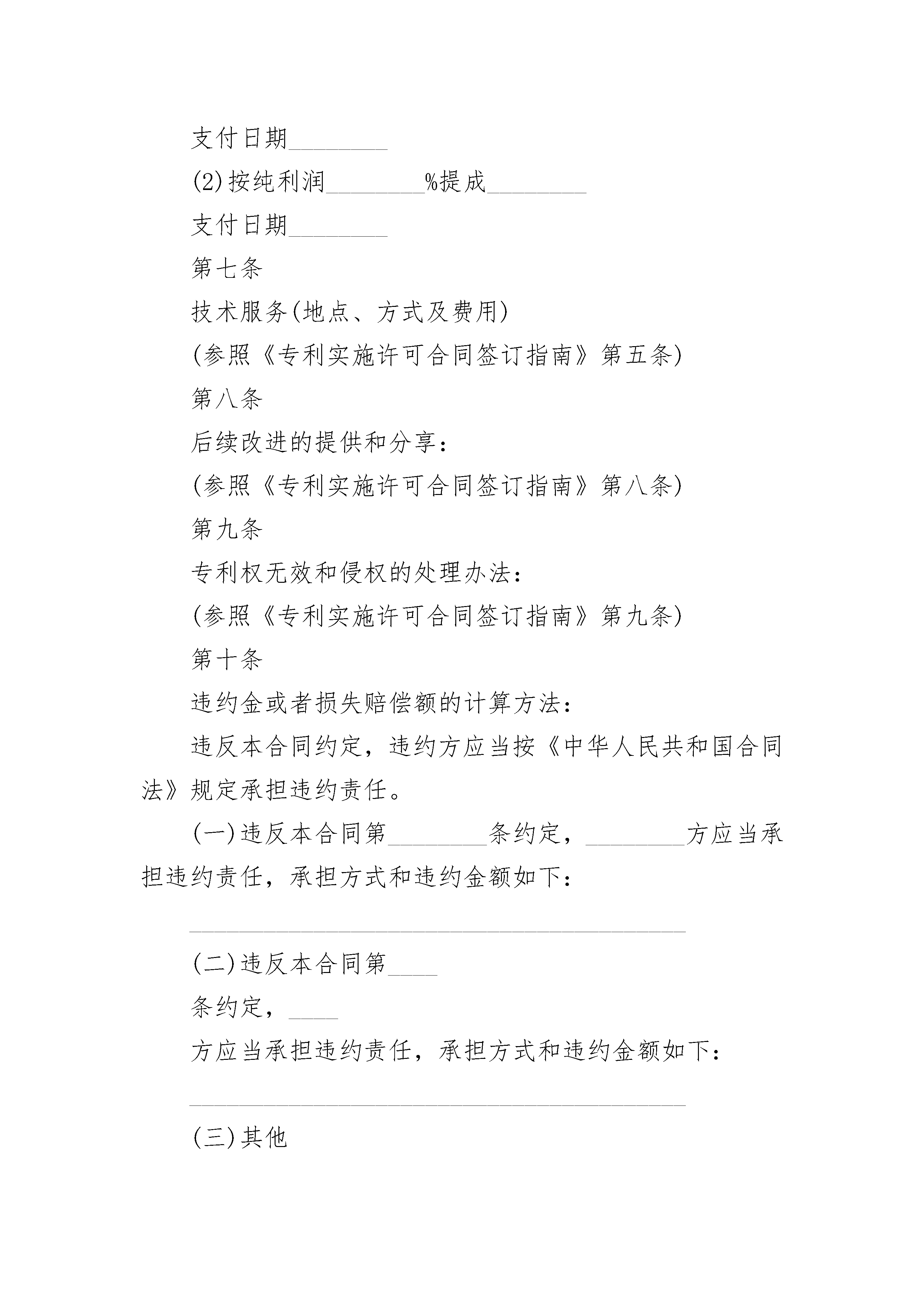 专利实施许可合同范本专利实施许可合同范本(通用13篇)专利实施许可合同范本篇1项目名称:____________________许可方(甲方):____________________法定代表人:____________职务:____________地址:____________邮码:____________电话:____________被许可方(乙方):____________________法定代表人:____________职务:____________地址:____________邮码:____________电话:____________填写说明一、“合同登记编号”的填写方式:合同登记编号为14位,左起第一、二位为公历年代号,第三、四位为省、自治区、直辖市编码,第五、六位为地、市编码,第七、八位为合同登记点编号,第九至十四位为合同登记序号,以上编号不足位的补零,各区域编码按GB2260-84规定填写。二、计划内项目应填写国务院部委、省、自治区、直辖市、计划单列市、地市(县)级计划,不属于上述计划的项目此栏划(/)表示。三、专利技术内容是指专利说明书和权项保护范围中所涉及的全部技术内容。四、技术秘密的范围是指各方承担技术保密的义务的内容,保密的地域范围和保密的起止时间,泄漏技术秘密应承担的责任。五、其他:合同如果是通过中介机构介绍签订的,应将中介合同作为本合同的附件。如果双方当事人约定入门费、财产抵押及担保的,应将给付定金、财产抵押及担保手续的复印件作为合同的附件。六、委托代理人签订本合同书时,应出具委托书。七、本合同书中,凡是当事人约定无需填写的条款,在该条款填写的空白处划(/)表示。八、填写时请参照《专利实施许可合同签订指南》的对应条款。(“签订指南”由中国专利局编制)依据《中华人民共和国合同法》和《中华人民共和国专利法》的规定,合同中的甲方就________专利项目(申请日________、申请号:________、授权日〈公开日、公告日〉________、专利法定有效期限:________),许可乙方实施。(该项目属________计划,本发明属于:职务发明(非职务发明))经协商一致,签订本合同。第一条专利技术内容(包括实施该专利有关的一般技术秘密),要求和工业化开发程序:________________________第二条技术资料及其提交期限、地点和方式:________________甲方自合同生效之日起________天内在________(地点)以____________________________方式,向乙方提供下列资料:第三条项目技术秘密的范围和保密期限:__________________________________________________________________________________第四条专利实施许可的种类:第五条验收标准和方法:乙方使用该项技术,试生产后达到了本合同规定的技术性能指标(______)。采取______________方法验收,由双方签署合同技术验收合格协议书。如产品验收不合格时双方协商各派代表调查原因并确定双方的责任。第六条使用费及支付方法:(一)一次支付方式总金额____________________元____年____月____日(1)一次性支付:____________元____年____月____日(2)分期支付:____________元____年____月____日___________________元____年____月____日(二)入门费加提成费方式入门费________元____________支付日期________(1)按销售额________%提成________支付日期________(2)按纯利润________%提成________支付日期________第七条技术服务(地点、方式及费用)(参照《专利实施许可合同签订指南》第五条)第八条后续改进的提供和分享:(参照《专利实施许可合同签订指南》第八条)第九条专利权无效和侵权的处理办法:(参照《专利实施许可合同签订指南》第九条)第十条违约金或者损失赔偿额的计算方法:违反本合同约定,违约方应当按《中华人民共和国合同法》规定承担违约责任。(一)违反本合同第________条约定,________方应当承担违约责任,承担方式和违约金额如下:________________________________________(二)违反本合同第____条约定,____方应当承担违约责任,承担方式和违约金额如下:________________________________________(三)其他第十一条合同的变更和终止:第十二条争议的解决办法:在合同履行过程中发生争议