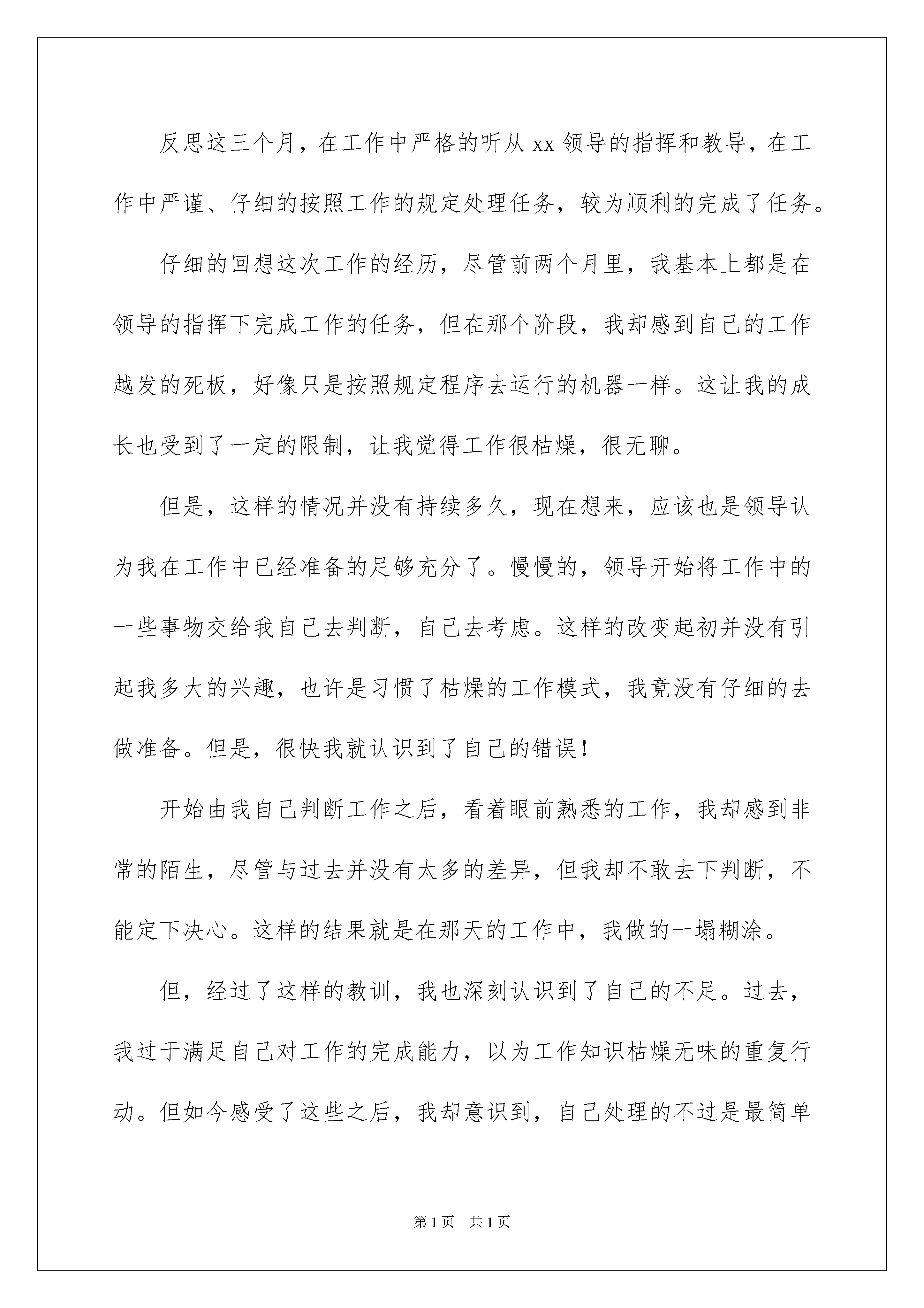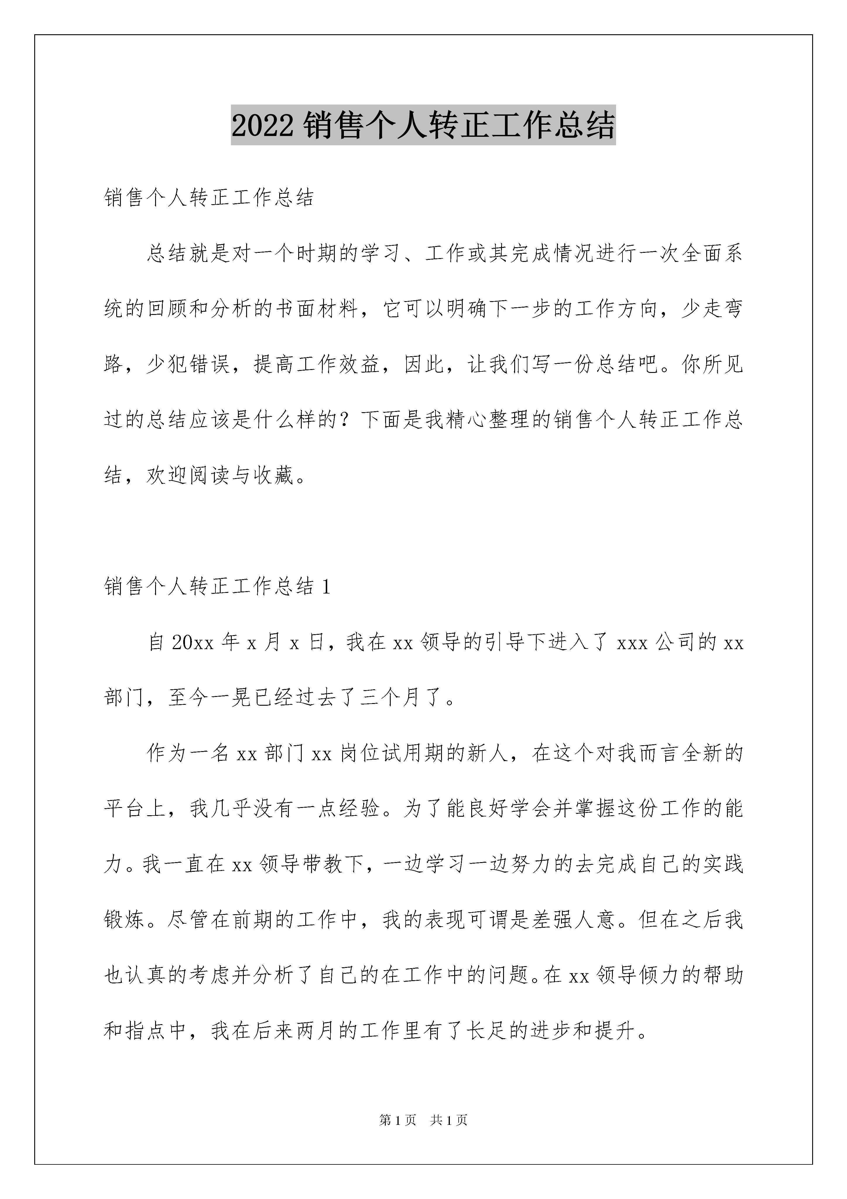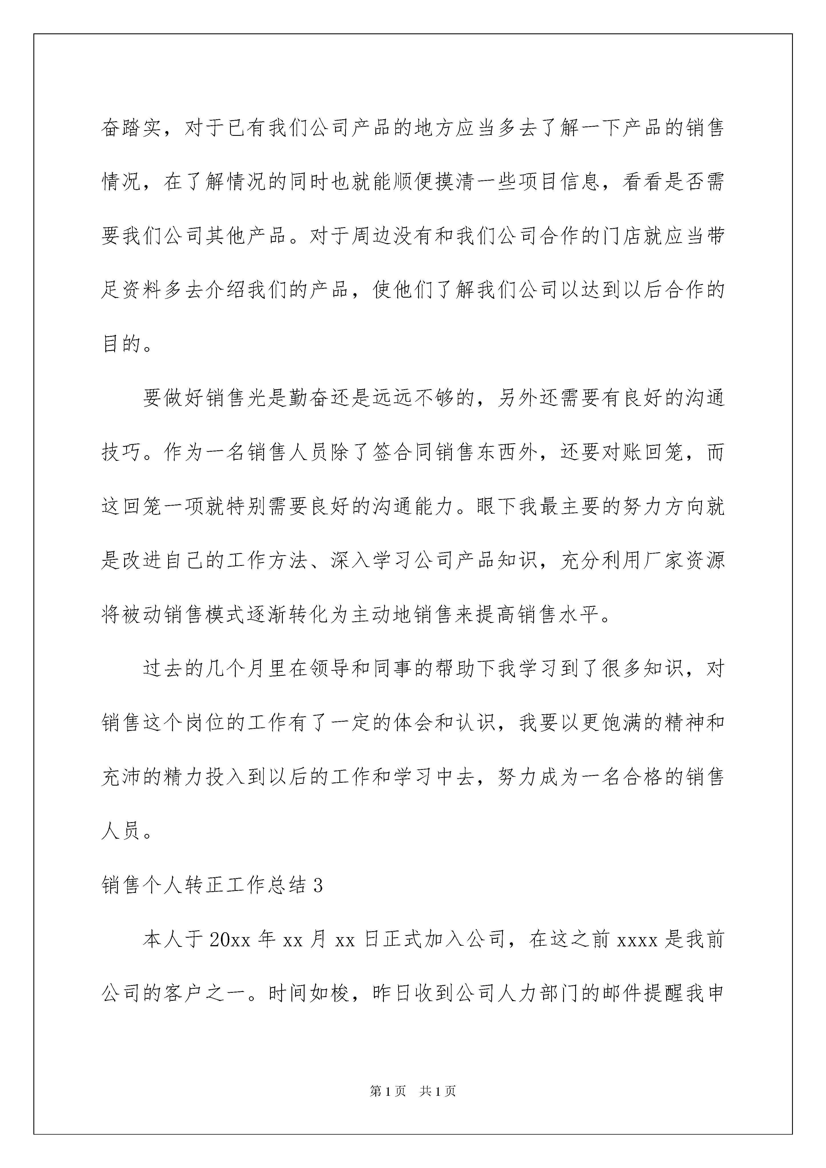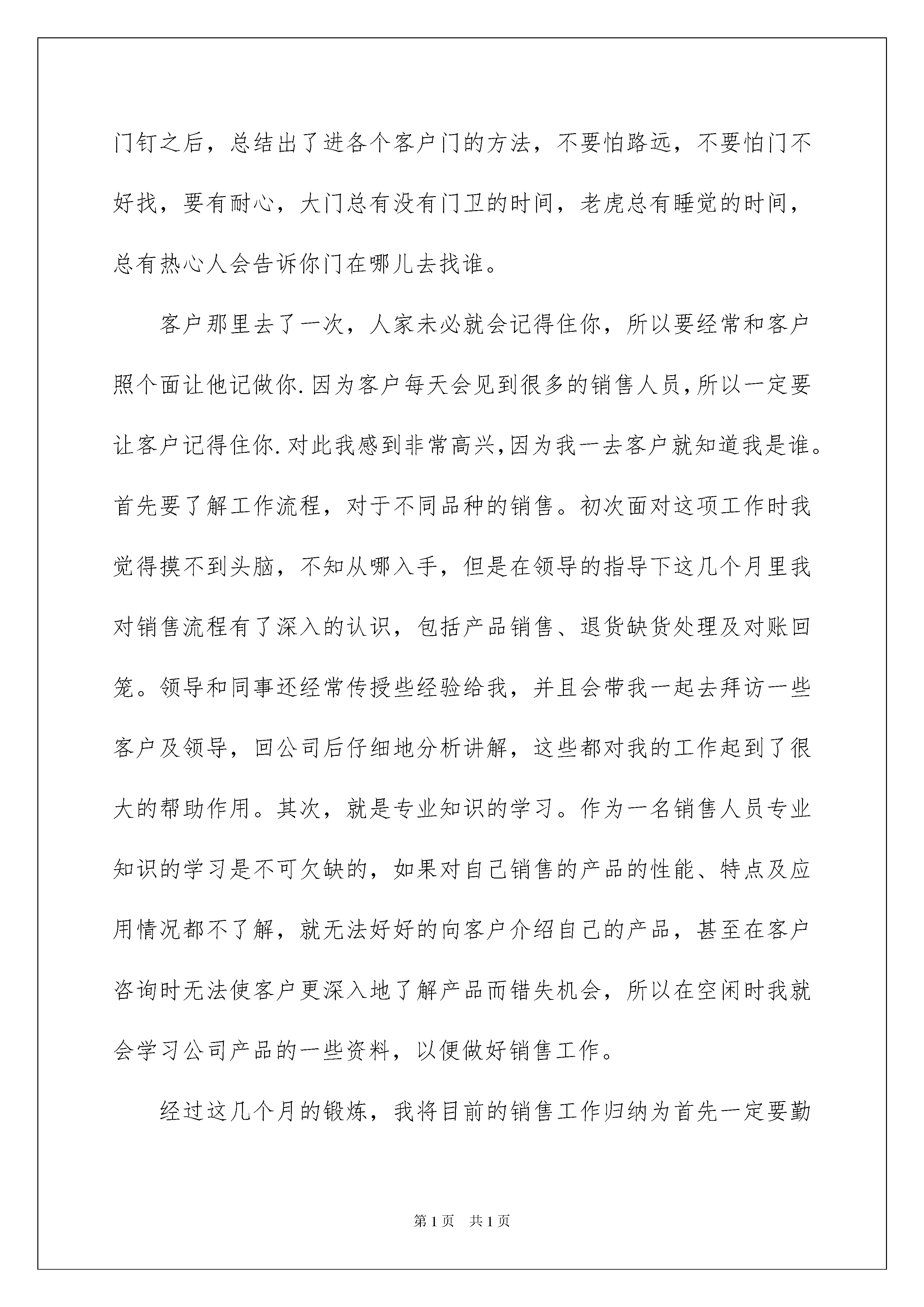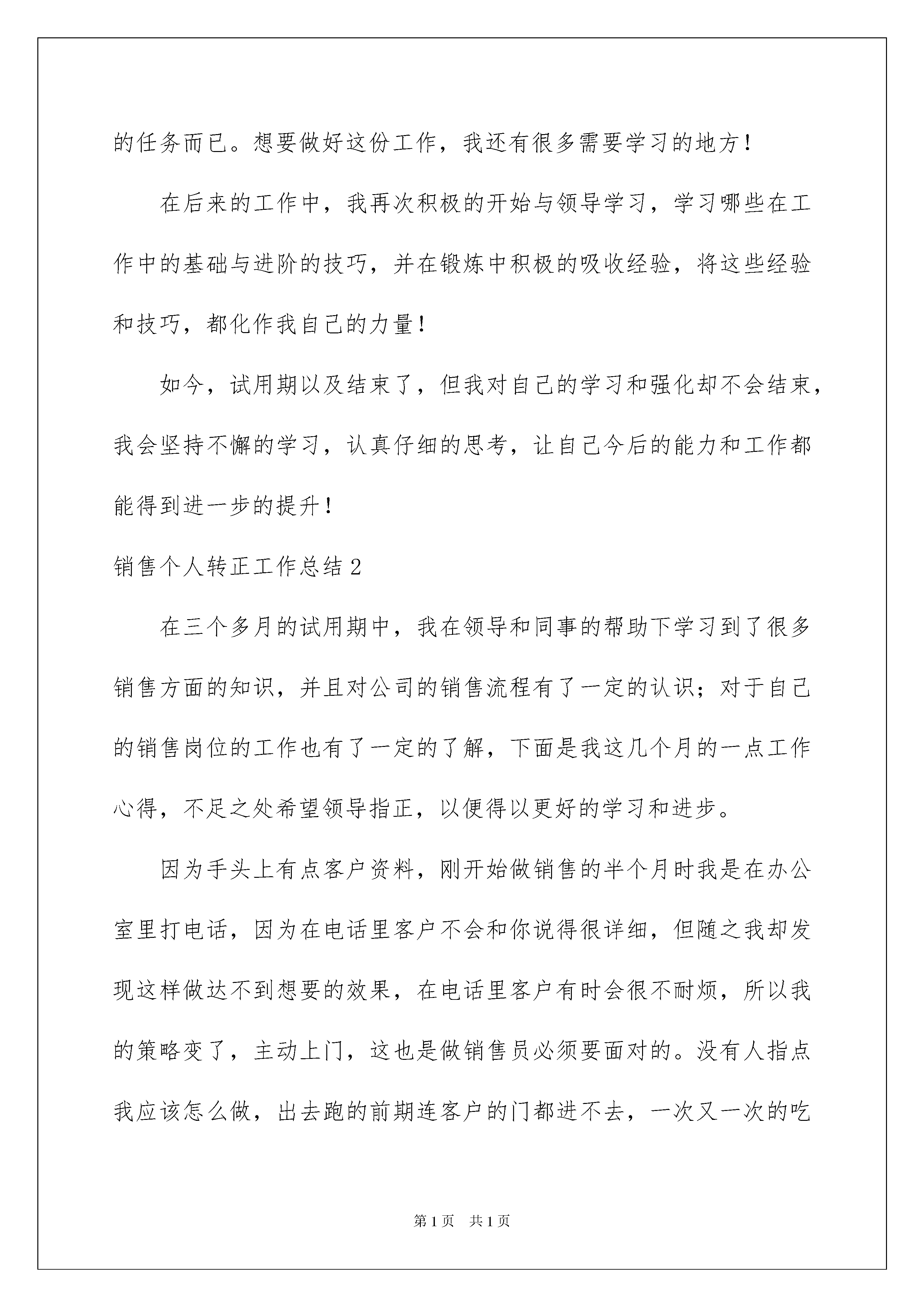 2022销售个人转正工作总结销售个人转正工作总结总结就是对一个时期的学习、工作或其完成情况进行一次全面系统的回顾和分析的书面材料,它可以明确下一步的工作方向,少走弯路,少犯错误,提高工作效益,因此,让我们写一份总结吧。你所见过的总结应该是什么样的?下面是我精心整理的销售个人转正工作总结,欢迎阅读与收藏。销售个人转正工作总结1自20xx年x月x日,我在xx领导的引导下进入了xxx公司的xx部门,至今一晃已经过去了三个月了。作为一名xx部门xx岗位试用期的新人,在这个对我而言全新的平台上,我几乎没有一点经验。为了能良好学会并掌握这份工作的能力。我一直在xx领导带教下,一边学习一边努力的去完成自己的实践锻炼。尽管在前期的工作中,我的表现可谓是差强人意。但在之后我也认真的考虑并分析了自己的在工作中的问题。在xx领导倾力的帮助和指点中,我在后来两月的工作里有了长足的进步和提升。反思这三个月,在工作中严格的听从xx领导的指挥和教导,在工作中严谨、仔细的按照工作的规定处理任务,较为顺利的完成了任务。仔细的回想这次工作的经历,尽管前两个月里,我基本上都是在领导的指挥下完成工作的任务,但在那个阶段,我却感到自己的工作越发的死板,好像只是按照规定程序去运行的机器一样。这让我的成长也受到了一定的限制,让我觉得工作很枯燥,很无聊。但是,这样的情况并没有持续多久,现在想来,应该也是领导认为我在工作中已经准备的足够充分了。慢慢的,领导开始将工作中的一些事物交给我自己去判断,自己去考虑。这样的改变起初并没有引起我多大的兴趣,也许是习惯了枯燥的工作模式,我竟没有仔细的去做准备。但是,很快我就认识到了自己的错误!开始由我自己判断工作之后,看着眼前熟悉的工作,我却感到非常的陌生,尽管与过去并没有太多的差异,但我却不敢去下判断,不能定下决心。这样的结果就是在那天的工作中,我做的一塌糊涂。但,经过了这样的教训,我也深刻认识到了自己的不足。过去,我过于满足自己对工作的完成能力,以为工作知识枯燥无味的重复行动。但如今感受了这些之后,我却意识到,自己处理的不过是最简单的任务而已。想要做好这份工作,我还有很多需要学习的地方!在后来的工作中,我再次积极的开始与领导学习,学习哪些在工作中的基础与进阶的技巧,并在锻炼中积极的吸收经验,将这些经验和技巧,都化作我自己的力量!如今,试用期以及结束了,但我对自己的学习和强化却不会结束,我会坚持不懈的学习,认真仔细的思考,让自己今后的能力和工作都能得到进一步的提升!销售个人转正工作总结2在三个多月的试用期中,我在领导和同事的帮助下学习到了很多销售方面的知识,并且对公司的销售流程有了一定的认识;对于自己的销售岗位的工作也有了一定的了解,下面是我这几个月的一点工作心得,不足之处希望领导指正,以便得以更好的学习和进步。因为手头上有点客户资料,刚开始做销售的半个月时我是在办公室里打电话,因为在电话里客户不会和你说得很详细,但随之我却发现这样做达不到想要的效果,在电话里客户有时会很不耐烦,所以我的策略变了,主动上门,这也是做销售员必须要面对的。没有人指点我应该怎么做,出去跑的前期连客户的门都进不去,一次又一次的吃门钉之后,总结出了进各个客户门的方法,不要怕路远,不要怕门不好找,要有耐心,大门总有没有门卫的时间,老虎总有睡觉的时间,总有热心人会告诉你门在哪儿去找谁。客户那里去了一次,人家未必就会记得住你,所以要经常和客户照个面让他记做你.因为客户每天会见到很多的销售人员,所以一定要让客户记得住你.对此我感到非常高兴,因为我一去客户就知道我是谁。首先要了解工作流程,对于不同品种的销售。初次面对这项工作时我觉得摸不到头脑,不知从哪入手,但是在领导的指导下这几个月里我对销售流程有了深入的认识,包括产品销售、退货缺货处理及对账回笼。领导和同事还经常传授些经验给我,并且会带我一起去拜访一些客户及领导,回公司后仔细地分析讲解,这些都对我的工作起到了很大的帮助作用。其次,就是专业知识的学习。作为一名销售人员专业知识的学习是不可欠缺的,如果对自己销售的产品的性能、特点及应用情况都不了解,就无法好好的向客户介绍自己的产品,甚至在客户咨询时无法使客户更深入地了解产品而错失机会,所以在空闲时我就会学习公司产品的一些资料,以便做好销售工作。经过这几个月的锻炼,我将目前的销售工作归纳为首先一定要勤奋踏实,对于已有我们公司产品的地方应当多去了解一下产品的销售情况,在了解情况的同时也就能顺便摸清一些项目信息,看看是否需要我们公司其他产品。对于周边没有和我们公司合作的门店就应当带足资料多去介绍我们的产品,使他们了解我们公司以达
