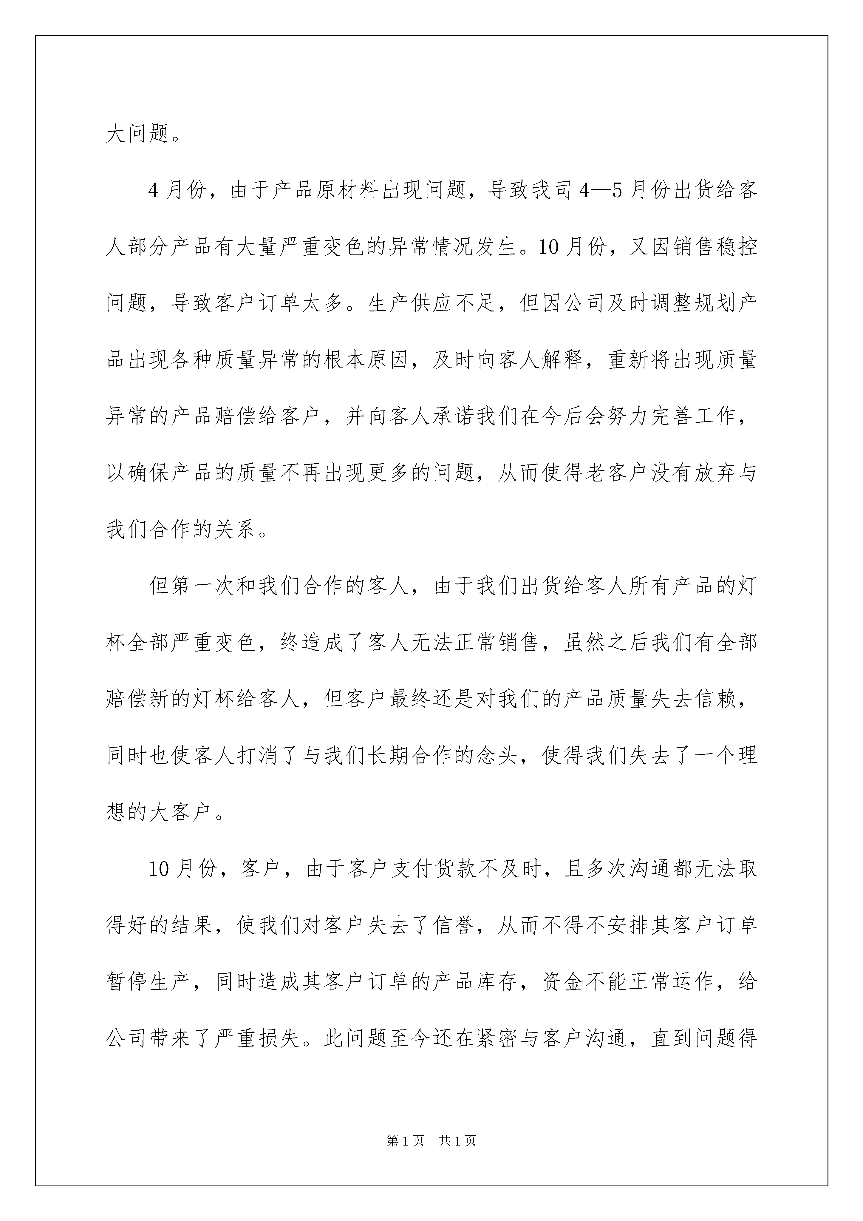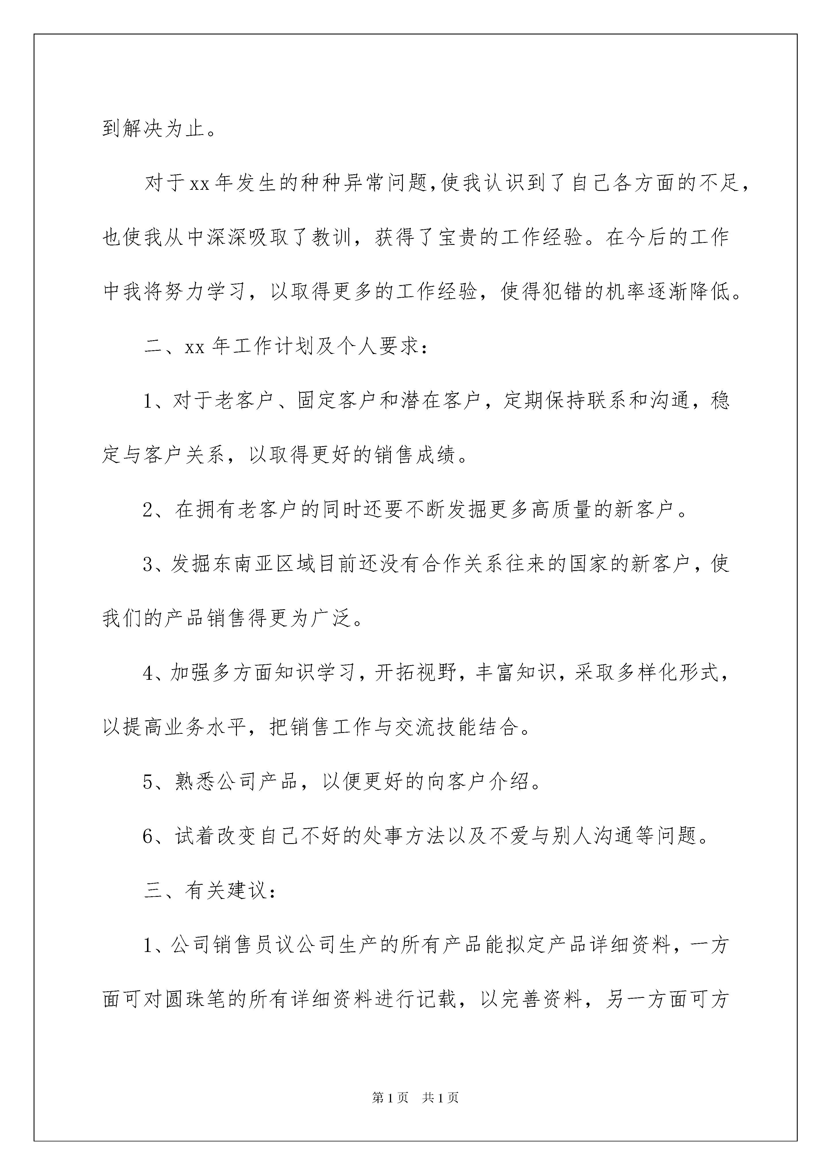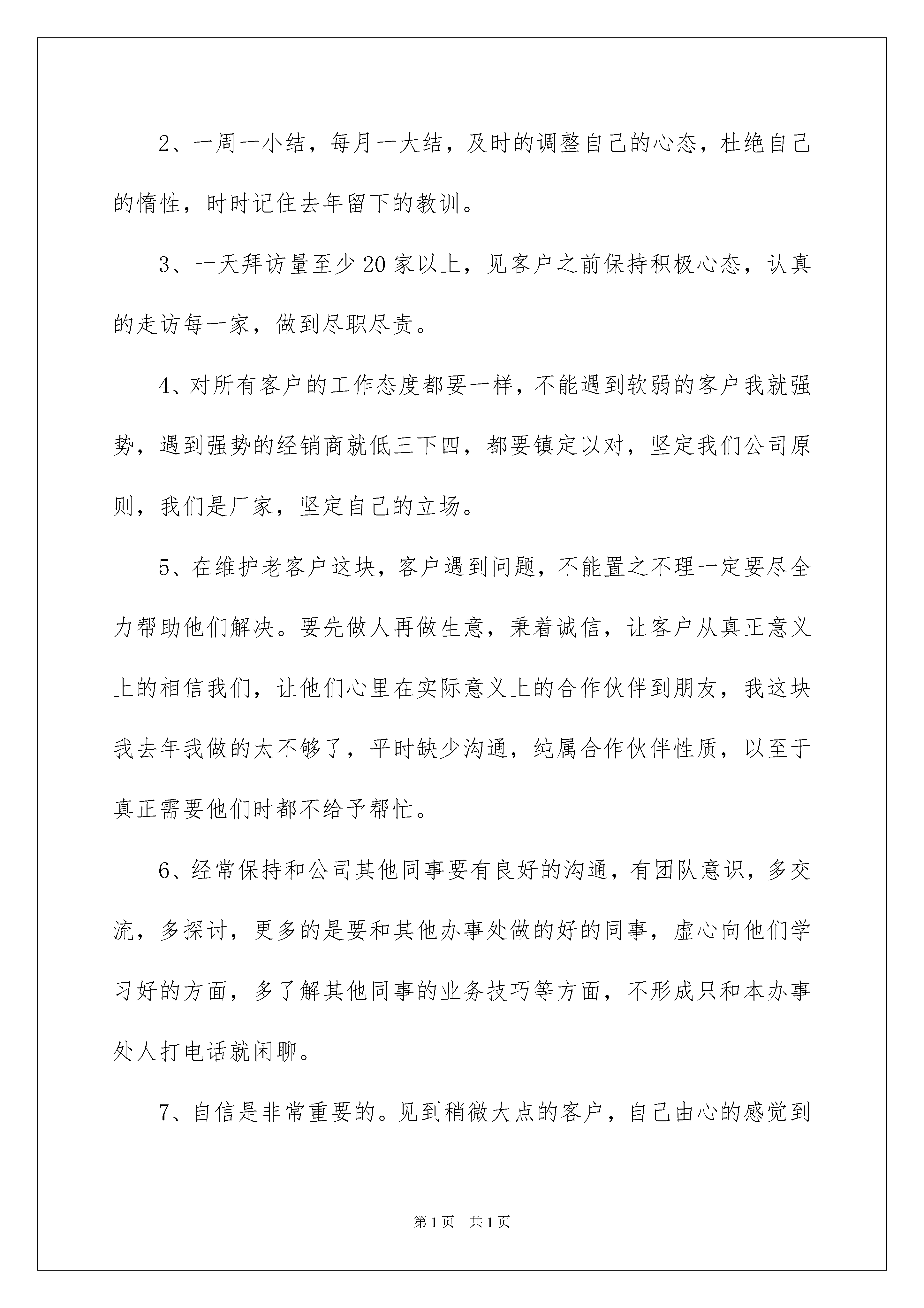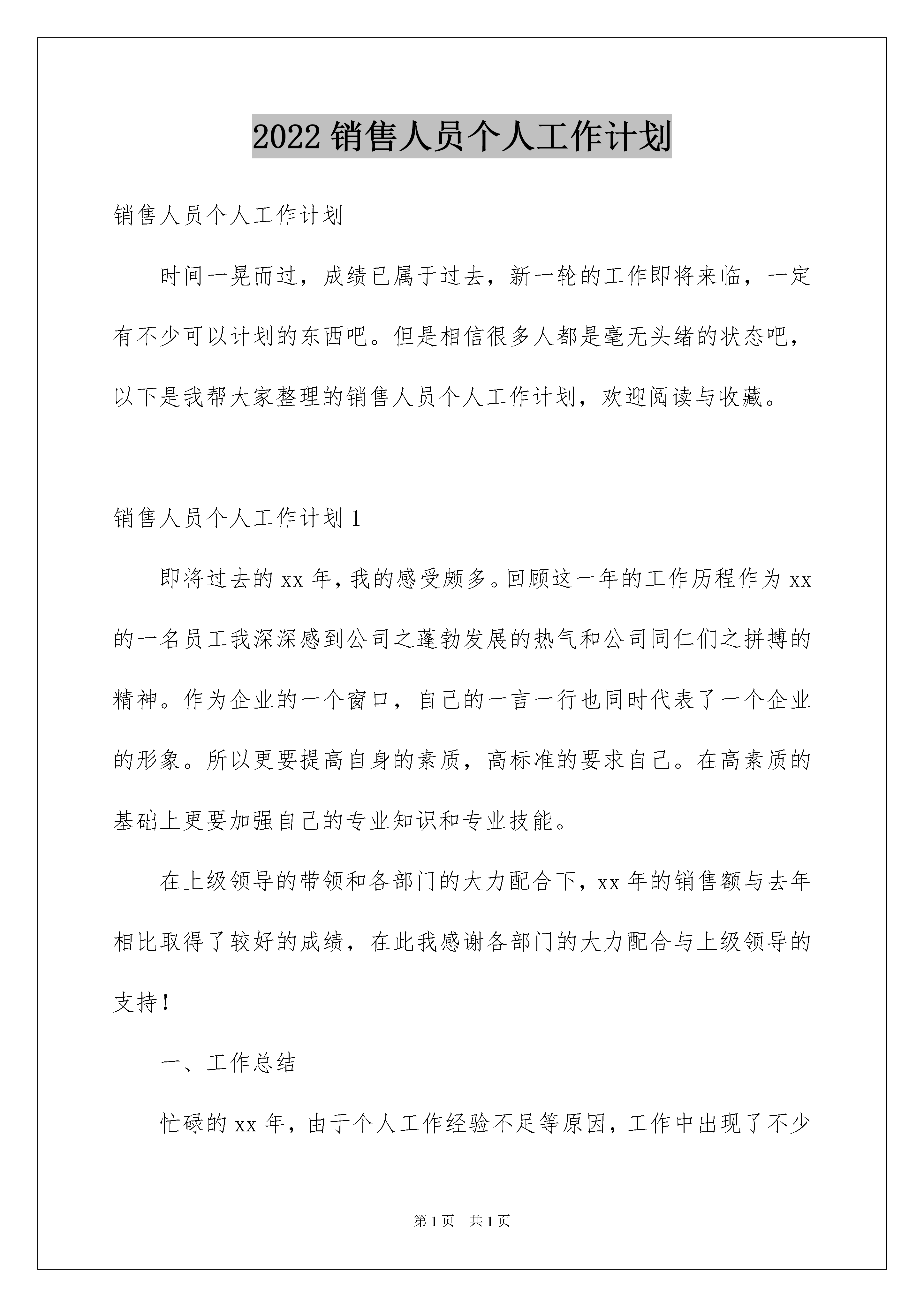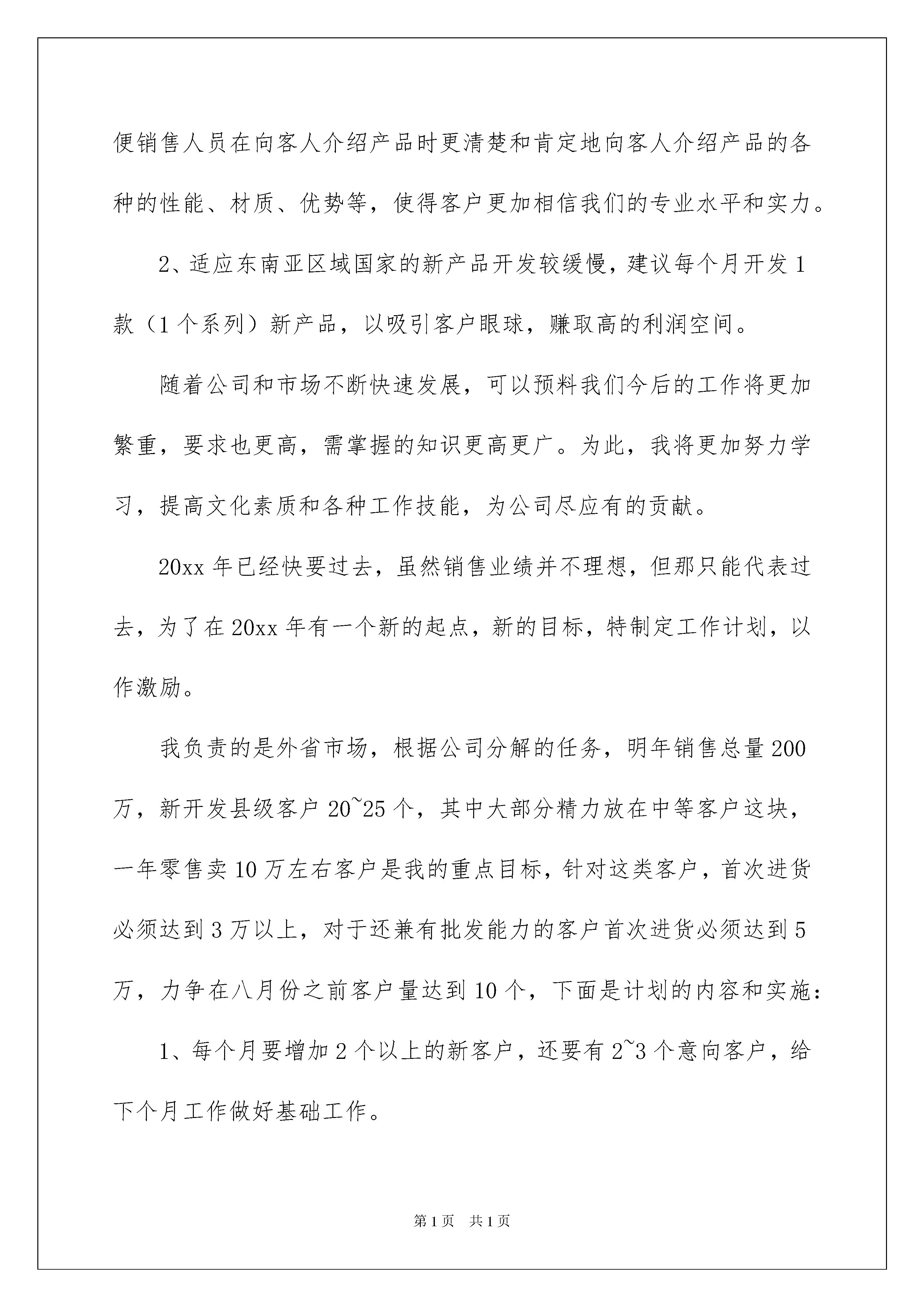 2022销售人员个人工作计划销售人员个人工作计划时间一晃而过,成绩已属于过去,新一轮的工作即将来临,一定有不少可以计划的东西吧。但是相信很多人都是毫无头绪的状态吧,以下是我帮大家整理的销售人员个人工作计划,欢迎阅读与收藏。销售人员个人工作计划1即将过去的xx年,我的感受颇多。回顾这一年的工作历程作为xx的一名员工我深深感到公司之蓬勃发展的热气和公司同仁们之拼搏的精神。作为企业的一个窗口,自己的一言一行也同时代表了一个企业的形象。所以更要提高自身的素质,高标准的要求自己。在高素质的基础上更要加强自己的专业知识和专业技能。在上级领导的带领和各部门的大力配合下,xx年的销售额与去年相比取得了较好的成绩,在此我感谢各部门的大力配合与上级领导的支持!一、工作总结忙碌的xx年,由于个人工作经验不足等原因,工作中出现了不少大问题。4月份,由于产品原材料出现问题,导致我司4—5月份出货给客人部分产品有大量严重变色的异常情况发生。10月份,又因销售稳控问题,导致客户订单太多。生产供应不足,但因公司及时调整规划产品出现各种质量异常的根本原因,及时向客人解释,重新将出现质量异常的产品赔偿给客户,并向客人承诺我们在今后会努力完善工作,以确保产品的质量不再出现更多的问题,从而使得老客户没有放弃与我们合作的关系。但第一次和我们合作的客人,由于我们出货给客人所有产品的灯杯全部严重变色,终造成了客人无法正常销售,虽然之后我们有全部赔偿新的灯杯给客人,但客户最终还是对我们的产品质量失去信赖,同时也使客人打消了与我们长期合作的念头,使得我们失去了一个理想的大客户。10月份,客户,由于客户支付货款不及时,且多次沟通都无法取得好的结果,使我们对客户失去了信誉,从而不得不安排其客户订单暂停生产,同时造成其客户订单的产品库存,资金不能正常运作,给公司带来了严重损失。此问题至今还在紧密与客户沟通,直到问题得到解决为止。对于xx年发生的种种异常问题,使我认识到了自己各方面的不足,也使我从中深深吸取了教训,获得了宝贵的工作经验。在今后的工作中我将努力学习,以取得更多的工作经验,使得犯错的机率逐渐降低。二、xx年工作计划及个人要求:1、对于老客户、固定客户和潜在客户,定期保持联系和沟通,稳定与客户关系,以取得更好的销售成绩。2、在拥有老客户的同时还要不断发掘更多高质量的新客户。3、发掘东南亚区域目前还没有合作关系往来的国家的新客户,使我们的产品销售得更为广泛。4、加强多方面知识学习,开拓视野,丰富知识,采取多样化形式,以提高业务水平,把销售工作与交流技能结合。5、熟悉公司产品,以便更好的向客户介绍。6、试着改变自己不好的处事方法以及不爱与别人沟通等问题。三、有关建议:1、公司销售员议公司生产的所有产品能拟定产品详细资料,一方面可对圆珠笔的所有详细资料进行记载,以完善资料,另一方面可方便销售人员在向客人介绍产品时更清楚和肯定地向客人介绍产品的各种的性能、材质、优势等,使得客户更加相信我们的专业水平和实力。2、适应东南亚区域国家的新产品开发较缓慢,建议每个月开发1款(1个系列)新产品,以吸引客户眼球,赚取高的利润空间。随着公司和市场不断快速发展,可以预料我们今后的工作将更加繁重,要求也更高,需掌握的知识更高更广。为此,我将更加努力学习,提高文化素质和各种工作技能,为公司尽应有的贡献。20xx年已经快要过去,虽然销售业绩并不理想,但那只能代表过去,为了在20xx年有一个新的起点,新的目标,特制定工作计划,以作激励。我负责的是外省市场,根据公司分解的任务,明年销售总量200万,新开发县级客户20~25个,其中大部分精力放在中等客户这块,一年零售卖10万左右客户是我的重点目标,针对这类客户,首次进货必须达到3万以上,对于还兼有批发能力的客户首次进货必须达到5万,力争在八月份之前客户量达到10个,下面是计划的内容和实施:1、每个月要增加2个以上的新客户,还要有2~3个意向客户,给下个月工作做好基础工作。2、一周一小结,每月一大结,及时的调整自己的心态,杜绝自己的惰性,时时记住去年留下的教训。3、一天拜访量至少20家以上,见客户之前保持积极心态,认真的走访每一家,做到尽职尽责。4、对所有客户的工作态度都要一样,不能遇到软弱的客户我就强势,遇到强势的经销商就低三下四,都要镇定以对,坚定我们公司原则,我们是厂家,坚定自己的立场。5、在维护老客户这块,客户遇到问题,不能置之不理一定要尽全力帮助他们解决。要先做人再做生意,秉着诚信,让客户从真正意义上的相信我们,让他们心里在实际意义上的合作伙伴到朋友,我这块我去年我做的太不够了,平时缺少沟通,纯