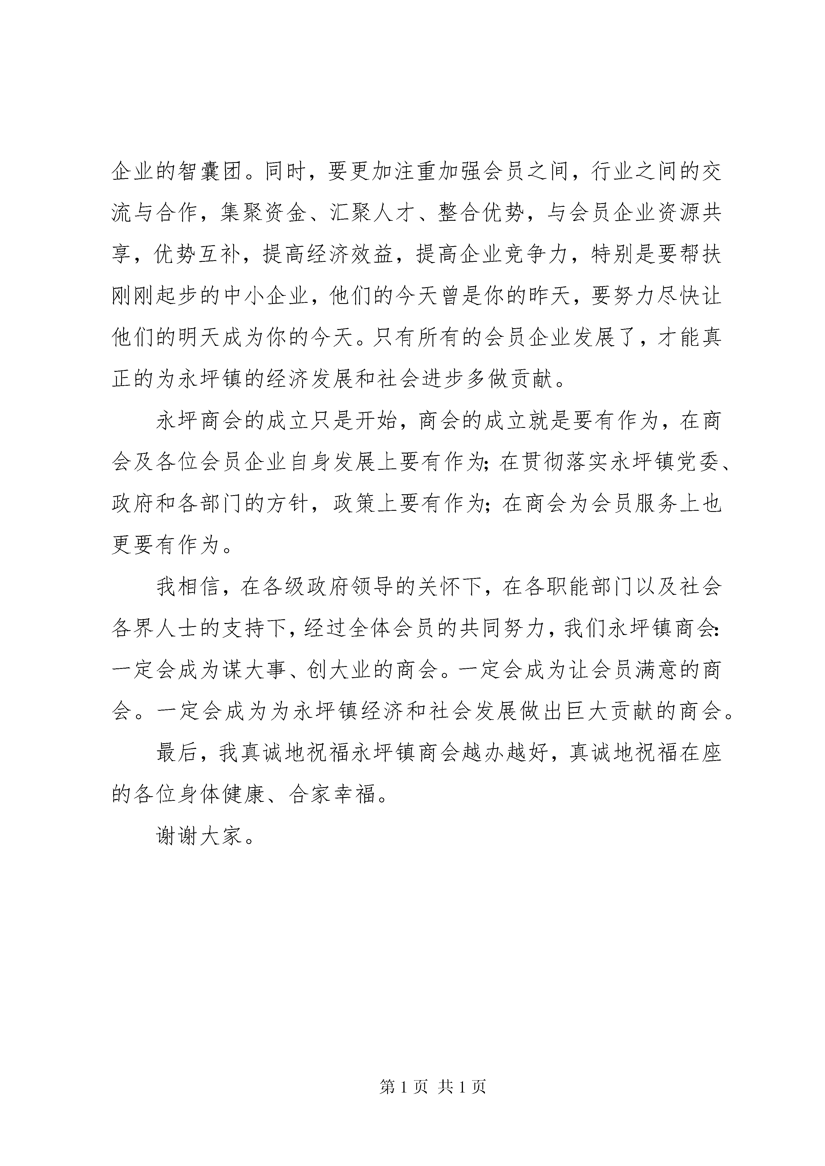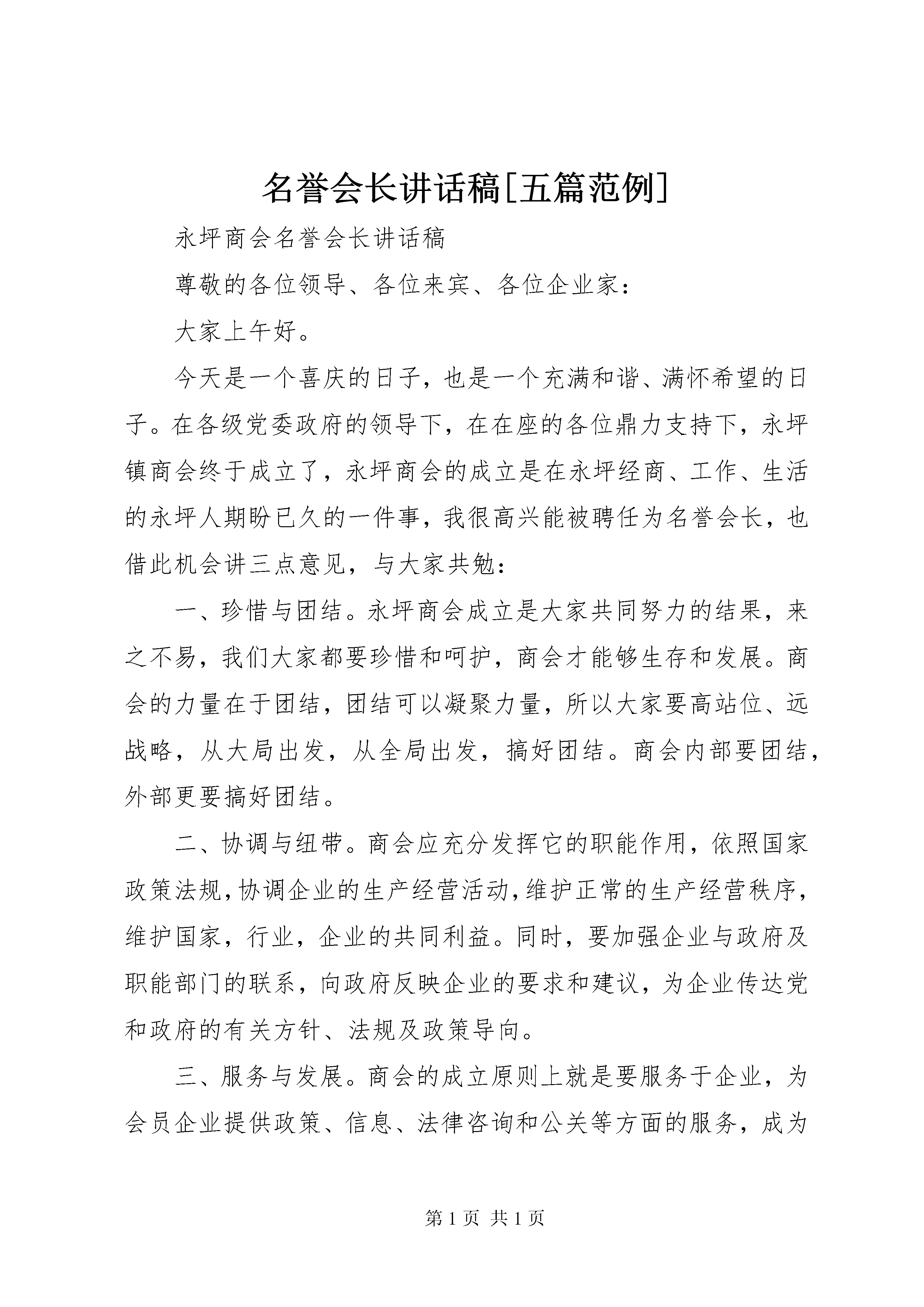 名誉会长讲话稿[五篇范例]永坪商会名誉会长讲话稿尊敬的各位领导、各位来宾、各位企业家:大家上午好。今天是一个喜庆的日子,也是一个充满和谐、满怀希望的日子。在各级党委政府的领导下,在在座的各位鼎力支持下,永坪镇商会终于成立了,永坪商会的成立是在永坪经商、工作、生活的永坪人期盼已久的一件事,我很高兴能被聘任为名誉会长,也借此机会讲三点意见,与大家共勉:一、珍惜与团结。永坪商会成立是大家共同努力的结果,来之不易,我们大家都要珍惜和呵护,商会才能够生存和发展。商会的力量在于团结,团结可以凝聚力量,所以大家要高站位、远战略,从大局出发,从全局出发,搞好团结。商会内部要团结,外部更要搞好团结。二、协调与纽带。商会应充分发挥它的职能作用,依照国家政策法规,协调企业的生产经营活动,维护正常的生产经营秩序,维护国家,行业,企业的共同利益。同时,要加强企业与政府及职能部门的联系,向政府反映企业的要求和建议,为企业传达党和政府的有关方针、法规及政策导向。三、服务与发展。商会的成立原则上就是要服务于企业,为会员企业提供政策、信息、法律咨询和公关等方面的服务,成为企业的智囊团。同时,要更加注重加强会员之间,行业之间的交流与合作,集聚资金、汇聚人才、整合优势,与会员企业资源共享,优势互补,提高经济效益,提高企业竞争力,特别是要帮扶刚刚起步的中小企业,他们的今天曾是你的昨天,要努力尽快让他们的明天成为你的今天。只有所有的会员企业发展了,才能真正的为永坪镇的经济发展和社会进步多做贡献。永坪商会的成立只是开始,商会的成立就是要有作为,在商会及各位会员企业自身发展上要有作为;在贯彻落实永坪镇党委、政府和各部门的方针,政策上要有作为;在商会为会员服务上也更要有作为。我相信,在各级政府领导的关怀下,在各职能部门以及社会各界人士的支持下,经过全体会员的共同努力,我们永坪镇商会:一定会成为谋大事、创大业的商会。一定会成为让会员满意的商会。一定会成为为永坪镇经济和社会发展做出巨大贡献的商会。最后,我真诚地祝福永坪镇商会越办越好,真诚地祝福在座的各位身体健康、合家幸福。谢谢大家。