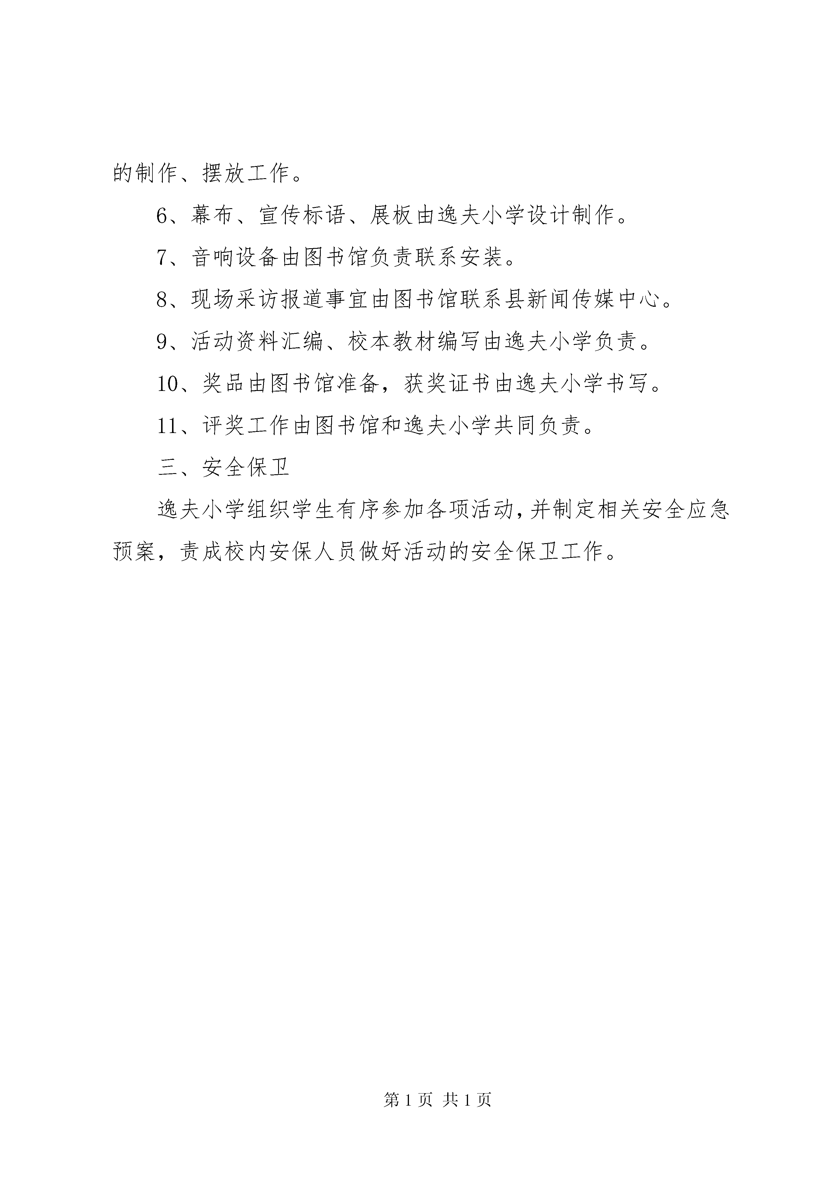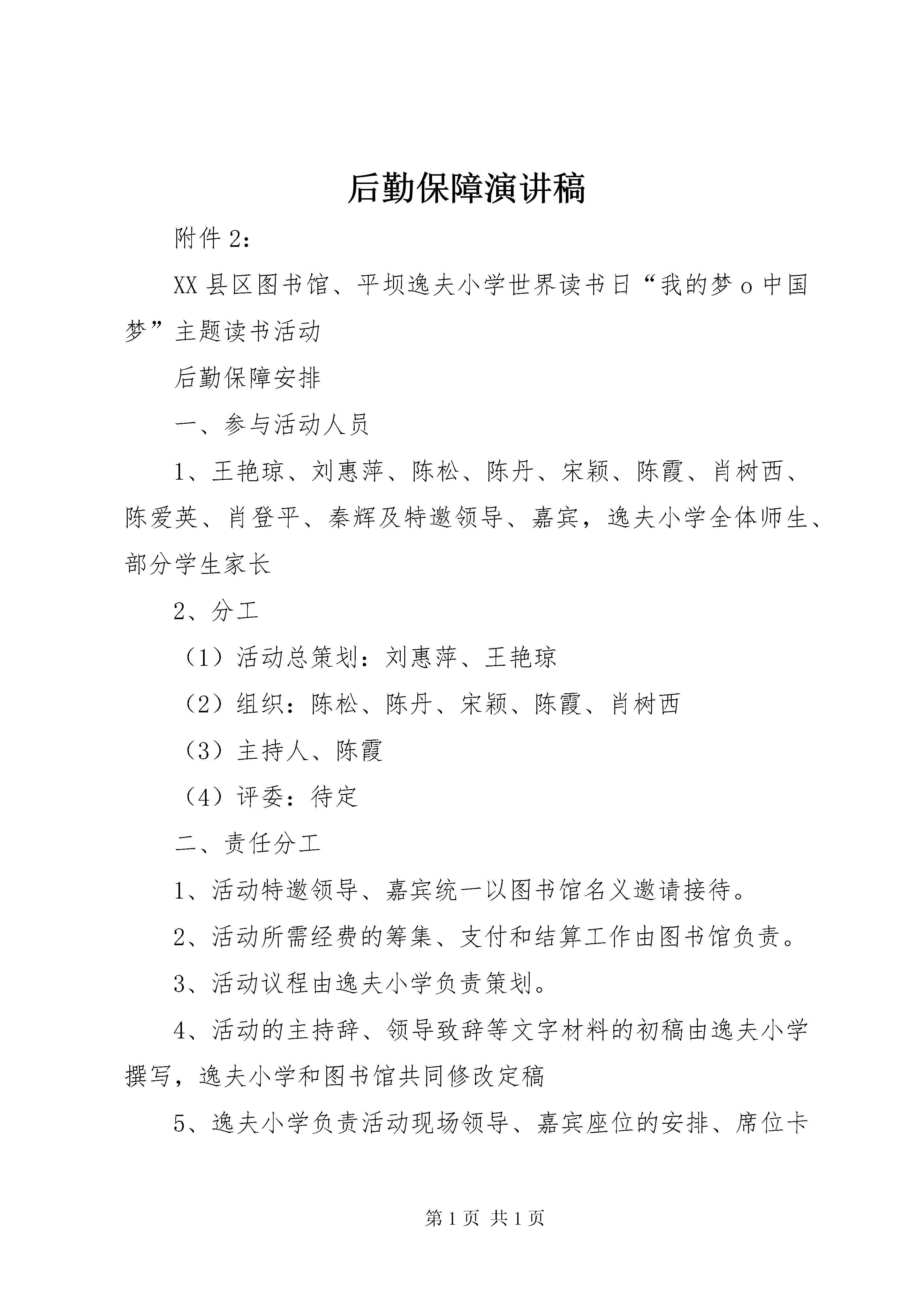 后勤保障演讲稿附件2:XX县区图书馆、平坝逸夫小学世界读书日“我的梦o中国梦”主题读书活动后勤保障安排一、参与活动人员1、王艳琼、刘惠萍、陈松、陈丹、宋颖、陈霞、肖树西、陈爱英、肖登平、秦辉及特邀领导、嘉宾,逸夫小学全体师生、部分学生家长2、分工(1)活动总策划:刘惠萍、王艳琼(2)组织:陈松、陈丹、宋颖、陈霞、肖树西(3)主持人、陈霞(4)评委:待定二、责任分工1、活动特邀领导、嘉宾统一以图书馆名义邀请接待。2、活动所需经费的筹集、支付和结算工作由图书馆负责。3、活动议程由逸夫小学负责策划。4、活动的主持辞、领导致辞等文字材料的初稿由逸夫小学撰写,逸夫小学和图书馆共同修改定稿5、逸夫小学负责活动现场领导、嘉宾座位的安排、席位卡的制作、摆放工作。6、幕布、宣传标语、展板由逸夫小学设计制作。7、音响设备由图书馆负责联系安装。8、现场采访报道事宜由图书馆联系县新闻传媒中心。9、活动资料汇编、校本教材编写由逸夫小学负责。10、奖品由图书馆准备,获奖证书由逸夫小学书写。11、评奖工作由图书馆和逸夫小学共同负责。三、安全保卫逸夫小学组织学生有序参加各项活动,并制定相关安全应急预案,责成校内安保人员做好活动的安全保卫工作。