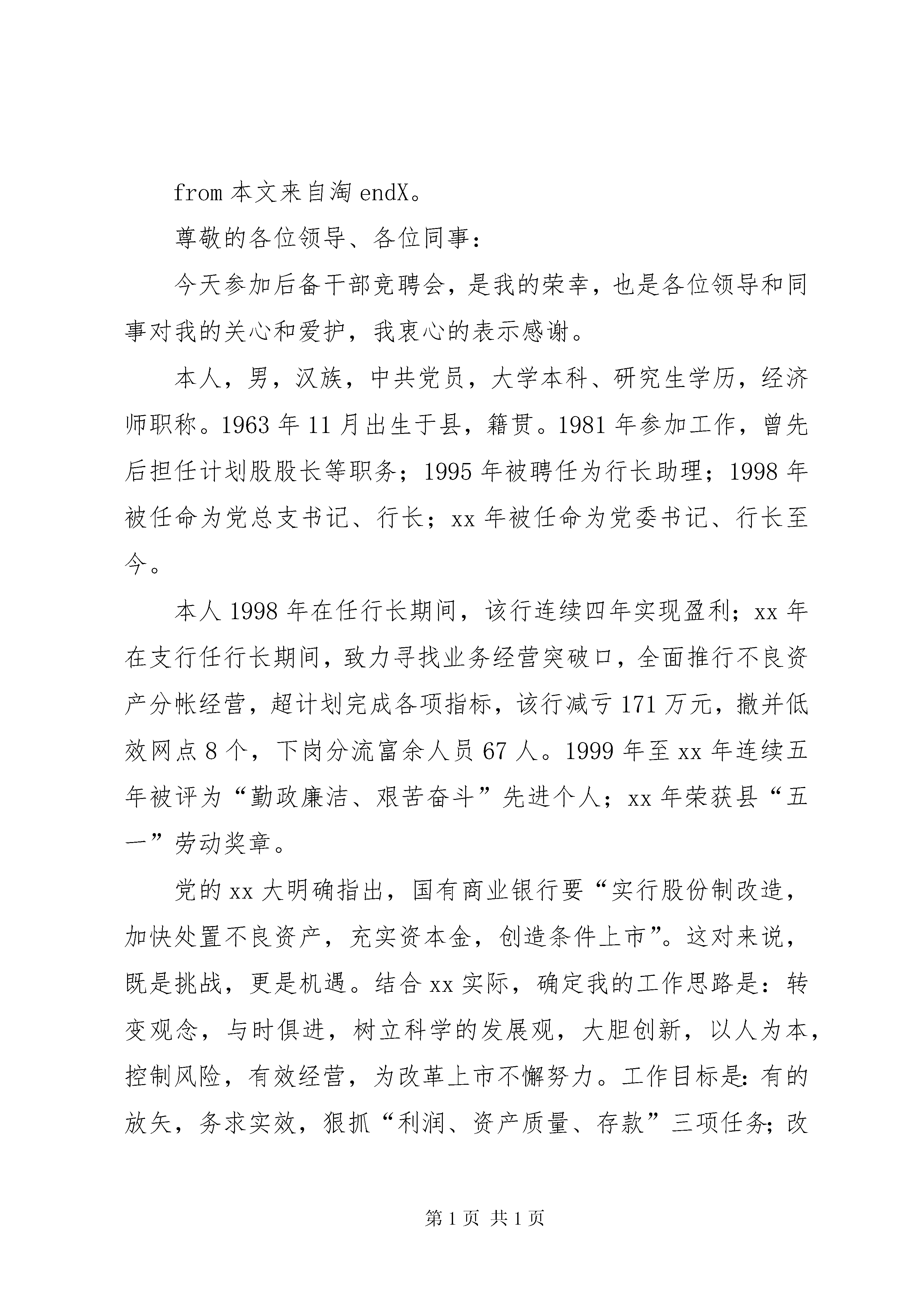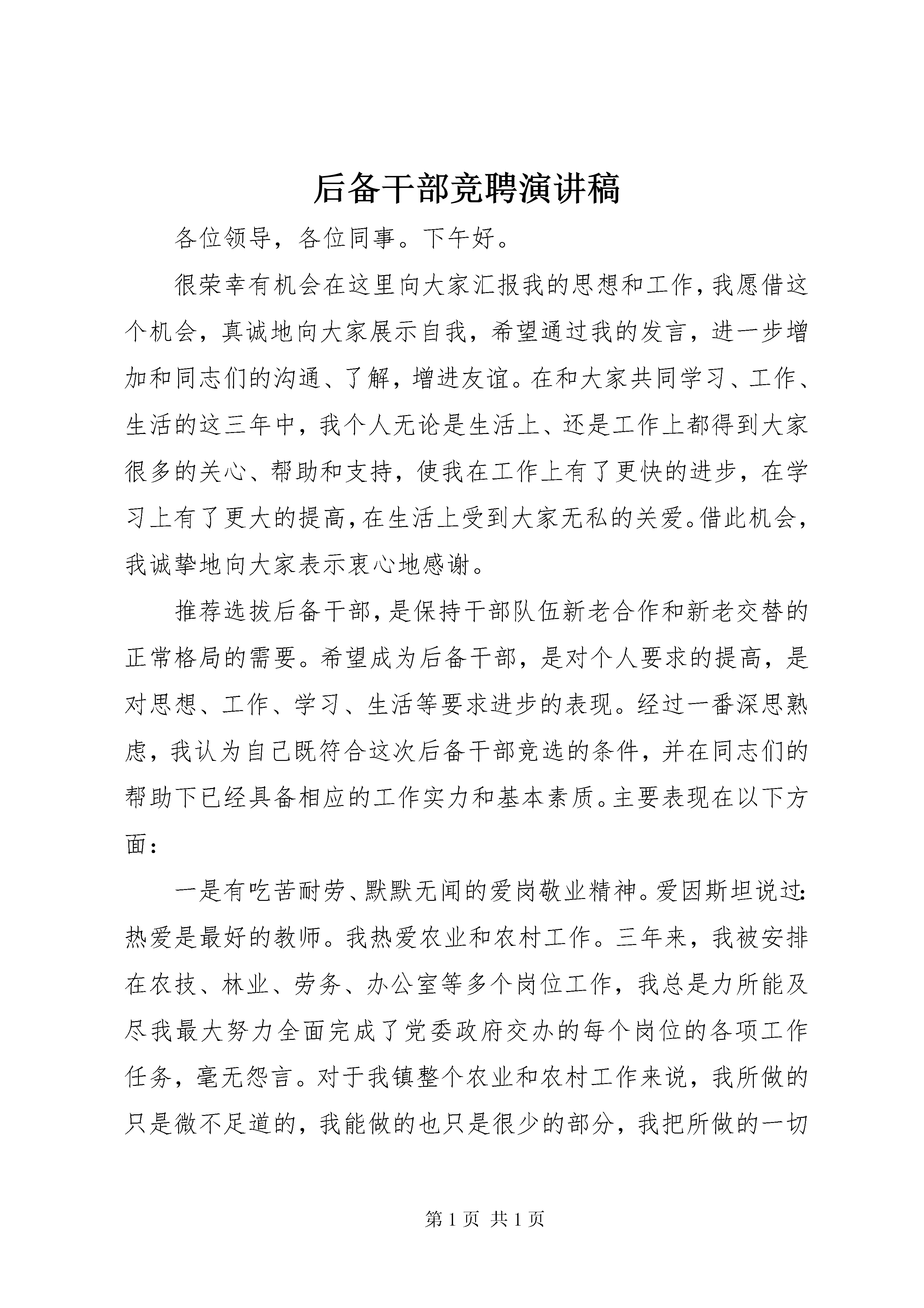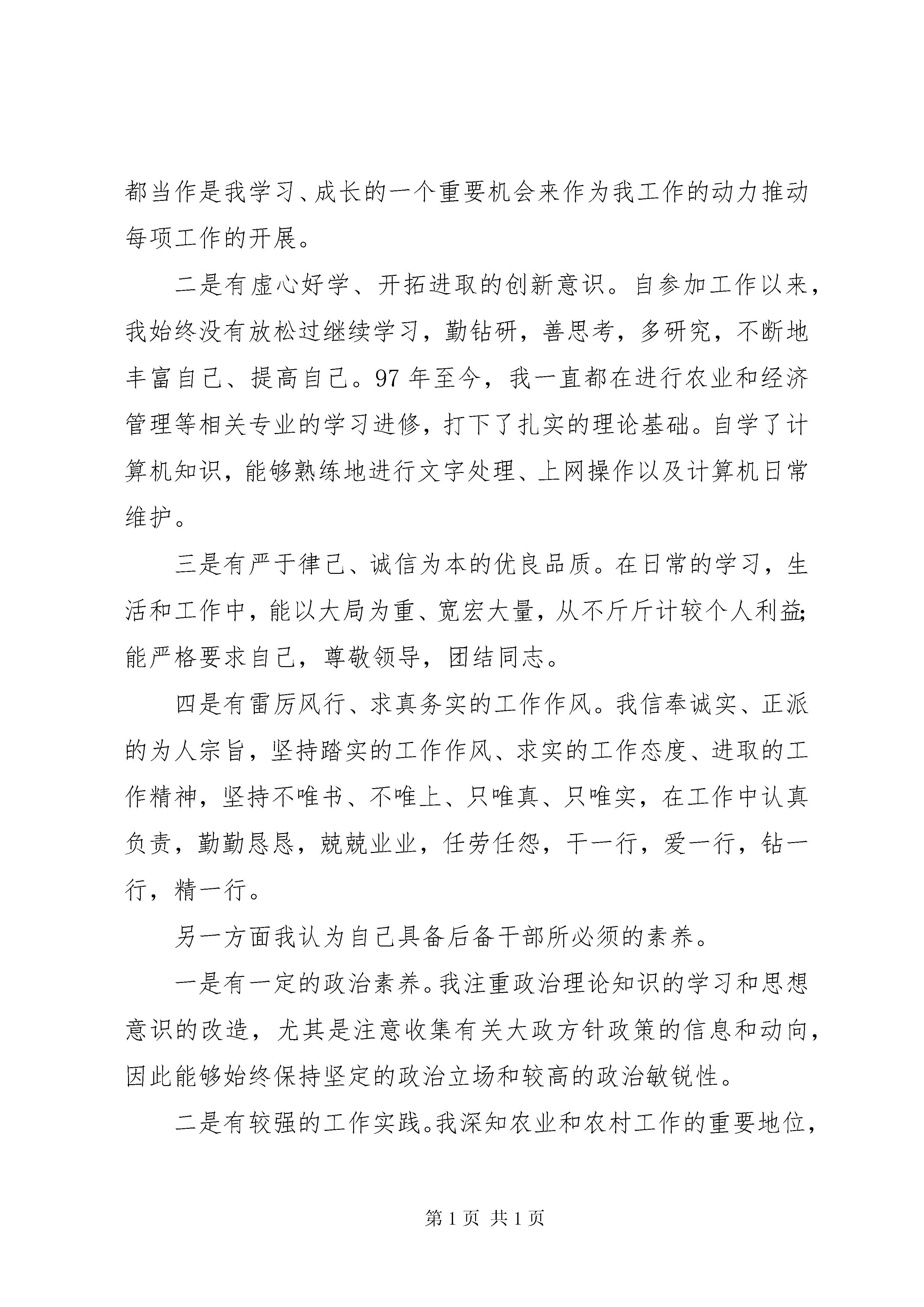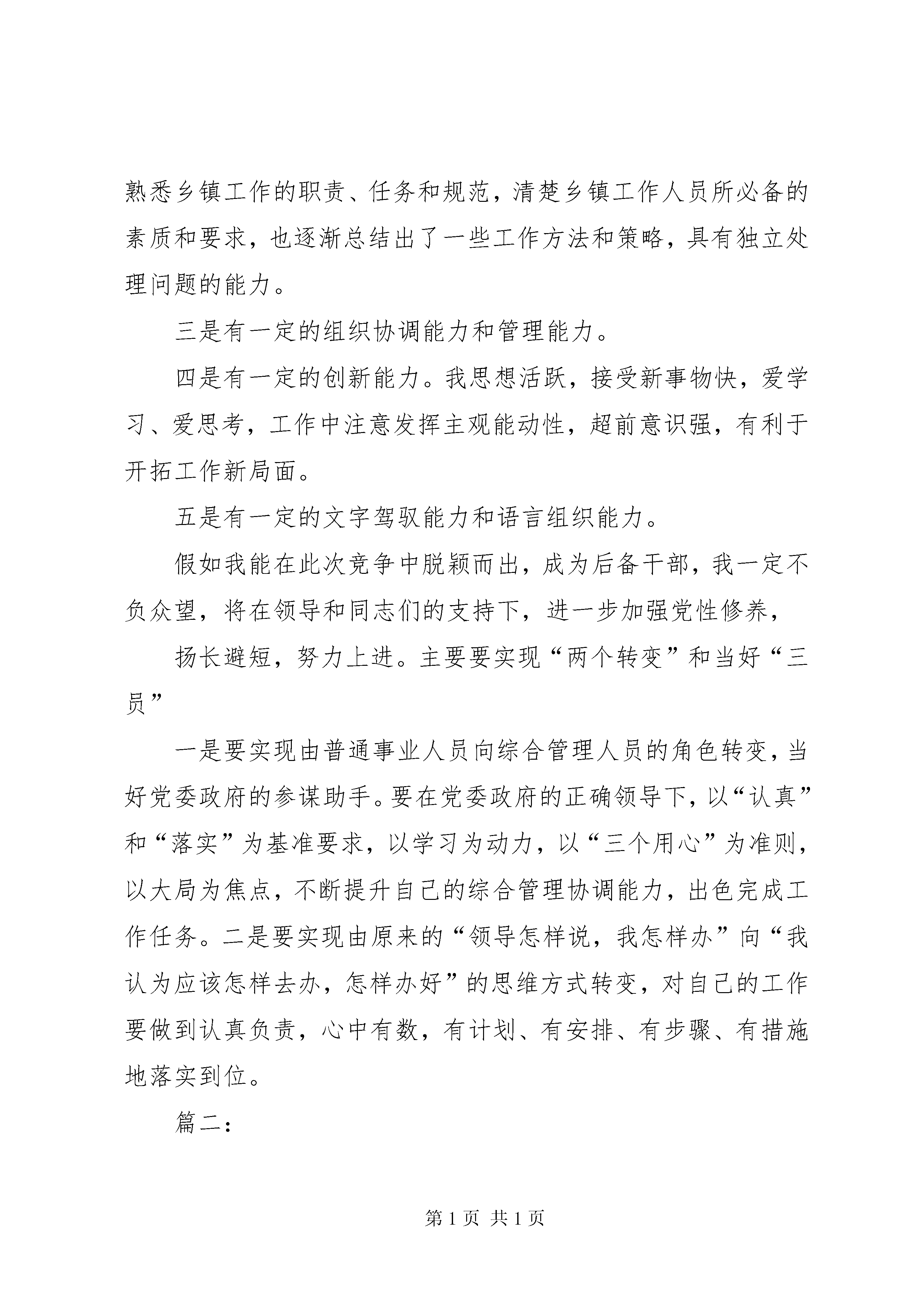 后备干部竞聘演讲稿各位领导,各位同事。下午好。很荣幸有机会在这里向大家汇报我的思想和工作,我愿借这个机会,真诚地向大家展示自我,希望通过我的发言,进一步增加和同志们的沟通、了解,增进友谊。在和大家共同学习、工作、生活的这三年中,我个人无论是生活上、还是工作上都得到大家很多的关心、帮助和支持,使我在工作上有了更快的进步,在学习上有了更大的提高,在生活上受到大家无私的关爱。借此机会,我诚挚地向大家表示衷心地感谢。推荐选拔后备干部,是保持干部队伍新老合作和新老交替的正常格局的需要。希望成为后备干部,是对个人要求的提高,是对思想、工作、学习、生活等要求进步的表现。经过一番深思熟虑,我认为自己既符合这次后备干部竞选的条件,并在同志们的帮助下已经具备相应的工作实力和基本素质。主要表现在以下方面:一是有吃苦耐劳、默默无闻的爱岗敬业精神。爱因斯坦说过:热爱是最好的教师。我热爱农业和农村工作。三年来,我被安排在农技、林业、劳务、办公室等多个岗位工作,我总是力所能及尽我最大努力全面完成了党委政府交办的每个岗位的各项工作任务,毫无怨言。对于我镇整个农业和农村工作来说,我所做的只是微不足道的,我能做的也只是很少的部分,我把所做的一切都当作是我学习、成长的一个重要机会来作为我工作的动力推动每项工作的开展。二是有虚心好学、开拓进取的创新意识。自参加工作以来,我始终没有放松过继续学习,勤钻研,善思考,多研究,不断地丰富自己、提高自己。97年至今,我一直都在进行农业和经济管理等相关专业的学习进修,打下了扎实的理论基础。自学了计算机知识,能够熟练地进行文字处理、上网操作以及计算机日常维护。三是有严于律己、诚信为本的优良品质。在日常的学习,生活和工作中,能以大局为重、宽宏大量,从不斤斤计较个人利益;能严格要求自己,尊敬领导,团结同志。四是有雷厉风行、求真务实的工作作风。我信奉诚实、正派的为人宗旨,坚持踏实的工作作风、求实的工作态度、进取的工作精神,坚持不唯书、不唯上、只唯真、只唯实,在工作中认真负责,勤勤恳恳,兢兢业业,任劳任怨,干一行,爱一行,钻一行,精一行。另一方面我认为自己具备后备干部所必须的素养。一是有一定的政治素养。我注重政治理论知识的学习和思想意识的改造,尤其是注意收集有关大政方针政策的信息和动向,因此能够始终保持坚定的政治立场和较高的政治敏锐性。二是有较强的工作实践。我深知农业和农村工作的重要地位,熟悉乡镇工作的职责、任务和规范,清楚乡镇工作人员所必备的素质和要求,也逐渐总结出了一些工作方法和策略,具有独立处理问题的能力。三是有一定的组织协调能力和管理能力。四是有一定的创新能力。我思想活跃,接受新事物快,爱学习、爱思考,工作中注意发挥主观能动性,超前意识强,有利于开拓工作新局面。五是有一定的文字驾驭能力和语言组织能力。假如我能在此次竞争中脱颖而出,成为后备干部,我一定不负众望,将在领导和同志们的支持下,进一步加强党性修养,扬长避短,努力上进。主要要实现“两个转变”和当好“三员”一是要实现由普通事业人员向综合管理人员的角色转变,当好党委政府的参谋助手。要在党委政府的正确领导下,以“认真”和“落实”为基准要求,以学习为动力,以“三个用心”为准则,以大局为焦点,不断提升自己的综合管理协调能力,出色完成工作任务。二是要实现由原来的“领导怎样说,我怎样办”向“我认为应该怎样去办,怎样办好”的思维方式转变,对自己的工作要做到认真负责,心中有数,有计划、有安排、有步骤、有措施地落实到位。篇二:from本文来自淘endX。尊敬的各位领导、各位同事:今天参加后备干部竞聘会,是我的荣幸,也是各位领导和同事对我的关心和爱护,我衷心的表示感谢。本人,男,汉族,中共党员,大学本科、研究生学历,经济师职称。1963年11月出生于县,籍贯。1981年参加工作,曾先后担任计划股股长等职务;1995年被聘任为行长助理;1998年被任命为党总支书记、行长;xx年被任命为党委书记、行长至今。本人1998年在任行长期间,该行连续四年实现盈利;xx年在支行任行长期间,致力寻找业务经营突破口,全面推行不良资产分帐经营,超计划完成各项指标,该行减亏171万元,撤并低效网点8个,下岗分流富余人员67人。1999年至xx年连续五年被评为“勤政廉洁、艰苦奋斗”先进个人;xx年荣获县“五一”劳动奖章。党的xx大明确指出,国有商业银行要“实行股份制改造,加快处置不良资产,充实资本金,创造条件上市”。这对来说,既是挑战,更是机遇。结合xx实际,确定我的工作思路是:转变观念,与时俱进,树立科学的发展观,大胆创新,以人为本,控制风险,有效经营,为改革上市不懈努力。工作目标是:有的放矢,务求实效,狠抓“利润、资产质量、存款”三项任务;改革优化机构,建立高效的内部管理体系;建立全面的风险