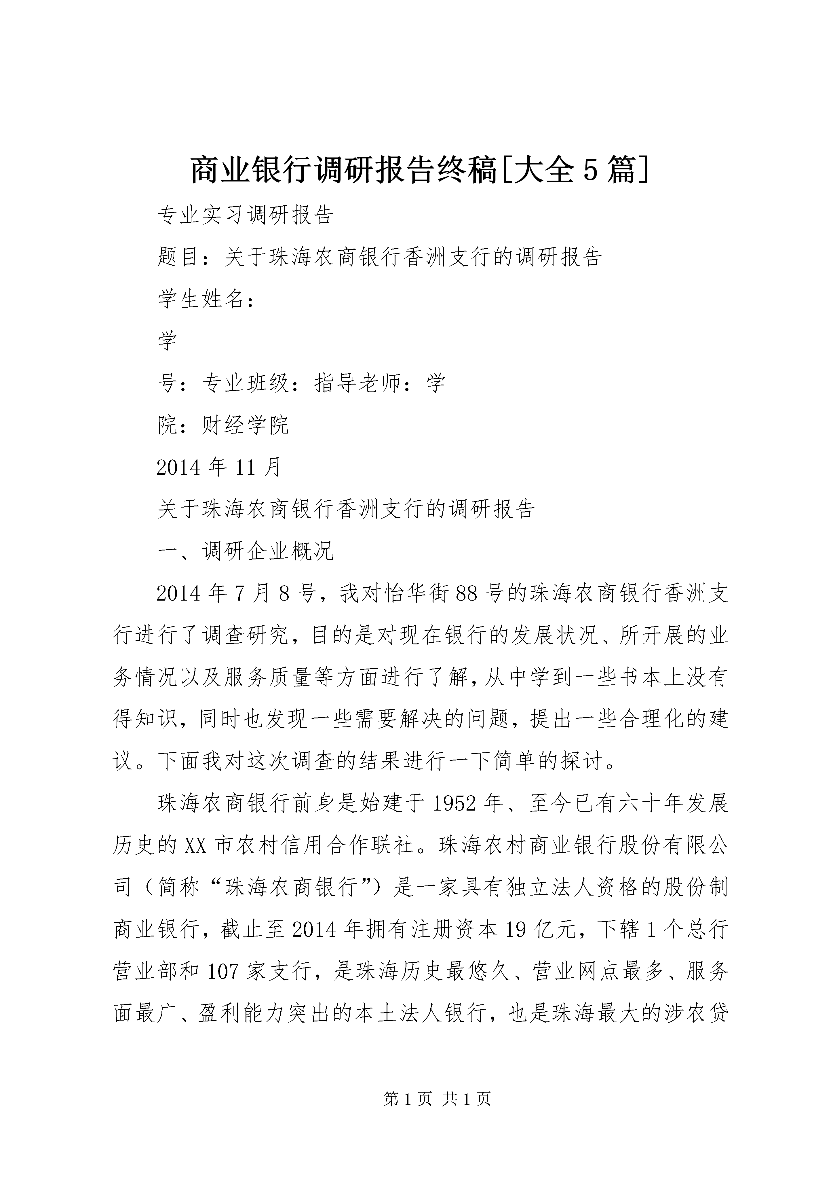 商业银行调研报告终稿[大全5篇]专业实习调研报告题目:关于珠海农商银行香洲支行的调研报告学生姓名:学号:专业班级:指导老师:学院:财经学院2014年11月关于珠海农商银行香洲支行的调研报告一、调研企业概况2014年7月8号,我对怡华街88号的珠海农商银行香洲支行进行了调查研究,目的是对现在银行的发展状况、所开展的业务情况以及服务质量等方面进行了解,从中学到一些书本上没有得知识,同时也发现一些需要解决的问题,提出一些合理化的建议。下面我对这次调查的结果进行一下简单的探讨。珠海农商银行前身是始建于1952年、至今已有六十年发展历史的XX市农村信用合作联社。珠海农村商业银行股份有限公司(简称“珠海农商银行”)是一家具有独立法人资格的股份制商业银行,截止至2014年拥有注册资本19亿元,下辖1个总行营业部和107家支行,是珠海历史最悠久、营业网点最多、服务面最广、盈利能力突出的本土法人银行,也是珠海最大的涉农贷款银行和拥有中小企业客户最多的银行,资本充足率、资本利润率等监管指标均居国内银行业优秀行列。曾荣获中国最具影响力农村金融机构,自2007年以来已连续6年为“珠海纳税贡献百强企业”。据调查了解,珠海农商银行香洲支行成立于2013年,地处居民住宅要道的交口处,所以周围居民较多。除国家法定假日外,平时照常营业,每天的营业时间为上午的8点30到下午的5点。该银行业务的经营范围:吸收人民币公众存款;发放人民币短期、中期和长期贷款;办理国内结算;办理票据承兑与贴现;代理发行、代理兑付、承销政府债券;买卖政府债券、金融债券;从事同业拆借;从事银行卡业务(借记卡);代理收付款项及代理保险业务;提供保管箱服务;经银行业监督管理机构批准的其他业务。主要的业务是存取款和对公业务,使用的结算方式为日清月结,每日结算。最常使用的银行卡分为:贷计卡(无须存款,可先消费后还款的信用卡)、借计卡(储蓄卡,不能透支)、准贷计卡(消费前预存一定款额,享有一定透支额度)。一般使用银行卡办理的业务有:取现金、单位代发工资、普通刷卡消费、网上支付、缴费(电话、手机及其他公共事业费)、转帐、个人理财(购买基金、股票、外汇)。据知情人透露,珠海农商银行香洲支行的员工约为20人左右,人员会有调动,但具体调动时间不确定,需要根据其他农商行支行的实际情况来定。员工的福利跟每个人的贡献和效应挂钩。随着我国国民经济持续快速发展,我国居民的个人财富急剧膨胀,相应地投资意愿以及现代理财观念逐步增强,金融服务需求日益多样化。同时,随着中国金融体制改革的不断深化,外资银行纷至沓来,国内外商业银行之间的竞争日益激烈。但与国外银行相比,我国的个人理财业务还处在起步阶段,存在着多种因素制约理财产品的发展与创新。本文针对珠海农商银行香洲支行现状,调查其基础商业经营活动,从中发现问题,探讨其产生的原因及其改善措施。二、调研的主要对象此次的调研主要参考对象(主要根据基础业务类和客户服务类选取了两个方面):1.个人金融部(基础业务类)指商业银行对个人客户提供的存款、贷款、支付结算等服务,也就是柜面服务,其主要包括以下内容:(1)个人负债业务,包括本外币储蓄等各种存款业务和银行发行的金融债券业务。(2)个人贷款业务,是指银行为个人提供的短期和长期借款业务。主要包括权利凭证质押贷款、个人住房贷款、个人耐用消费品贷款、个人住房装修贷款、个人助学贷款、个人汽车消费贷款、个人医疗贷款、个人旅游贷款、个人额度贷款等等。(3)个人支付结算业务,主要指银行依托活期存款帐户,利用结算工具,为个人客户提供除存取款之外的消费、转账、汇款等结算服务,实现客户的货币资金转移和清算。(4)代理业务指银行利用自己的营业网点、结算网络等资源,为客户提供各种代理、分销或理财服务,包括:代扣代缴居民日常生活所支付的各种费用、代理企事业单位为其职工发放工资等代收代付业务。(5)电子银行业务,指银行利用先进的电子技术手段为客户提供方便、快捷的自助服务,包括网上银行、电话银行、手机银行、电视银行、自助银行、atm(cdm)、pos等。(6)个人投资理财业务,是指银行对特定客户提供的量身订做的、更为合理有效地管理其资产负债和其他金融事务等更深层次金融服务。包括合理安排开支、合理投资、购买保险、购置住宅等不动产及其他私人财务问题。2.营业部大堂经理(客户服务类)主要包括以下工作内容:(1)银行前台的各项工作以及银行的各项理财产品、担保贷款业务、银行卡、信用卡的各种详细情况,处理银行客户数据与对客户进行及时回访,同时也担当银行的日常安保工作,当然只限于维持大堂秩序。(2)引导客户,为客户介绍理财产品,解决客户与银行有关的问题。参与银行厅堂销售的各项布置与客户营销。(3)指引客户填写各种表格回单,帮助柜台疏导客户。进行银行高端产
