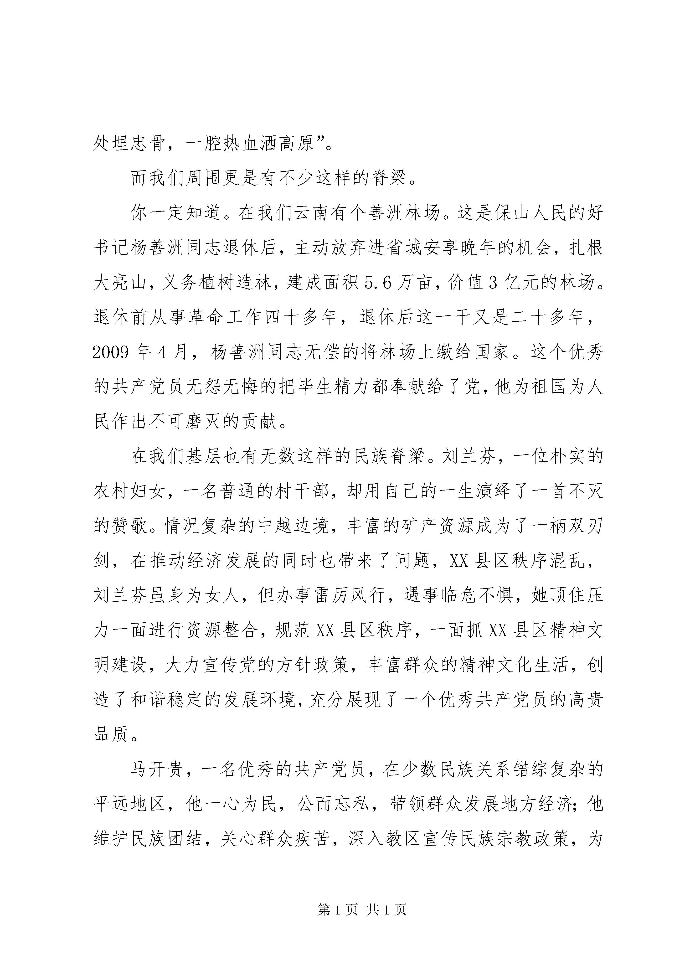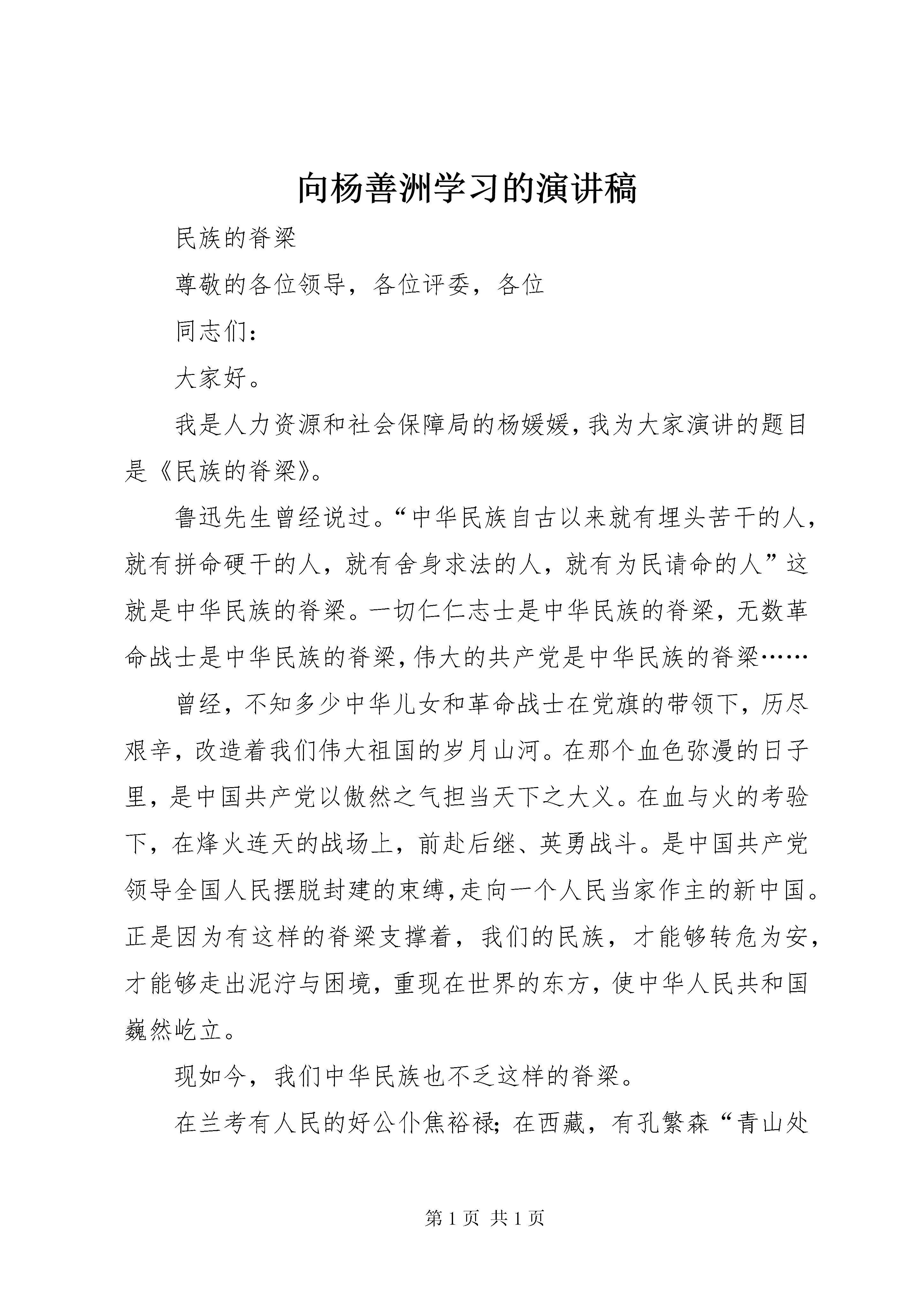 向杨善洲学习的演讲稿民族的脊梁尊敬的各位领导,各位评委,各位同志们:大家好。我是人力资源和社会保障局的杨媛媛,我为大家演讲的题目是《民族的脊梁》。鲁迅先生曾经说过。“中华民族自古以来就有埋头苦干的人,就有拼命硬干的人,就有舍身求法的人,就有为民请命的人”这就是中华民族的脊梁。一切仁仁志士是中华民族的脊梁,无数革命战士是中华民族的脊梁,伟大的共产党是中华民族的脊梁……曾经,不知多少中华儿女和革命战士在党旗的带领下,历尽艰辛,改造着我们伟大祖国的岁月山河。在那个血色弥漫的日子里,是中国共产党以傲然之气担当天下之大义。在血与火的考验下,在烽火连天的战场上,前赴后继、英勇战斗。是中国共产党领导全国人民摆脱封建的束缚,走向一个人民当家作主的新中国。正是因为有这样的脊梁支撑着,我们的民族,才能够转危为安,才能够走出泥泞与困境,重现在世界的东方,使中华人民共和国巍然屹立。现如今,我们中华民族也不乏这样的脊梁。在兰考有人民的好公仆焦裕禄;在西藏,有孔繁森“青山处处埋忠骨,一腔热血洒高原”。而我们周围更是有不少这样的脊梁。你一定知道。在我们云南有个善洲林场。这是保山人民的好书记杨善洲同志退休后,主动放弃进省城安享晚年的机会,扎根大亮山,义务植树造林,建成面积5.6万亩,价值3亿元的林场。退休前从事革命工作四十多年,退休后这一干又是二十多年,2009年4月,杨善洲同志无偿的将林场上缴给国家。这个优秀的共产党员无怨无悔的把毕生精力都奉献给了党,他为祖国为人民作出不可磨灭的贡献。在我们基层也有无数这样的民族脊梁。刘兰芬,一位朴实的农村妇女,一名普通的村干部,却用自己的一生演绎了一首不灭的赞歌。情况复杂的中越边境,丰富的矿产资源成为了一柄双刃剑,在推动经济发展的同时也带来了问题,XX县区秩序混乱,刘兰芬虽身为女人,但办事雷厉风行,遇事临危不惧,她顶住压力一面进行资源整合,规范XX县区秩序,一面抓XX县区精神文明建设,大力宣传党的方针政策,丰富群众的精神文化生活,创造了和谐稳定的发展环境,充分展现了一个优秀共产党员的高贵品质。马开贵,一名优秀的共产党员,在少数民族关系错综复杂的平远地区,他一心为民,公而忘私,带领群众发展地方经济;他维护民族团结,关心群众疾苦,深入教区宣传民族宗教政策,为各族群众搭起沟通和理解的桥梁,发挥了共产党员的先锋模范作用,在平凡的岗位上做出了不平凡的业绩。我敢说基层工作的困难与艰苦,并不是人人都可以克服的。更何况几十年如一日。可是身为党员的他们做到了。他们在贫困的基层克服种种困难,带领群众创业致富。他们一心为民、兢兢业业、最终累倒在自己岗位上。2010年4月,省委追授马开贵同志为“优秀共产党员”。2011年,省委追授刘兰芬同志为“优秀共产党员”。在基层,在我们周围还有很多很多像他们一样优秀共产党员,他们没有丰厚的利益回报,也并不是每个人都能被评为“优秀共产党员”,有很多优秀事迹也不为人知。但他们依旧默默坚守在自己的岗位上为人民服务,为祖国奉献。这就有我们中华民族的脊梁——中国共产党。他们我们云南人的骄傲,是祖国的骄傲,是共产党员的骄傲,是中华民族强大的脊梁,是我们学习的榜样。