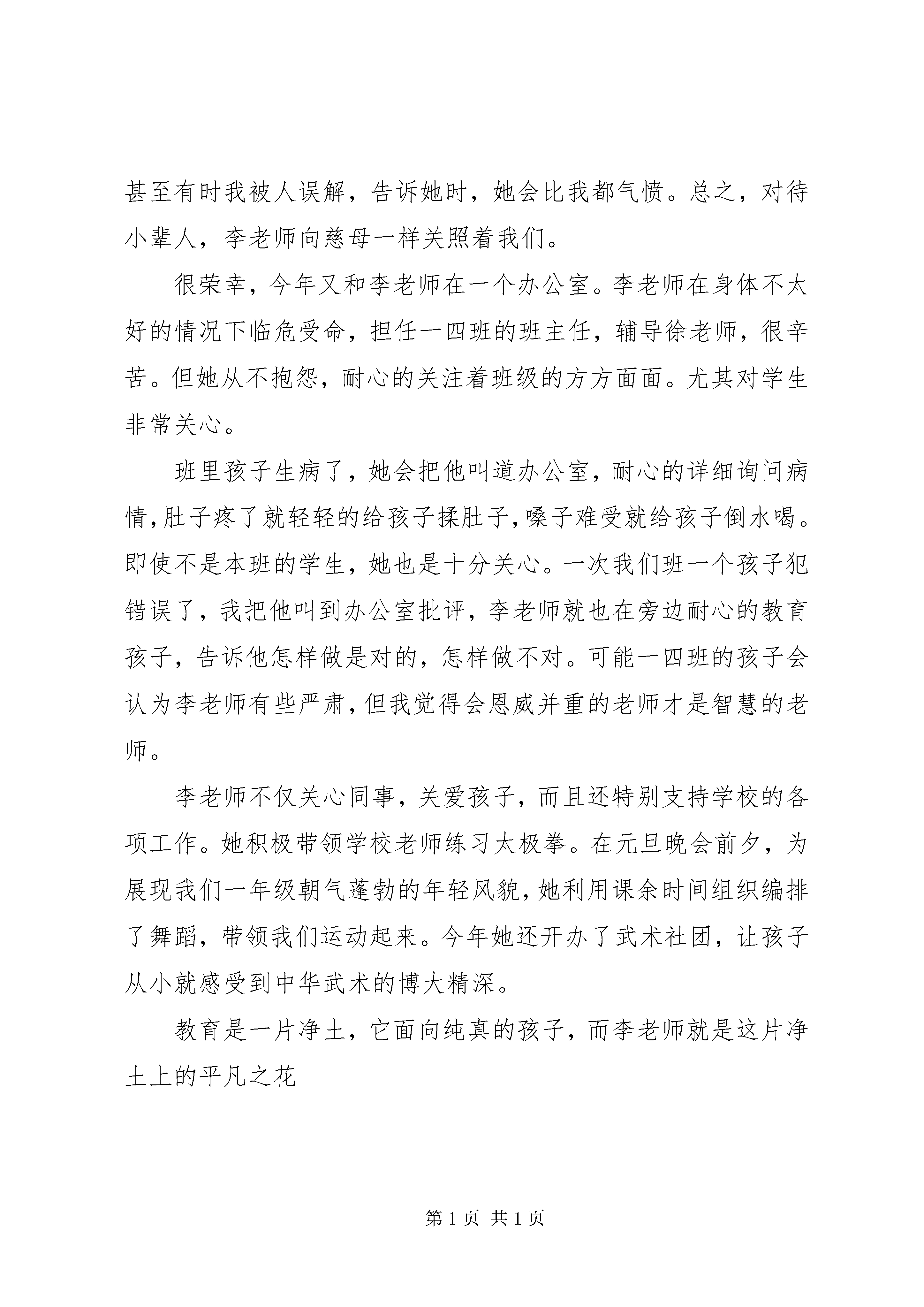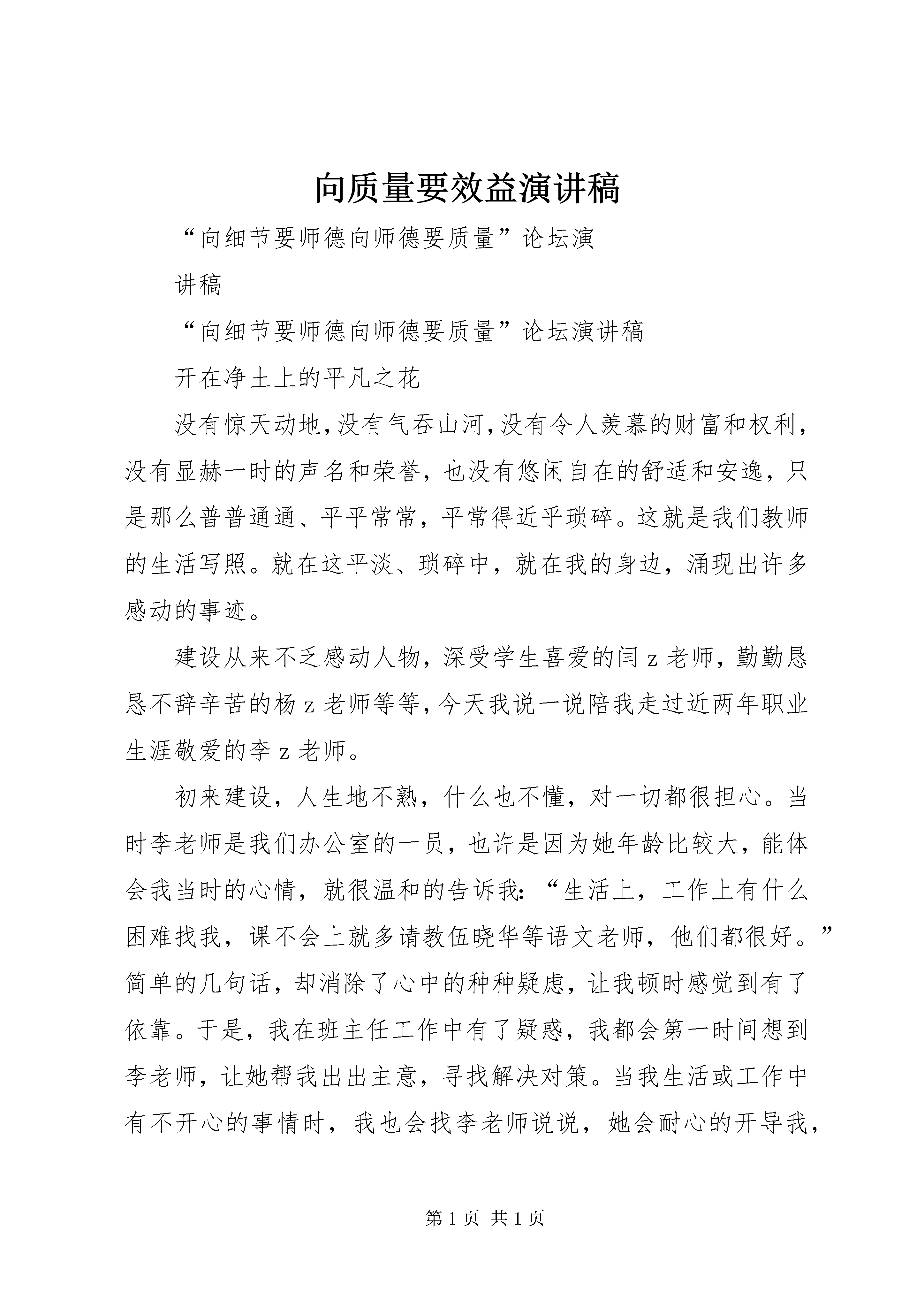 向质量要效益演讲稿“向细节要师德向师德要质量”论坛演讲稿“向细节要师德向师德要质量”论坛演讲稿开在净土上的平凡之花没有惊天动地,没有气吞山河,没有令人羡慕的财富和权利,没有显赫一时的声名和荣誉,也没有悠闲自在的舒适和安逸,只是那么普普通通、平平常常,平常得近乎琐碎。这就是我们教师的生活写照。就在这平淡、琐碎中,就在我的身边,涌现出许多感动的事迹。建设从来不乏感动人物,深受学生喜爱的闫z老师,勤勤恳恳不辞辛苦的杨z老师等等,今天我说一说陪我走过近两年职业生涯敬爱的李z老师。初来建设,人生地不熟,什么也不懂,对一切都很担心。当时李老师是我们办公室的一员,也许是因为她年龄比较大,能体会我当时的心情,就很温和的告诉我:“生活上,工作上有什么困难找我,课不会上就多请教伍晓华等语文老师,他们都很好。”简单的几句话,却消除了心中的种种疑虑,让我顿时感觉到有了依靠。于是,我在班主任工作中有了疑惑,我都会第一时间想到李老师,让她帮我出出主意,寻找解决对策。当我生活或工作中有不开心的事情时,我也会找李老师说说,她会耐心的开导我,甚至有时我被人误解,告诉她时,她会比我都气愤。总之,对待小辈人,李老师向慈母一样关照着我们。很荣幸,今年又和李老师在一个办公室。李老师在身体不太好的情况下临危受命,担任一四班的班主任,辅导徐老师,很辛苦。但她从不抱怨,耐心的关注着班级的方方面面。尤其对学生非常关心。班里孩子生病了,她会把他叫道办公室,耐心的详细询问病情,肚子疼了就轻轻的给孩子揉肚子,嗓子难受就给孩子倒水喝。即使不是本班的学生,她也是十分关心。一次我们班一个孩子犯错误了,我把他叫到办公室批评,李老师就也在旁边耐心的教育孩子,告诉他怎样做是对的,怎样做不对。可能一四班的孩子会认为李老师有些严肃,但我觉得会恩威并重的老师才是智慧的老师。李老师不仅关心同事,关爱孩子,而且还特别支持学校的各项工作。她积极带领学校老师练习太极拳。在元旦晚会前夕,为展现我们一年级朝气蓬勃的年轻风貌,她利用课余时间组织编排了舞蹈,带领我们运动起来。今年她还开办了武术社团,让孩子从小就感受到中华武术的博大精深。教育是一片净土,它面向纯真的孩子,而李老师就是这片净土上的平凡之花