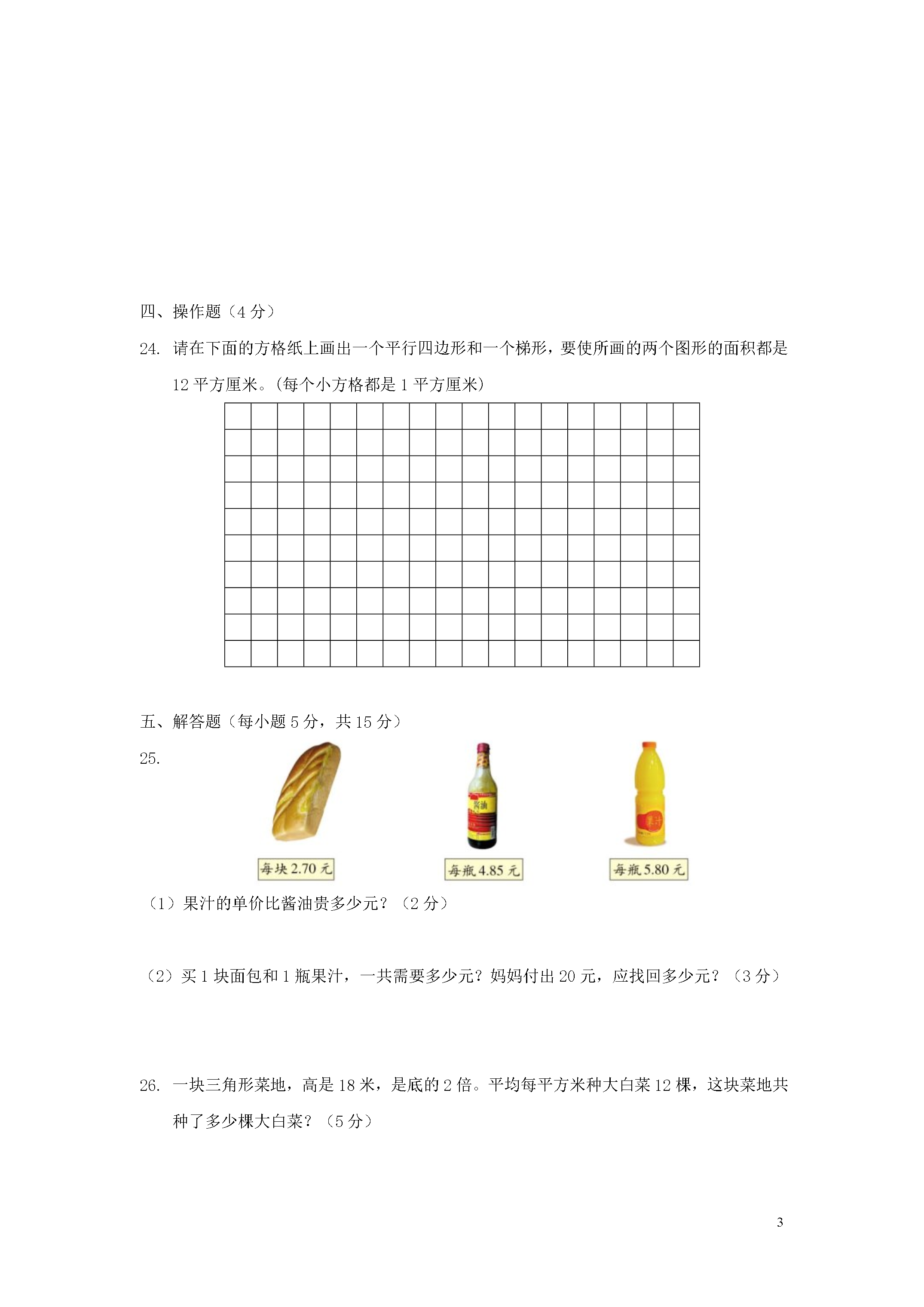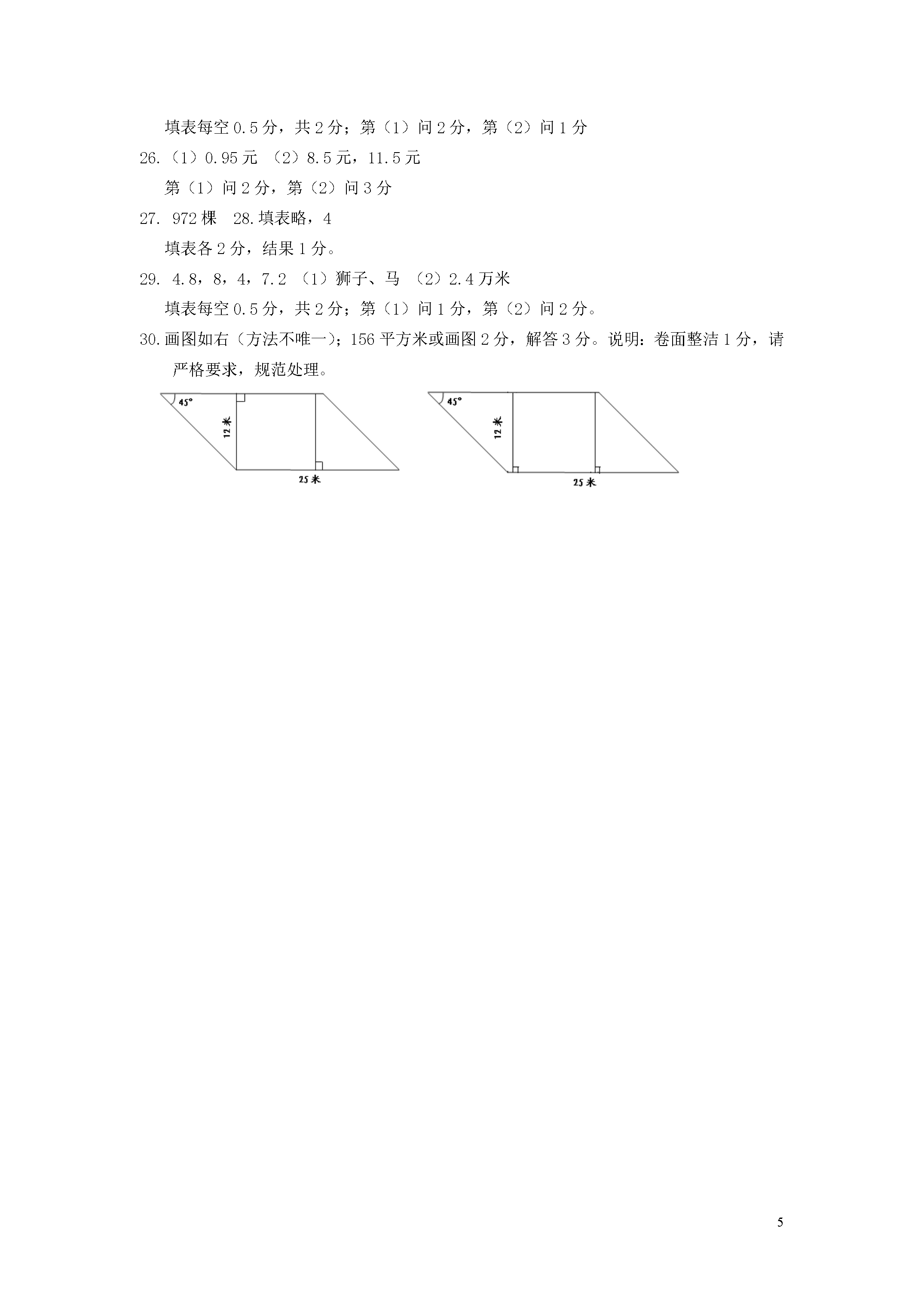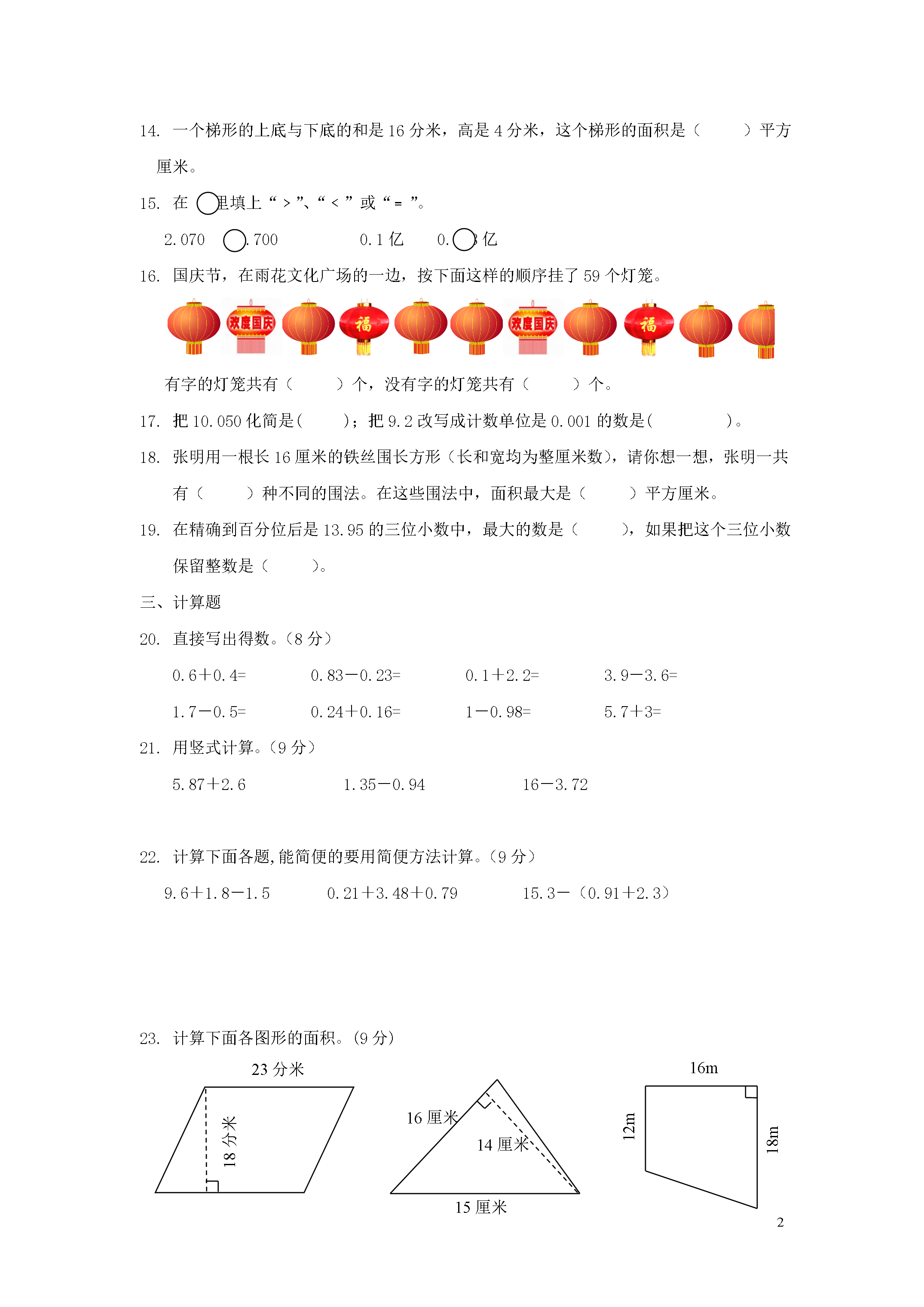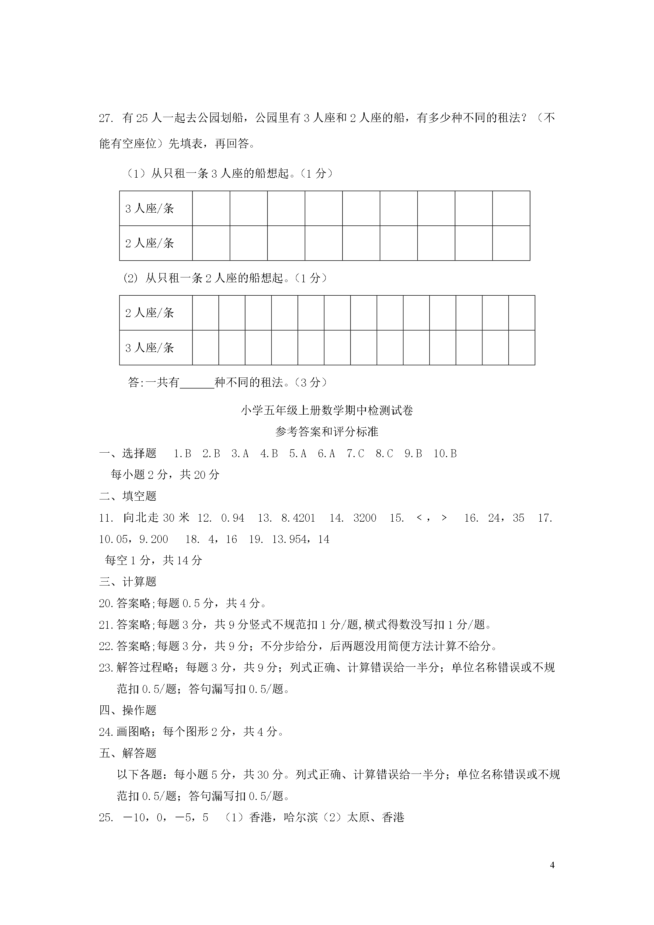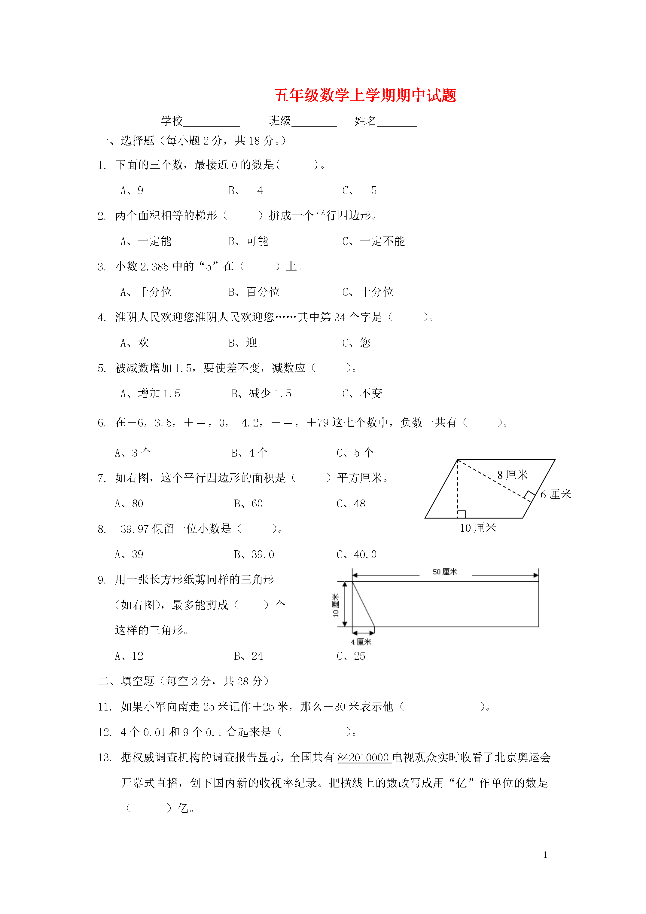 15五年级数学上学期期中试题学校班级姓名一、选择题(每小题2分,共18分。)1.下面的三个数,最接近0的数是()。A、9B、-4C、-52.两个面积相等的梯形()拼成一个平行四边形。A、一定能B、可能C、一定不能3.小数2.385中的“5”在()上。A、千分位B、百分位C、十分位4.淮阴人民欢迎您淮阴人民欢迎您……其中第34个字是()。A、欢B、迎C、您5.被减数增加1.5,要使差不变,减数应()。A、增加1.5B、减少1.5C、不变6.在-6,3.5,+,0,-4.2,-,+79这七个数中,负数一共有()。10厘米6厘米8厘米A、3个B、4个C、5个7.如右图,这个平行四边形的面积是()平方厘米。A、80B、60C、488.39.97保留一位小数是()。A、39B、39.0C、40.09.用一张长方形纸剪同样的三角形(如右图),最多能剪成()个这样的三角形。A、12B、24C、25二、填空题(每空2分,共28分)11.如果小军向南走25米记作+25米,那么-30米表示他()。12.4个0.01和9个0.1合起来是()。13.据权威调查机构的调查报告显示,全国共有842010000电视观众实时收看了北京奥运会开幕式直播,创下国内新的收视率纪录。把横线上的数改写成用“亿”作单位的数是()亿。14.一个梯形的上底与下底的和是16分米,高是4分米,这个梯形的面积是()平方厘米。15.在里填上“﹥”、“﹤”或“﹦”。2.0702.7000.1亿0.098亿16.国庆节,在雨花文化广场的一边,按下面这样的顺序挂了59个灯笼。有字的灯笼共有()个,没有字的灯笼共有()个。17.把10.050化简是();把9.2改写成计数单位是0.001的数是()。18.张明用一根长16厘米的铁丝围长方形(长和宽均为整厘米数),请你想一想,张明一共有()种不同的围法。在这些围法中,面积最大是()平方厘米。19.在精确到百分位后是13.95的三位小数中,最大的数是(),如果把这个三位小数保留整数是()。三、计算题20.直接写出得数。(8分)0.6+0.4=0.83-0.23=0.1+2.2=3.9-3.6=1.7-0.5=0.24+0.16=1-0.98=5.7+3=21.用竖式计算。(9分)5.87+2.61.35-0.9416-3.7222.计算下面各题,能简便的要用简便方法计算。(9分)9.6+1.8-1.50.21+3.48+0.7915.3-(0.91+2.3)16m18m12m23分米23.计算下面各图形的面积。(9分)14厘米16厘米15厘米18分米四、操作题(4分)24.请在下面的方格纸上画出一个平行四边形和一个梯形,要使所画的两个图形的面积都是12平方厘米。(每个小方格都是1平方厘米)五、解答题(每小题5分,共15分)25.(1)果汁的单价比酱油贵多少元?(2分)(2)买1块面包和1瓶果汁,一共需要多少元?妈妈付出20元,应找回多少元?(3分)26.一块三角形菜地,高是18米,是底的2倍。平均每平方米种大白菜12棵,这块菜地共种了多少棵大白菜?(5分)27.有25人一起去公园划船,公园里有3人座和2人座的船,有多少种不同的租法?(不能有空座位)先填表,再回答。(1)从只租一条3人座的船想起。(1分)3人座/条2人座/条(2)从只租一条2人座的船想起。(1分)2人座/条3人座/条答:一共有种不同的租法。(3分)小学五年级上册数学期中检测试卷参考答案和评分标准一、选择题1.B2.B3.A4.B5.A6.A7.C8.C9.B10.B每小题2分,共20分二、填空题11.向北走30米12.0.9413.8.420114.320015.﹤,﹥16.24,3517.10.05,9.20018.4,1619.13.954,14每空1分,共14分三、计算题20.答案略;每题0.5分,共4分。21.答案略;每题3分,共9分竖式不规范扣1分/题,横式得数没写扣1分/题。22.答案略;每题3分,共9分;不分步给分,后两题没用简便方法计算不给分。23.解答过程略;每题3分,共9分;列式正确、计算错误给一半分;单位名称错误或不规范扣0.5/题;答句漏写扣0.5/题。四、操作题24.画图略;每个图形2分,共4分。五、解答题以下各题:每小题5分,共30分。列式正确、计算错误给一半分;单位名称错误或不规范扣0.5/题;答句漏写扣0.5/题。25.-10,0,-5,5(1)香港,哈尔滨(2)太原、香港填表每空0.5分,共2分;第(1)问2分,第(2)问1分26.(1)0.95元(2)8.5元,11.5元第(1)问2分,第(2)问3分27.972棵28.填表略,4填表各2分,结果1分。29.4.8,8,4,7.2(1)狮子、马(2)2.4万米填表每空0.5分,共2分;第(1)问