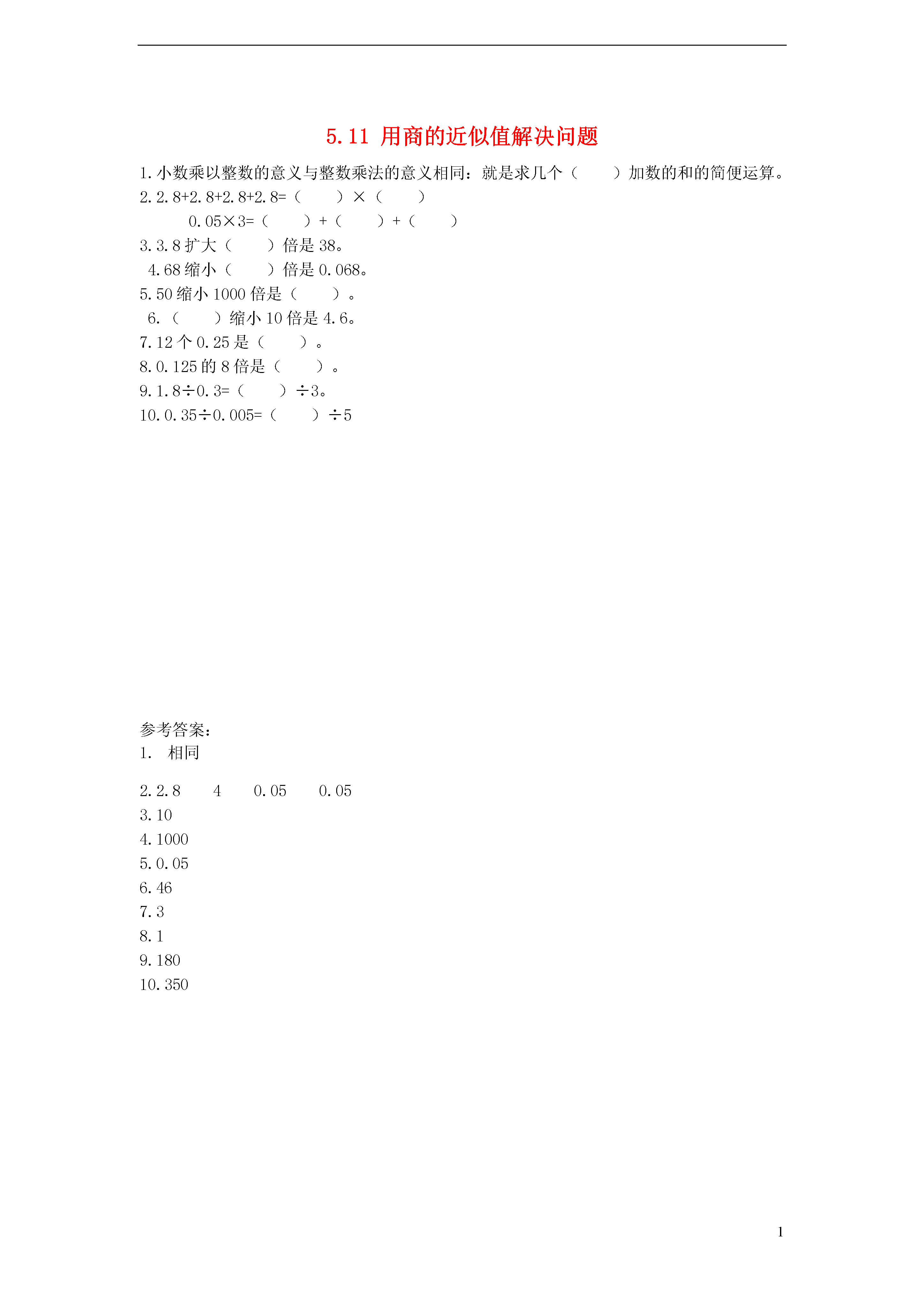 15.11用商的近似值解决问题1.小数乘以整数的意义与整数乘法的意义相同:就是求几个()加数的和的简便运算。2.2.8+2.8+2.8+2.8=()×()0.05×3=()+()+()3.3.8扩大()倍是38。4.68缩小()倍是0.068。5.50缩小1000倍是()。6.()缩小10倍是4.6。7.12个0.25是()。8.0.125的8倍是()。9.1.8÷0.3=()÷3。10.0.35÷0.005=()÷5参考答案:相同2.2.840.050.053.104.10005.0.056.467.38.19.18010.350