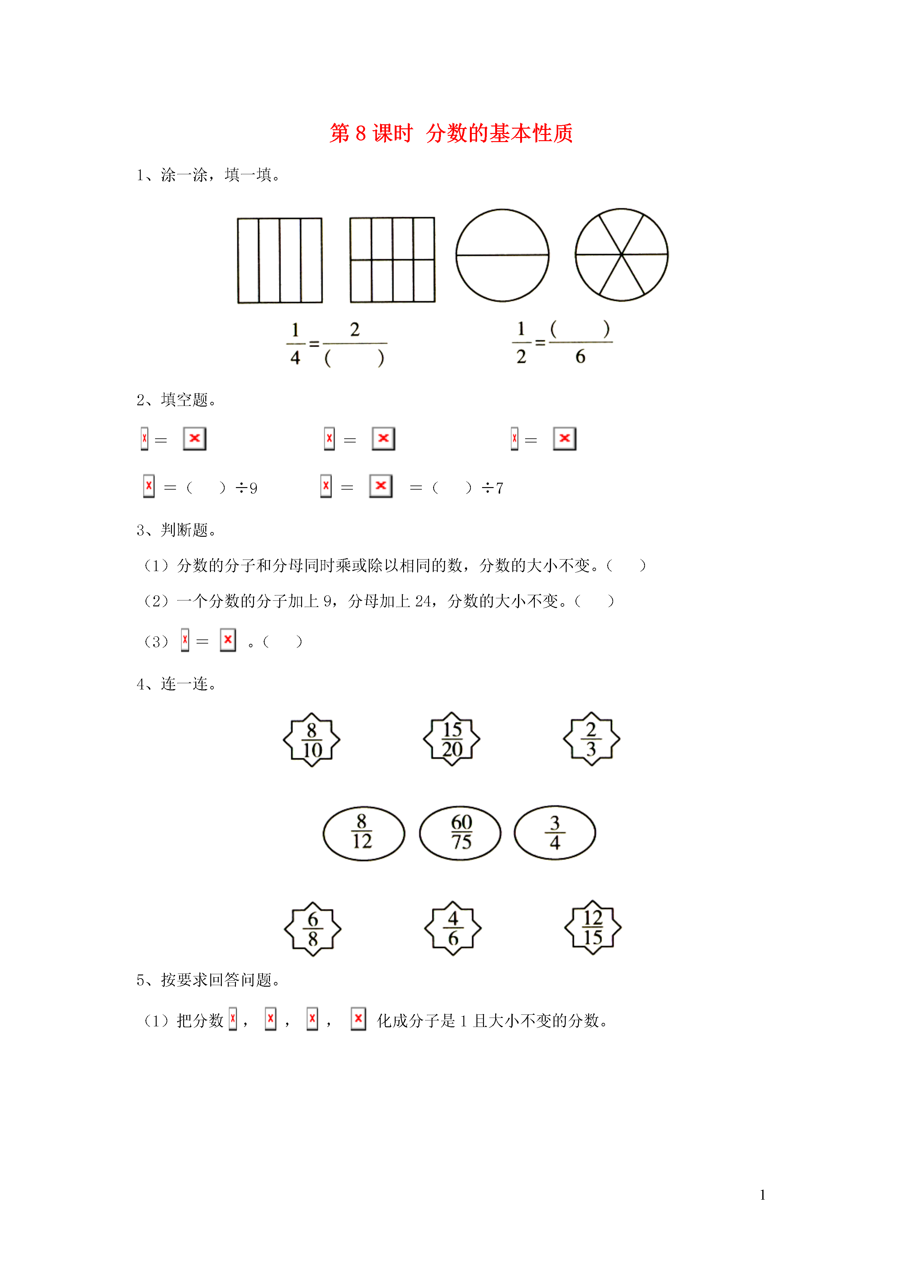 1第8课时分数的基本性质1、涂一涂,填一填。2、填空题。====()÷9==()÷73、判断题。(1)分数的分子和分母同时乘或除以相同的数,分数的大小不变。()(2)一个分数的分子加上9,分母加上24,分数的大小不变。()(3)=。()4、连一连。5、按要求回答问题。(1)把分数,,,化成分子是1且大小不变的分数。(2)把和化成分母是18,且分数大小不变的分数。6、五(1)班的同学借了《儿童文学》,的同学借了《聪明屋》,的同学借了《少年时代》,的同学借了《漫画世界》,还有的同学看《笑林》。借阅哪些刊物的同学一样多?7、一个分数的分子、分母之和是19,分母增加9后再将分子、分母都除以同一个数,得到一个新的分数是。原来的分数是几分之几?